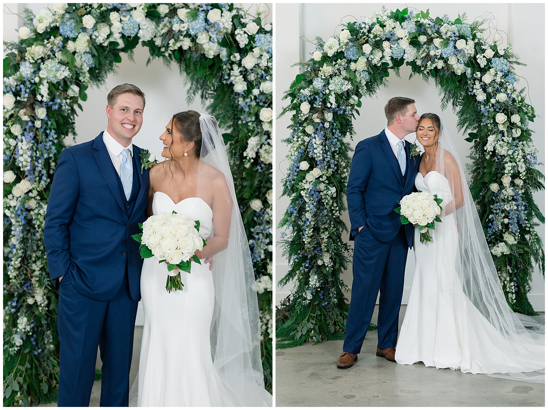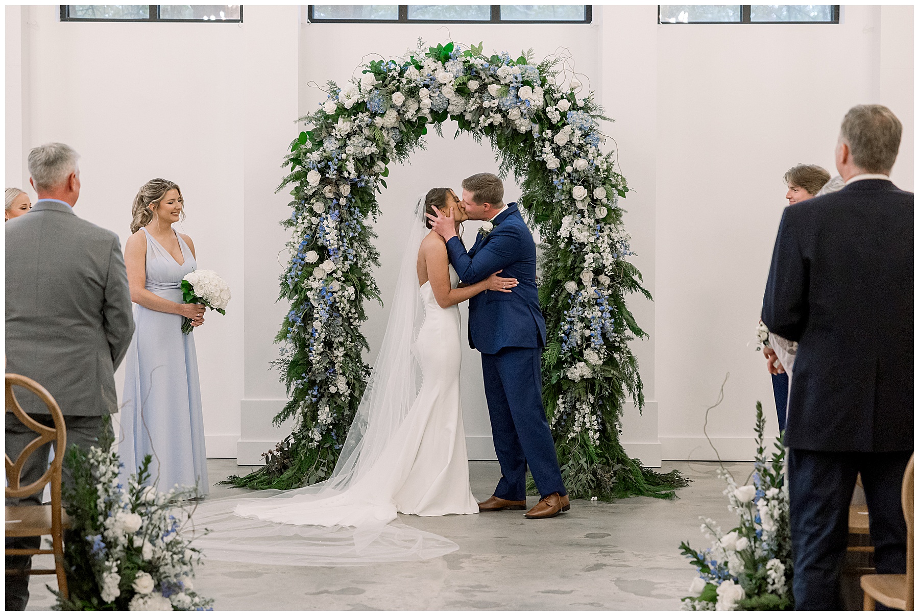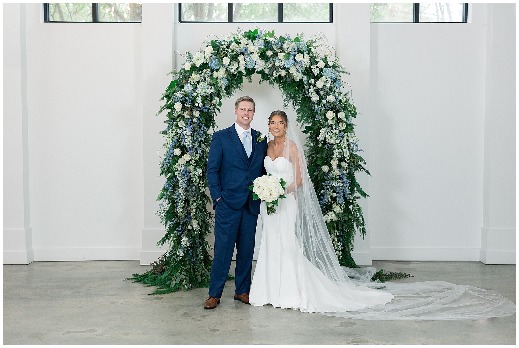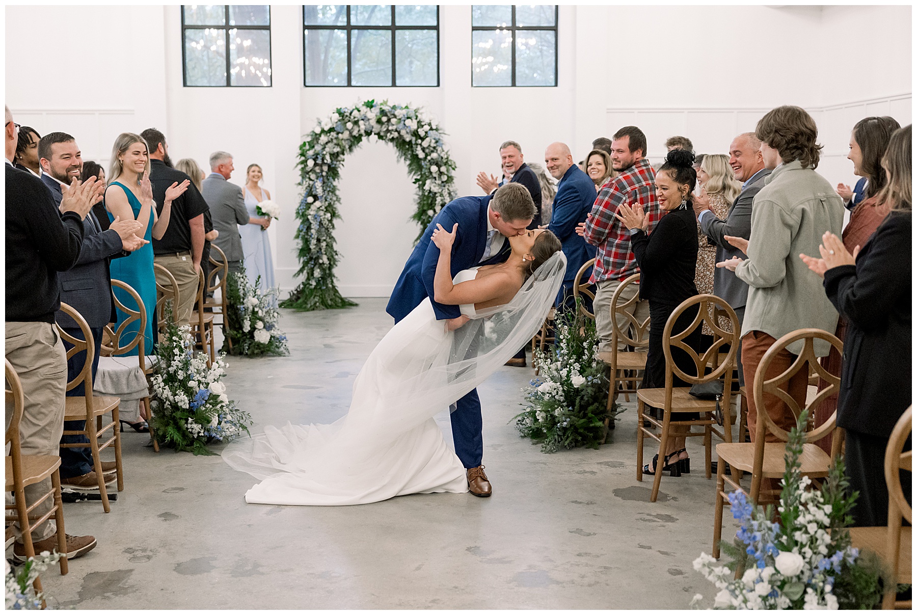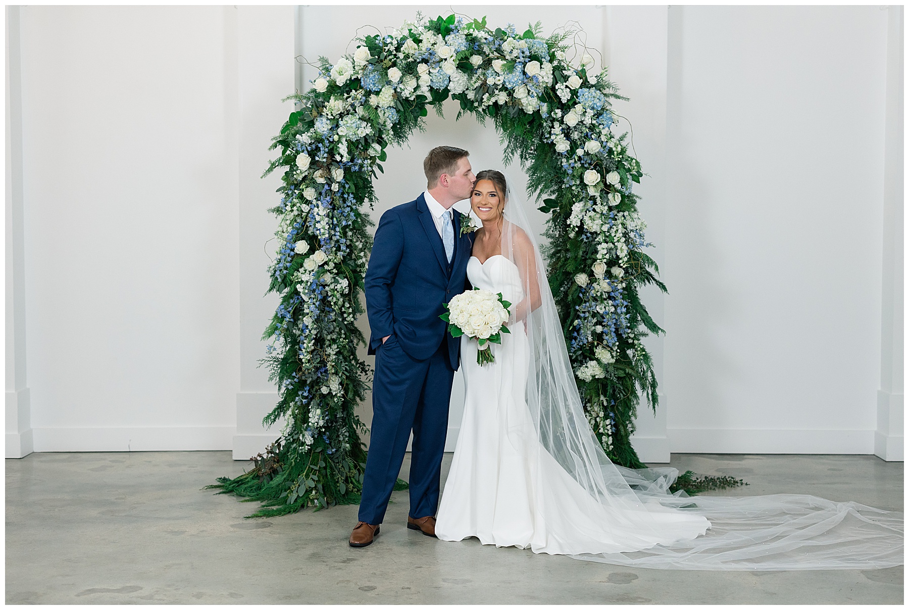 After the ceremony, we were able to go outside for photos thankfully, and everyone was troopers in the cold and wind! Alexsis and Hunter are photogenic and made our jobs so easy. I especially loved her longgggg veil, and the bow that she added to the back of her dress was such a unique and fun touch! Some of my favorite photos of them are actually in front of the floral arch because of the significance of BOTH their family’s hard work!