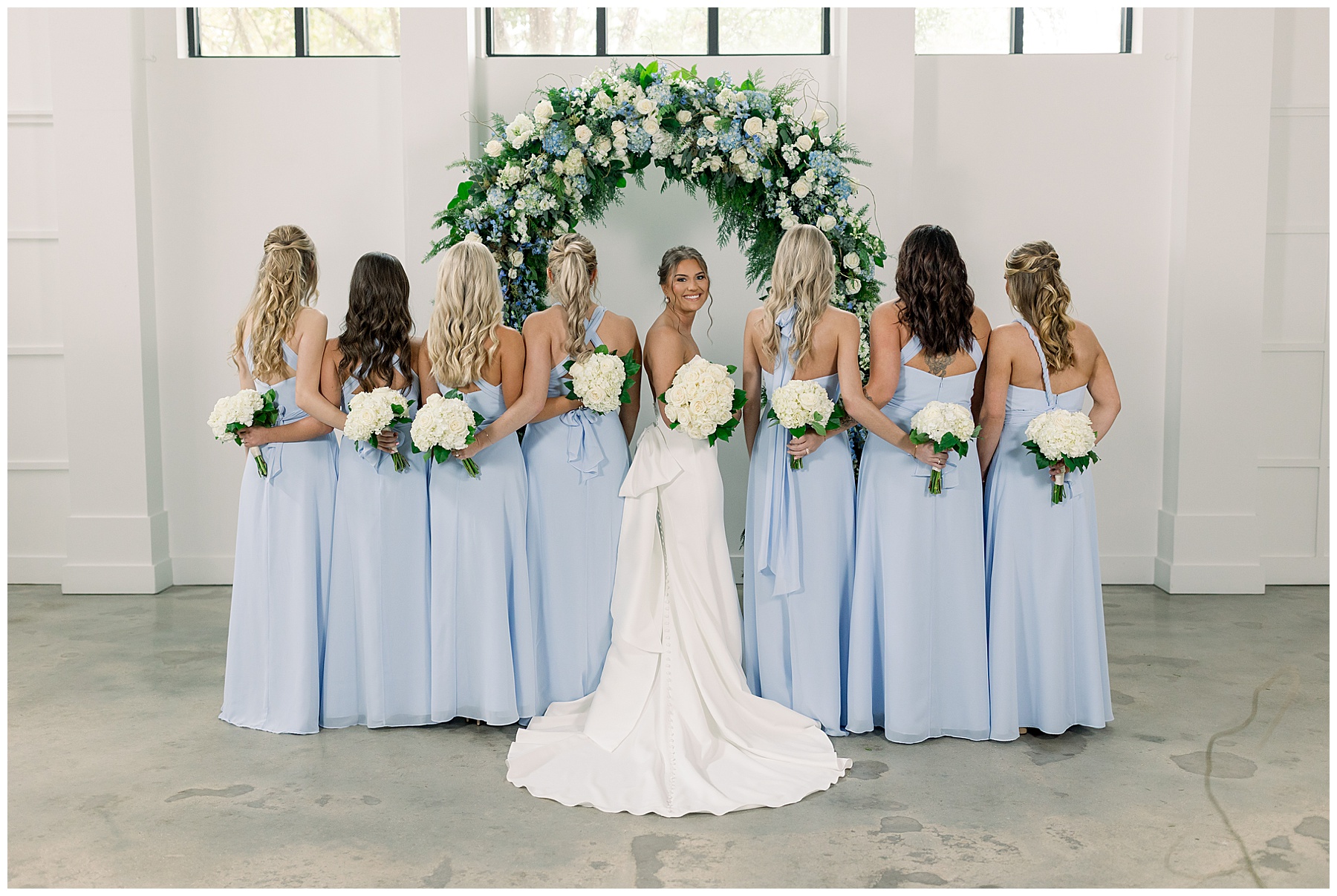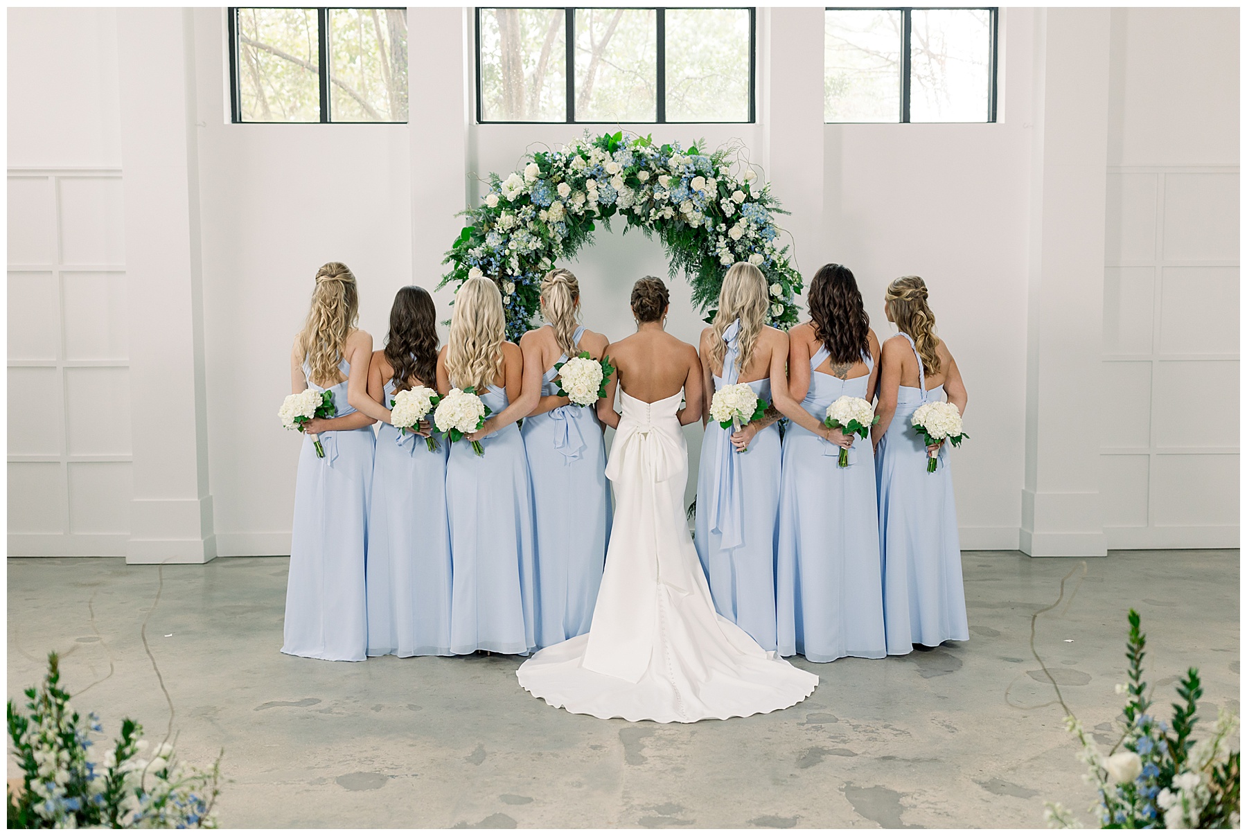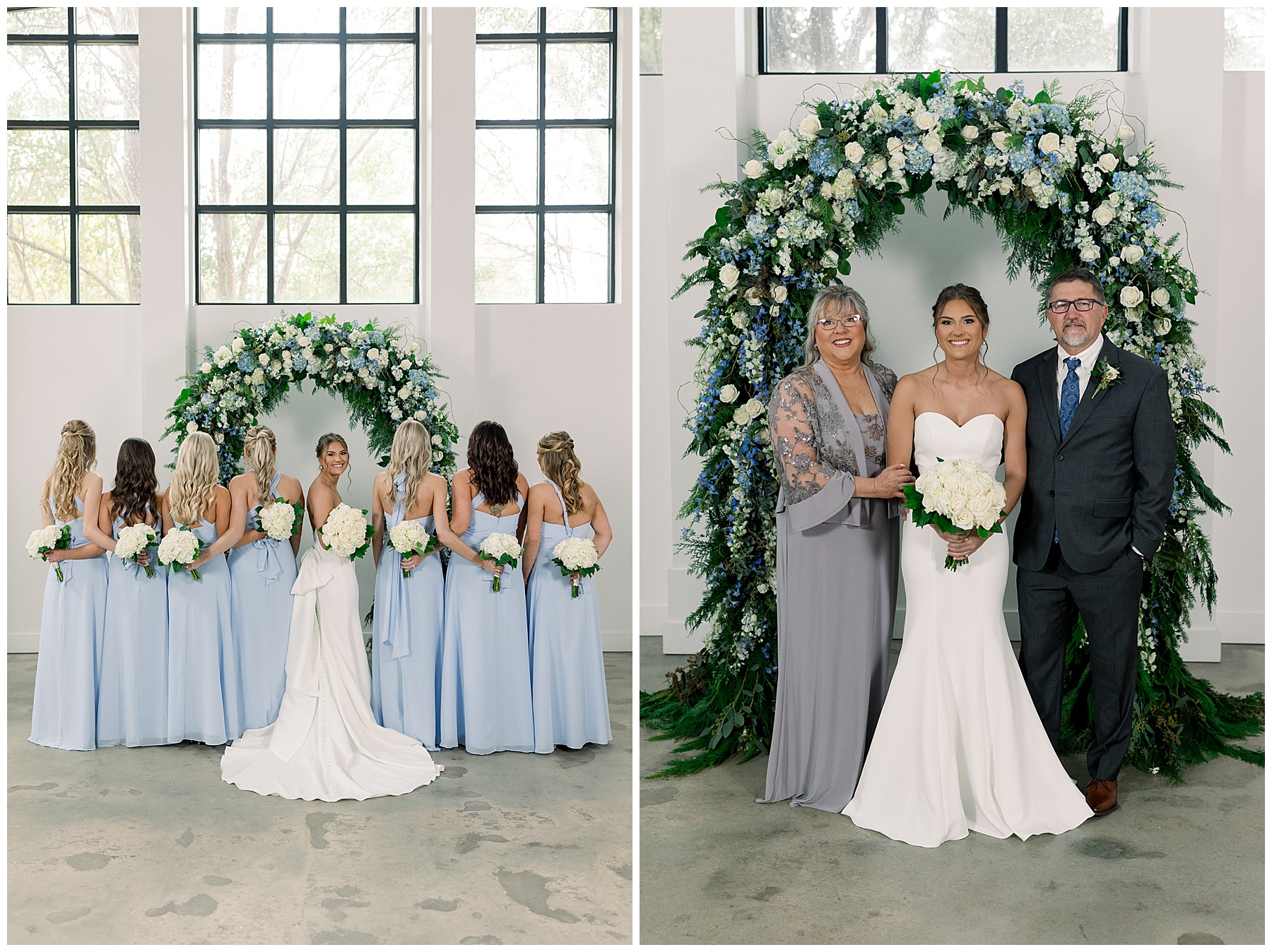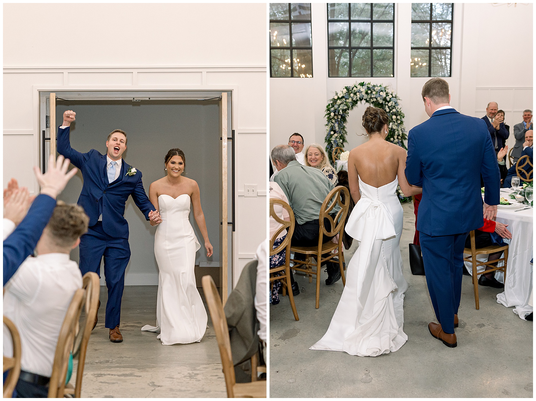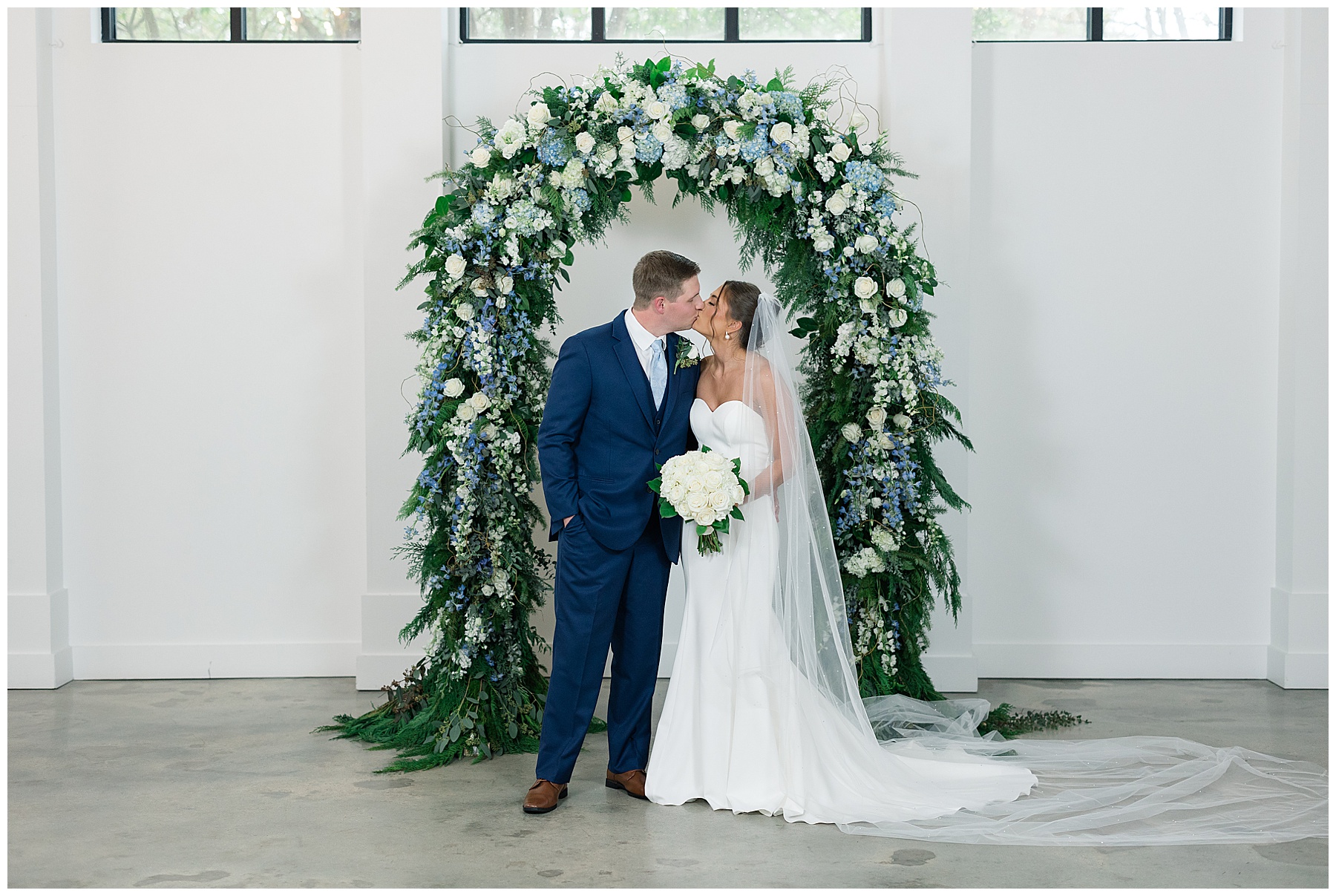 After the ceremony, we were able to go outside for photos thankfully, and everyone was troopers in the cold and wind! Alexsis and Hunter are photogenic and made our jobs so easy. I especially loved her longgggg veil, and the bow that she added to the back of her dress was such a unique and fun touch! Some of my favorite photos of them are actually in front of the floral arch because of the significance of BOTH their family’s hard work!