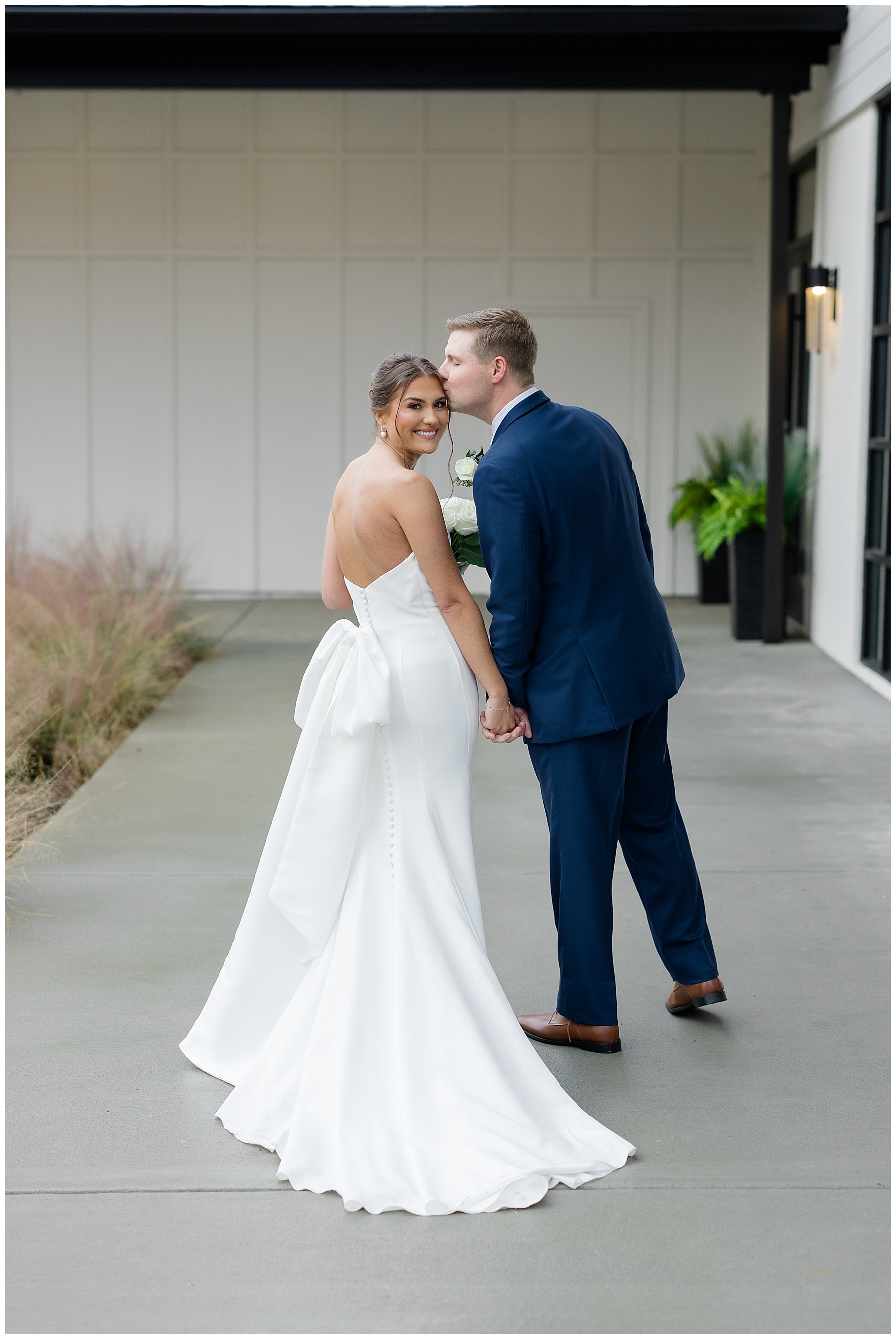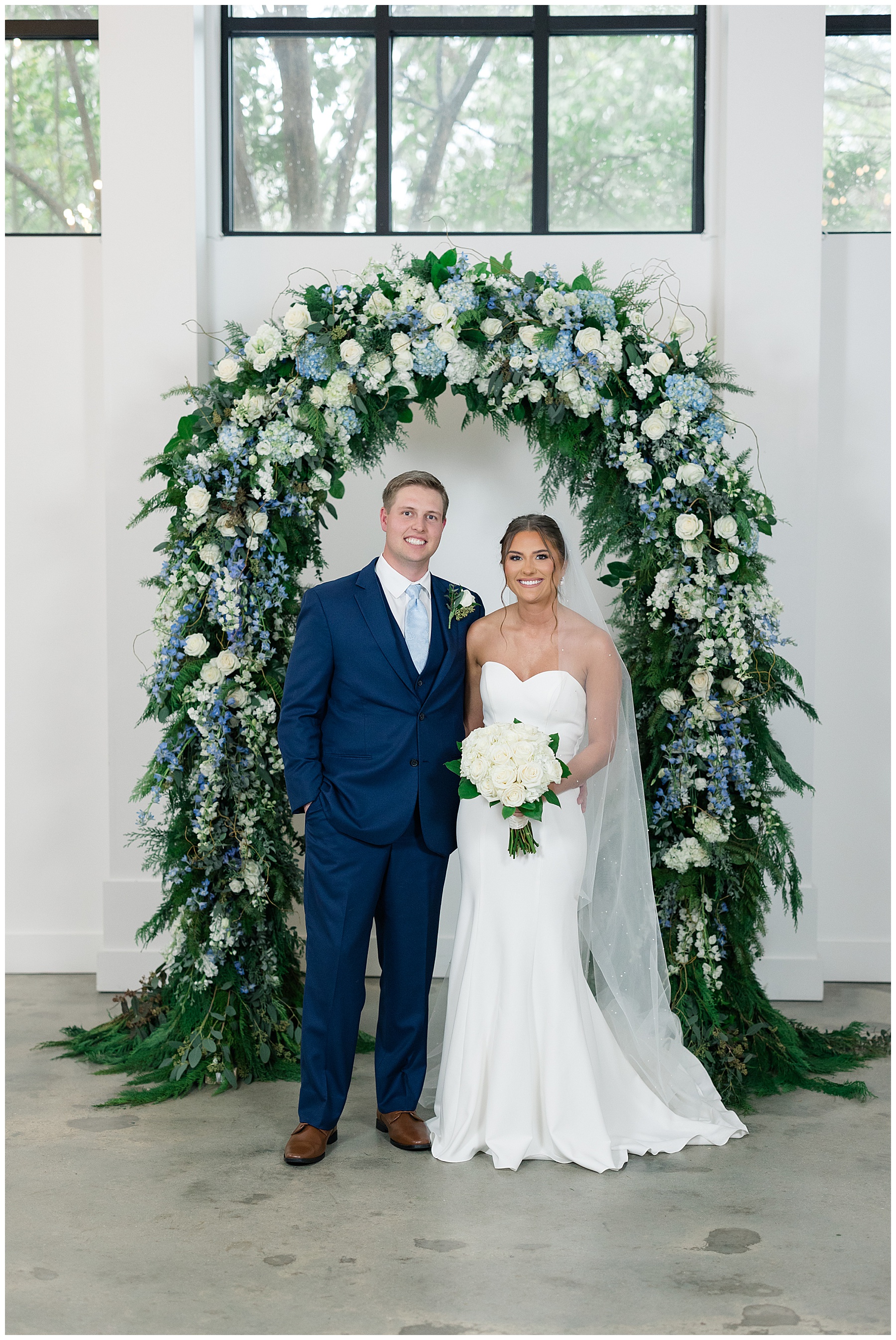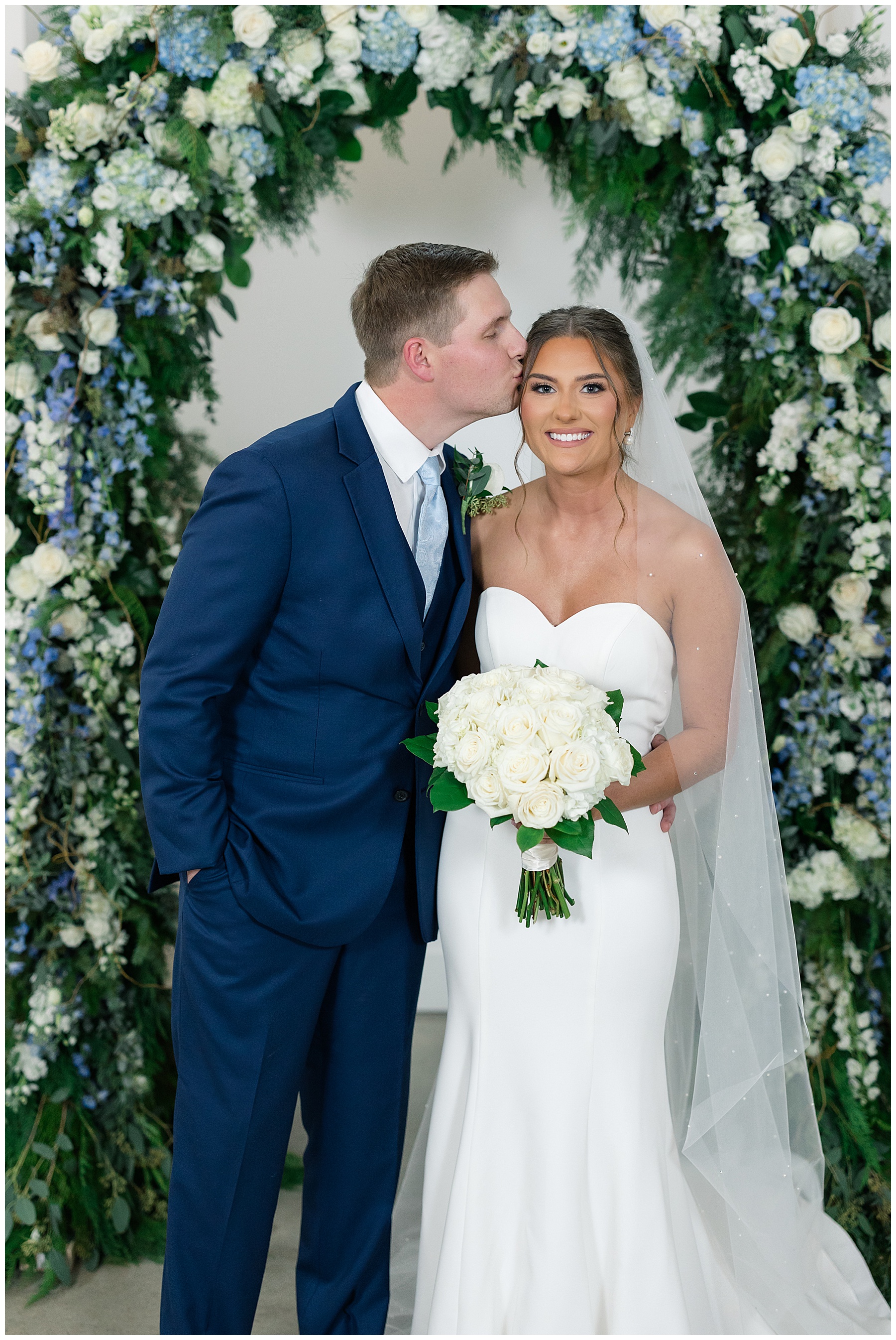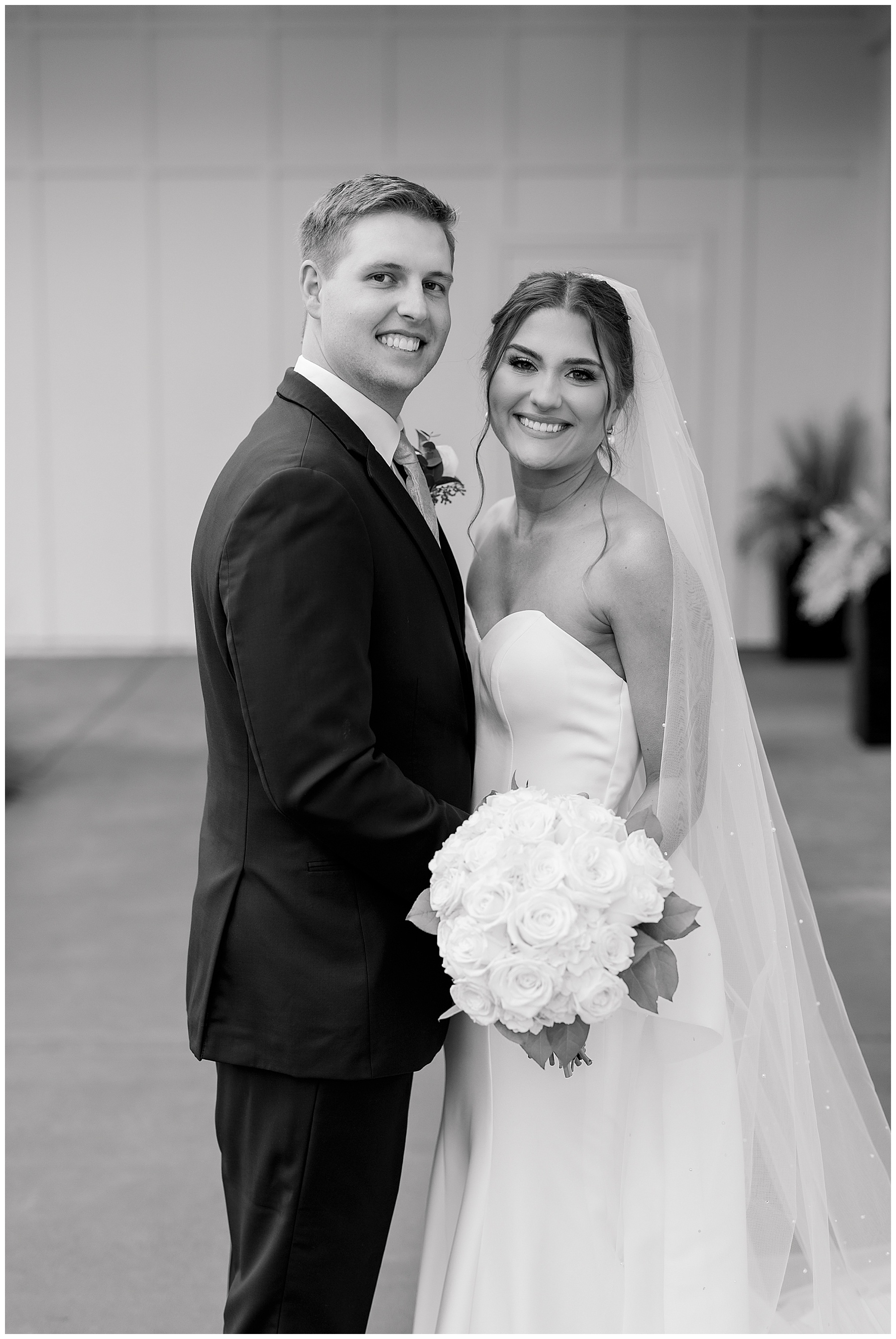 After the ceremony, we were able to go outside for photos thankfully, and everyone was troopers in the cold and wind! Alexsis and Hunter are photogenic and made our jobs so easy. I especially loved her longgggg veil, and the bow that she added to the back of her dress was such a unique and fun touch! Some of my favorite photos of them are actually in front of the floral arch because of the significance of BOTH their family’s hard work!