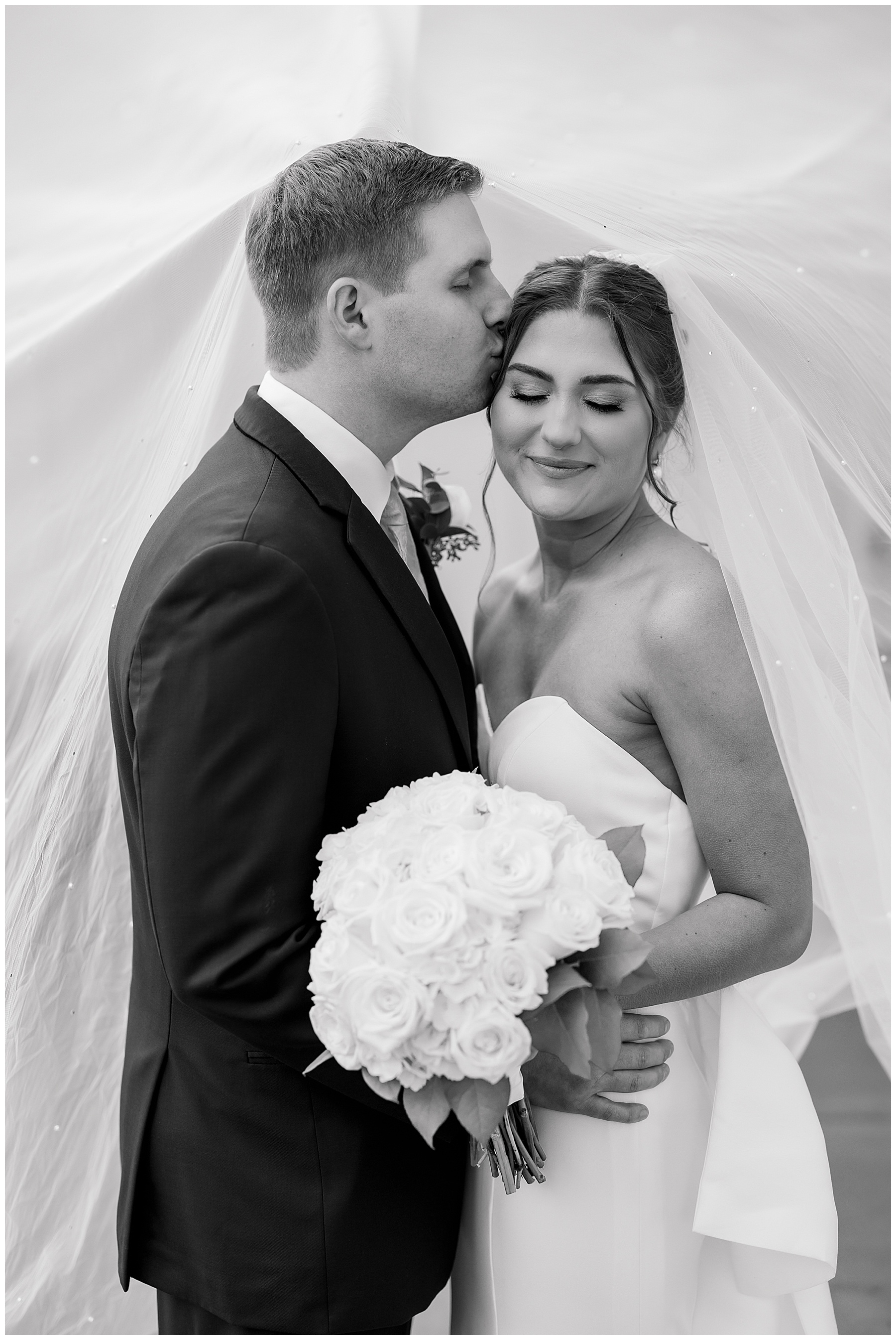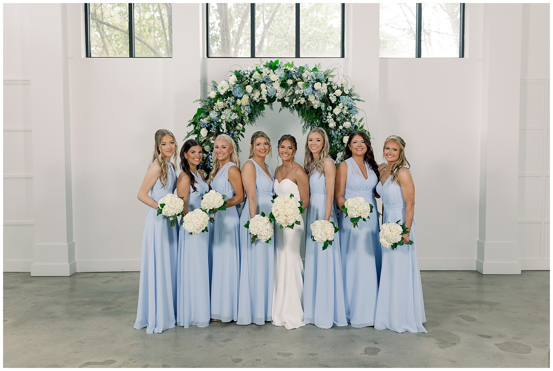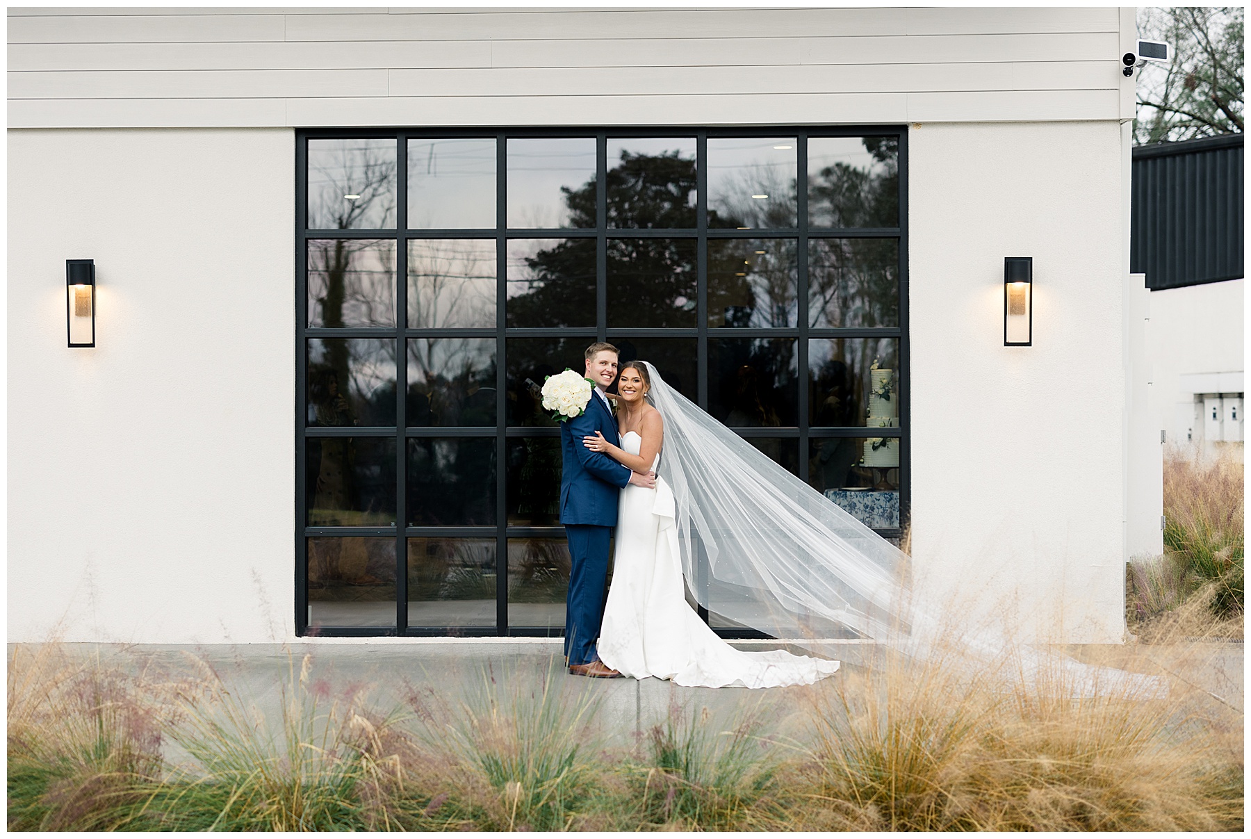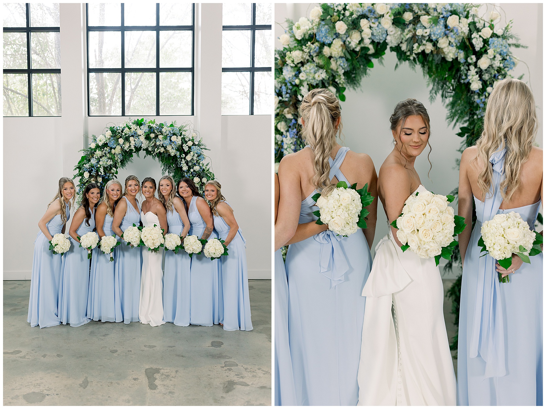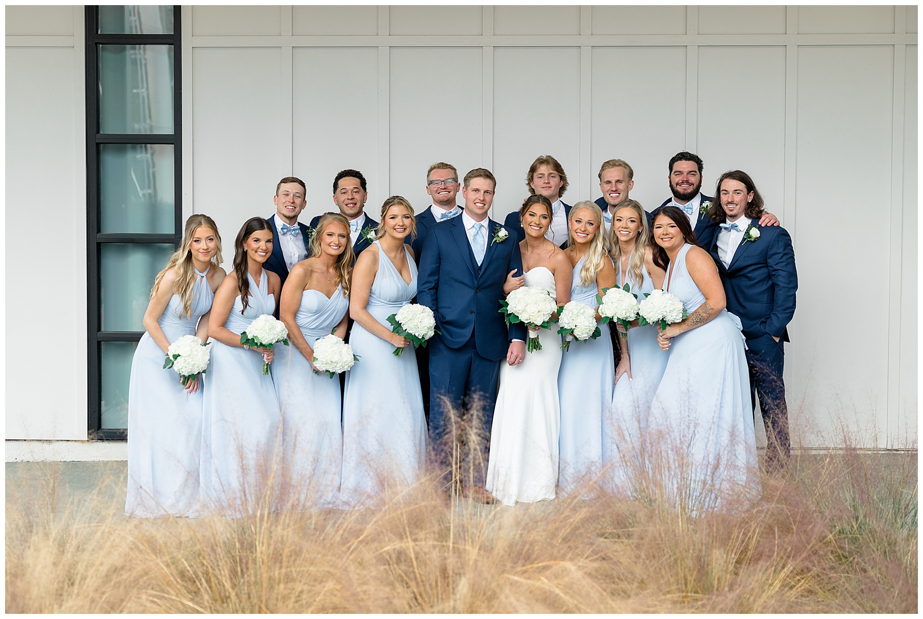 After the ceremony, we were able to go outside for photos thankfully, and everyone was troopers in the cold and wind! Alexsis and Hunter are photogenic and made our jobs so easy. I especially loved her longgggg veil, and the bow that she added to the back of her dress was such a unique and fun touch! Some of my favorite photos of them are actually in front of the floral arch because of the significance of BOTH their family’s hard work!