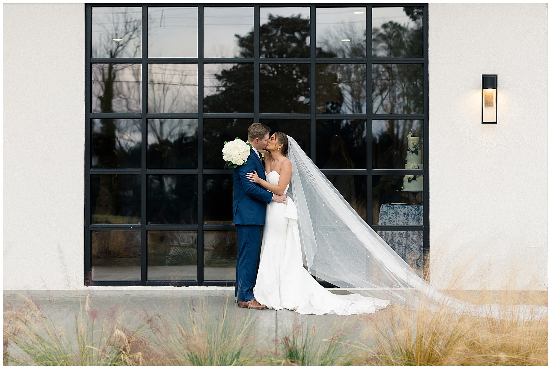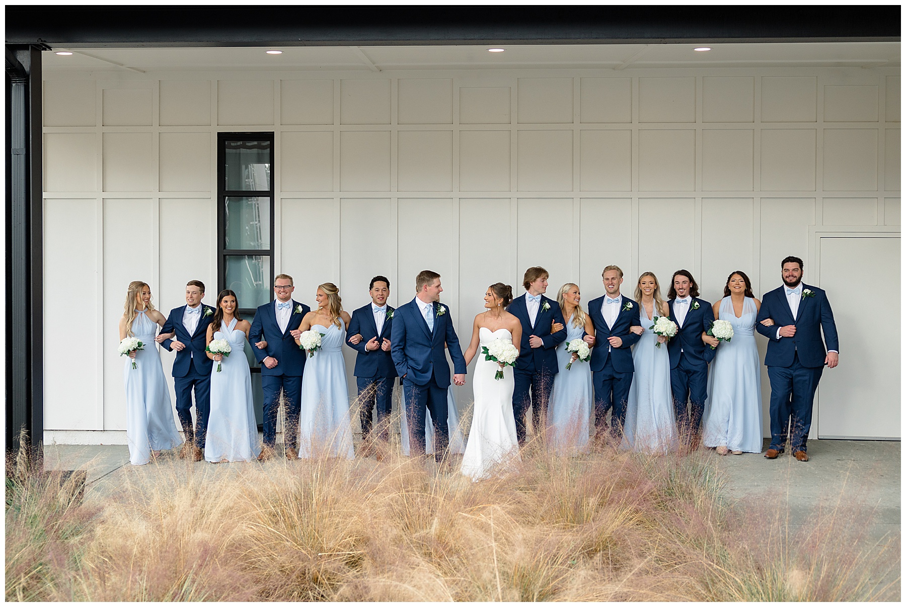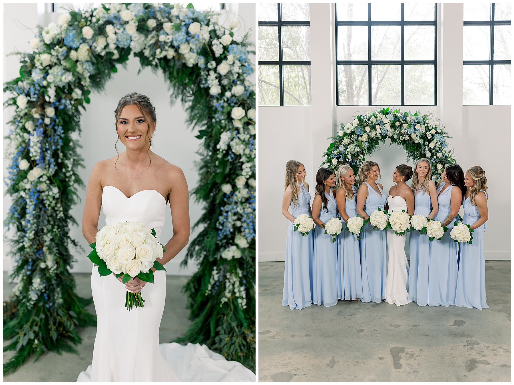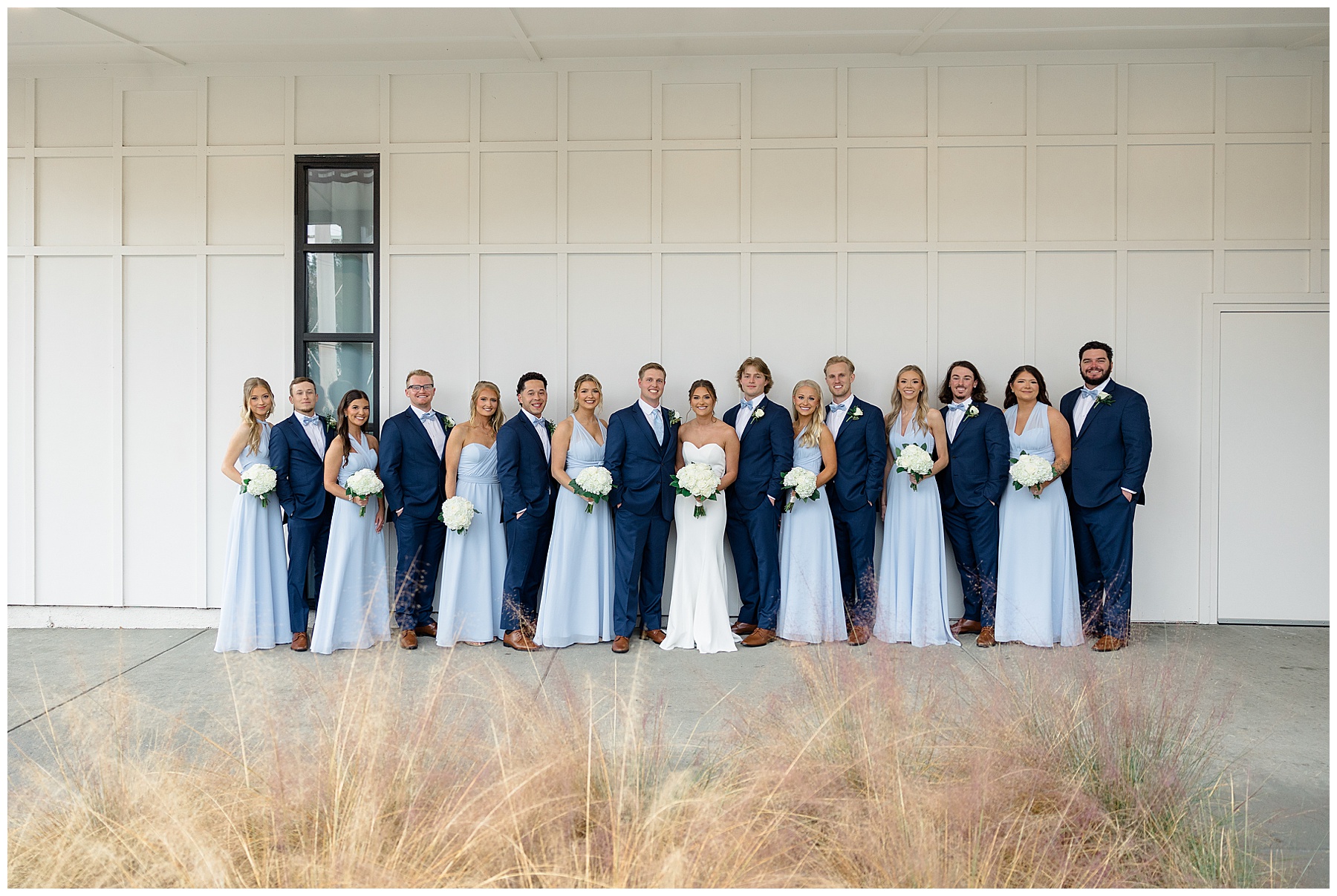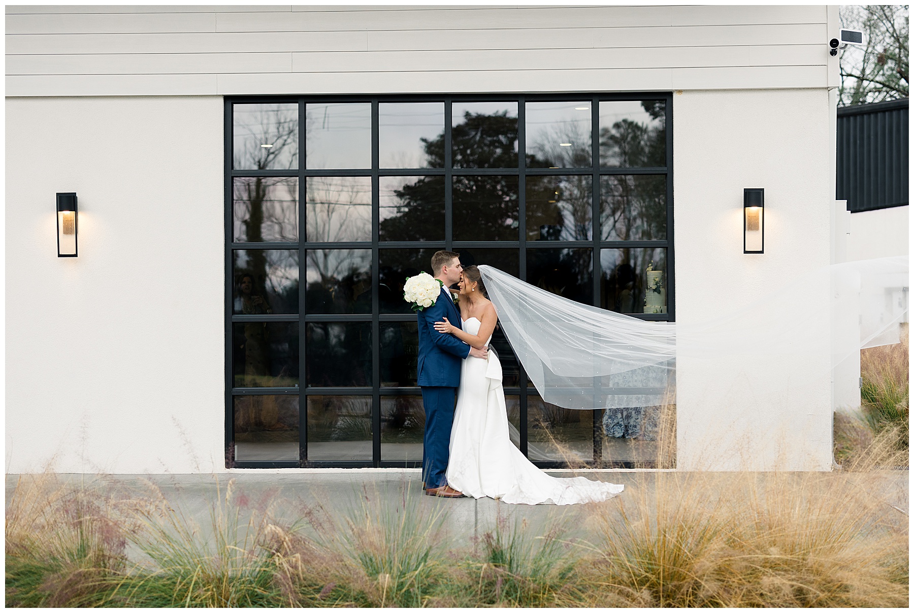 After the ceremony, we were able to go outside for photos thankfully, and everyone was troopers in the cold and wind! Alexsis and Hunter are photogenic and made our jobs so easy. I especially loved her longgggg veil, and the bow that she added to the back of her dress was such a unique and fun touch! Some of my favorite photos of them are actually in front of the floral arch because of the significance of BOTH their family’s hard work!
