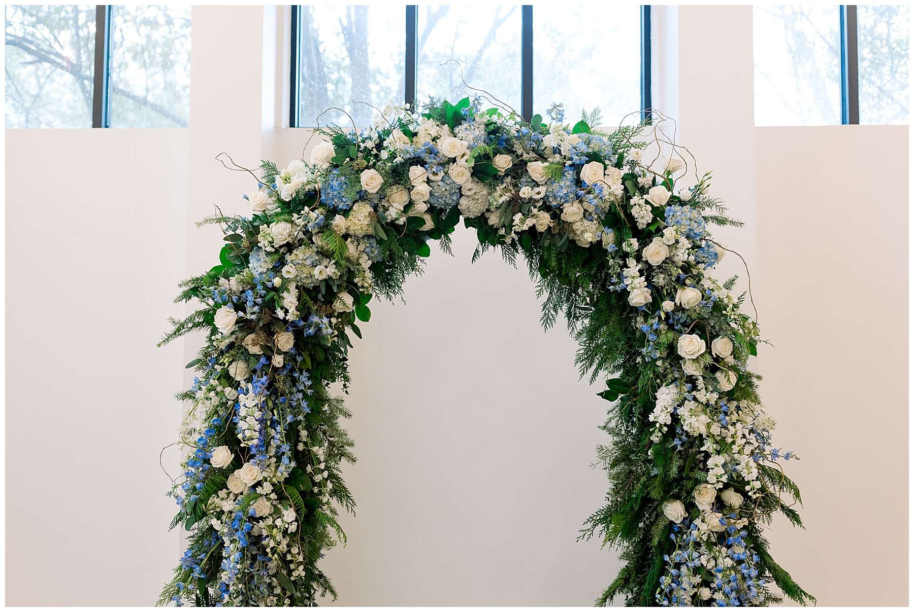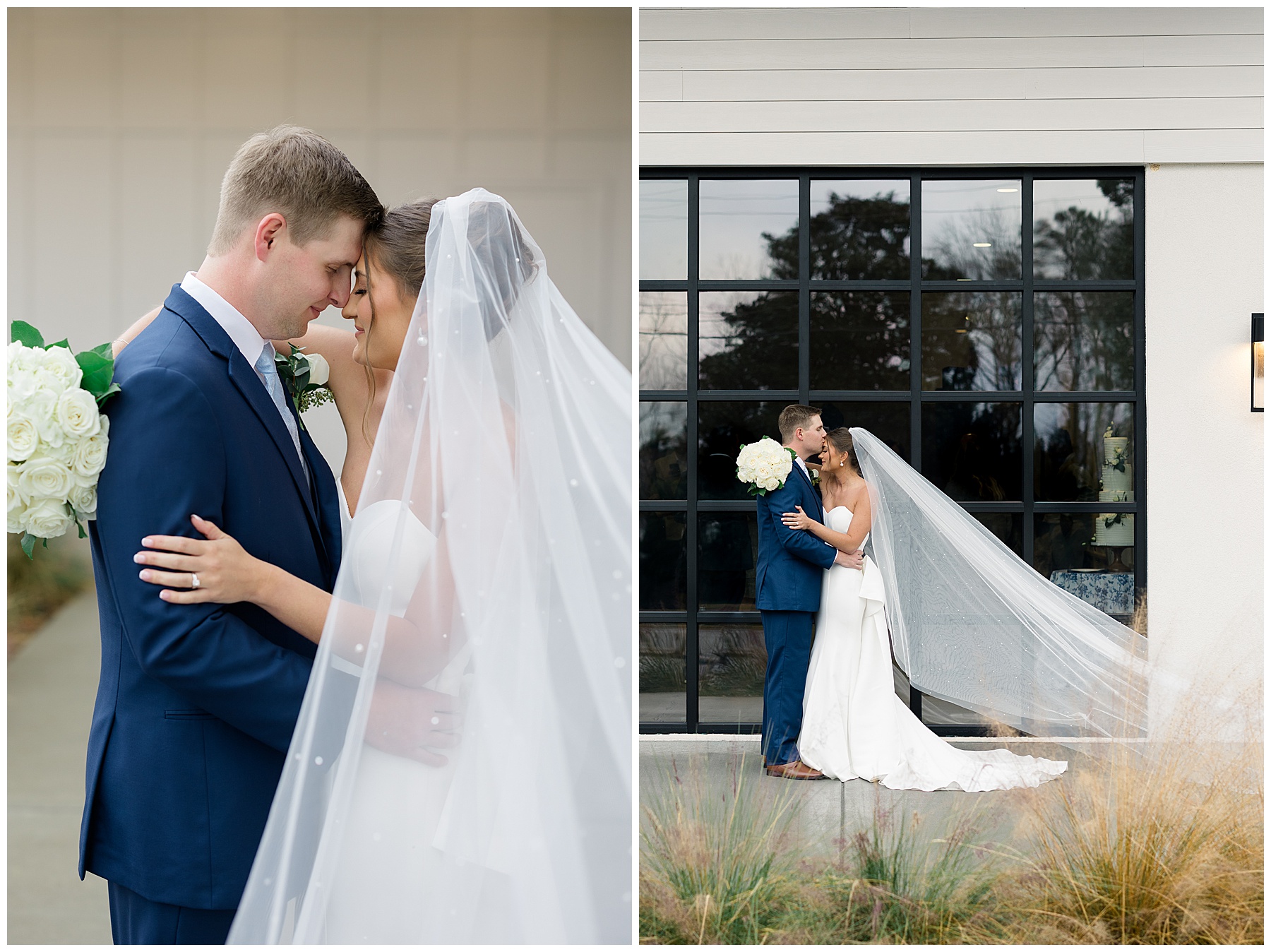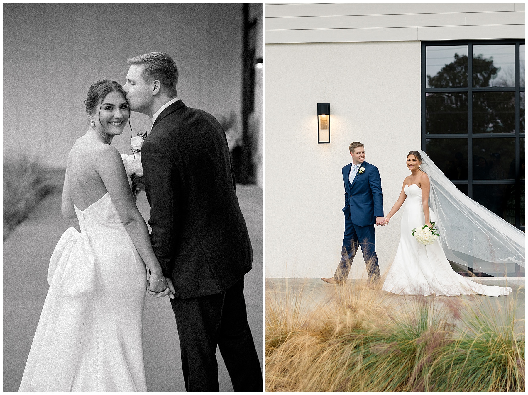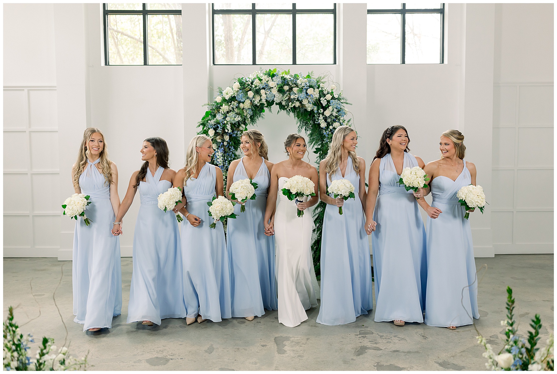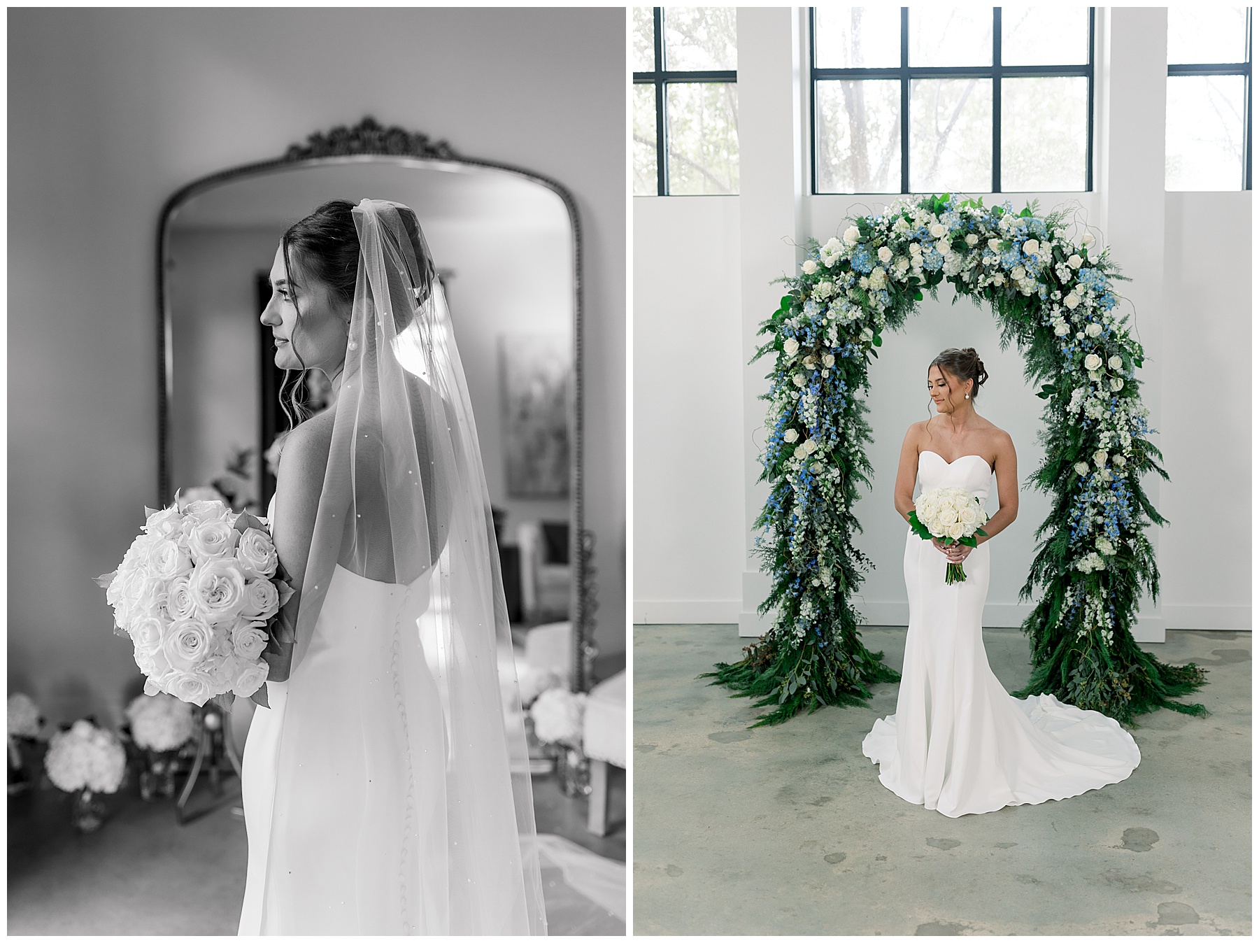 After the ceremony, we were able to go outside for photos thankfully, and everyone was troopers in the cold and wind! Alexsis and Hunter are photogenic and made our jobs so easy. I especially loved her longgggg veil, and the bow that she added to the back of her dress was such a unique and fun touch! Some of my favorite photos of them are actually in front of the floral arch because of the significance of BOTH their family’s hard work!
