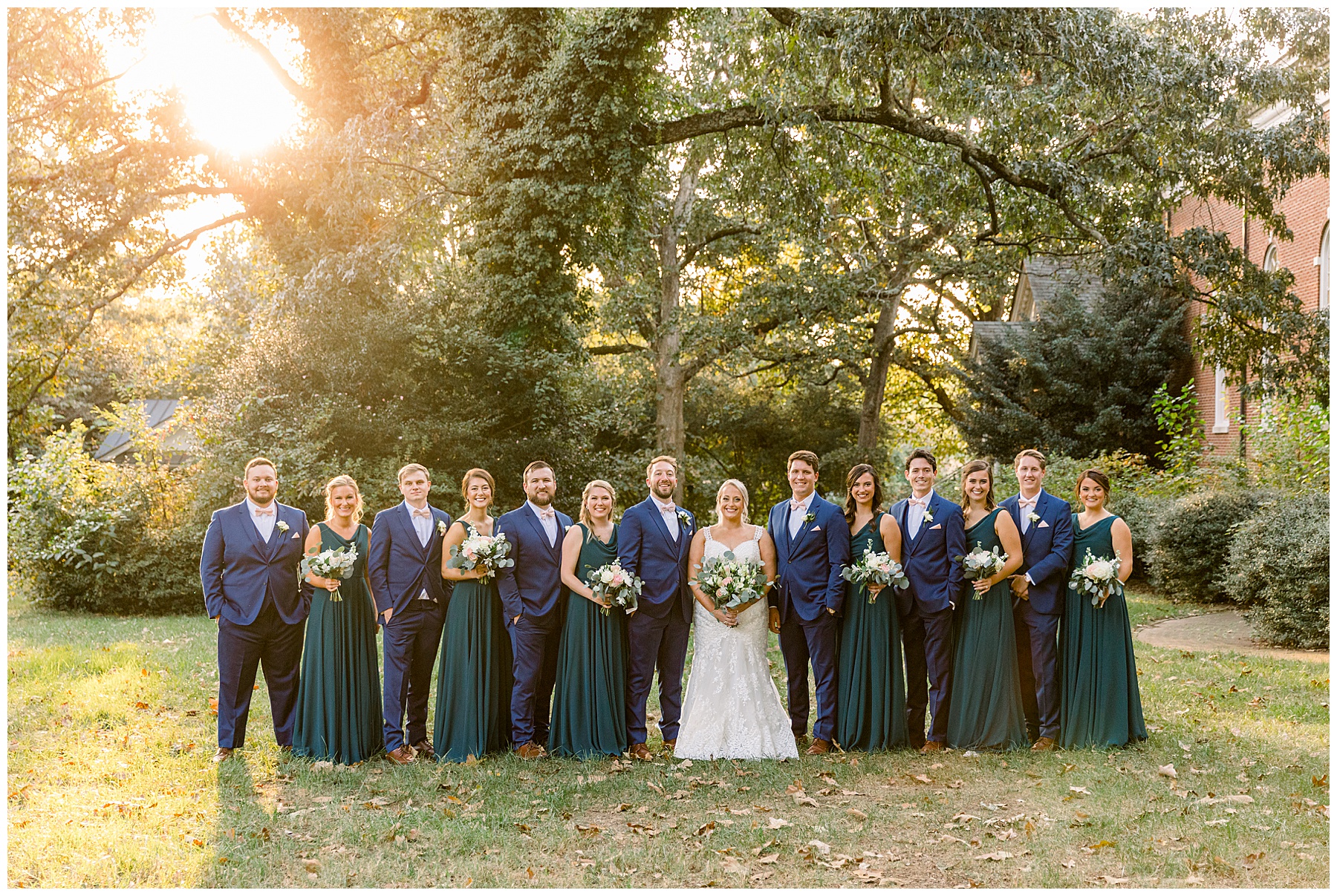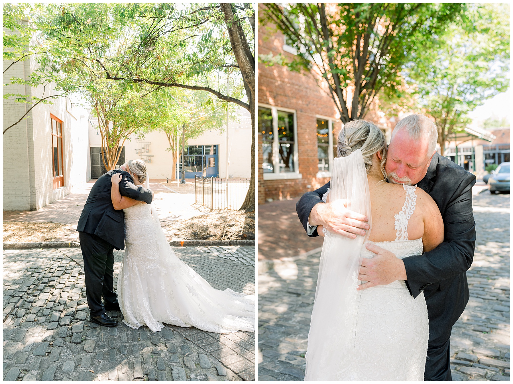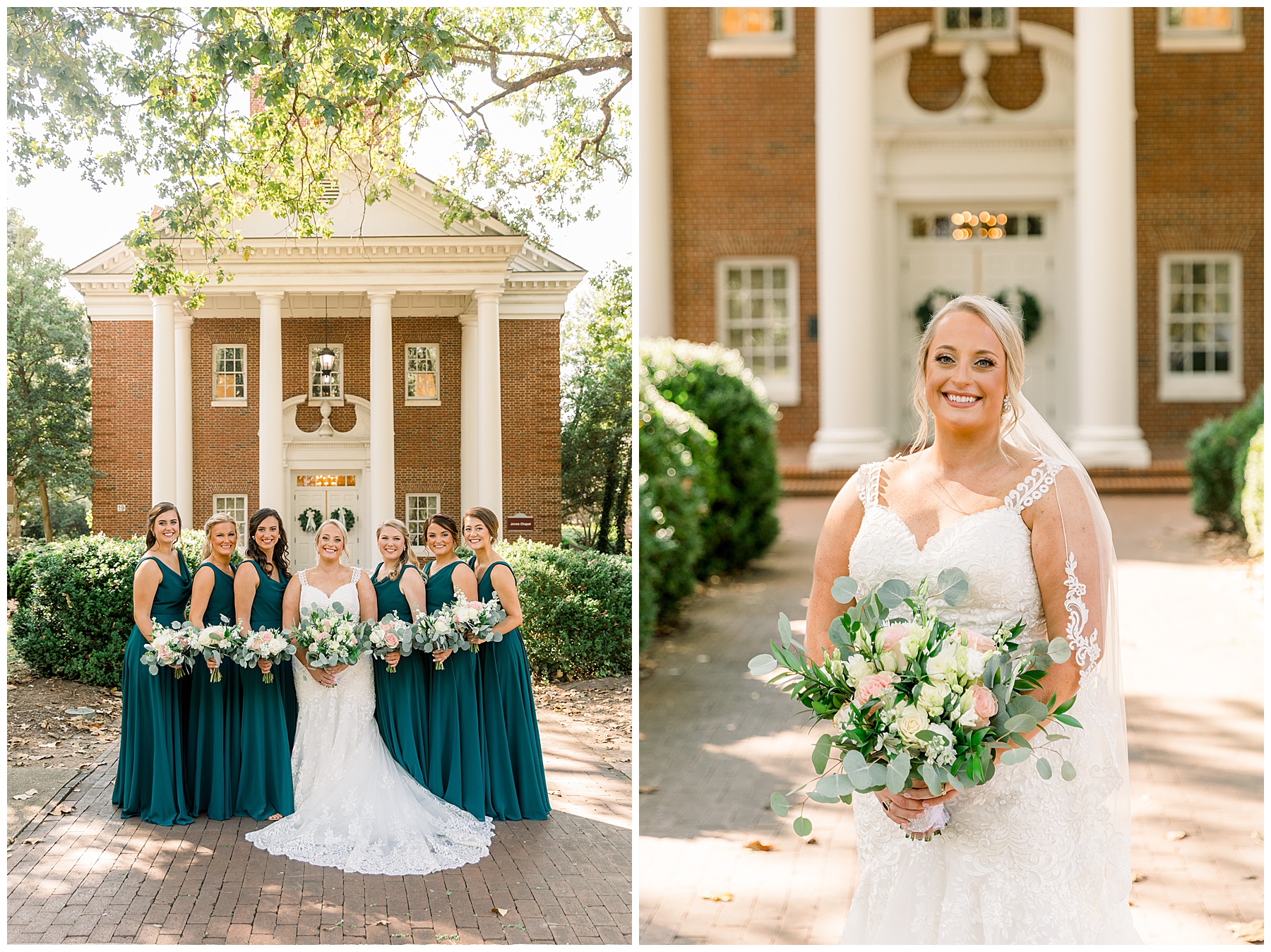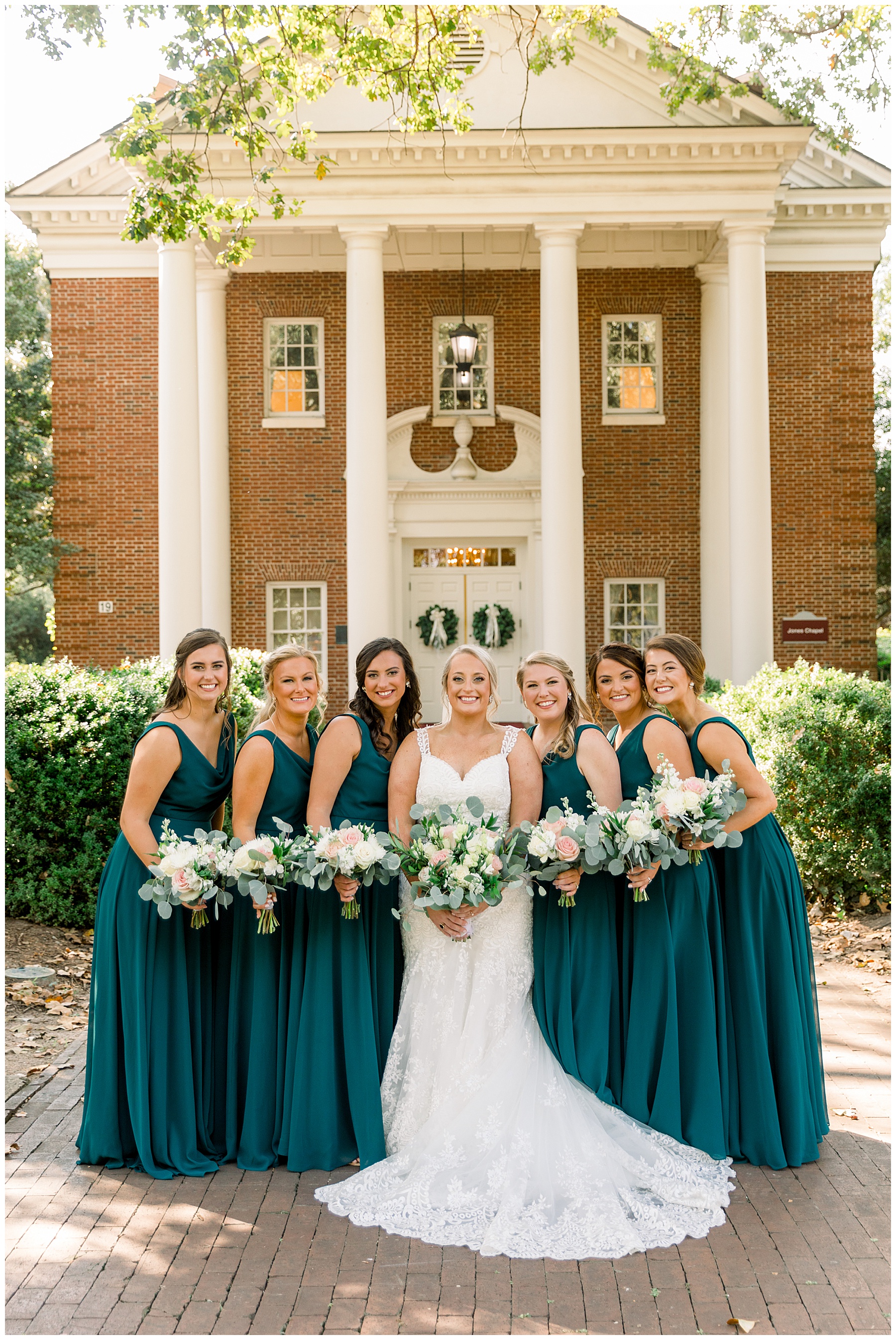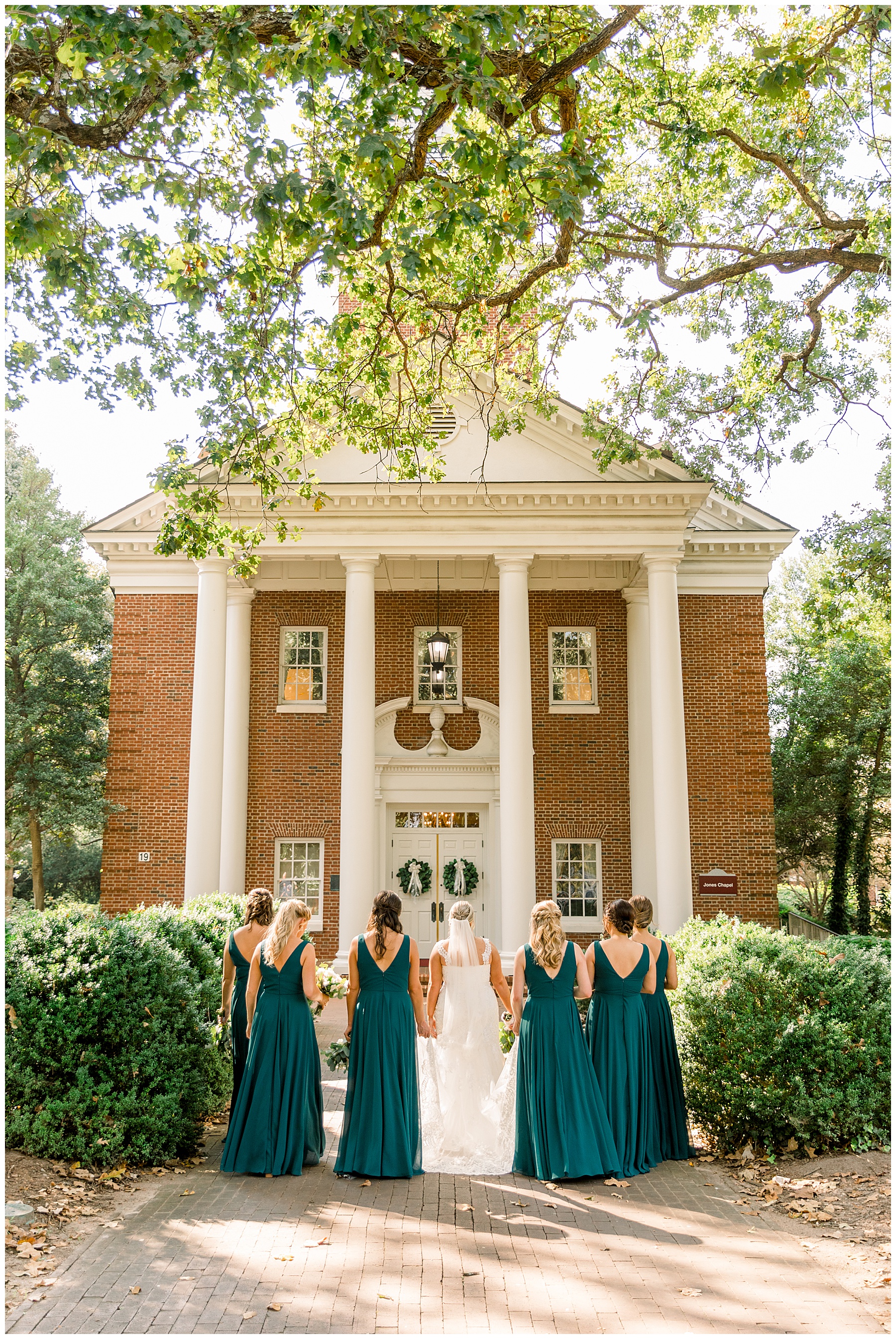 Anna had a First Look with her dad, and he’s just precious! His laugh is contagious, and they shared an emotional moment together on the cobblestones. After that, we all headed to Meredith College for the ceremony, and the ceremony was Christ-centered and such a testimony of their faith. I loved hearing how much work Matthew and Anna have put into pre-marital counseling and preparing for their marriage, to start off their life in such an important way. After the ceremony, we photographed their portraits with the prettiest backdrop of ivy-covered trees that were just MAGICAL and I loved that little light-soaked spot!