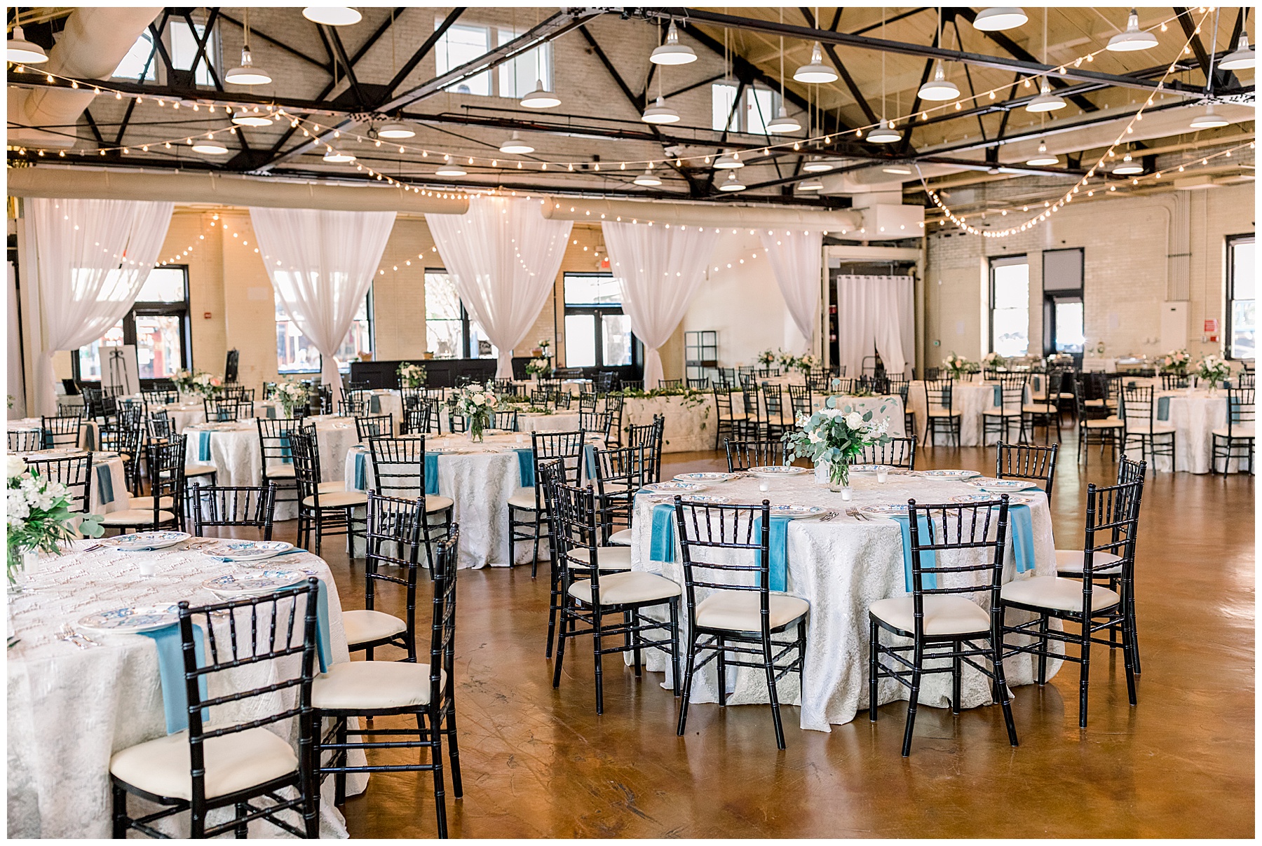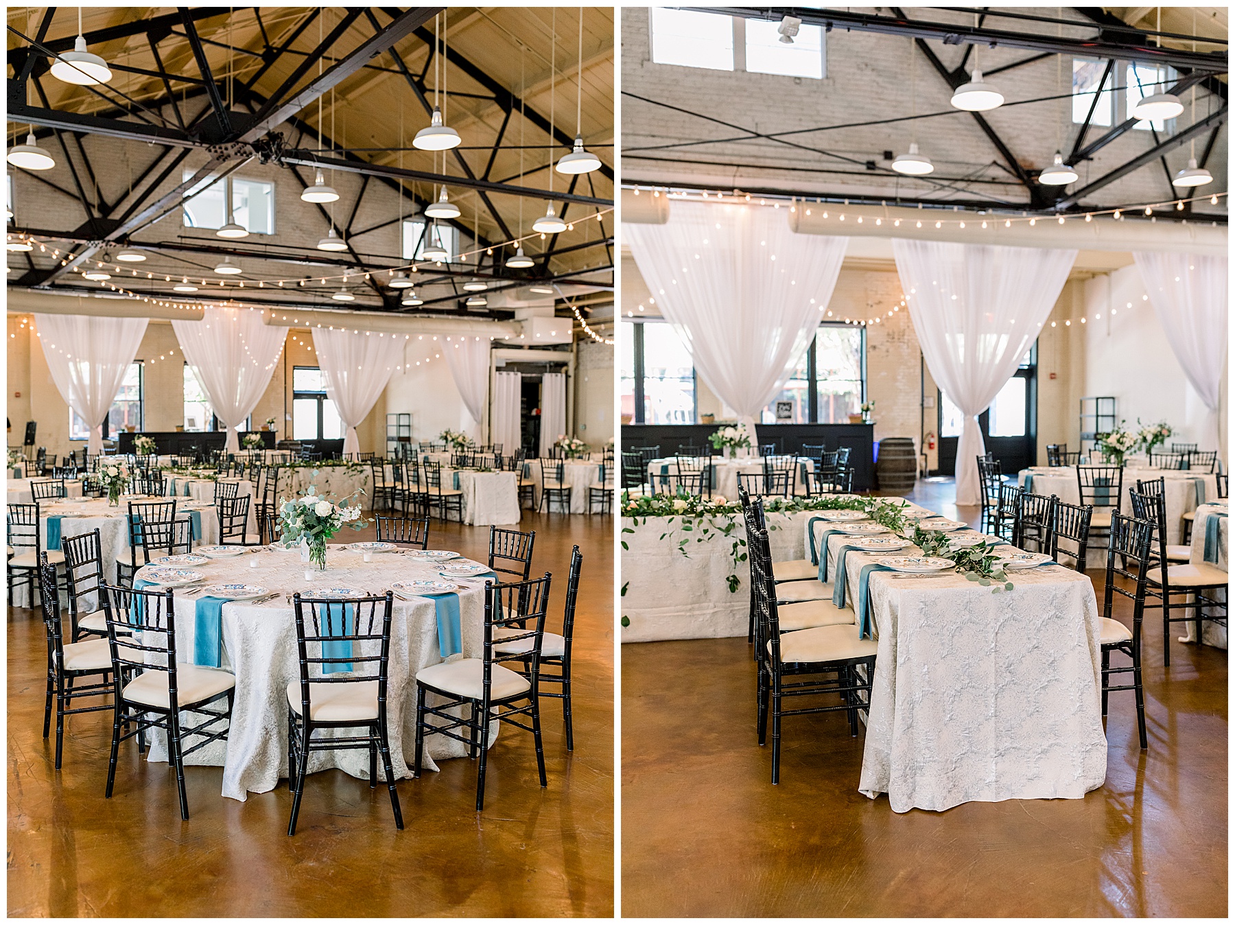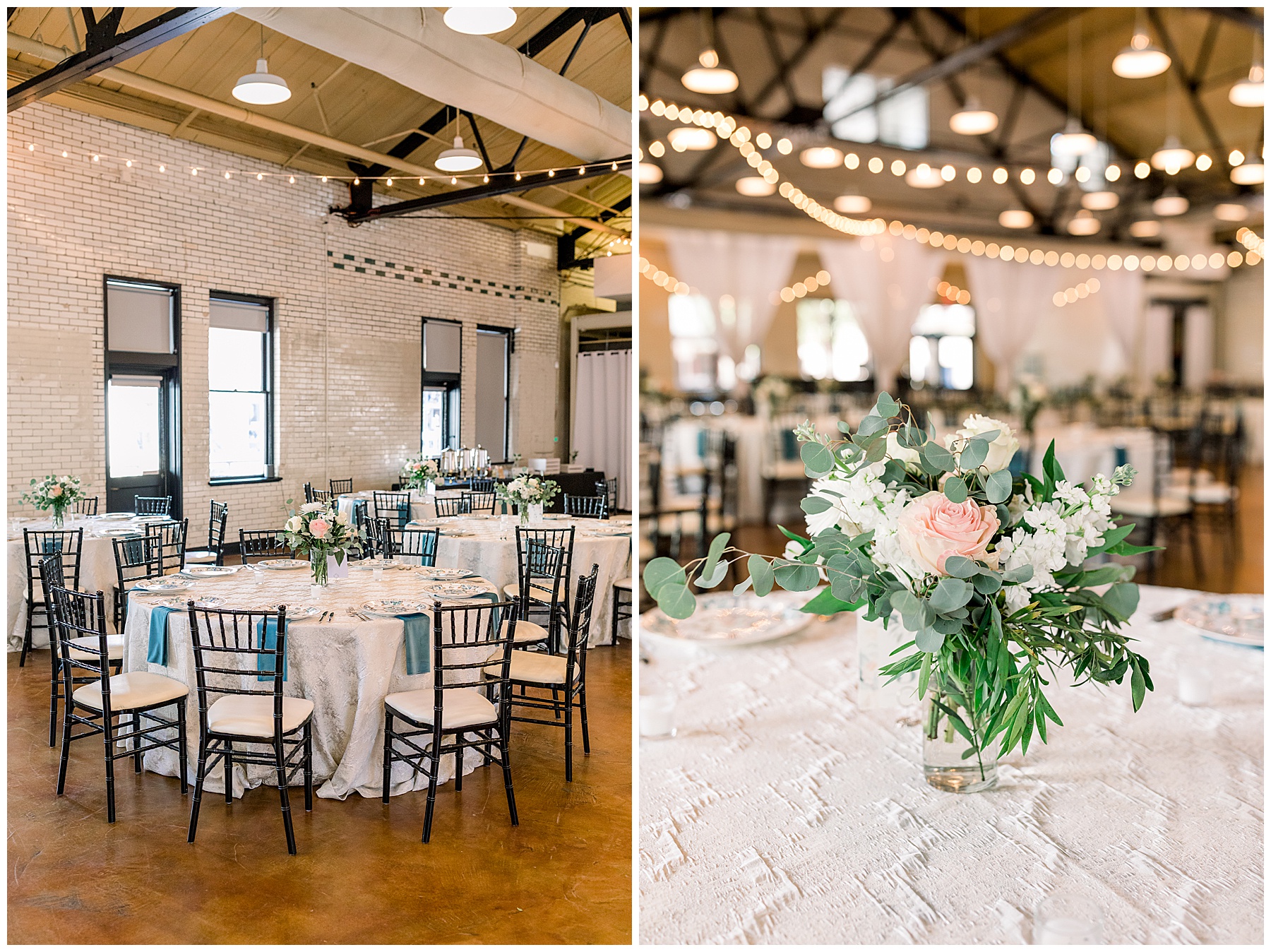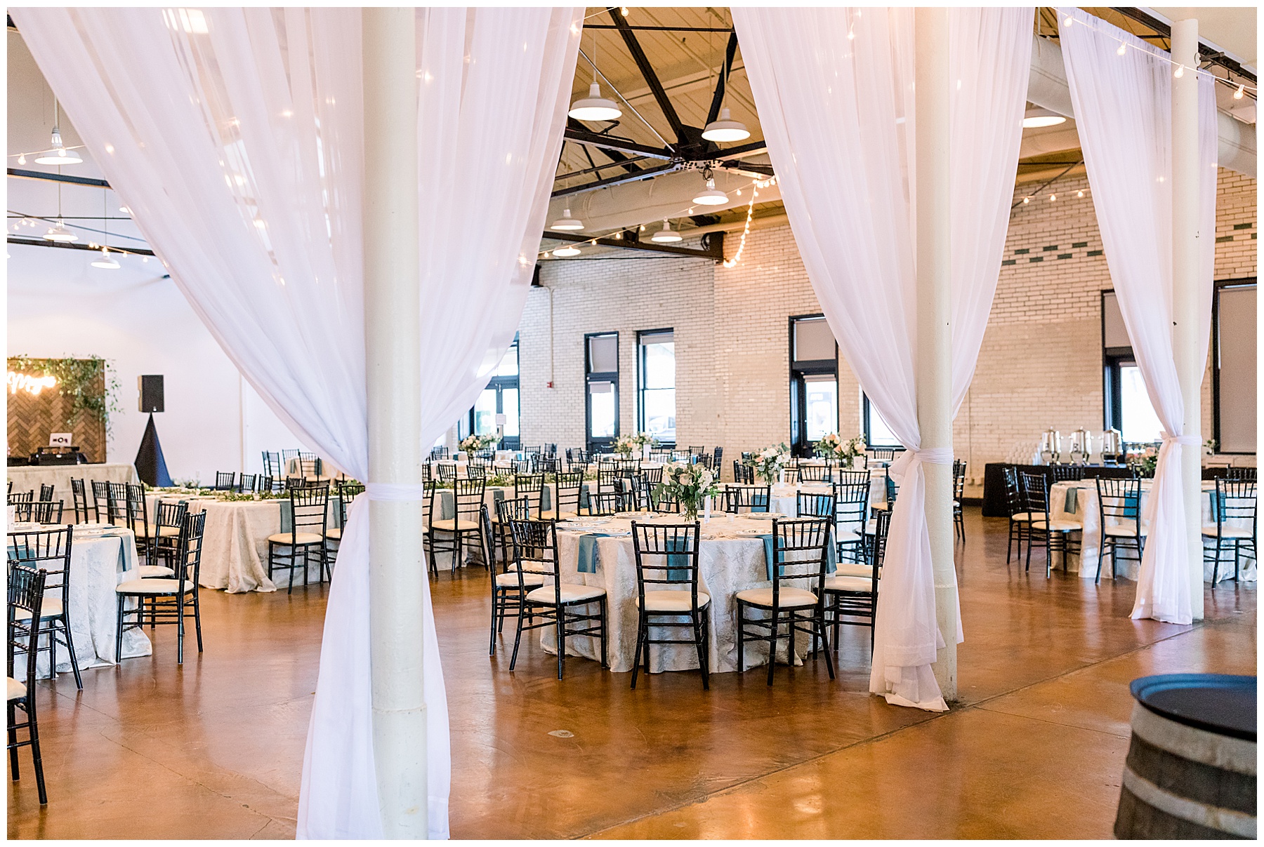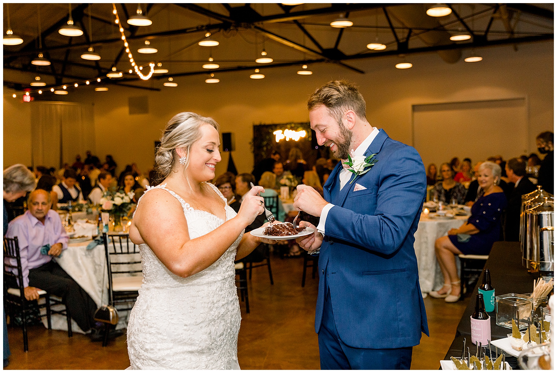 The reception kicked off at Market Hall – and it was beautiful! Anna had chosen the prettiest table linens with so much texture, patterned chargers on top of blue velvet napkins, and pops of color from the flowers and greenery were a great contrast from the tile and urban feel of the venue. We especially loved their custom lighted “The Meyers” sign above the DJ table – and now Phillip wants one for our house, haha!