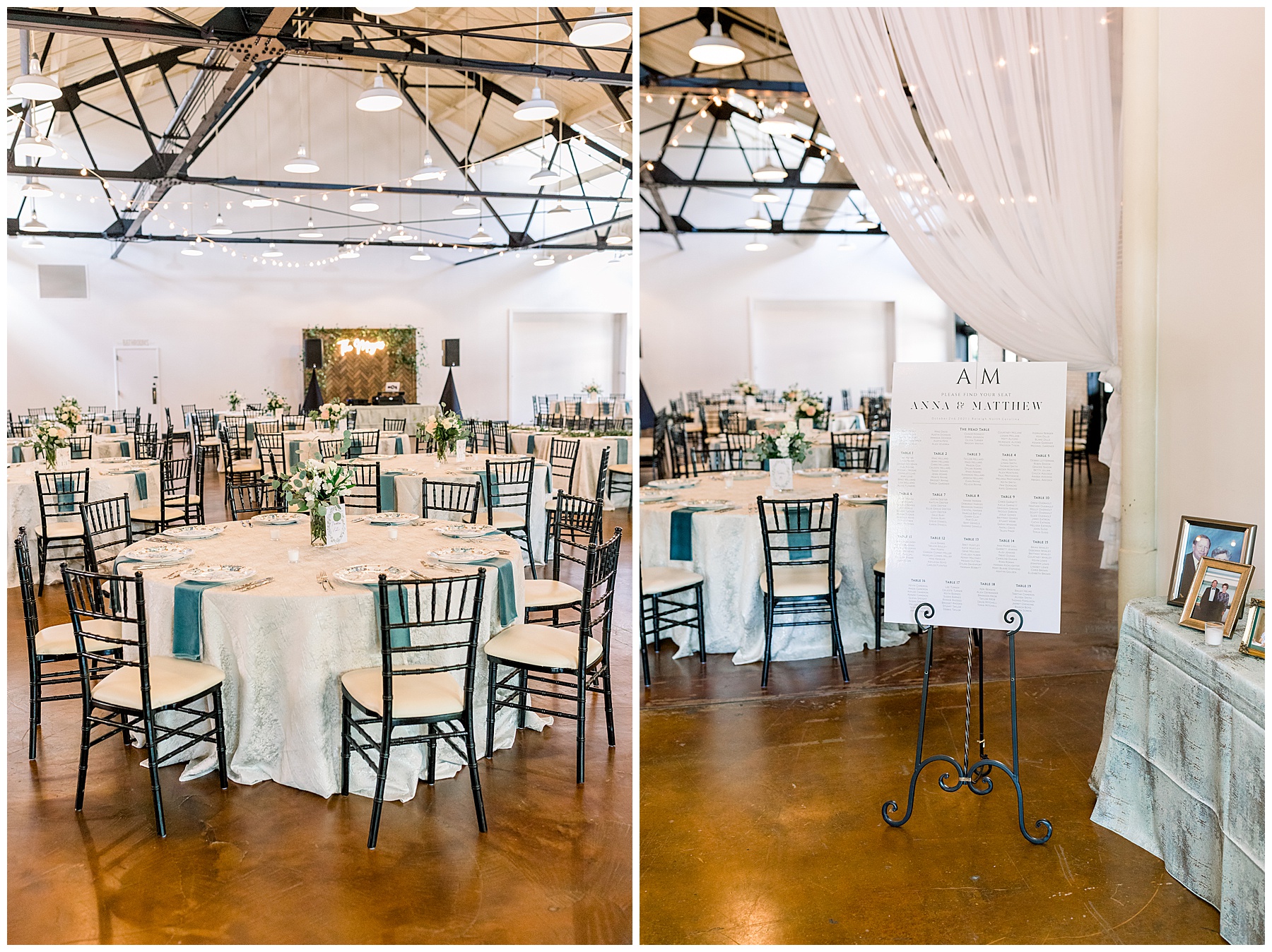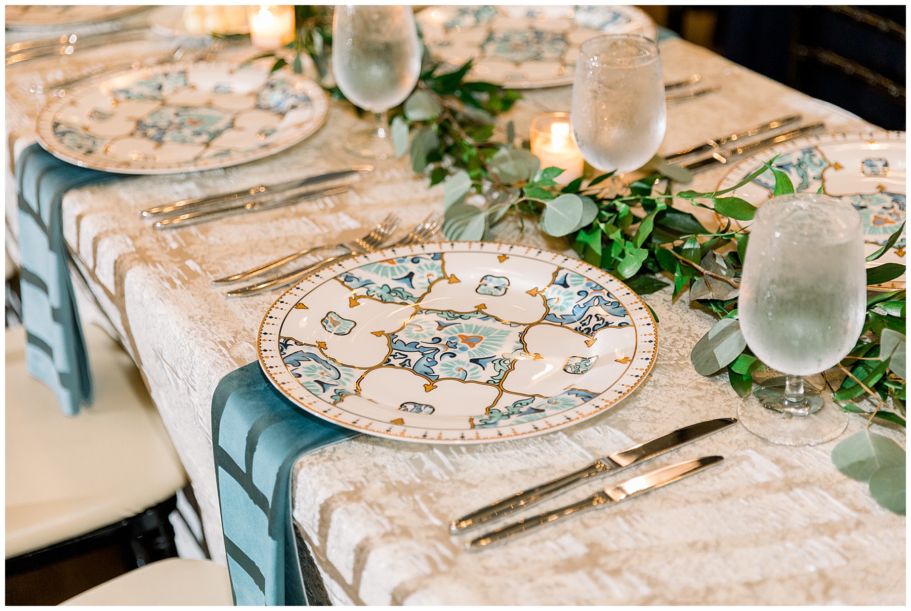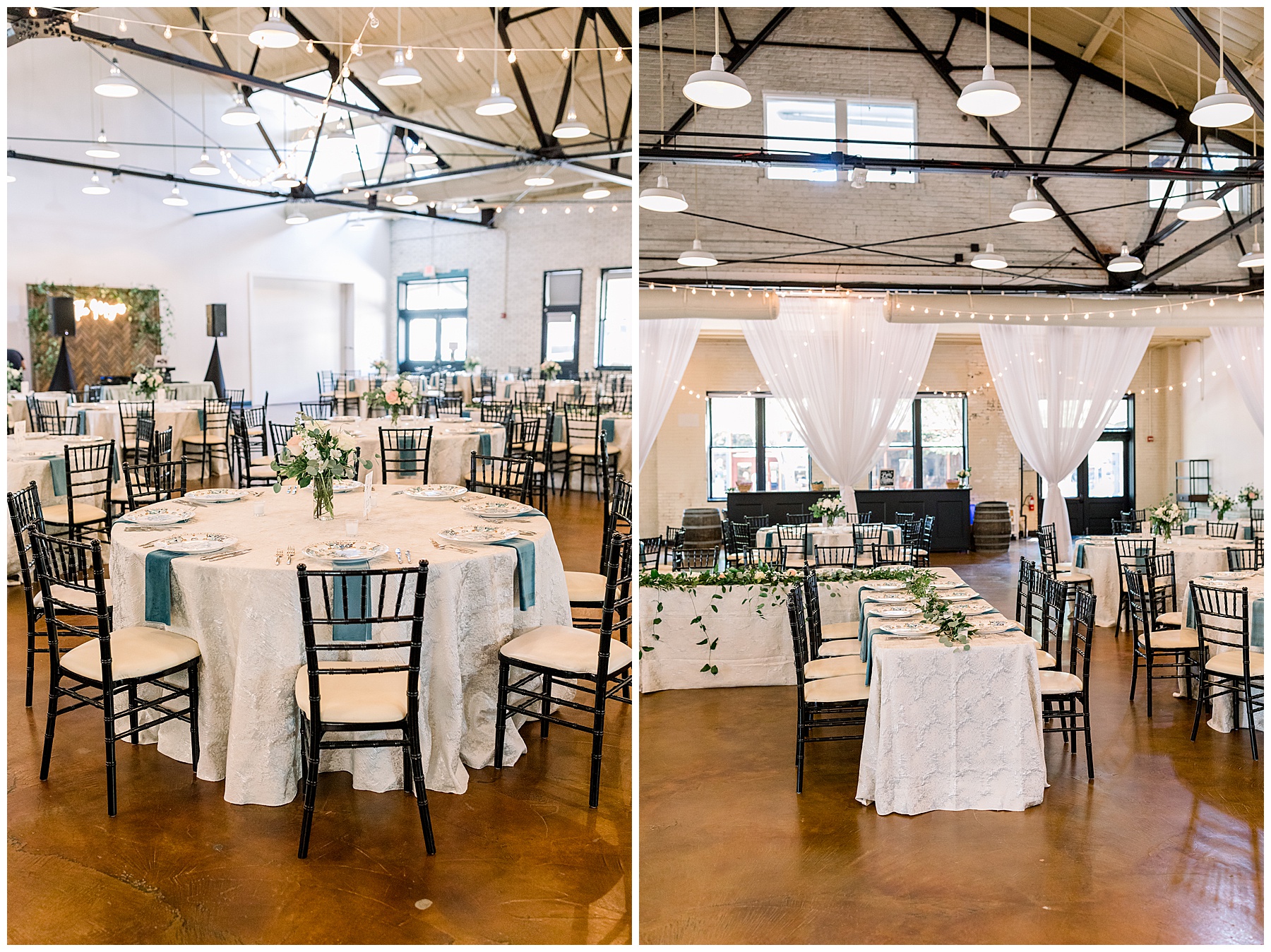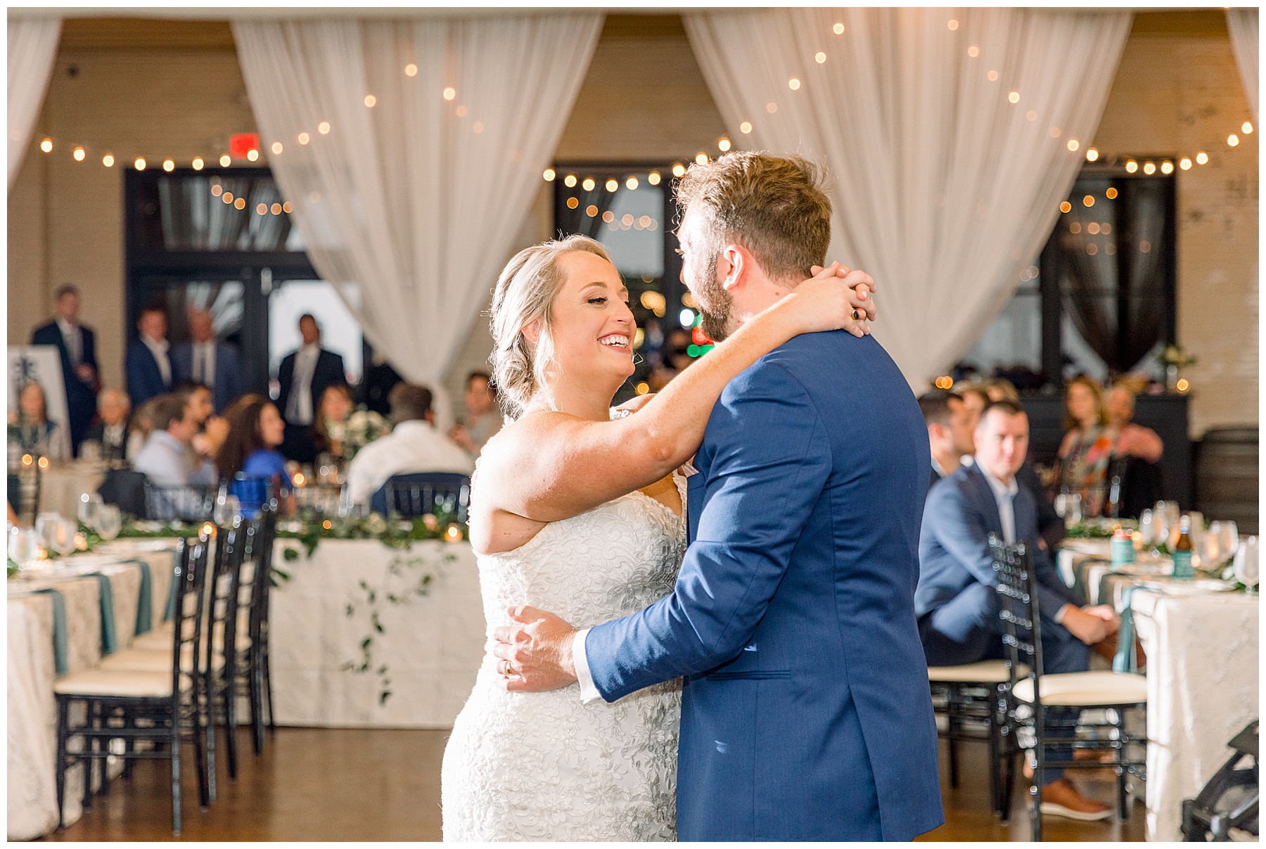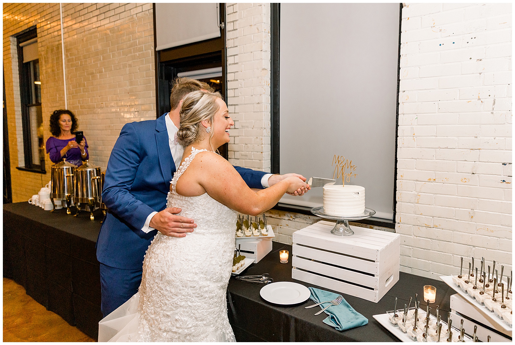 The reception kicked off at Market Hall – and it was beautiful! Anna had chosen the prettiest table linens with so much texture, patterned chargers on top of blue velvet napkins, and pops of color from the flowers and greenery were a great contrast from the tile and urban feel of the venue. We especially loved their custom lighted “The Meyers” sign above the DJ table – and now Phillip wants one for our house, haha!