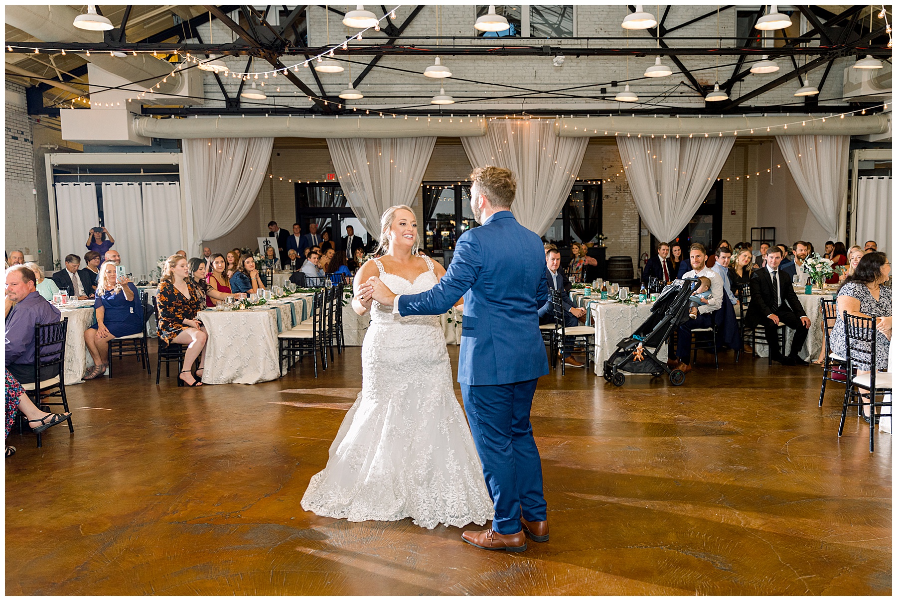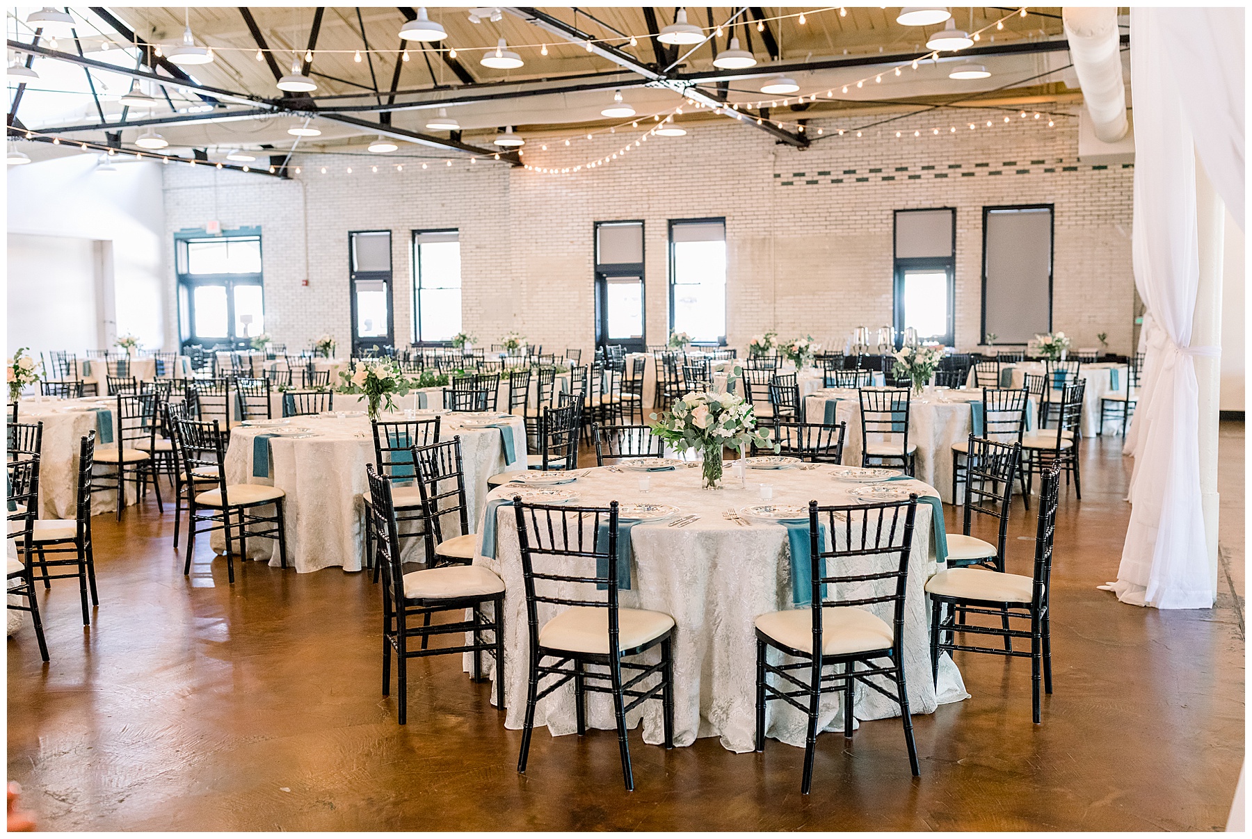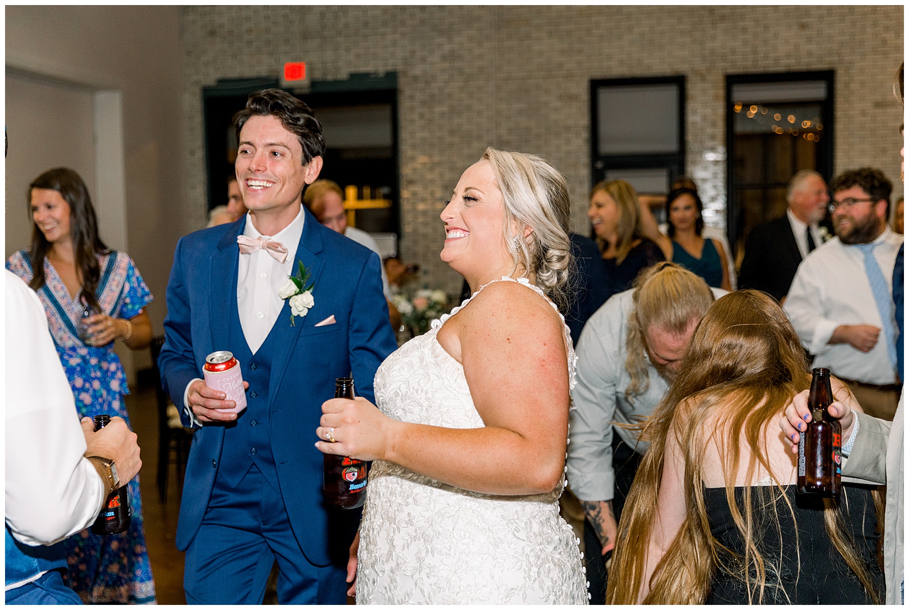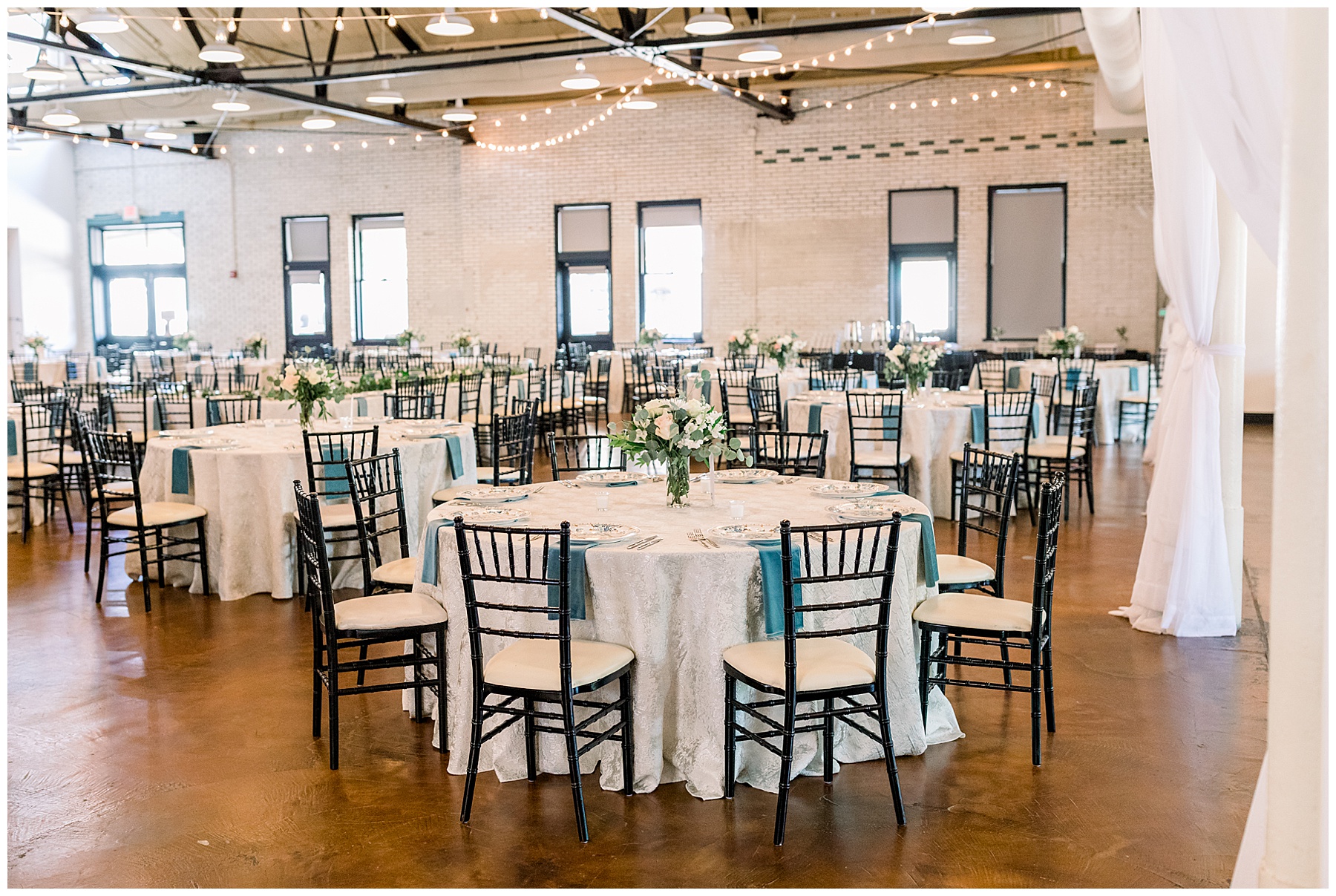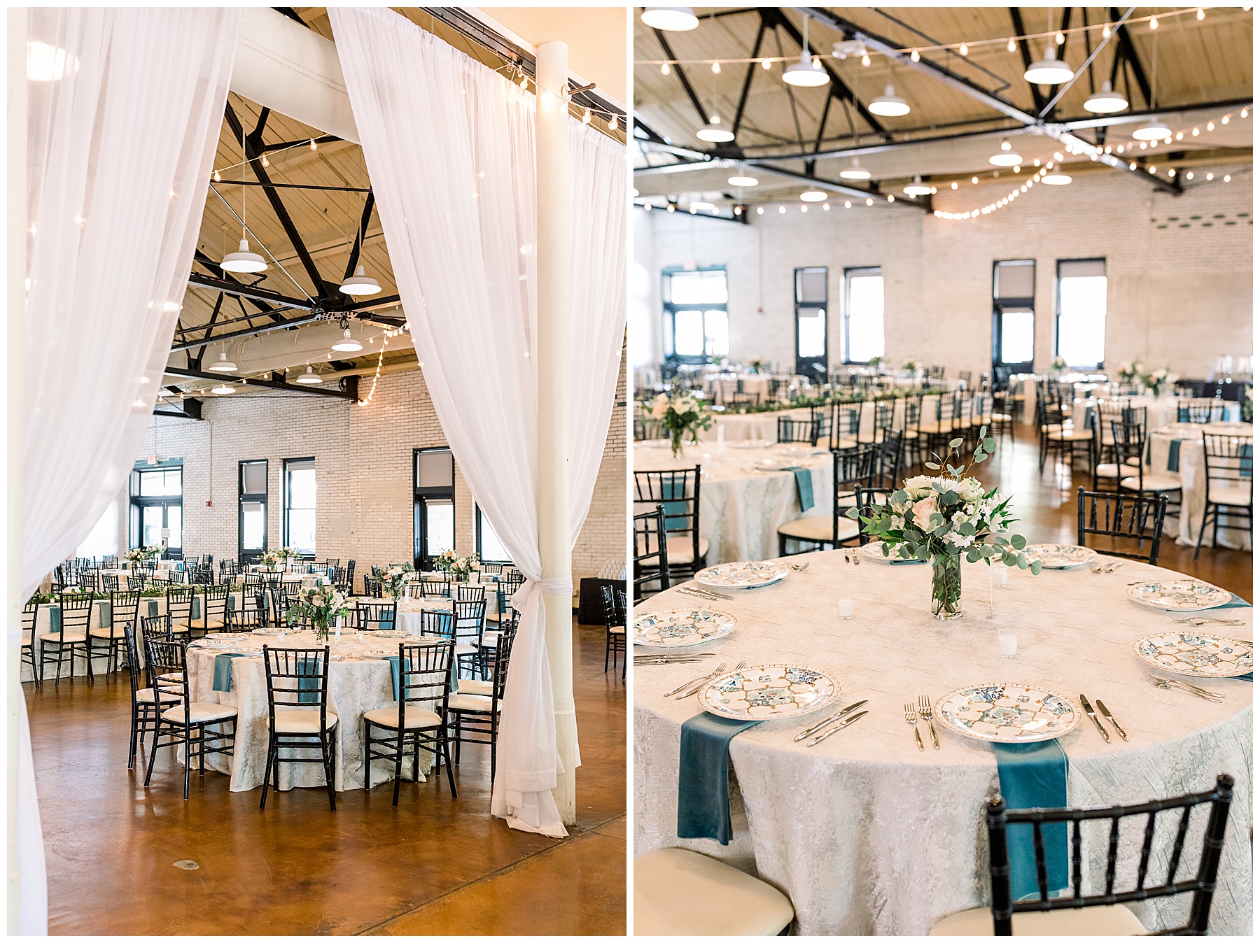 The reception kicked off at Market Hall – and it was beautiful! Anna had chosen the prettiest table linens with so much texture, patterned chargers on top of blue velvet napkins, and pops of color from the flowers and greenery were a great contrast from the tile and urban feel of the venue. We especially loved their custom lighted “The Meyers” sign above the DJ table – and now Phillip wants one for our house, haha!