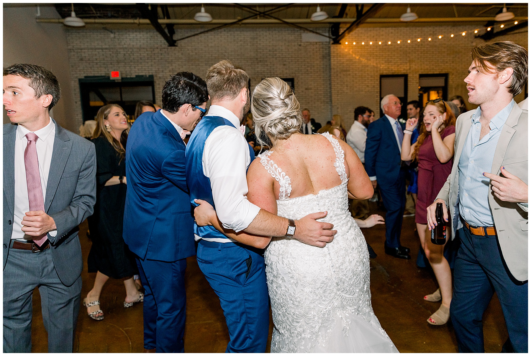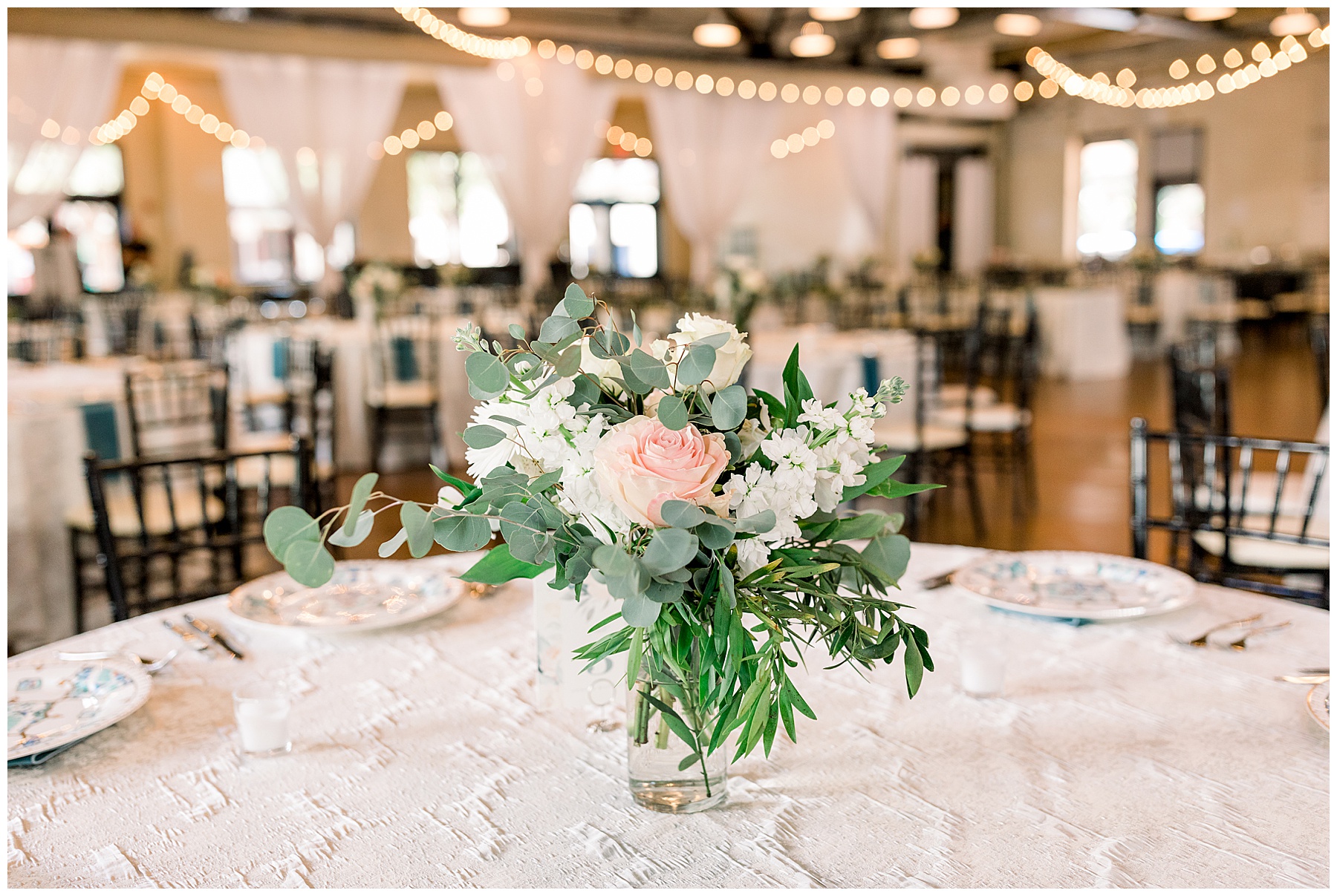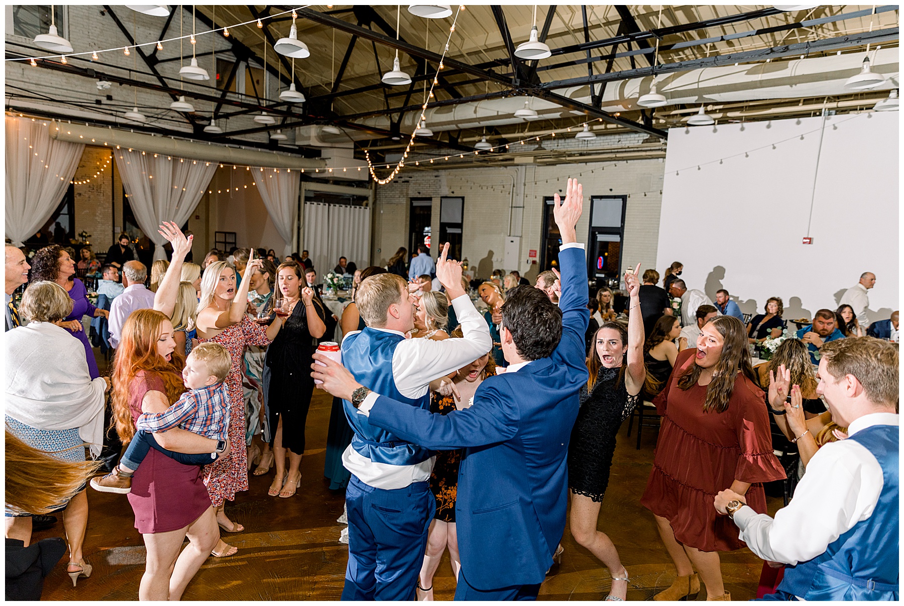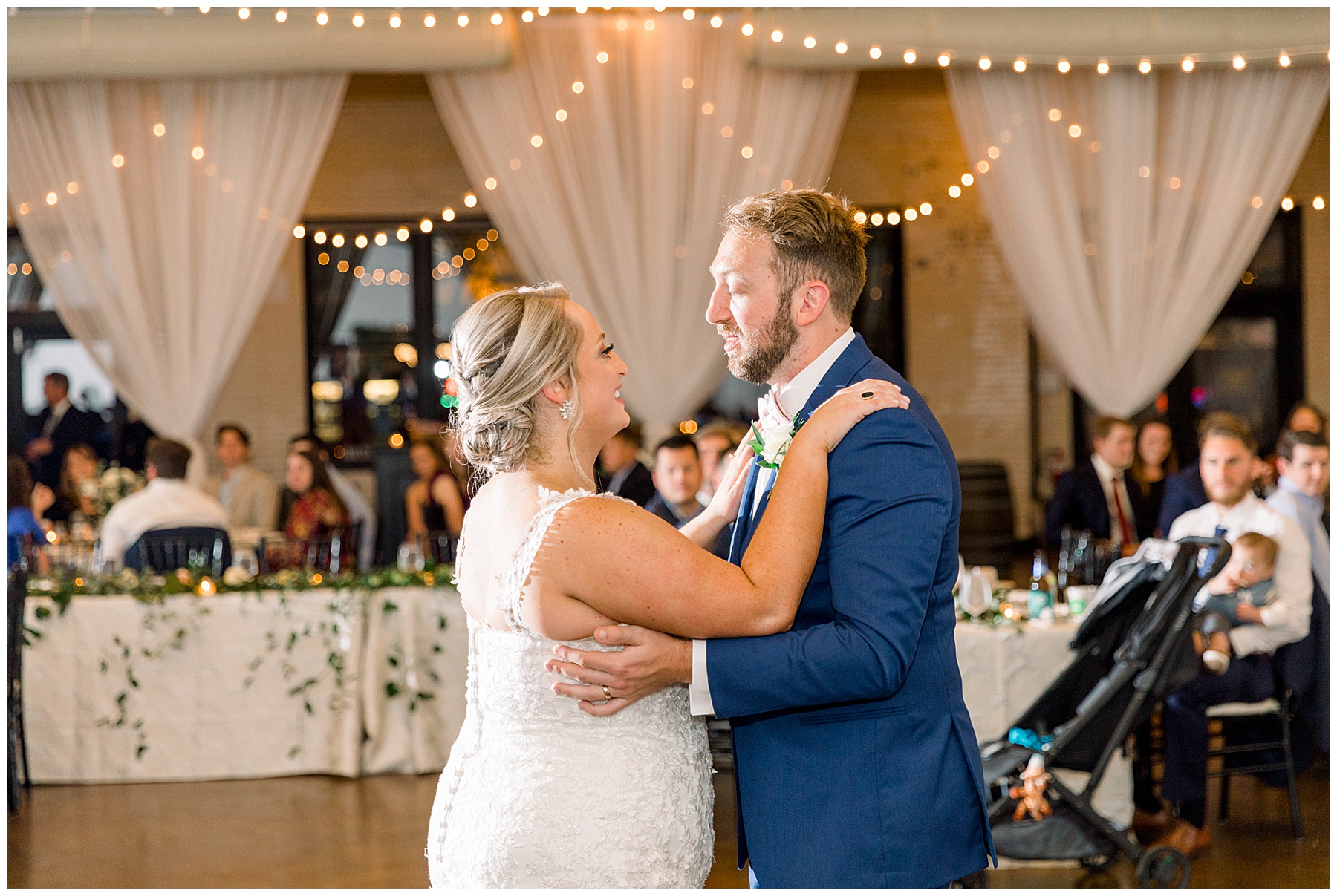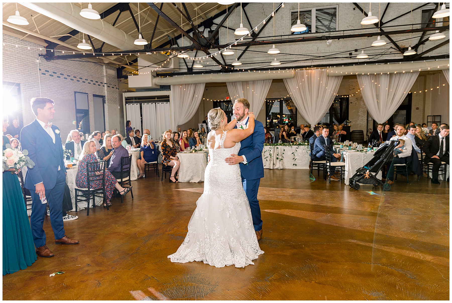 The reception kicked off at Market Hall – and it was beautiful! Anna had chosen the prettiest table linens with so much texture, patterned chargers on top of blue velvet napkins, and pops of color from the flowers and greenery were a great contrast from the tile and urban feel of the venue. We especially loved their custom lighted “The Meyers” sign above the DJ table – and now Phillip wants one for our house, haha!
