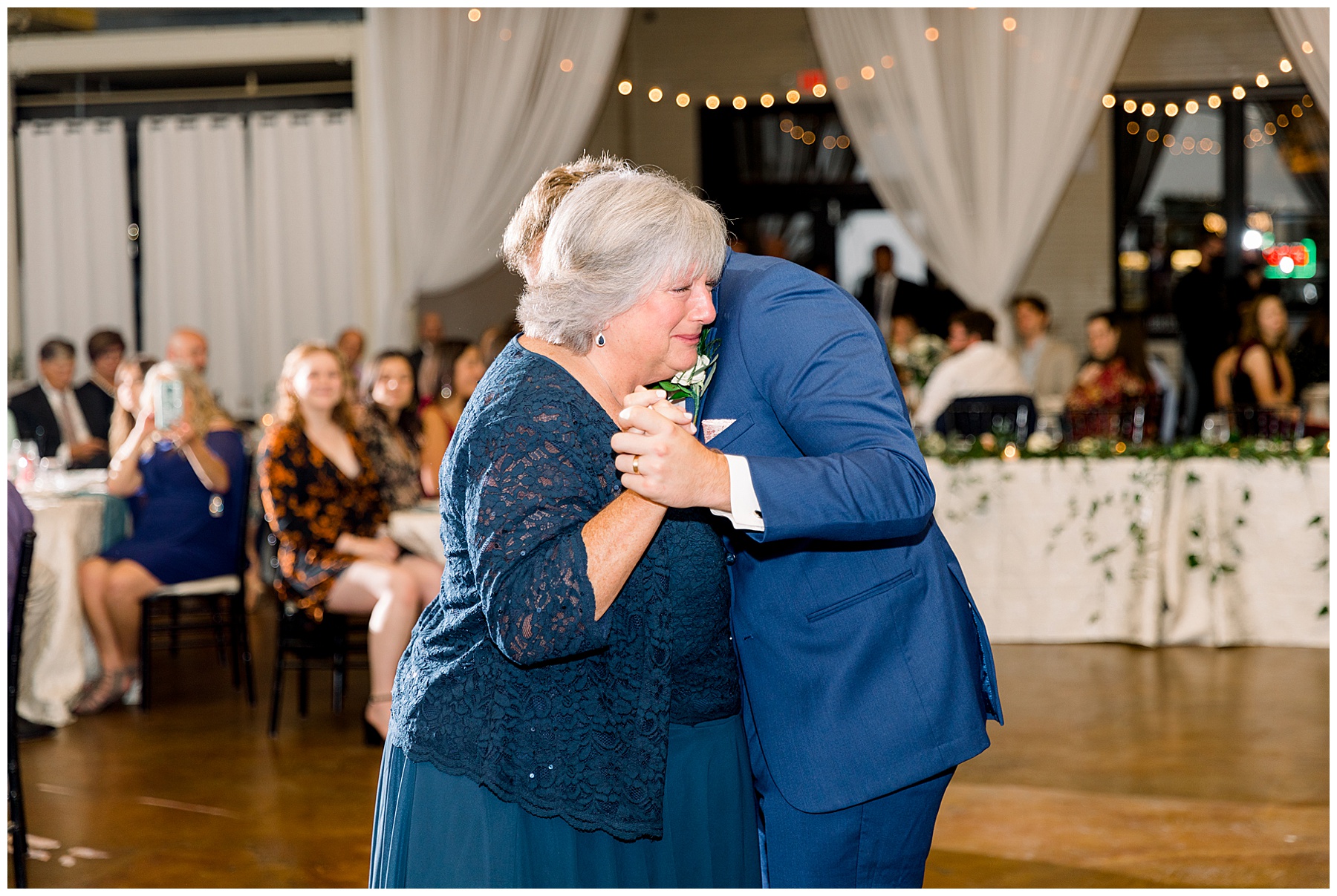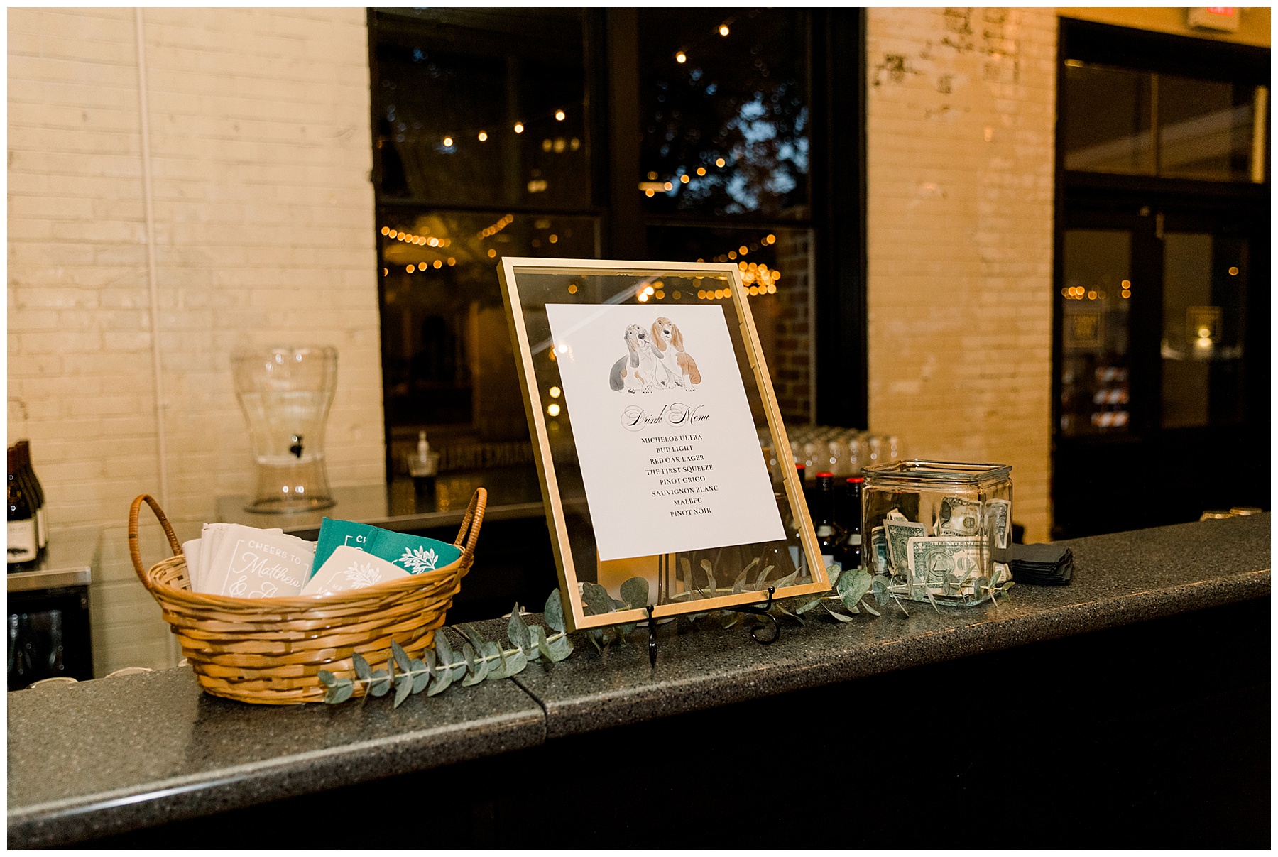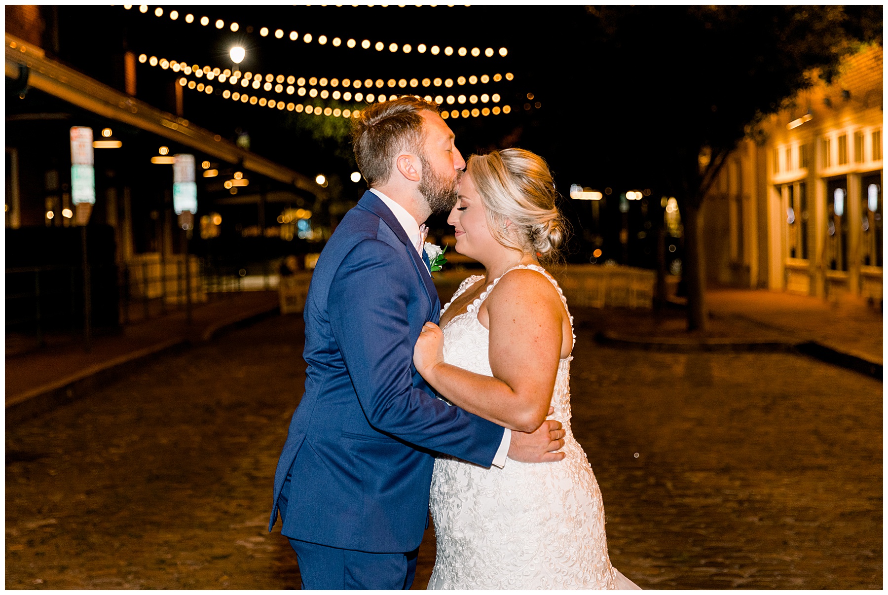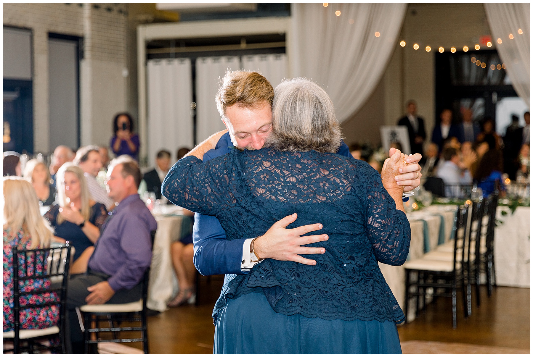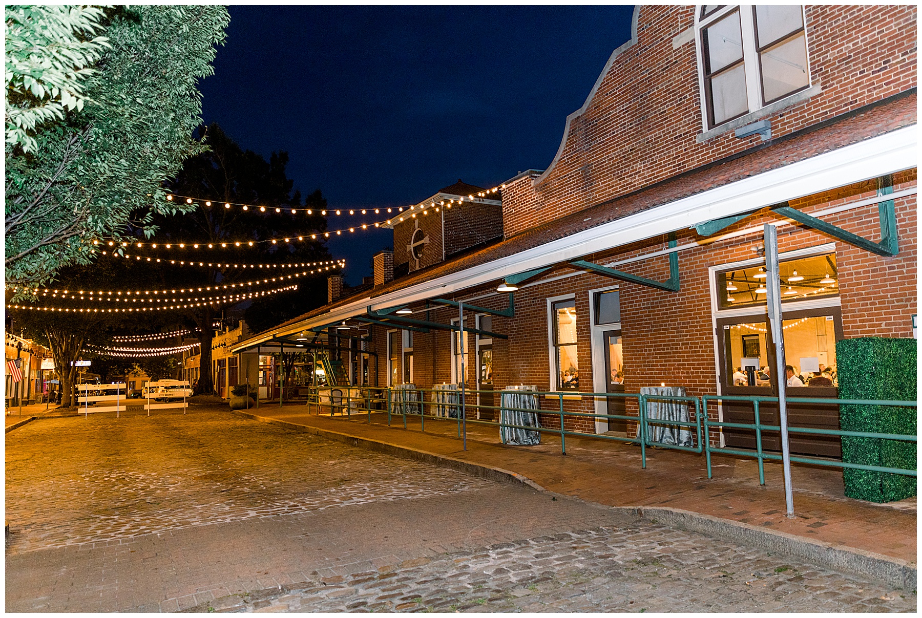 The reception kicked off at Market Hall – and it was beautiful! Anna had chosen the prettiest table linens with so much texture, patterned chargers on top of blue velvet napkins, and pops of color from the flowers and greenery were a great contrast from the tile and urban feel of the venue. We especially loved their custom lighted “The Meyers” sign above the DJ table – and now Phillip wants one for our house, haha!