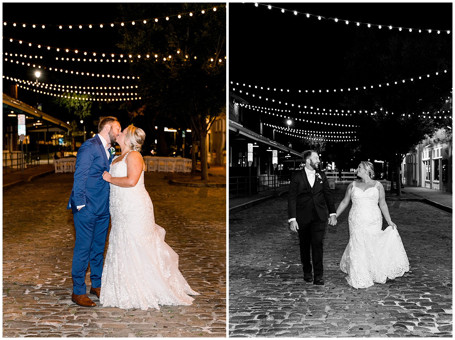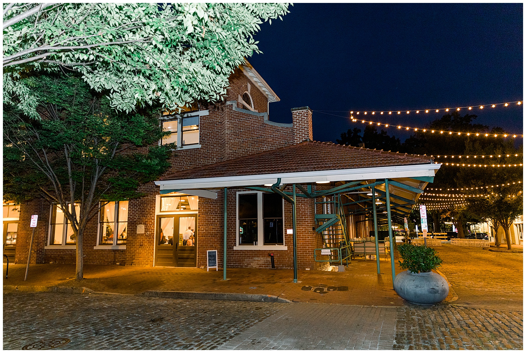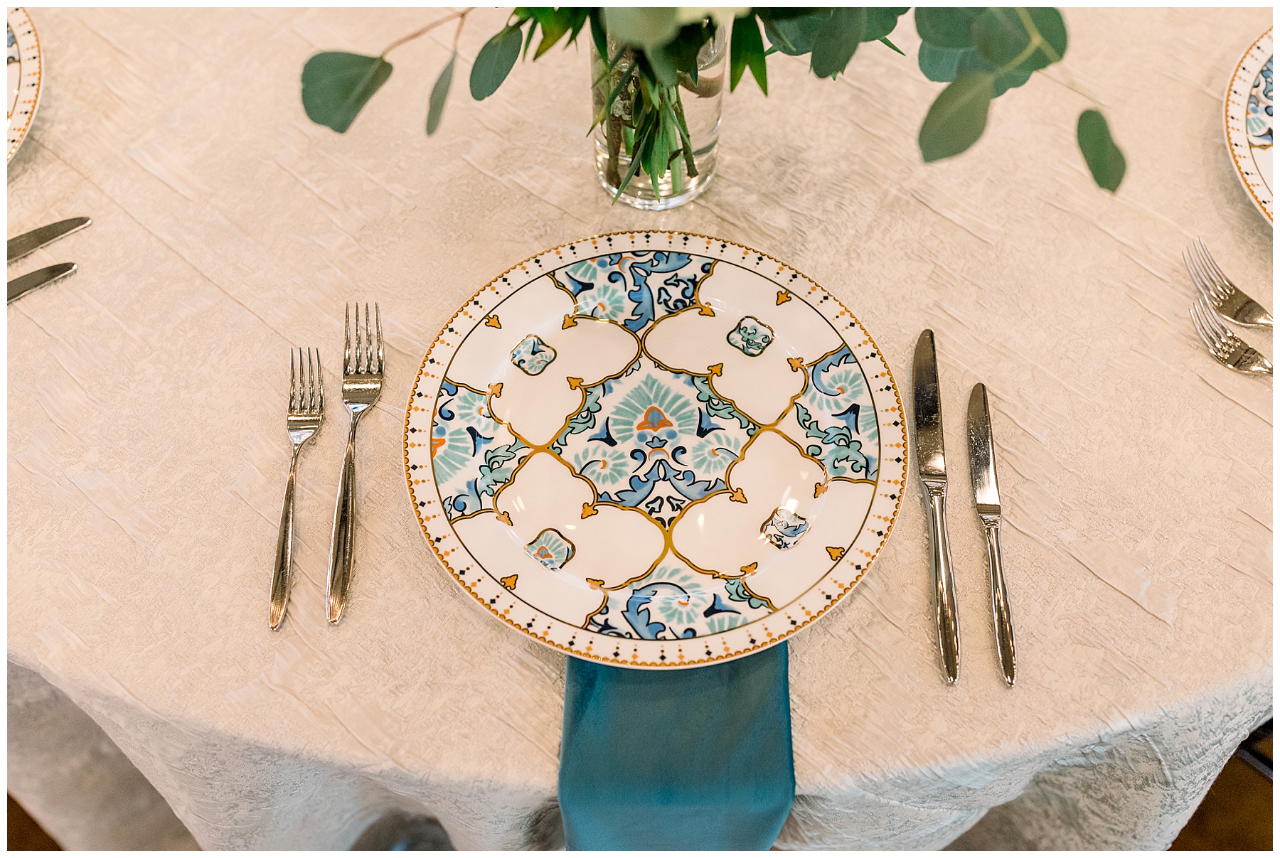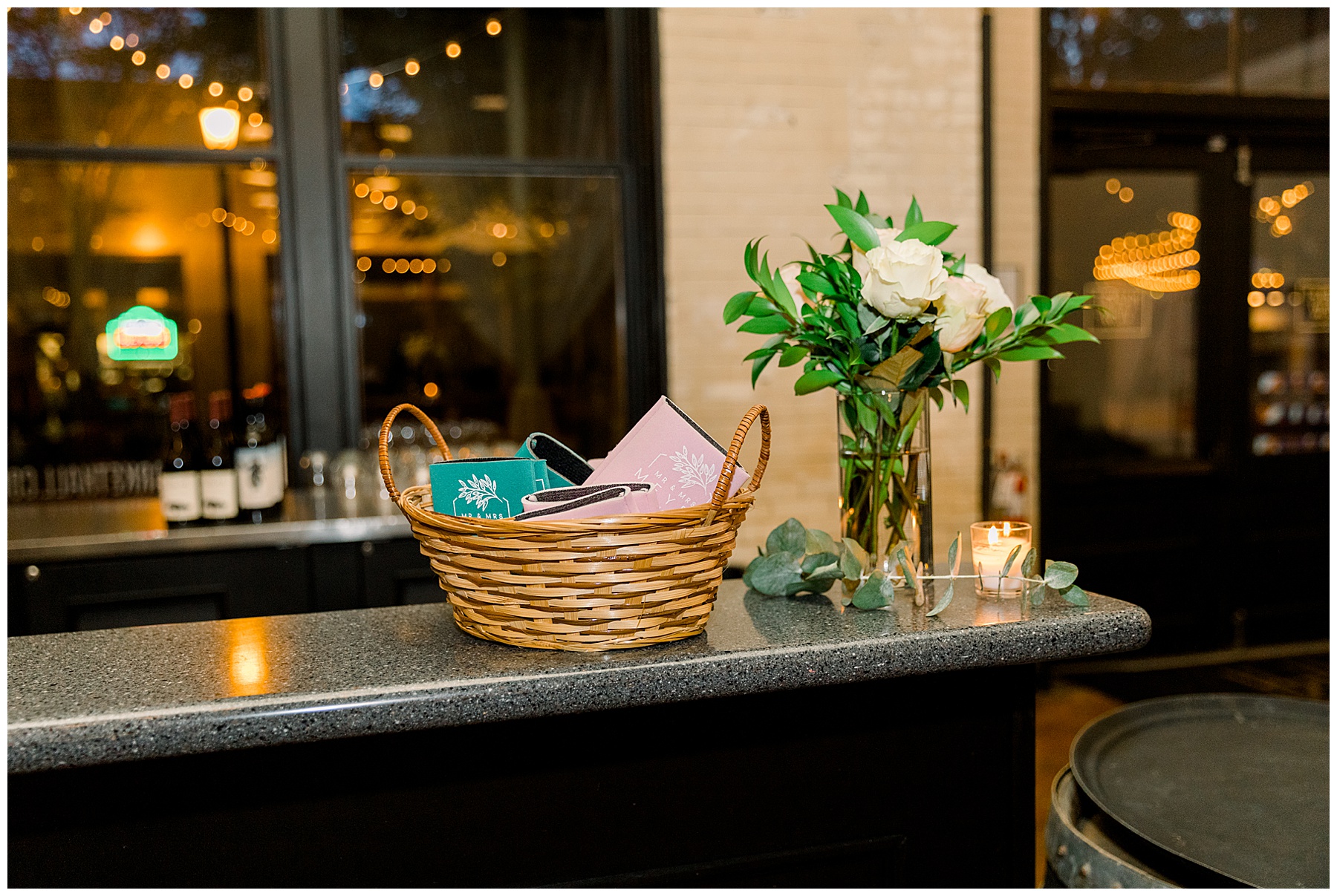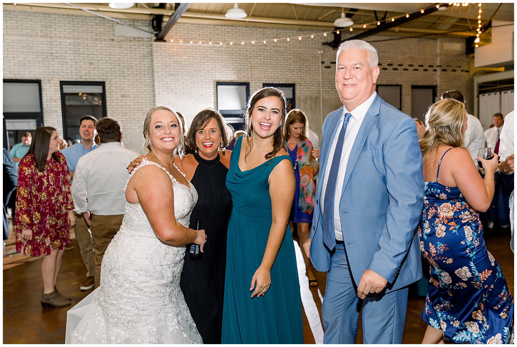 The reception kicked off at Market Hall – and it was beautiful! Anna had chosen the prettiest table linens with so much texture, patterned chargers on top of blue velvet napkins, and pops of color from the flowers and greenery were a great contrast from the tile and urban feel of the venue. We especially loved their custom lighted “The Meyers” sign above the DJ table – and now Phillip wants one for our house, haha!