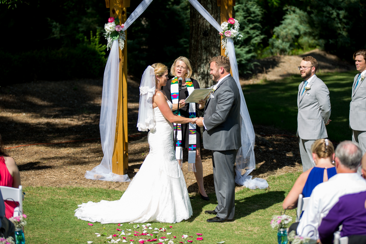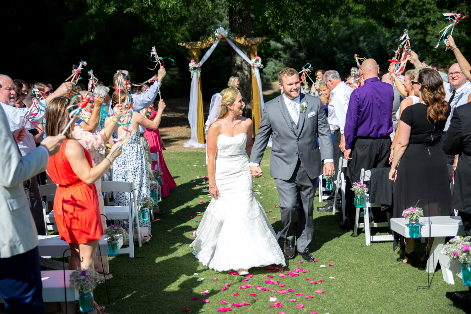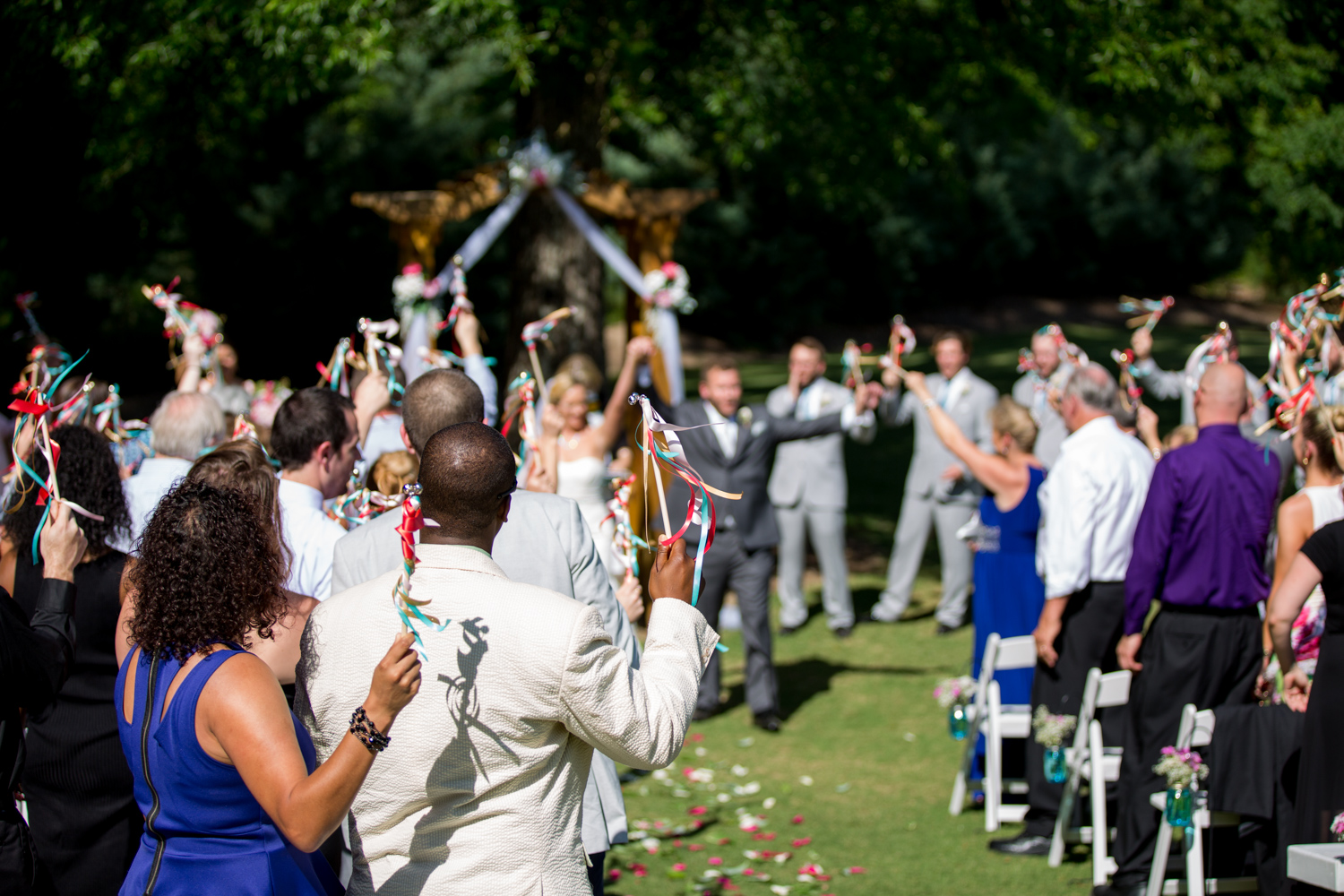 The ceremony was so centered on family. Jason stood at the front and helped make a family painting. Such a cool idea – and I’m SUPER impressed they didn’t get paint on their clothing too! After their vows, Ashley & David left through a tunnel of ribbon wands and bells.