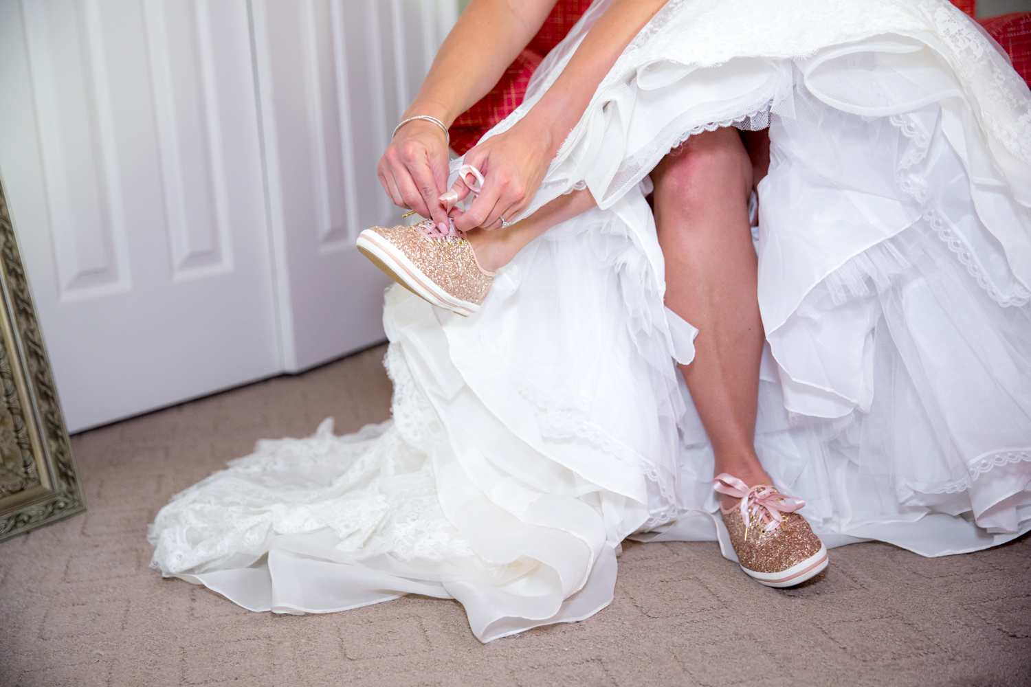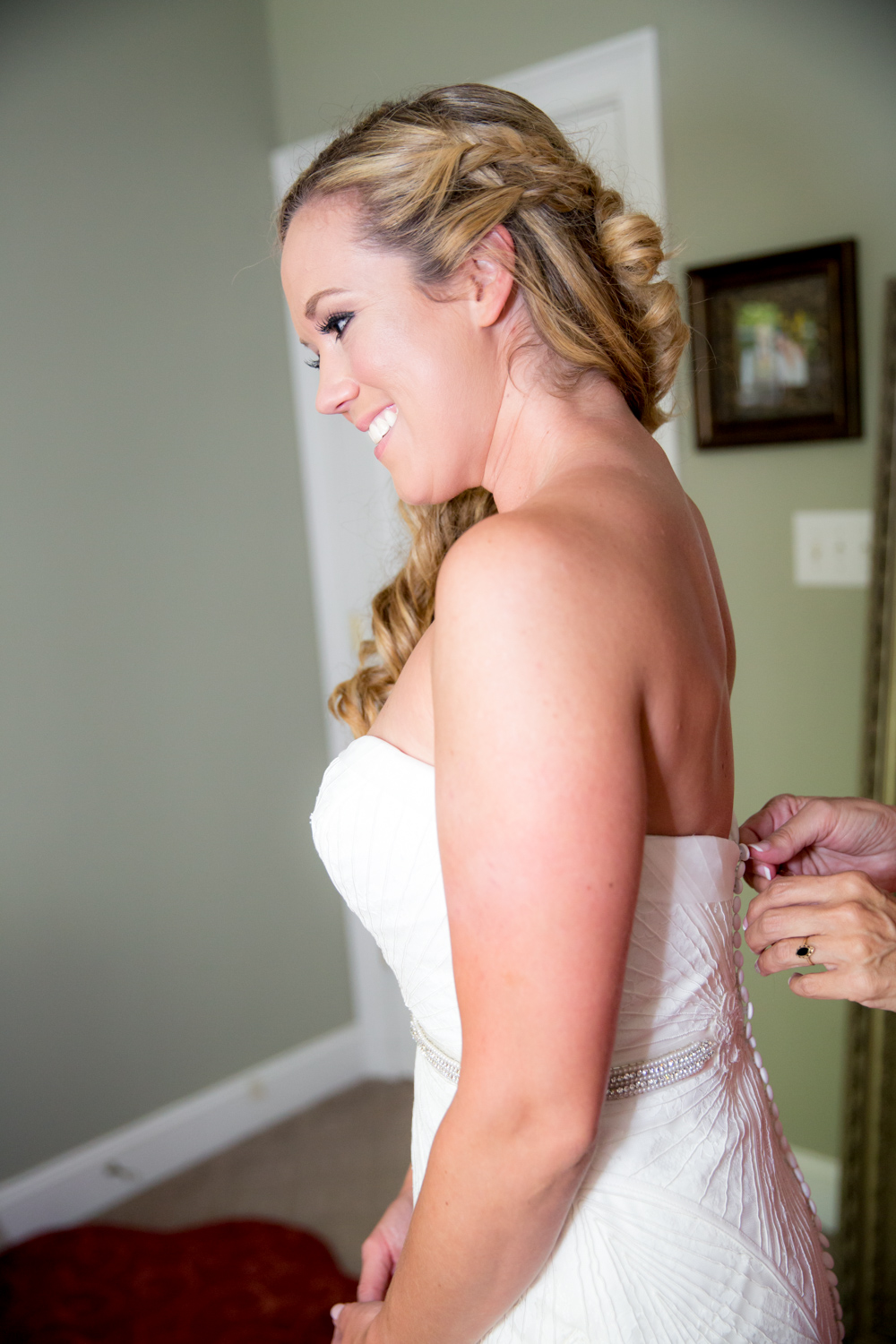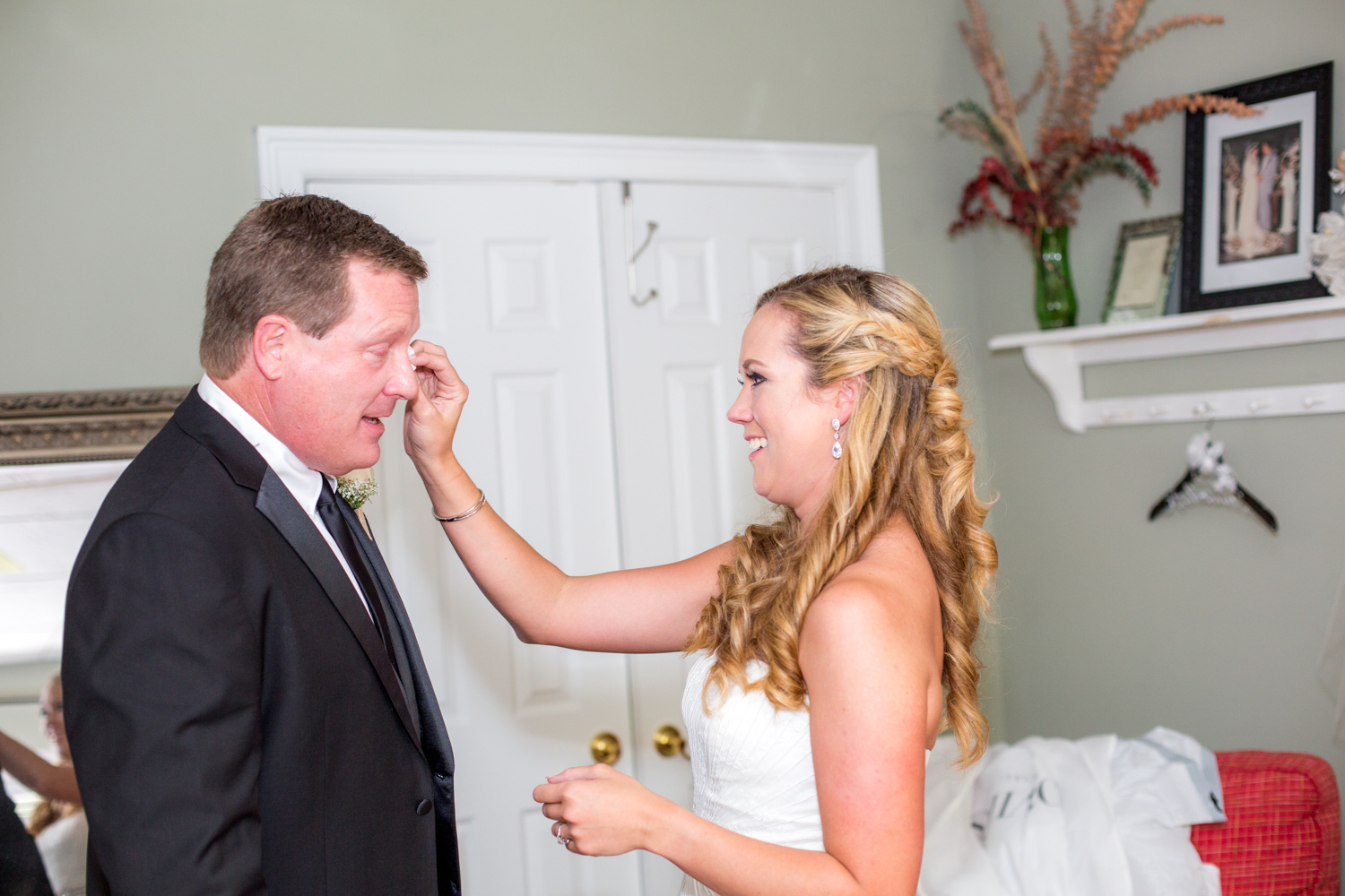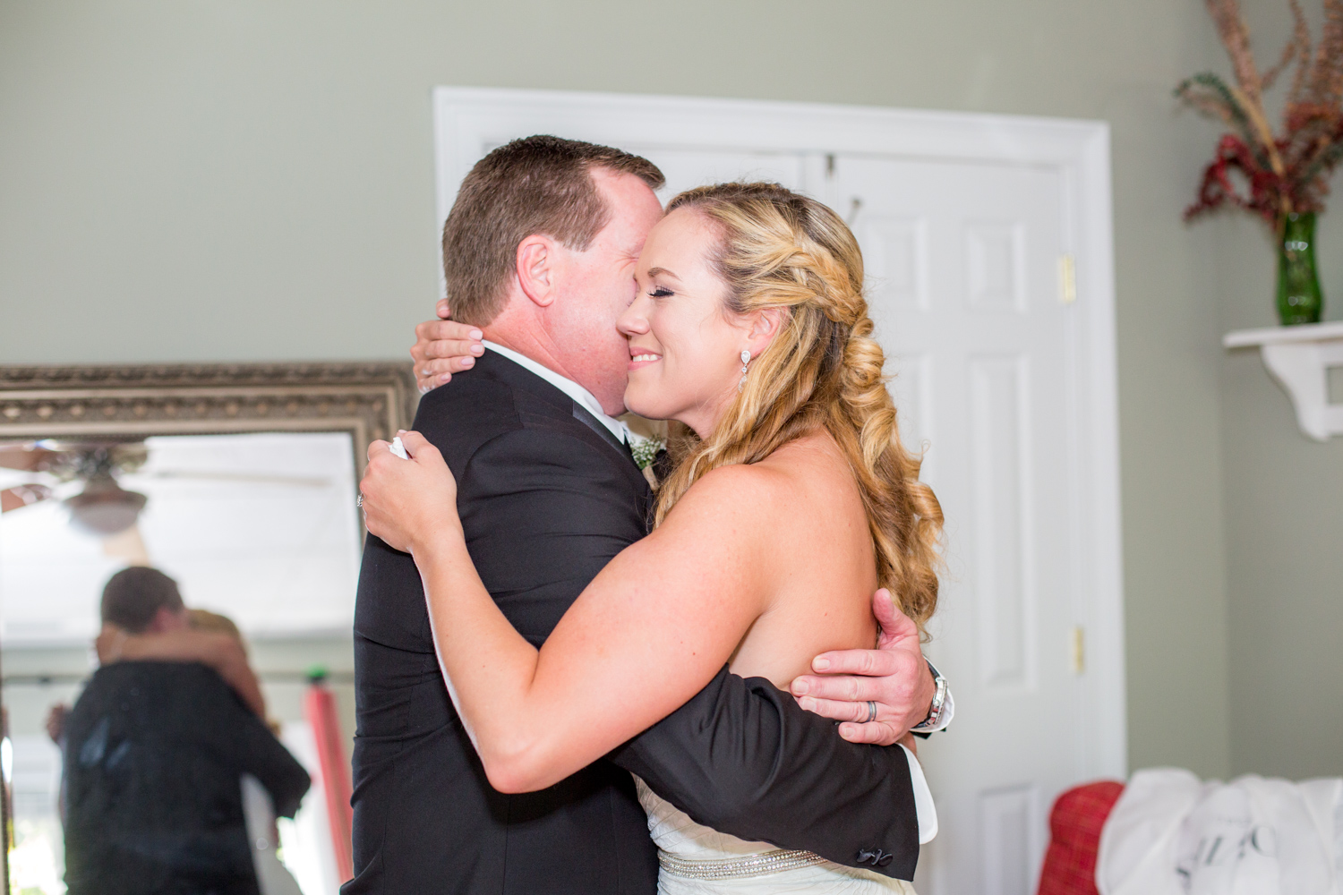 Ashley’s mom helped her put the wedding dress on, and it was such a sentimental moment since part of her own dress was sewn on the back of Ashley’s, and the veil was also part of hers. Ashley looked absolutely stunning. Her dad walked into the room to see her, and they both got teary-eyed up, and laughed at each other for doing so.