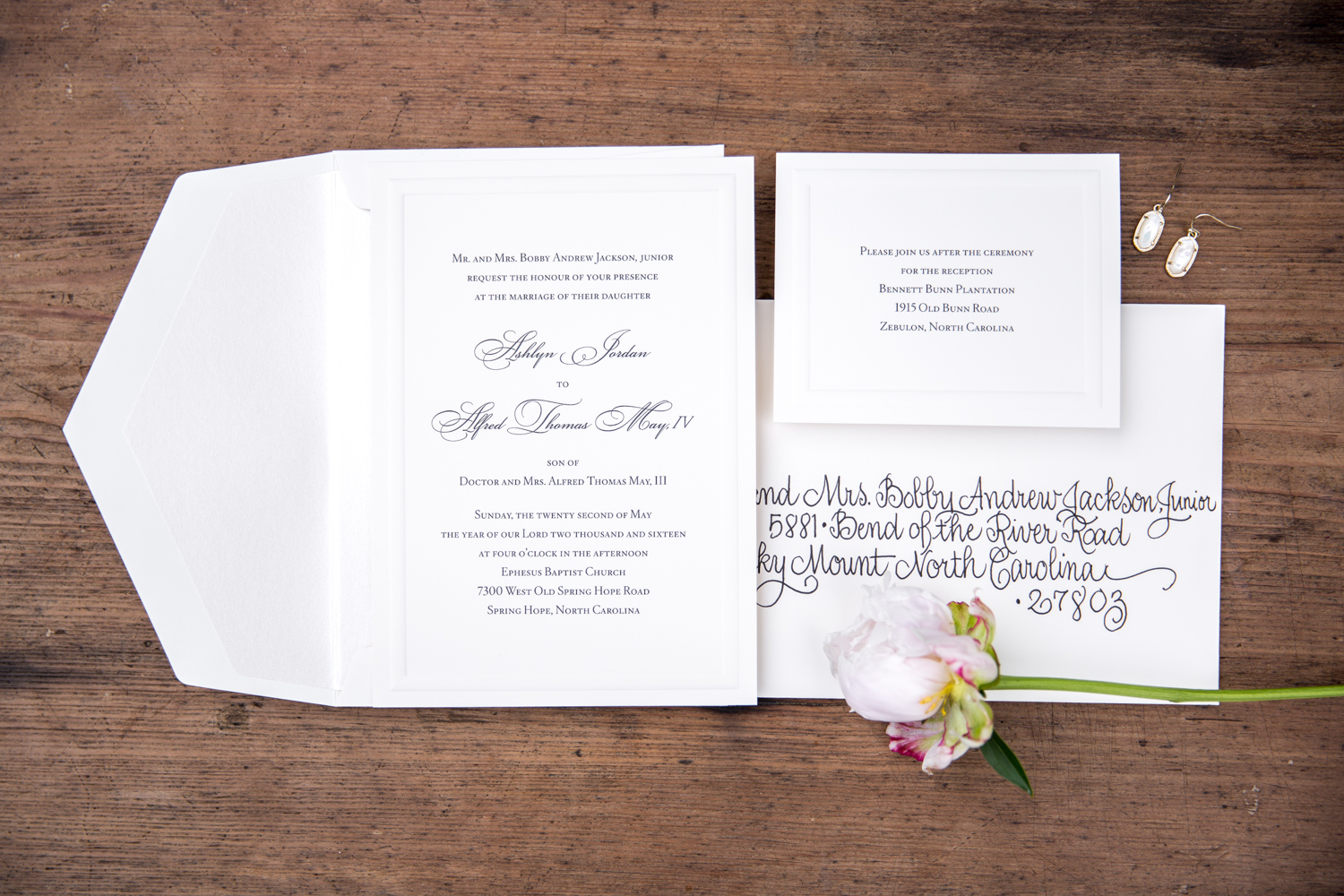 Florist: Brides & Bouquets (Gregg Kennedy)  |  Makeup Artist: Allison Dean  |  Hairstylist: Hilary McKinney  |  Directors: Heather Jackson and Lori JacksonDJ: Anything Music DJs   |  Wedding Venue: Ephesus Baptist Church  |  Reception Venue: Bennett Bunn Plantation  |  Caterer: Top of the Pines (Peggy Hinton)  |  Cake Designer: Simply Cakes (Sabrina)  |  Invitations / RSVP / Program Designer: Wedding Paper Divas