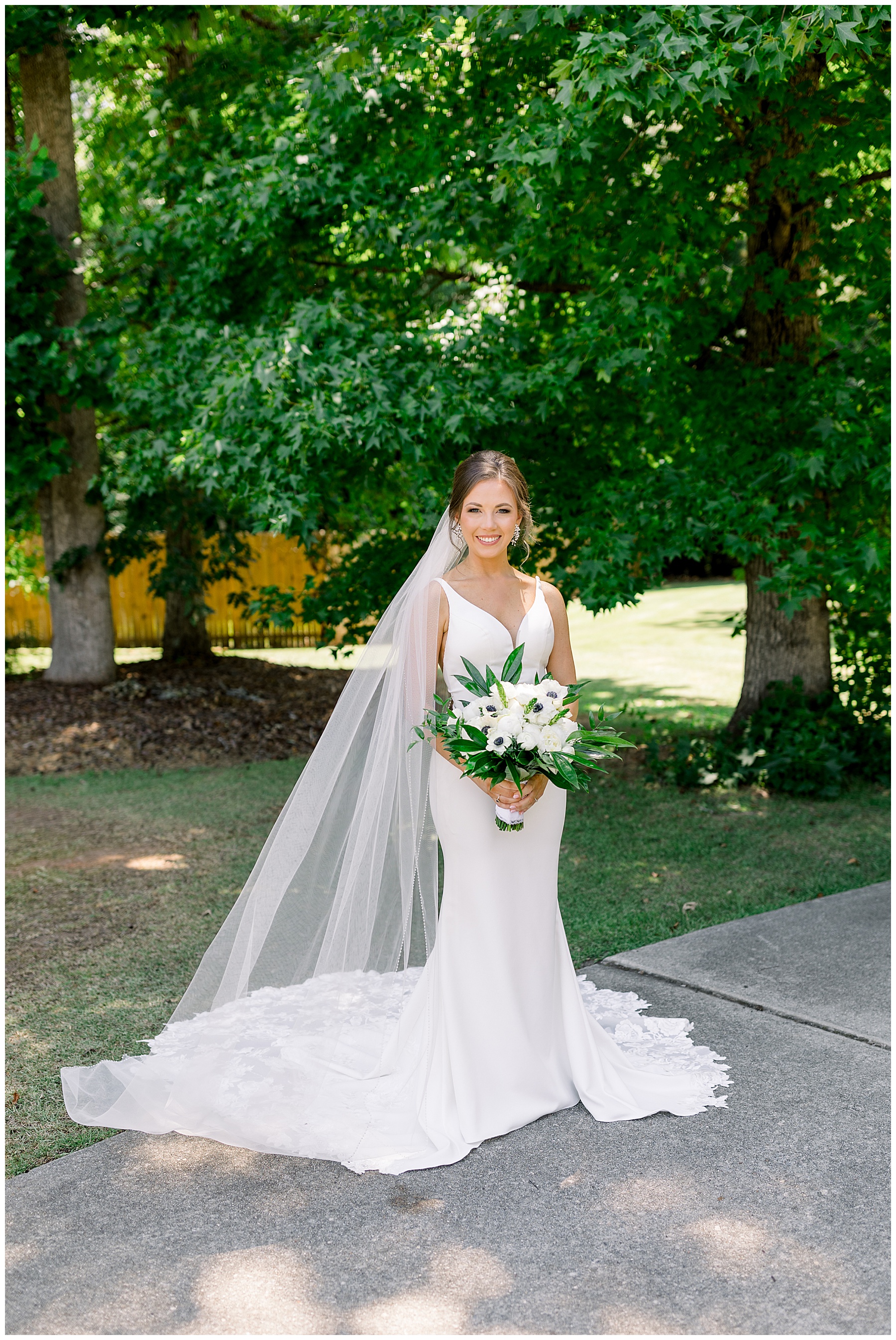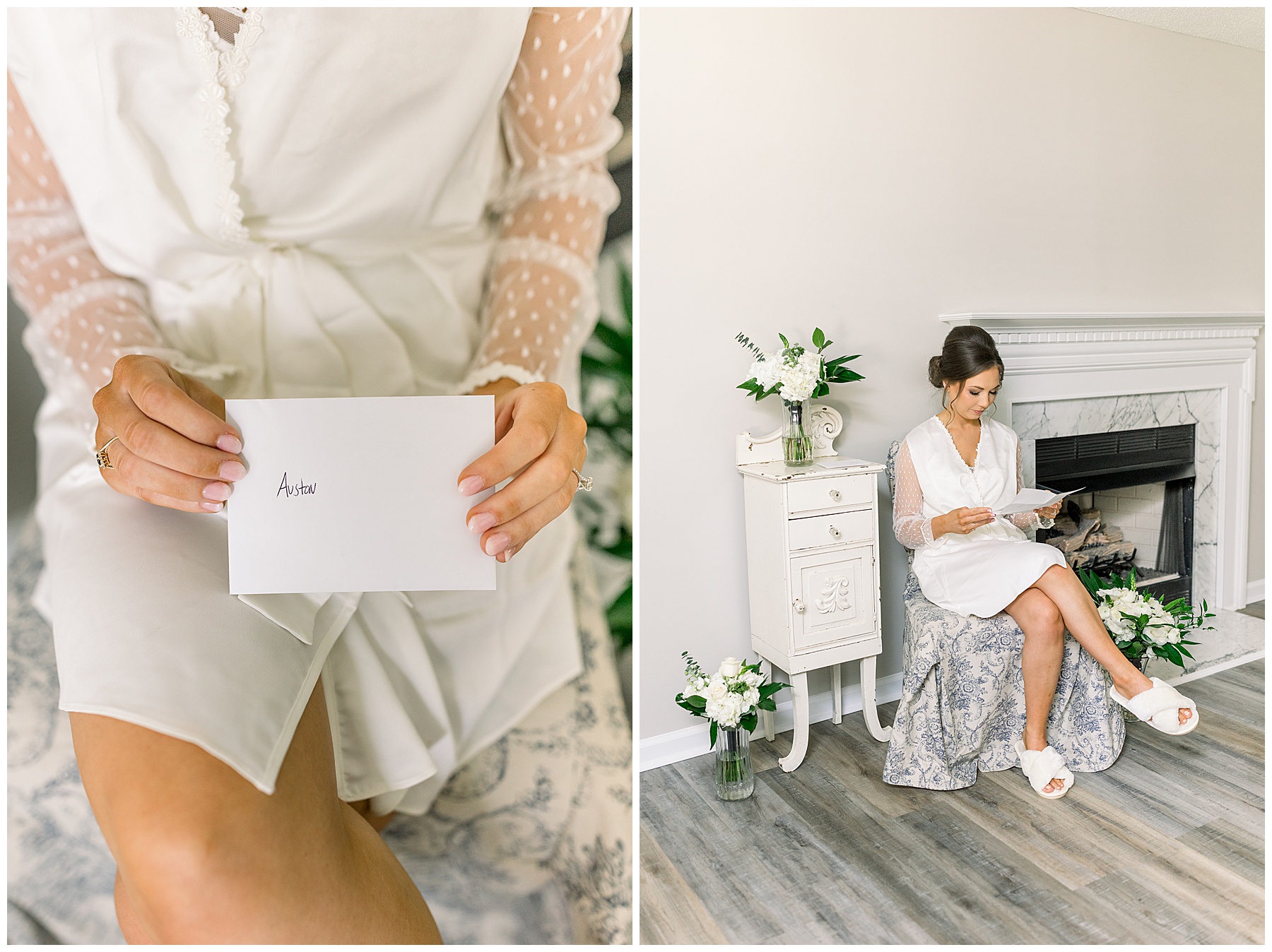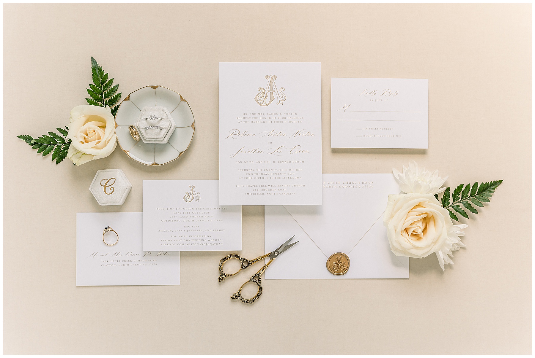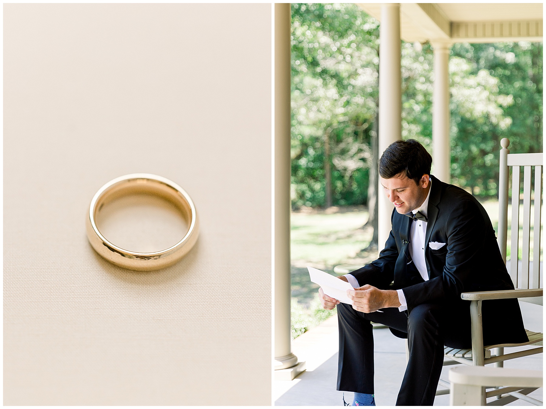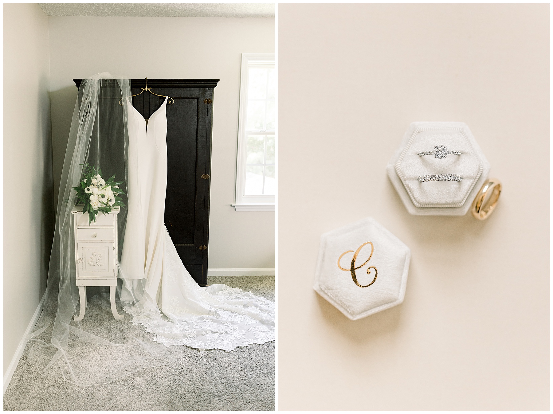 We started our day photographing all of Auston’s beautiful details at her Aunt Angie’s house. Her Aunt was an absolute SAINT for allowing us to basically re-arrange every room in her house for photos. (Thank you soooo much, Ms. Angie – you’re amazing!) One of the most special parts of the details was photographing Auston’s wedding dress on a piece of furniture given to her grandparents for THEIR wedding day! How special is that?! I also loved the classic monogram on their invitation suite created by Andi Workman. SO pretty!!