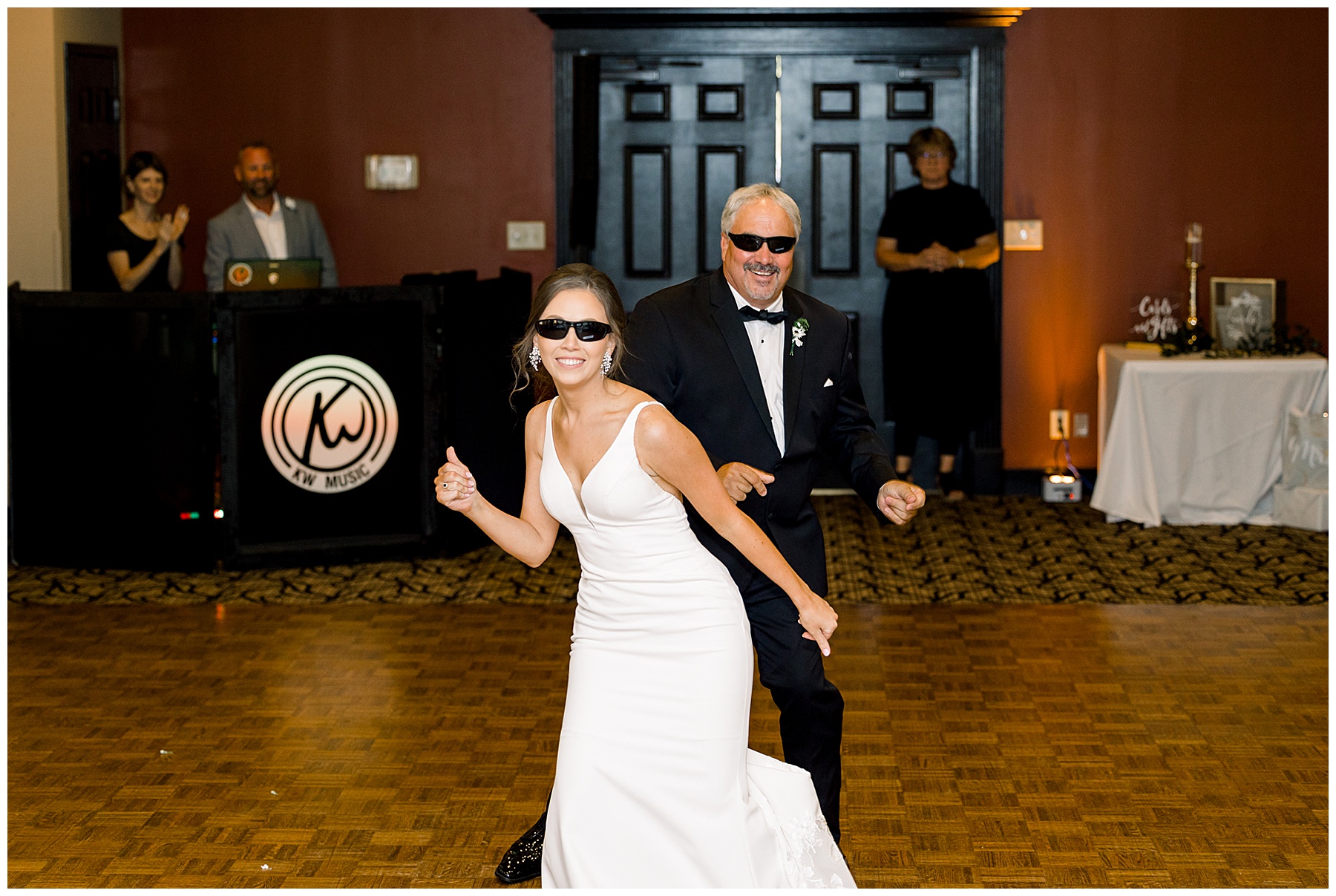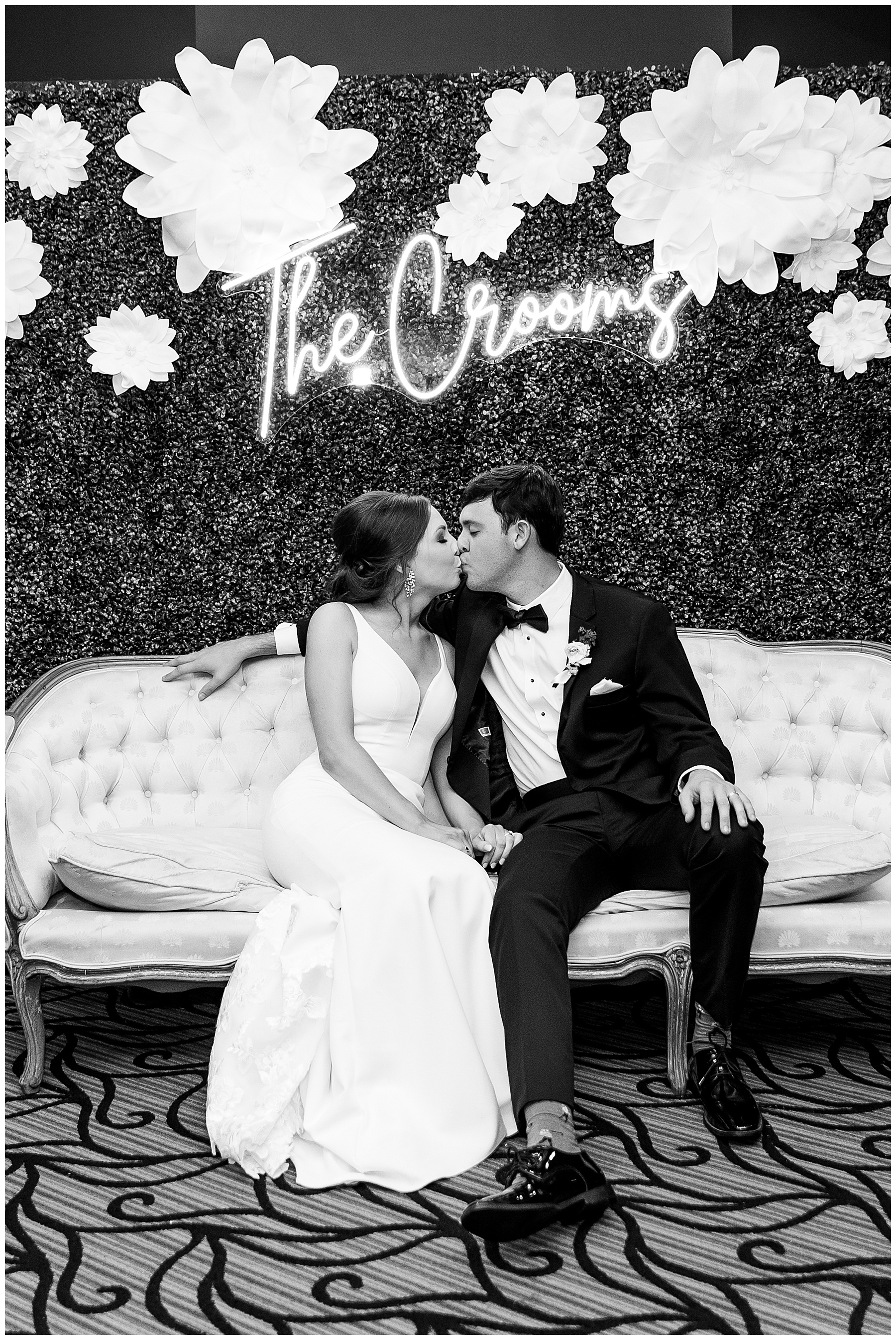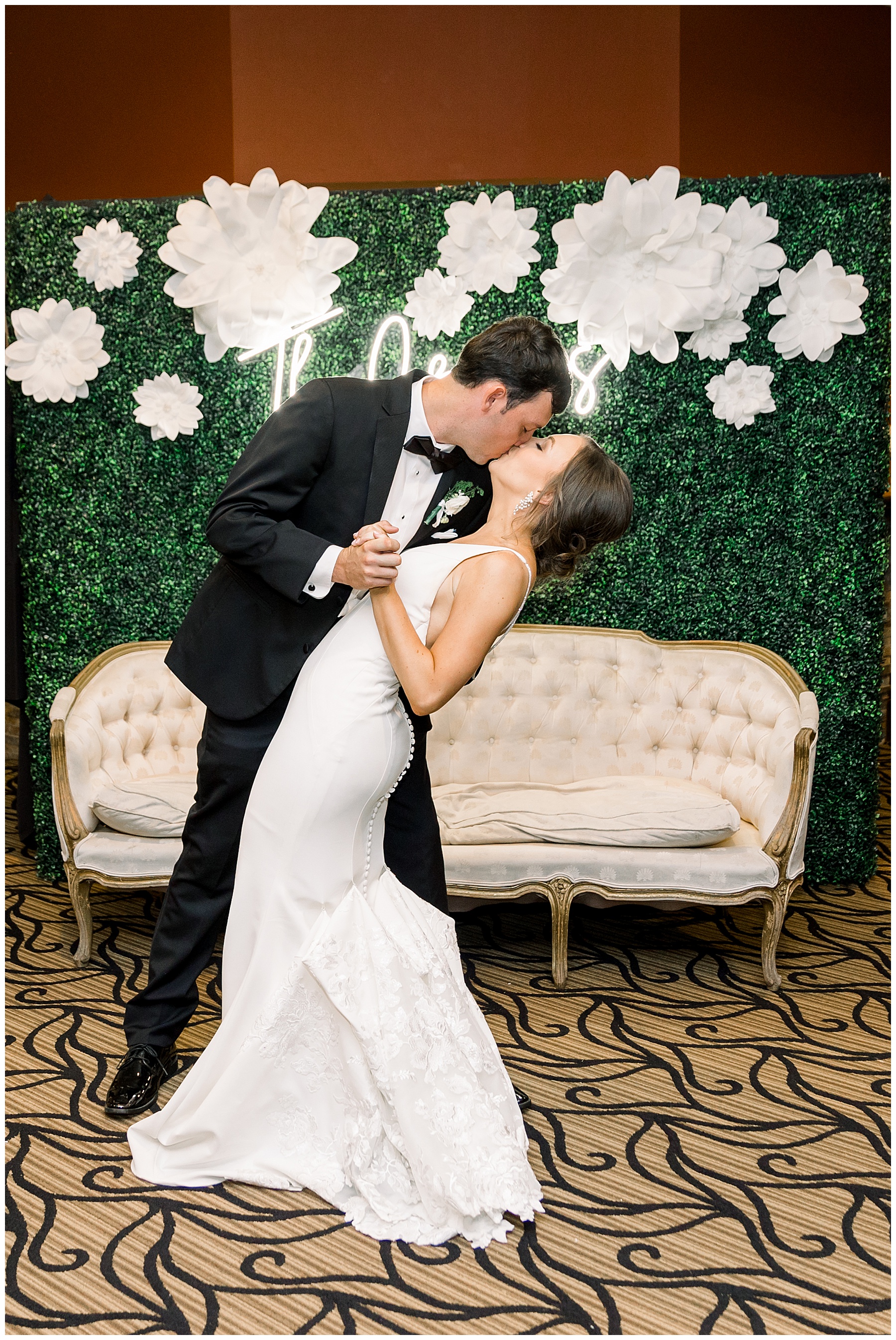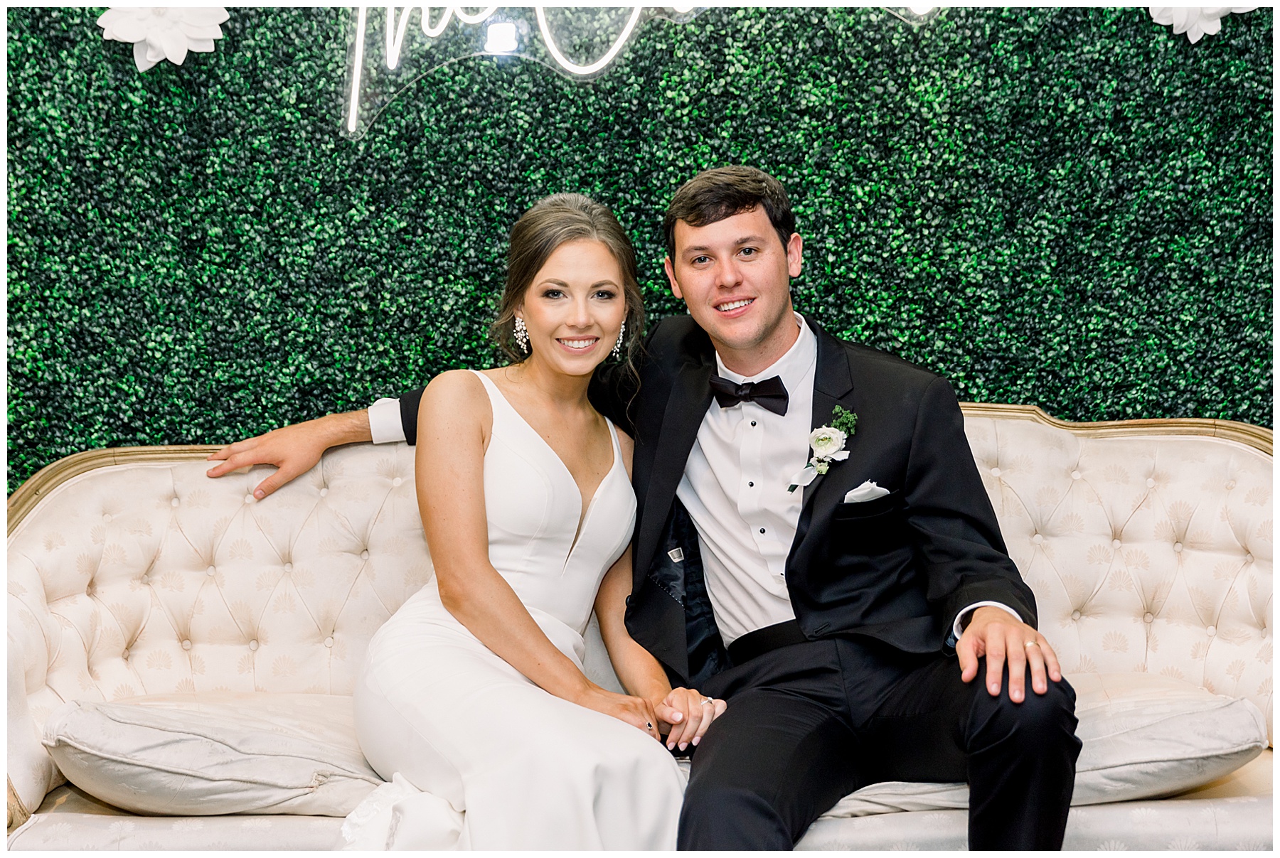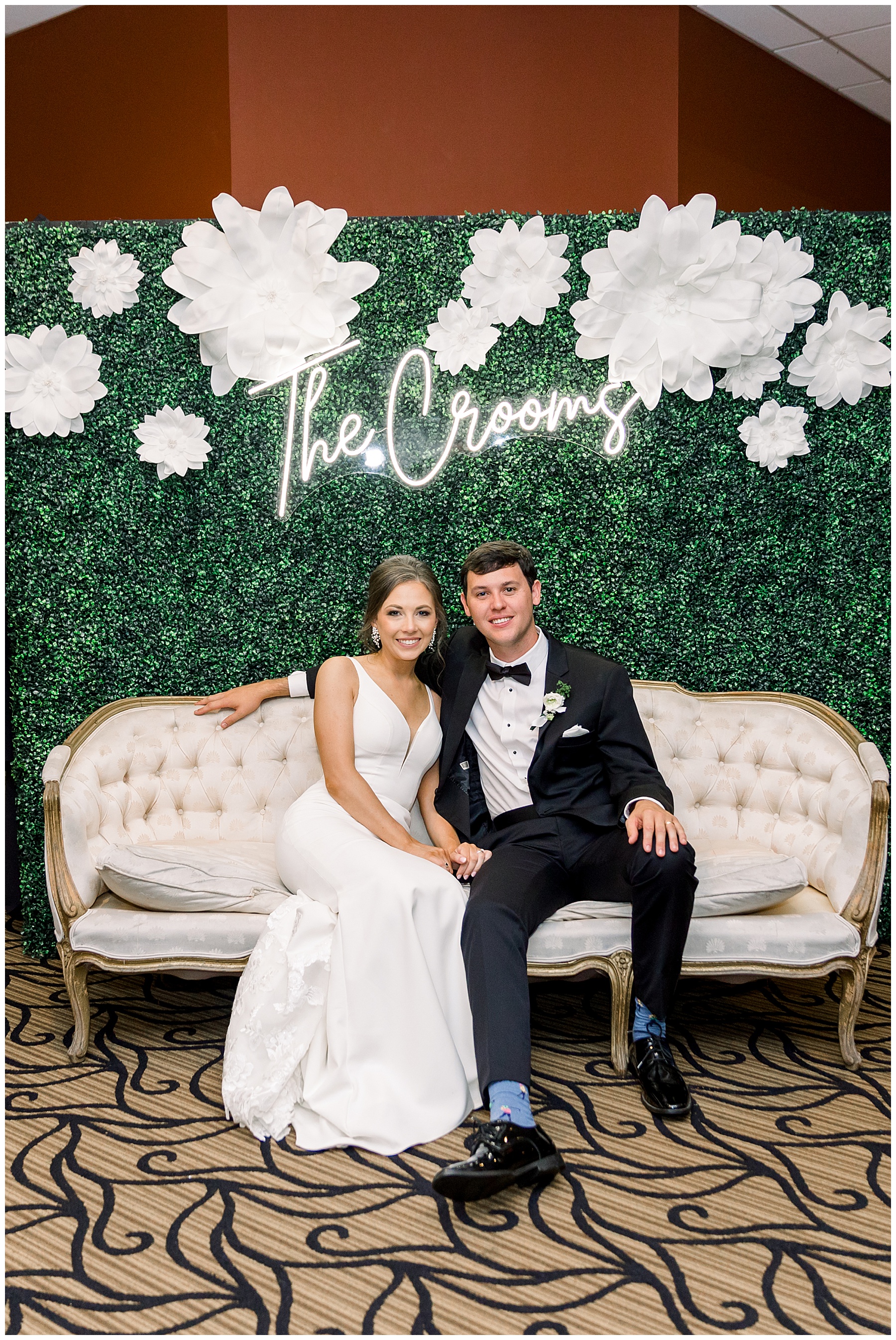 The reception kicked off with a bang – including Auston & her dad surprising everyone with a twist to their Father/Daughter dance including wearing sunglasses! It was too cute!! Lane Tree looked beautiful with all the florals by Wendy – and I especially loved the extra tables full of framed Engagement & Bridal Session photos. That’s a wonderful way to show off more of your photos and it gives your guests something to view as they walk around during cocktail hour! The big wow factor was not only the gorgeous head table, a massive tired cake with textured layers (and a little replica of Goose on the cake), and ALSO a Photo Booth area complete with a vintage couch, a boxwood wall, and a neon sign featuring “The Crooms”! So fun!!!