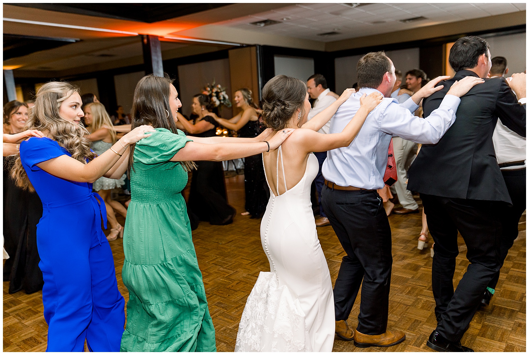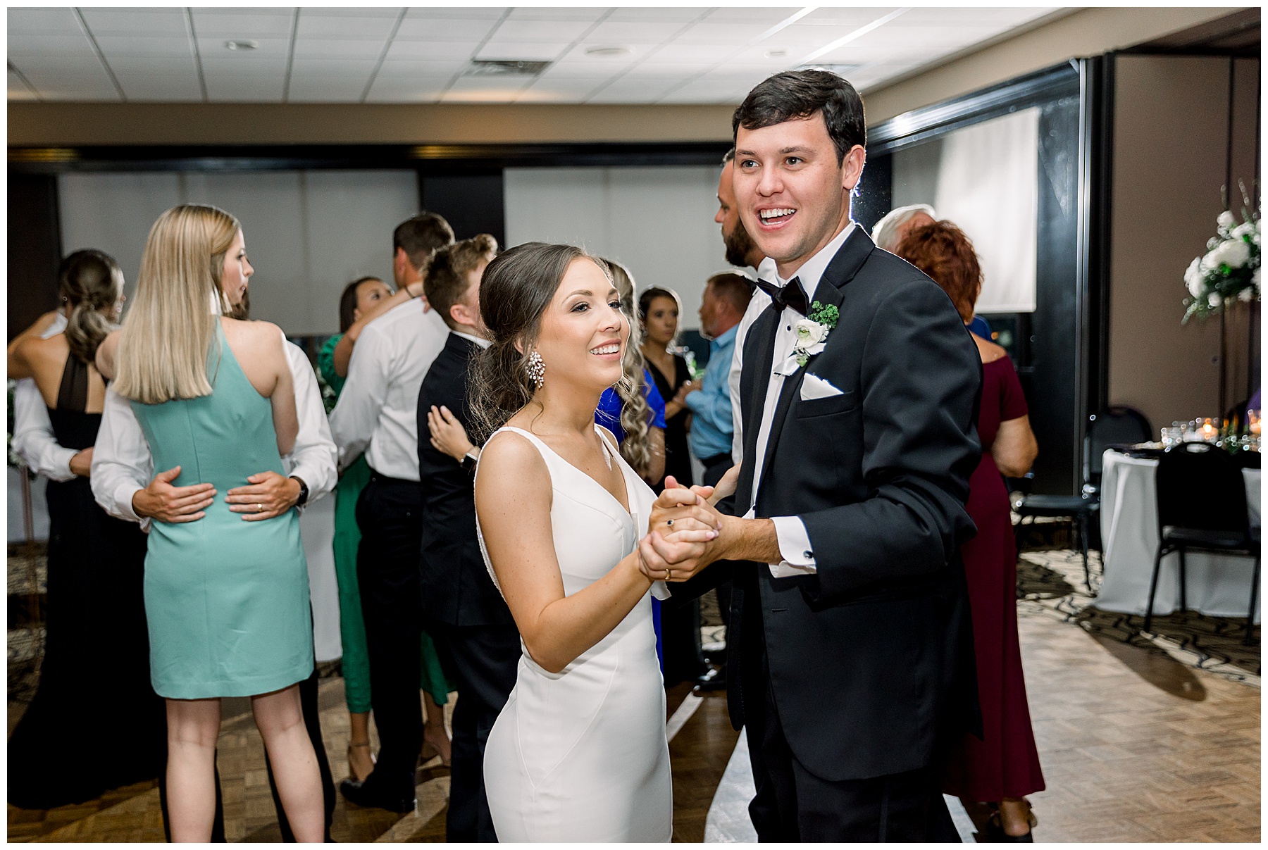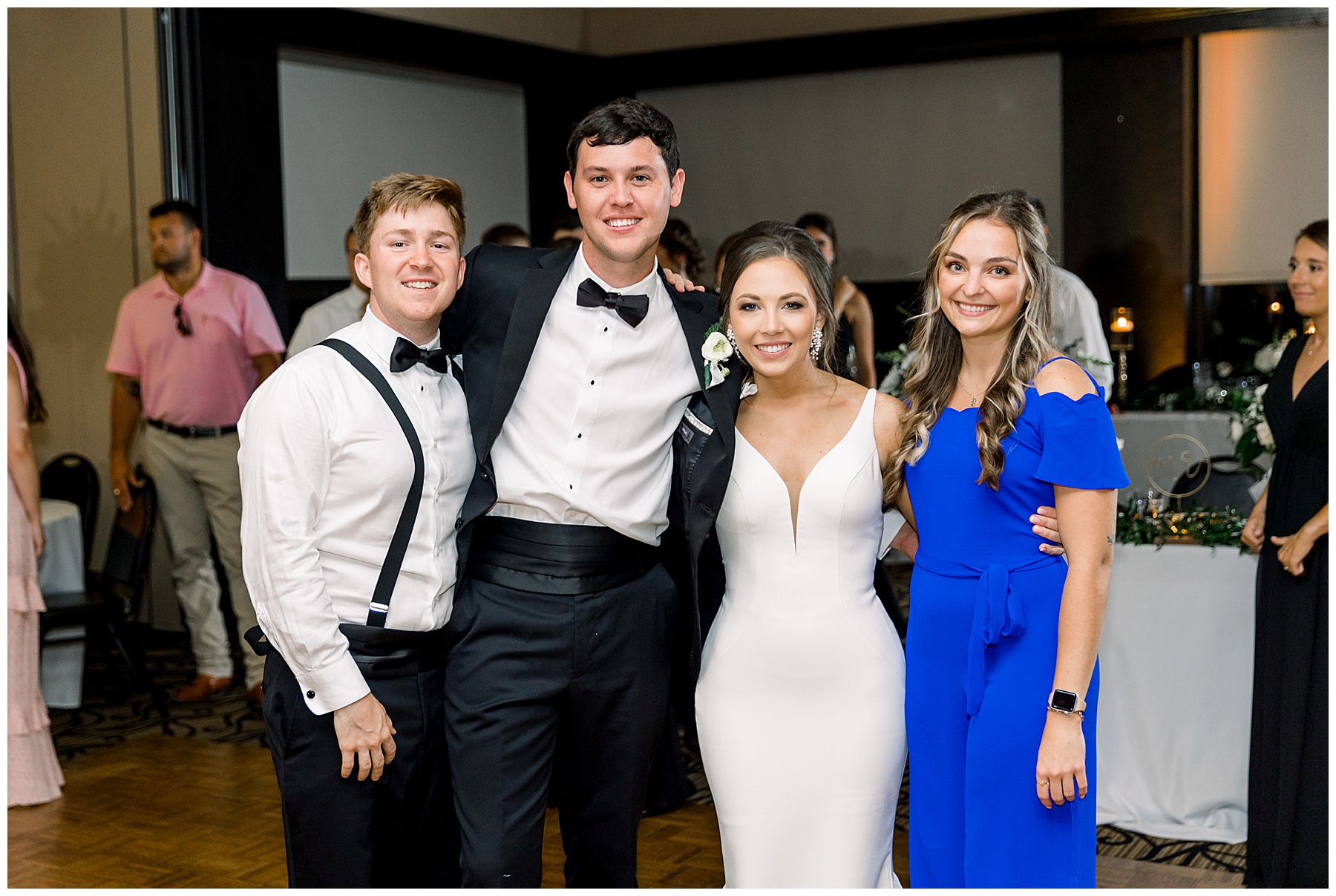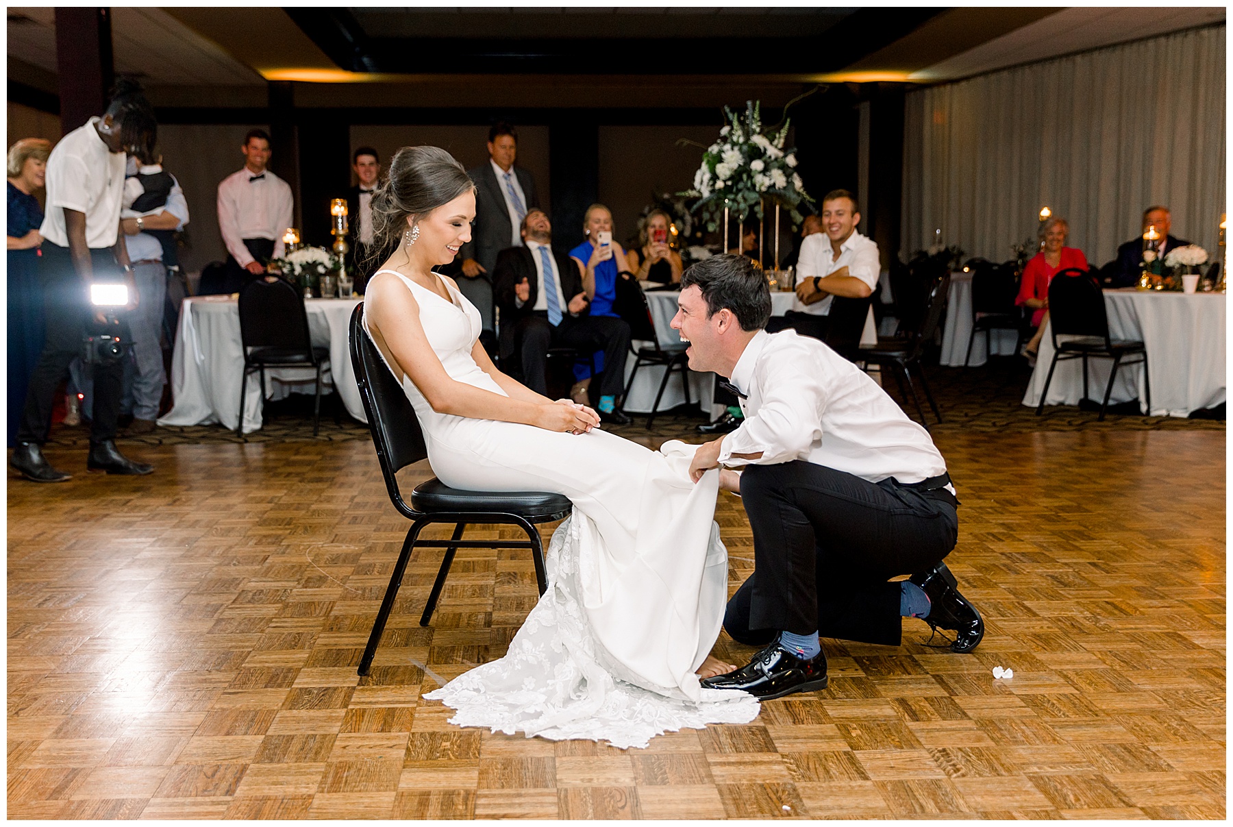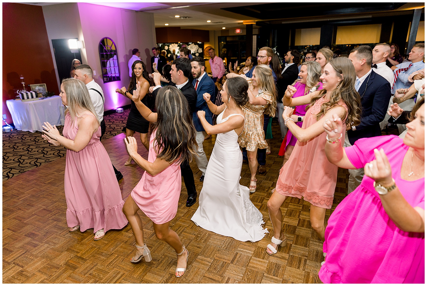 The reception kicked off with a bang – including Auston & her dad surprising everyone with a twist to their Father/Daughter dance including wearing sunglasses! It was too cute!! Lane Tree looked beautiful with all the florals by Wendy – and I especially loved the extra tables full of framed Engagement & Bridal Session photos. That’s a wonderful way to show off more of your photos and it gives your guests something to view as they walk around during cocktail hour! The big wow factor was not only the gorgeous head table, a massive tired cake with textured layers (and a little replica of Goose on the cake), and ALSO a Photo Booth area complete with a vintage couch, a boxwood wall, and a neon sign featuring “The Crooms”! So fun!!!