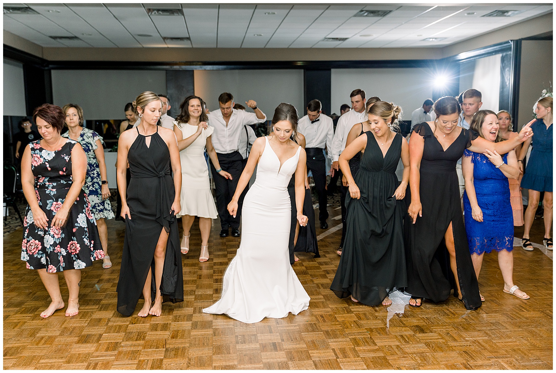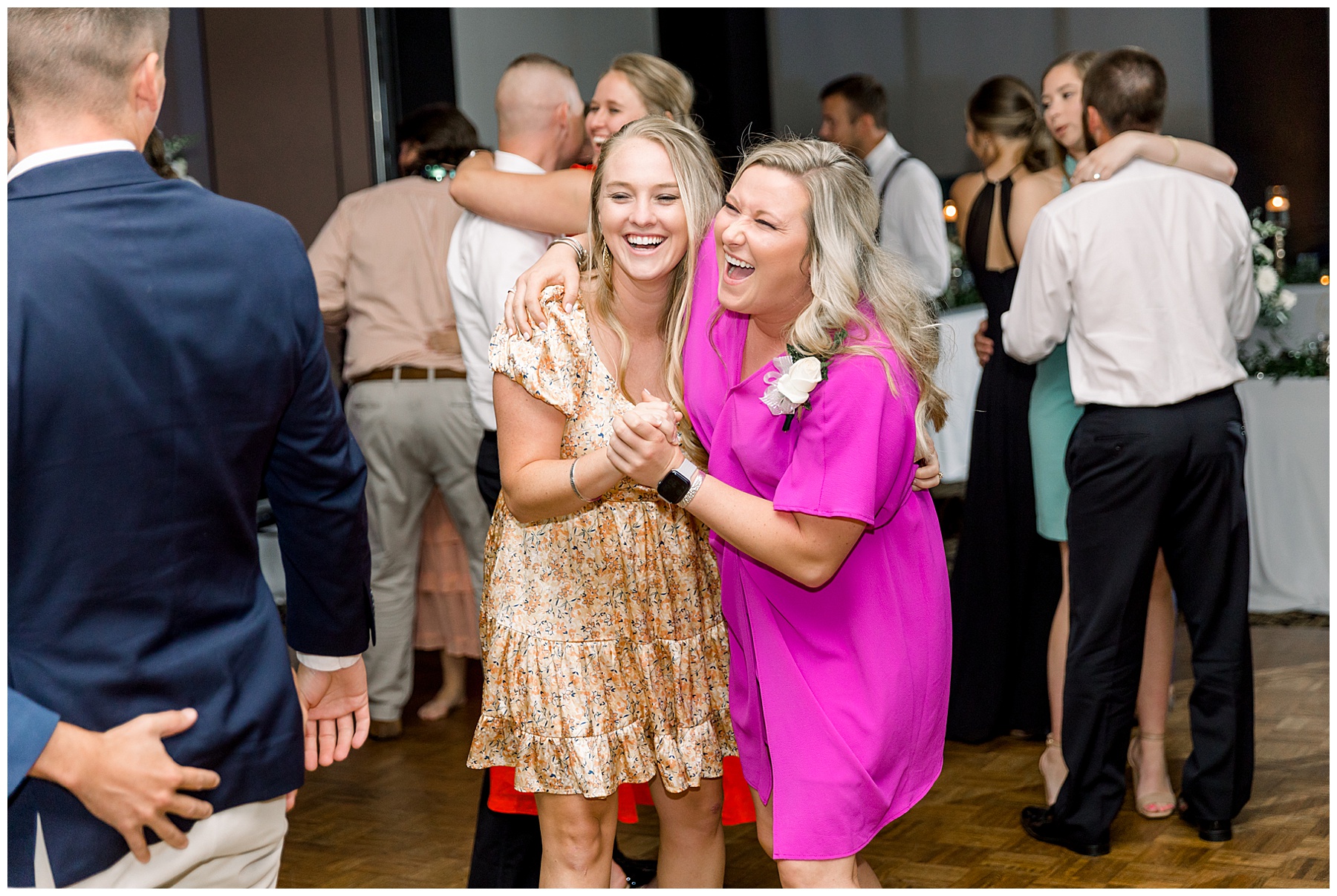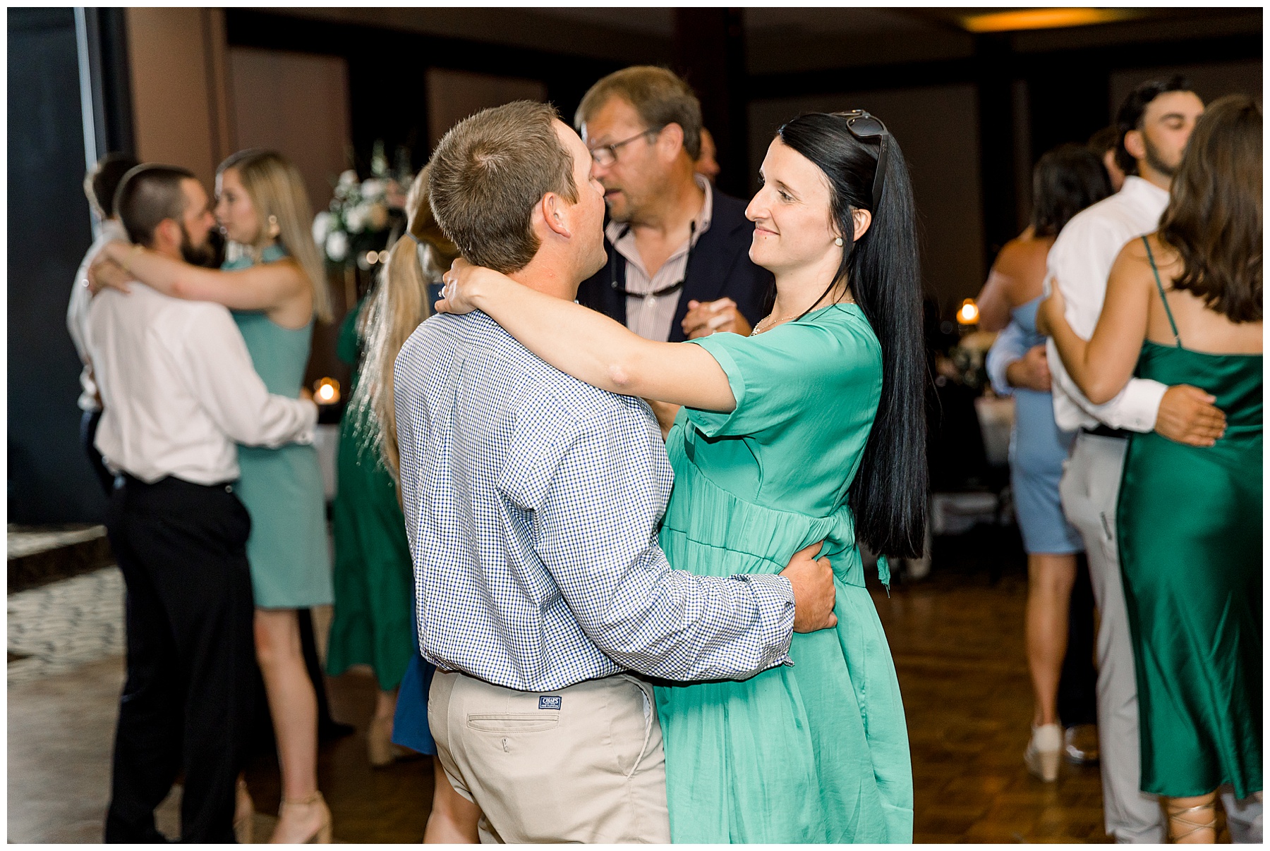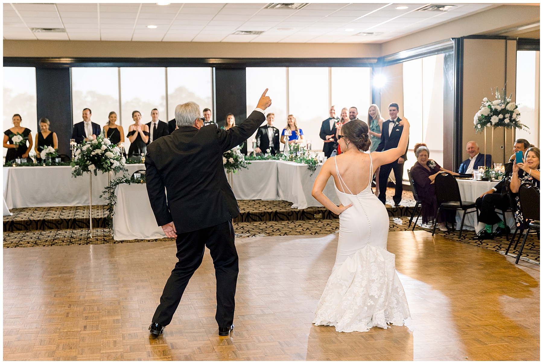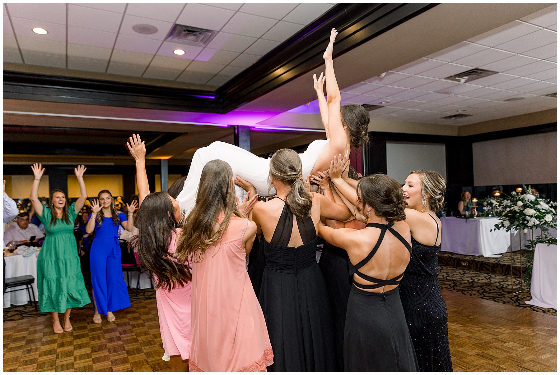 The reception kicked off with a bang – including Auston & her dad surprising everyone with a twist to their Father/Daughter dance including wearing sunglasses! It was too cute!! Lane Tree looked beautiful with all the florals by Wendy – and I especially loved the extra tables full of framed Engagement & Bridal Session photos. That’s a wonderful way to show off more of your photos and it gives your guests something to view as they walk around during cocktail hour! The big wow factor was not only the gorgeous head table, a massive tired cake with textured layers (and a little replica of Goose on the cake), and ALSO a Photo Booth area complete with a vintage couch, a boxwood wall, and a neon sign featuring “The Crooms”! So fun!!!