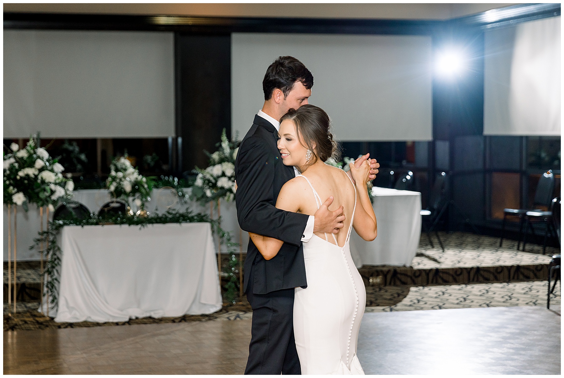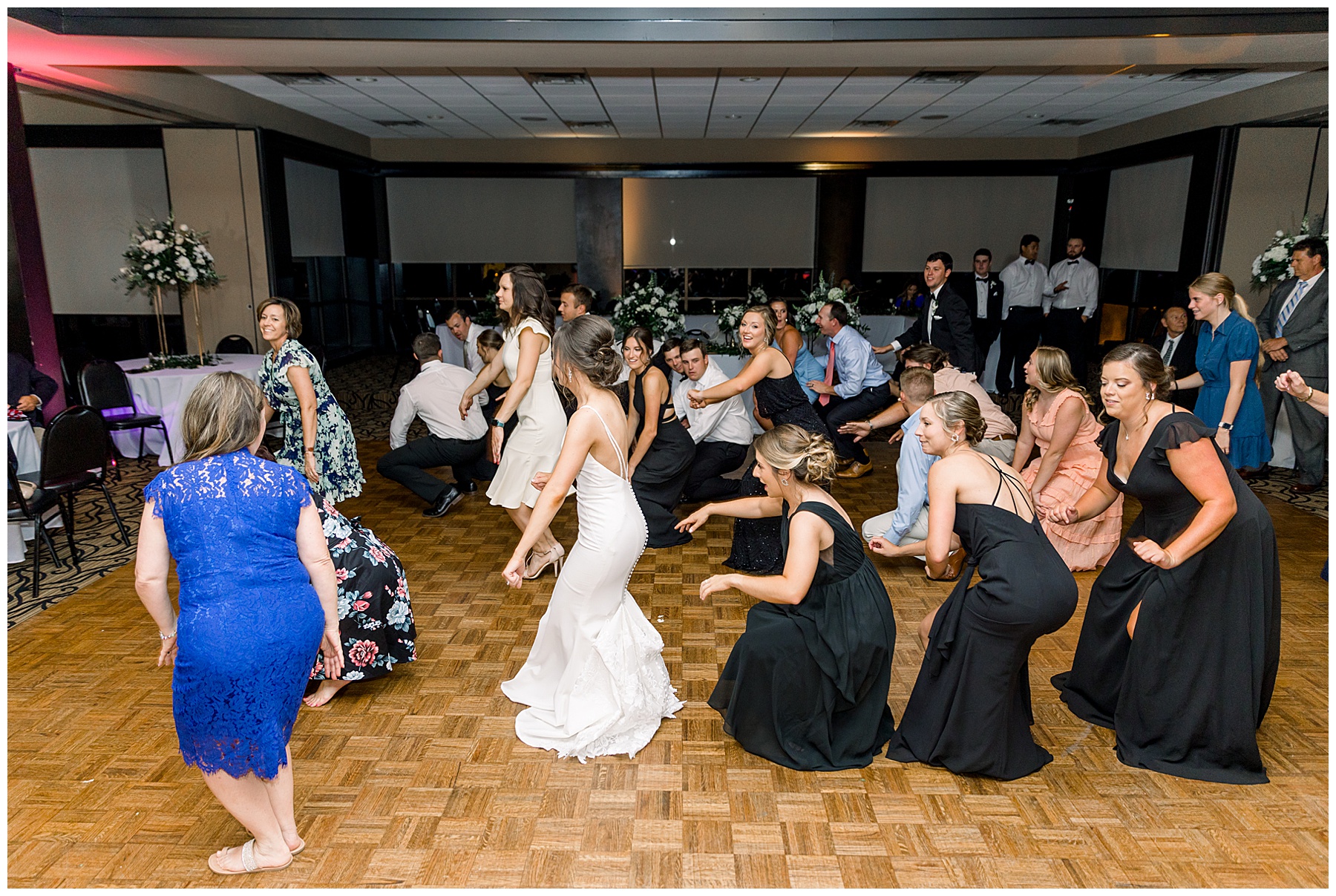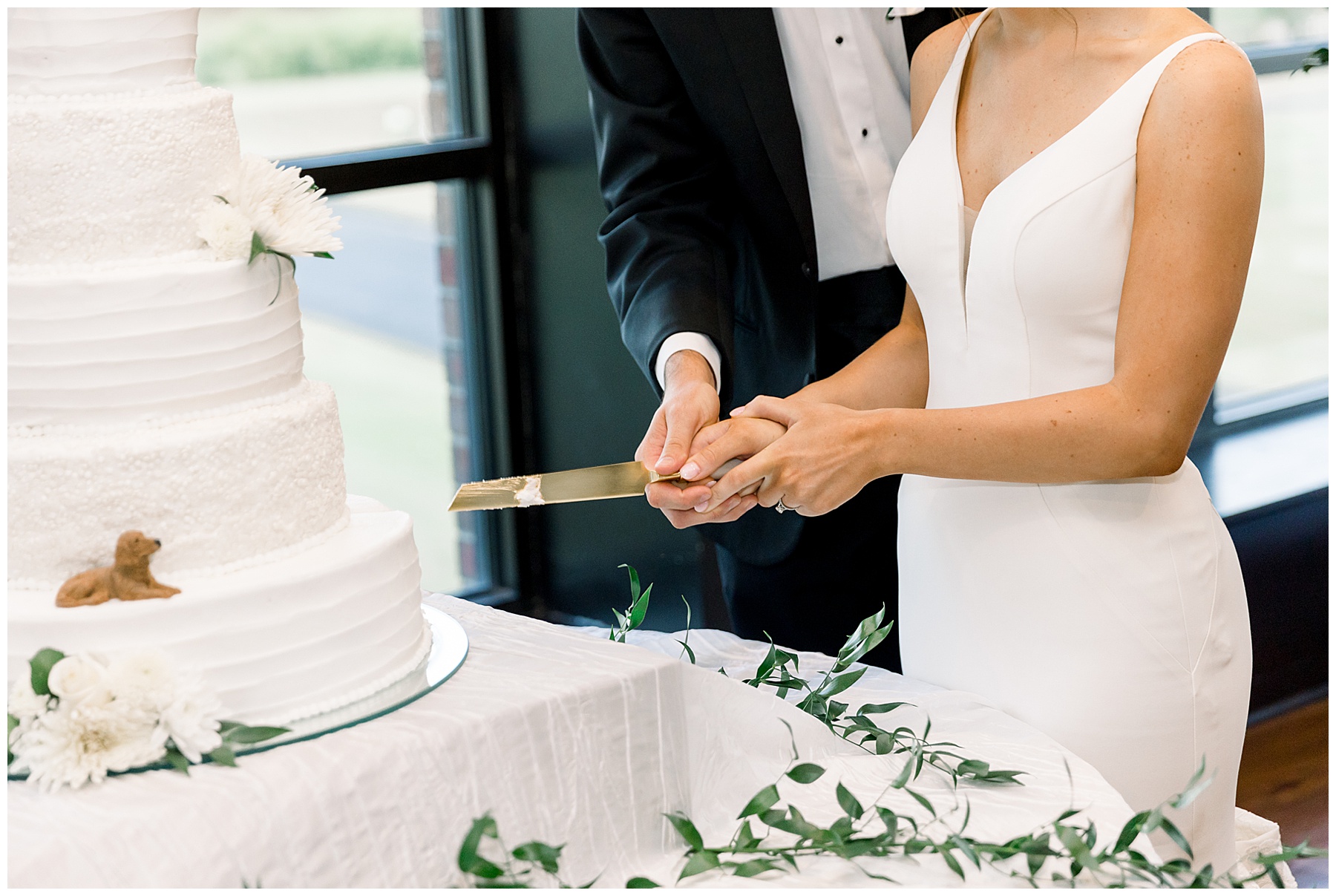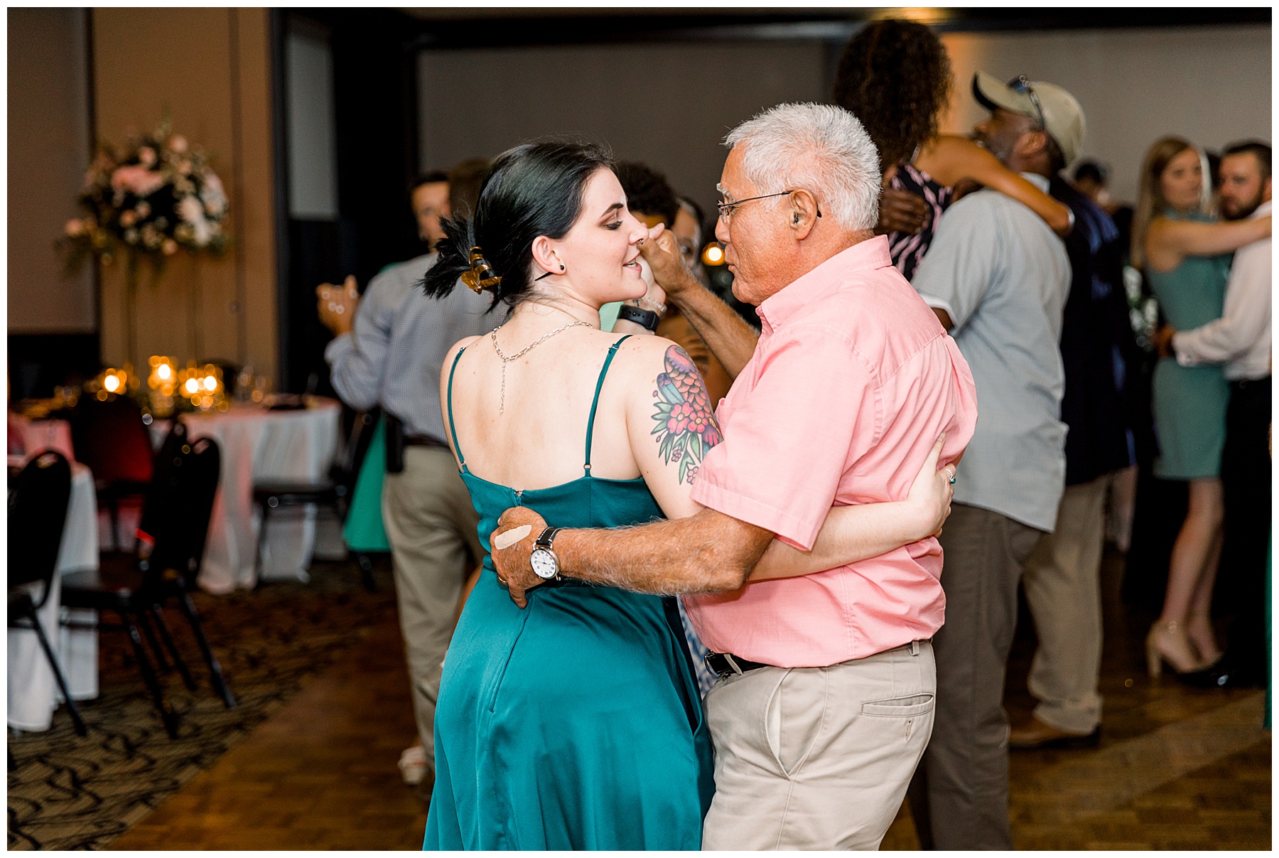 The reception kicked off with a bang – including Auston & her dad surprising everyone with a twist to their Father/Daughter dance including wearing sunglasses! It was too cute!! Lane Tree looked beautiful with all the florals by Wendy – and I especially loved the extra tables full of framed Engagement & Bridal Session photos. That’s a wonderful way to show off more of your photos and it gives your guests something to view as they walk around during cocktail hour! The big wow factor was not only the gorgeous head table, a massive tired cake with textured layers (and a little replica of Goose on the cake), and ALSO a Photo Booth area complete with a vintage couch, a boxwood wall, and a neon sign featuring “The Crooms”! So fun!!!