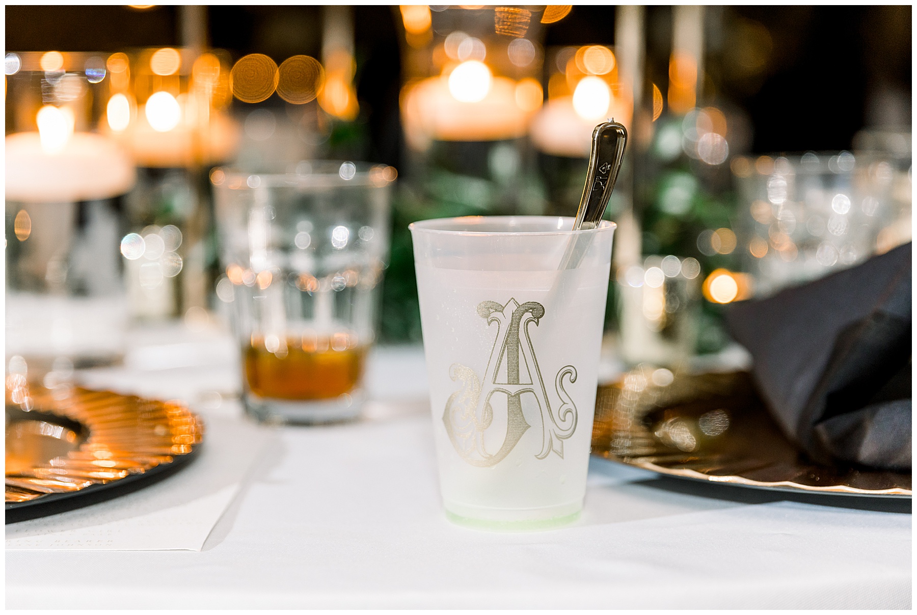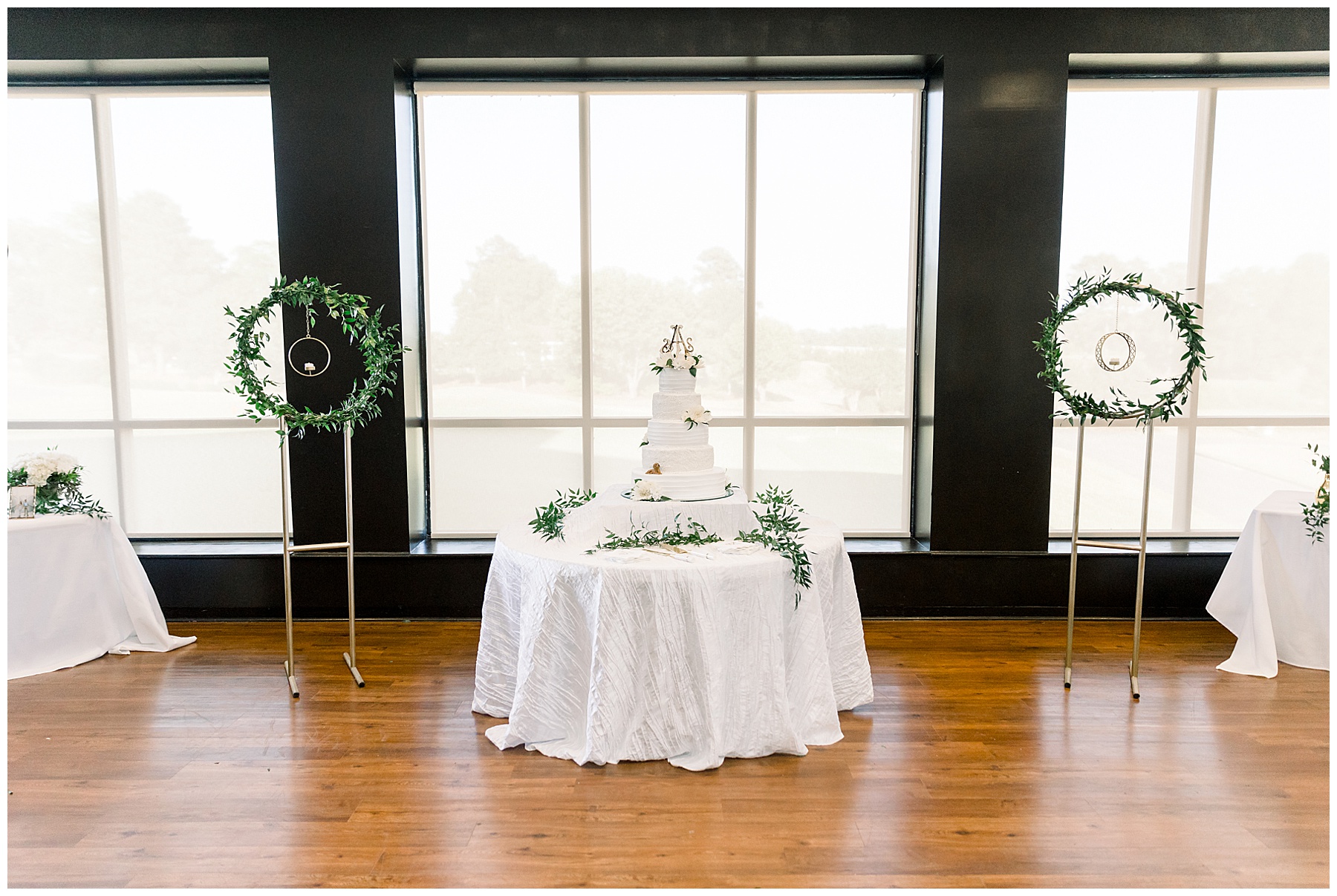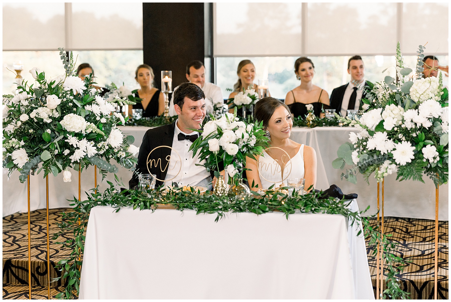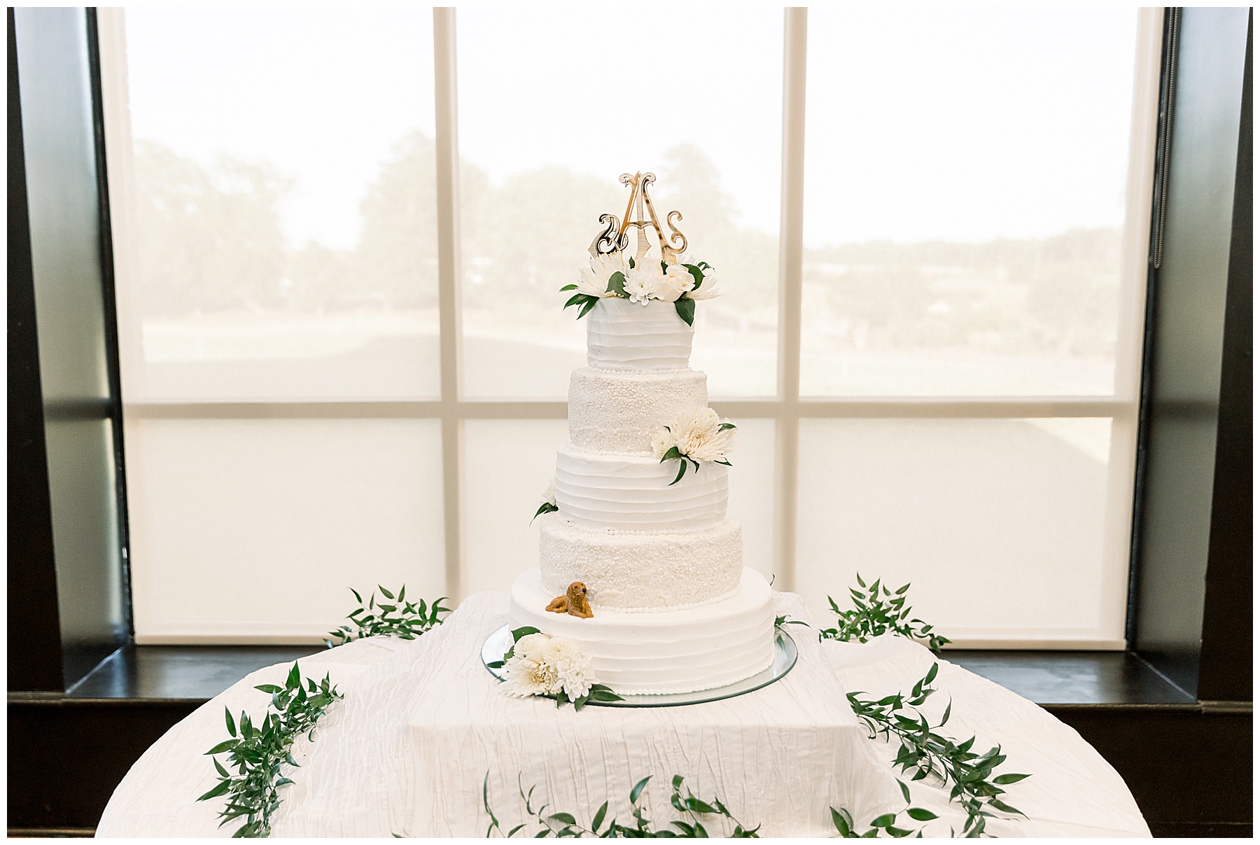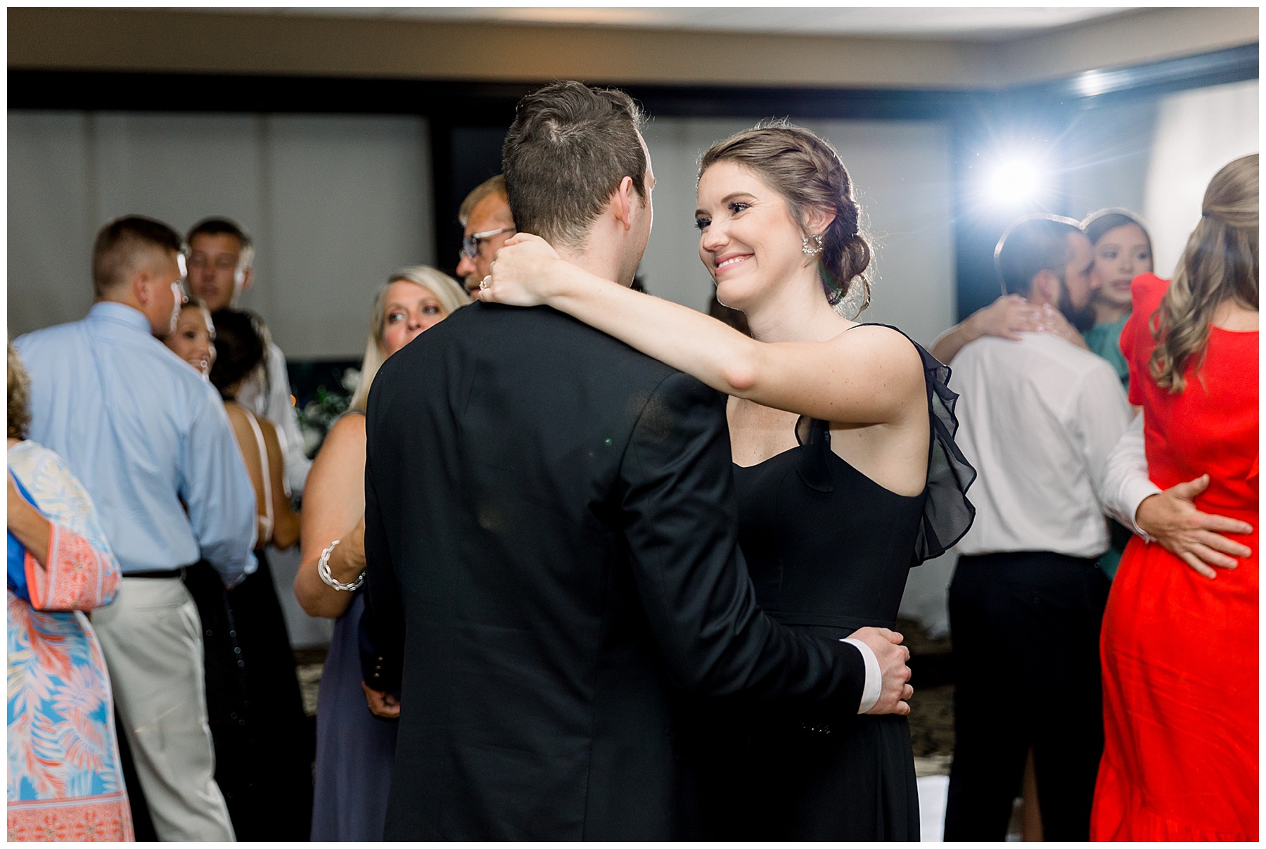The reception kicked off with a bang – including Auston & her dad surprising everyone with a twist to their Father/Daughter dance including wearing sunglasses! It was too cute!! Lane Tree looked beautiful with all the florals by Wendy – and I especially loved the extra tables full of framed Engagement & Bridal Session photos. That’s a wonderful way to show off more of your photos and it gives your guests something to view as they walk around during cocktail hour! The big wow factor was not only the gorgeous head table, a massive tired cake with textured layers (and a little replica of Goose on the cake), and ALSO a Photo Booth area complete with a vintage couch, a boxwood wall, and a neon sign featuring “The Crooms”! So fun!!!