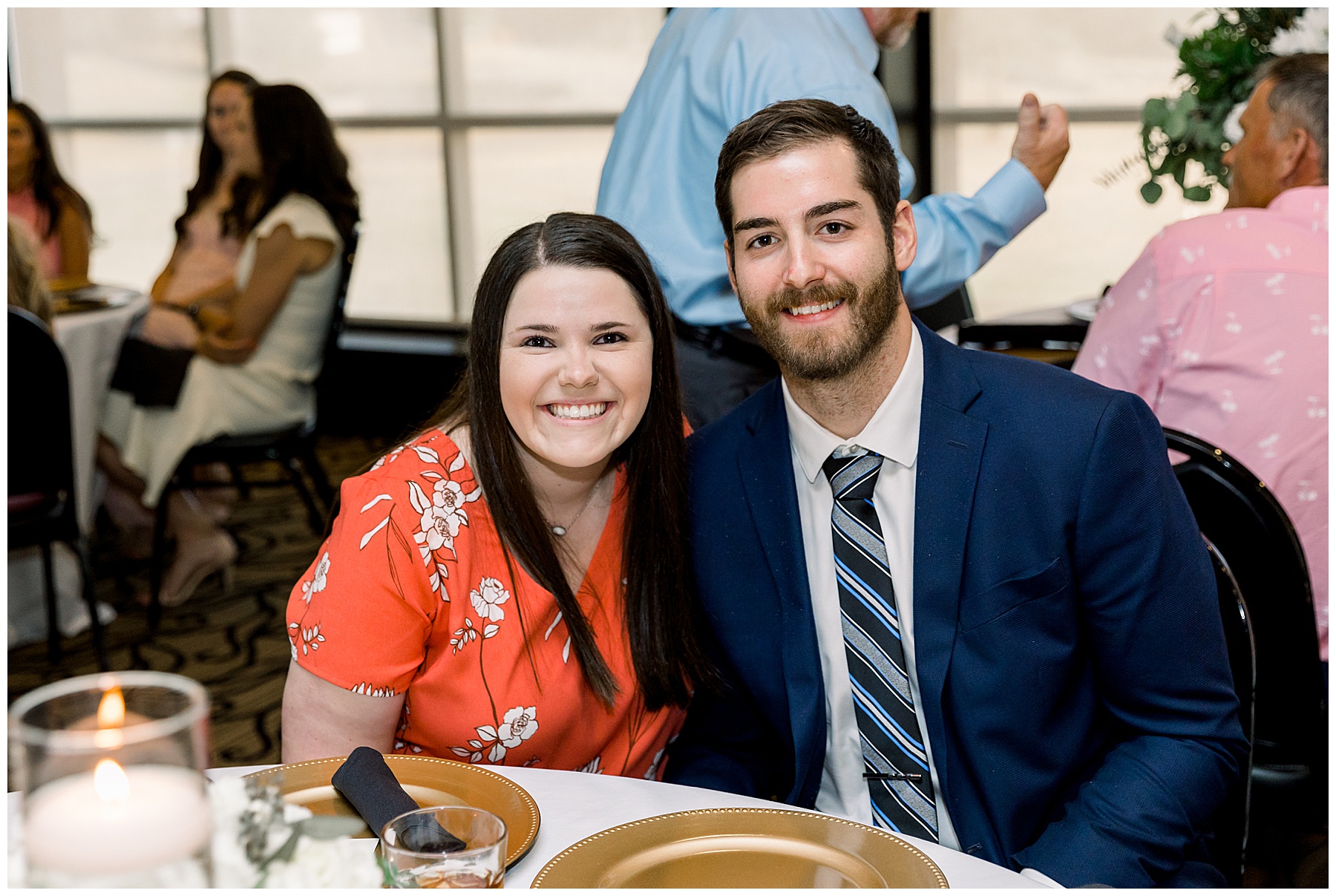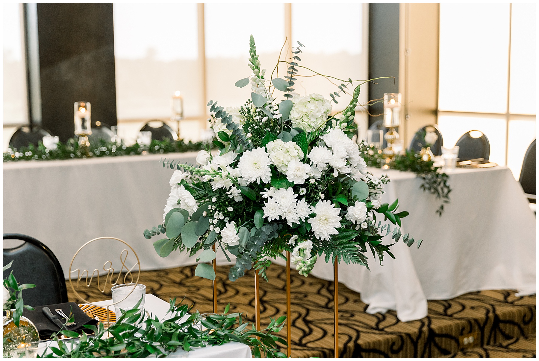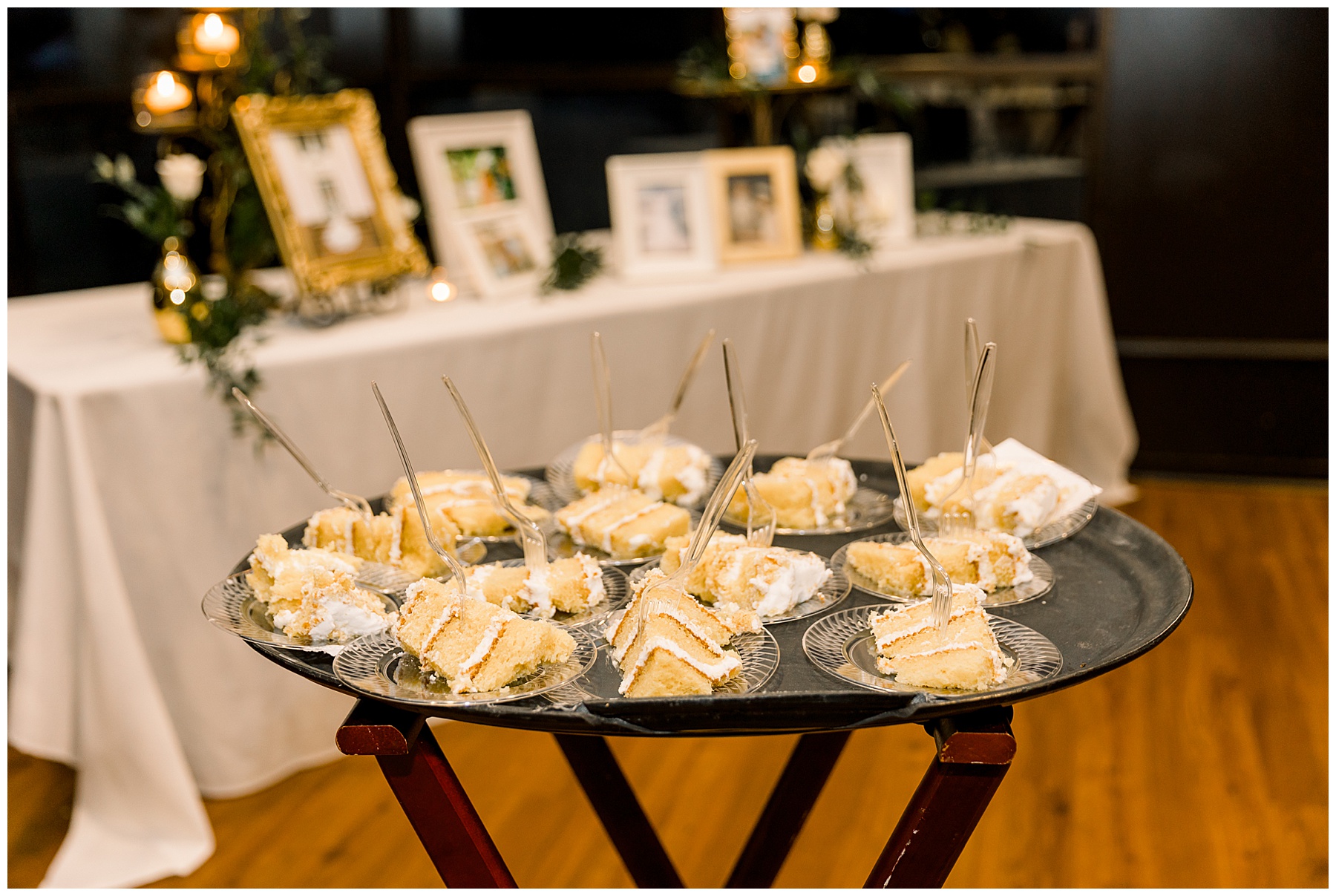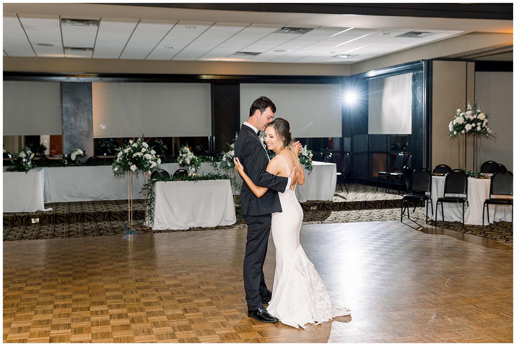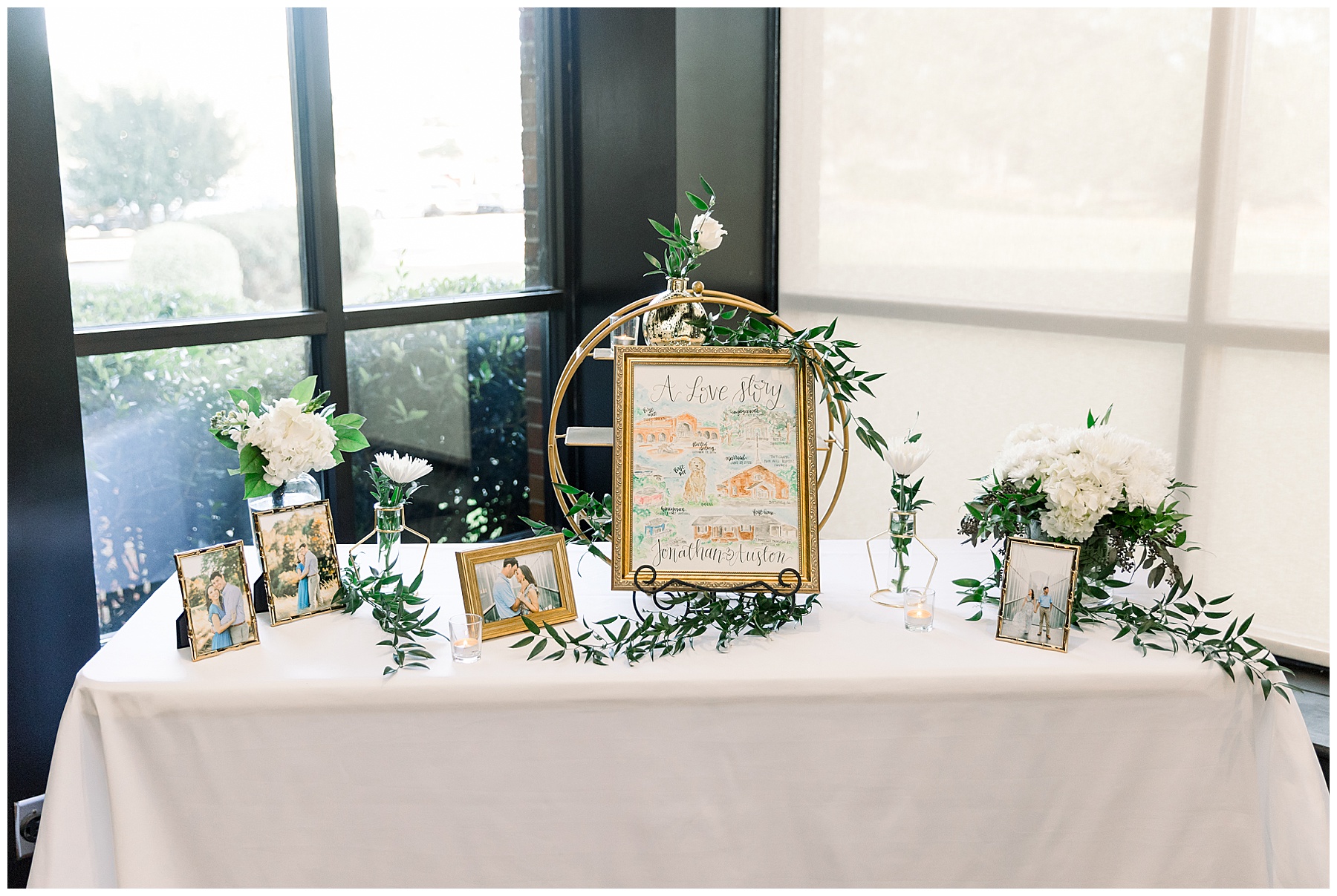 The reception kicked off with a bang – including Auston & her dad surprising everyone with a twist to their Father/Daughter dance including wearing sunglasses! It was too cute!! Lane Tree looked beautiful with all the florals by Wendy – and I especially loved the extra tables full of framed Engagement & Bridal Session photos. That’s a wonderful way to show off more of your photos and it gives your guests something to view as they walk around during cocktail hour! The big wow factor was not only the gorgeous head table, a massive tired cake with textured layers (and a little replica of Goose on the cake), and ALSO a Photo Booth area complete with a vintage couch, a boxwood wall, and a neon sign featuring “The Crooms”! So fun!!!