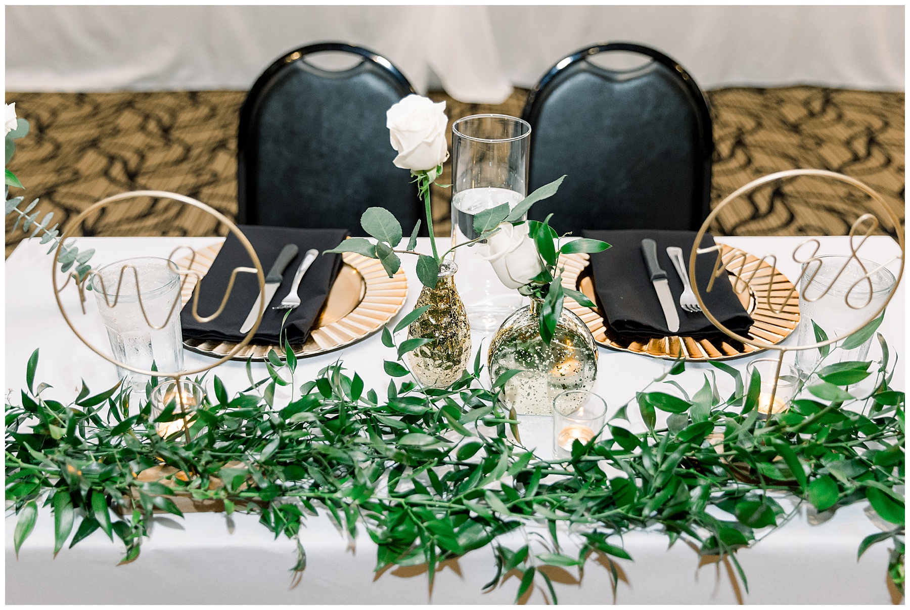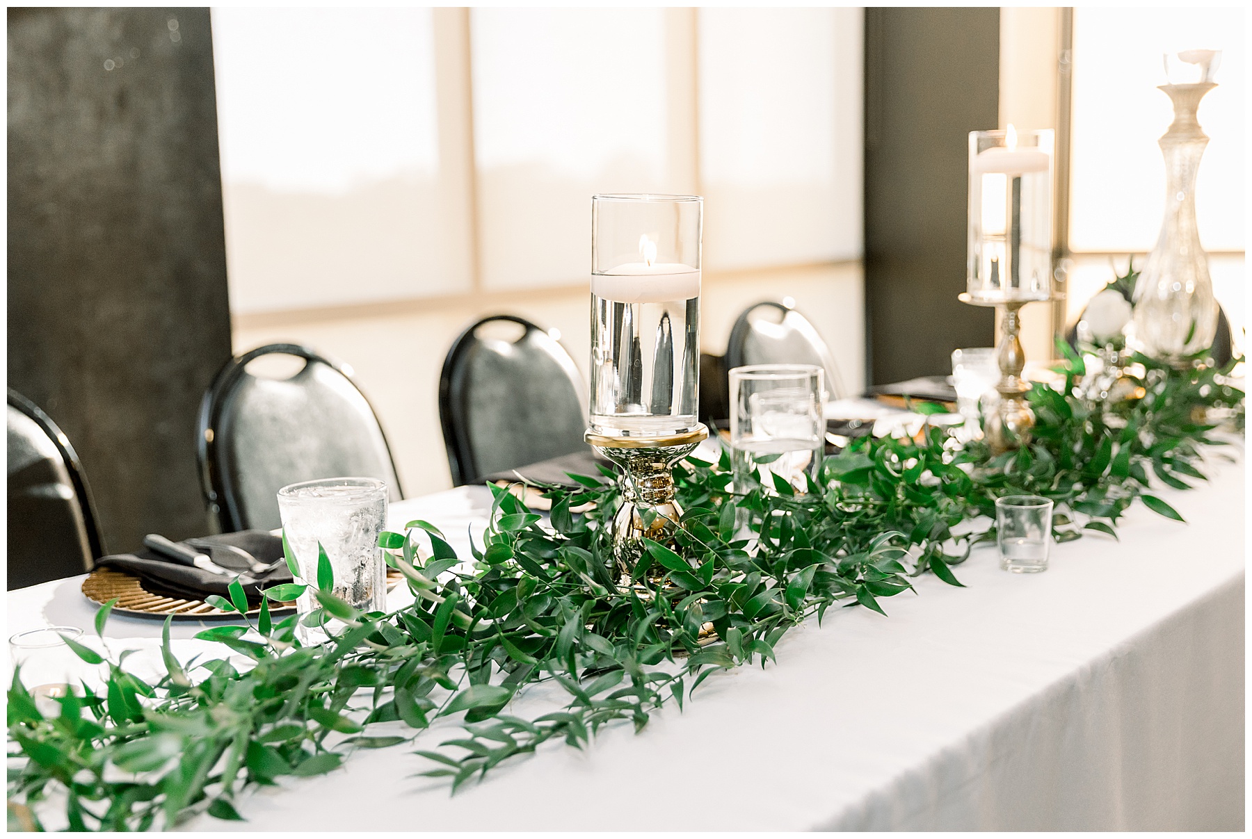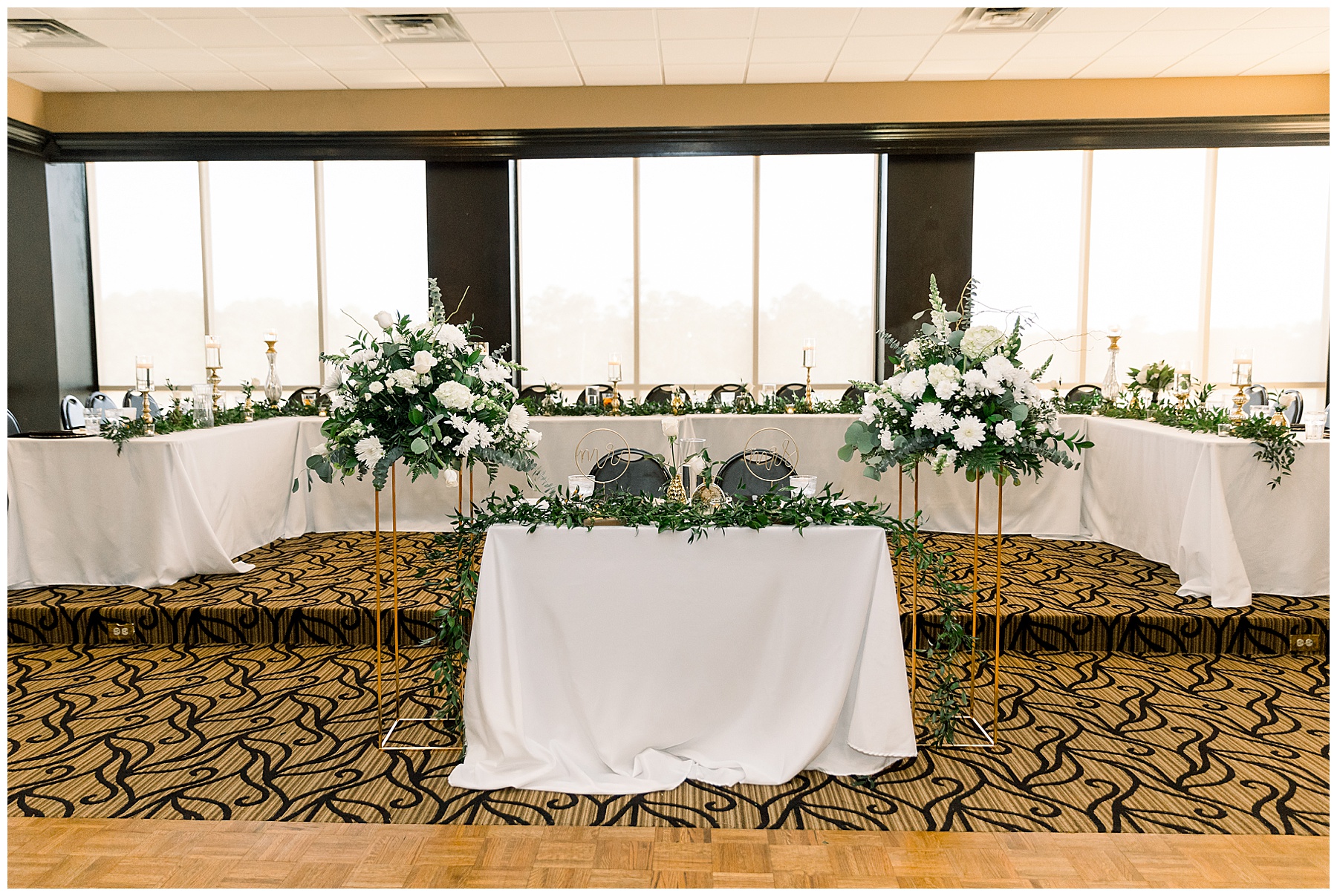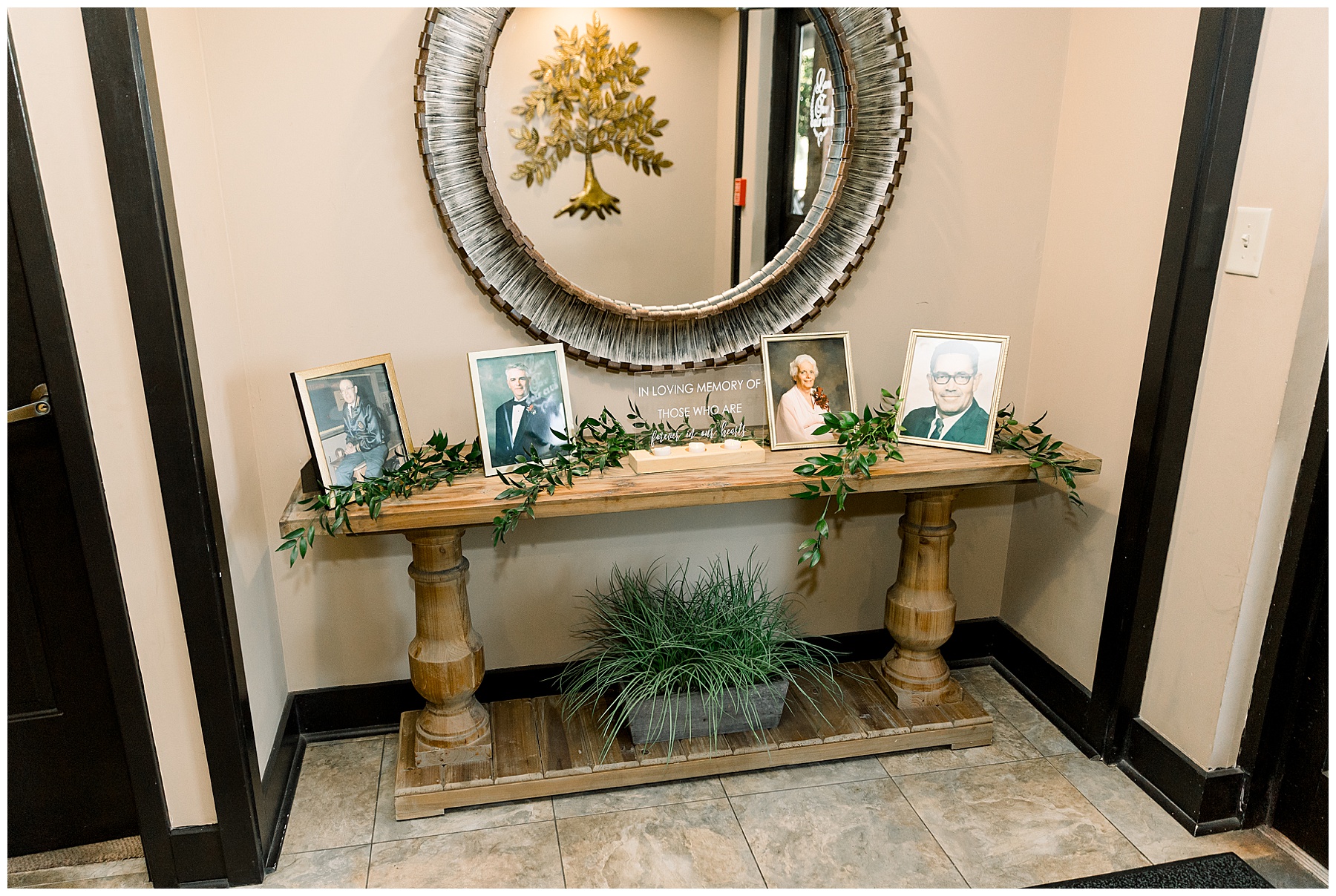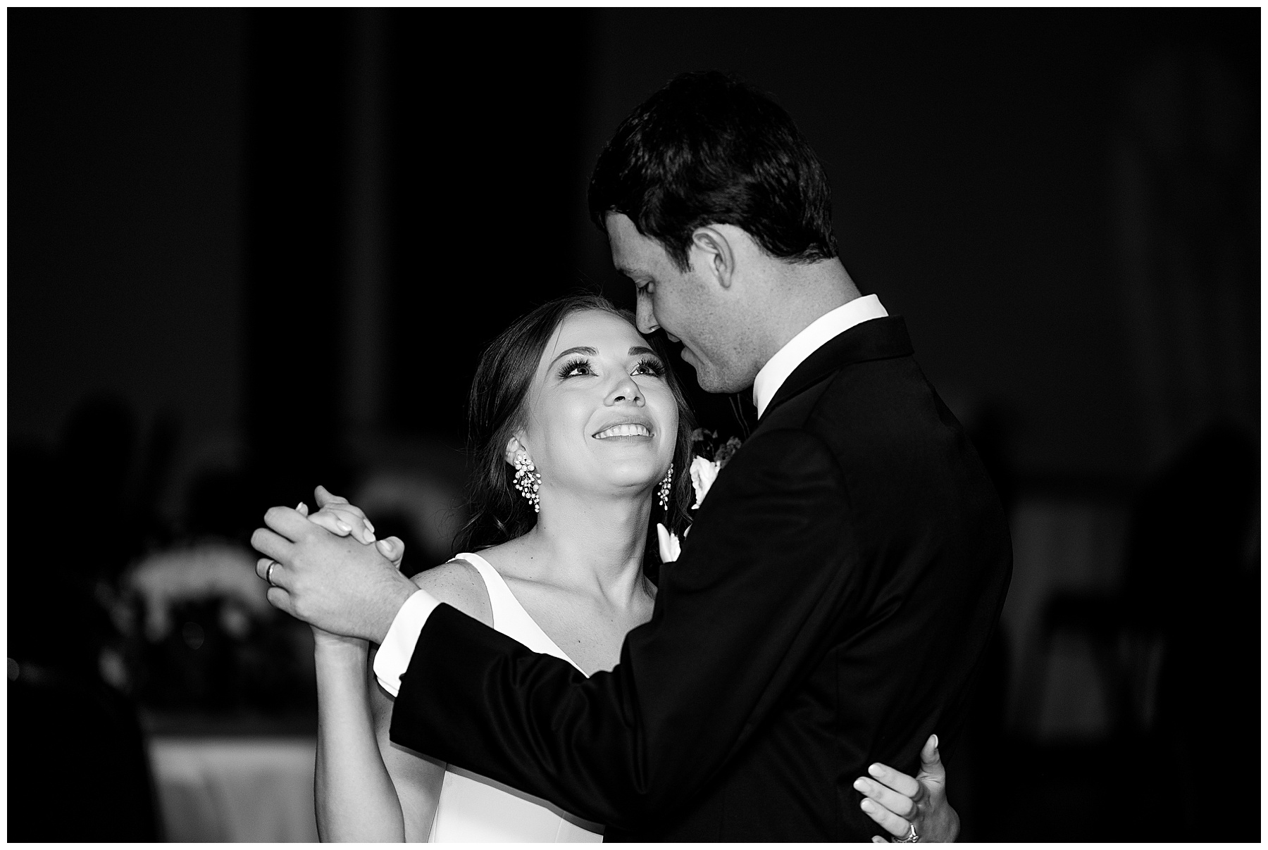 The reception kicked off with a bang – including Auston & her dad surprising everyone with a twist to their Father/Daughter dance including wearing sunglasses! It was too cute!! Lane Tree looked beautiful with all the florals by Wendy – and I especially loved the extra tables full of framed Engagement & Bridal Session photos. That’s a wonderful way to show off more of your photos and it gives your guests something to view as they walk around during cocktail hour! The big wow factor was not only the gorgeous head table, a massive tired cake with textured layers (and a little replica of Goose on the cake), and ALSO a Photo Booth area complete with a vintage couch, a boxwood wall, and a neon sign featuring “The Crooms”! So fun!!!