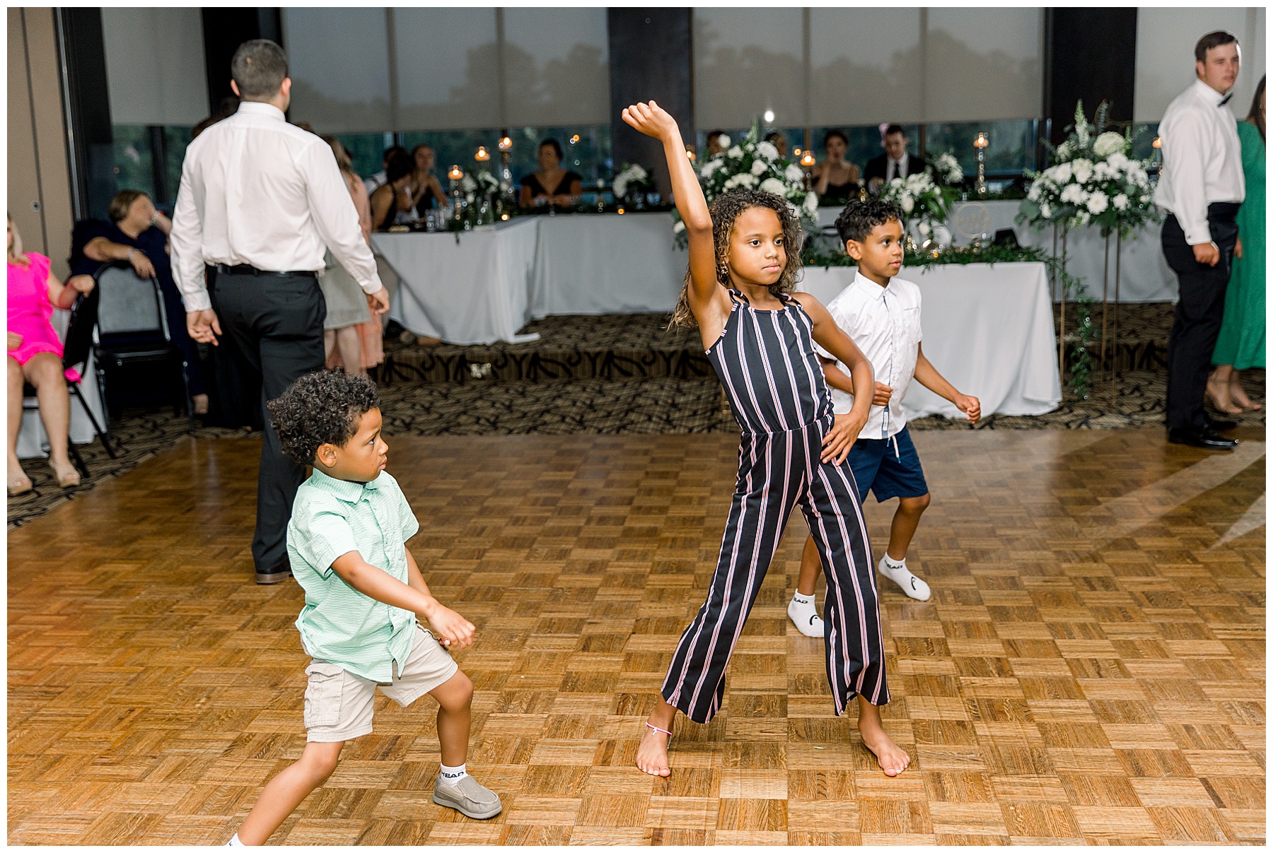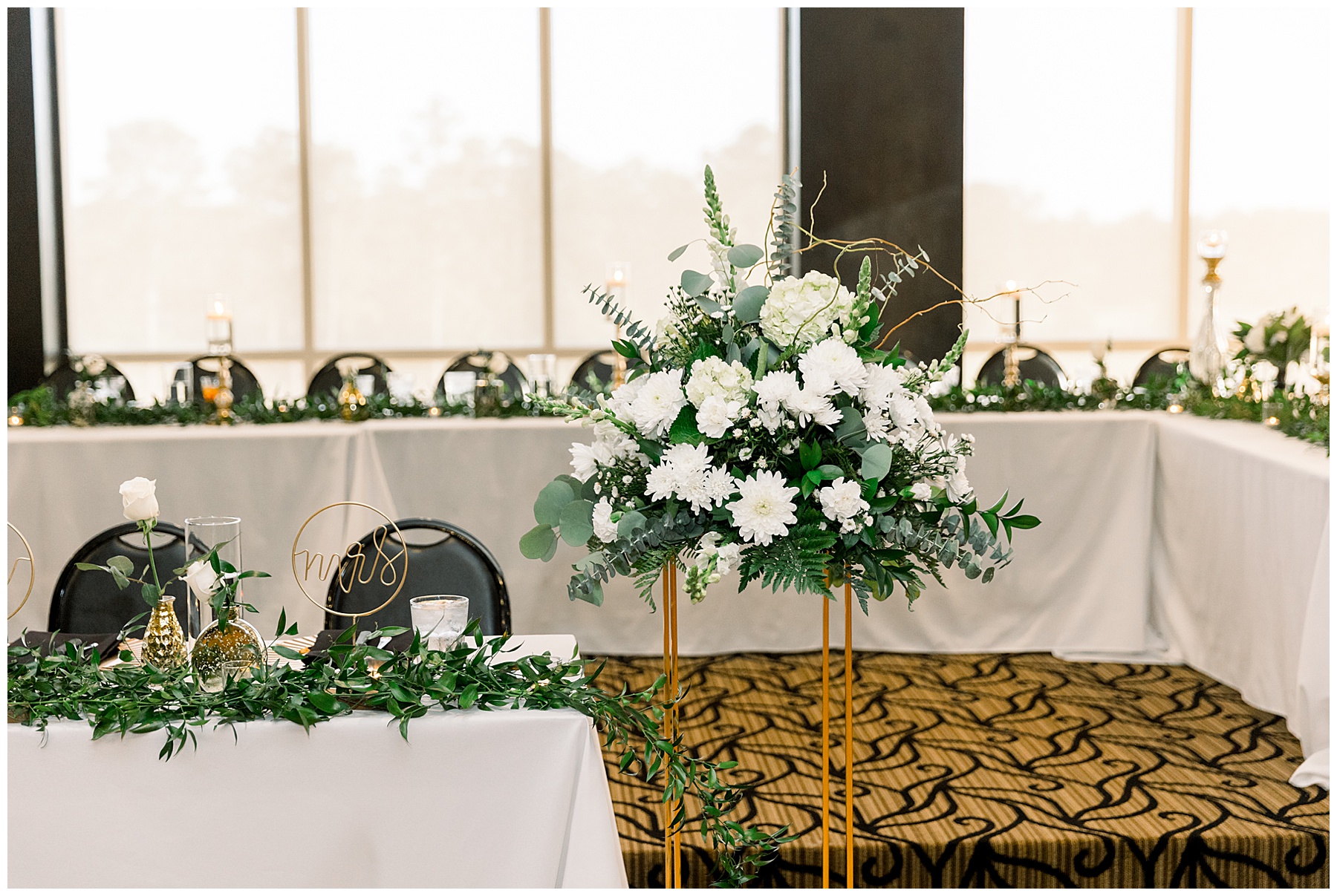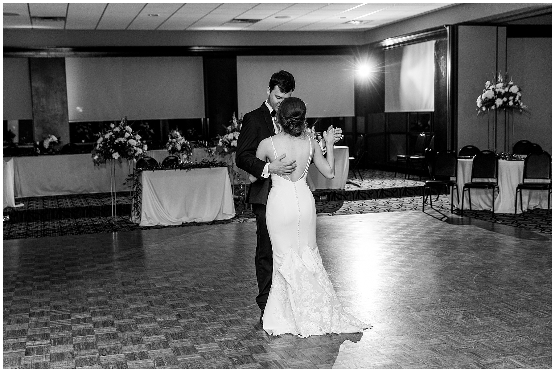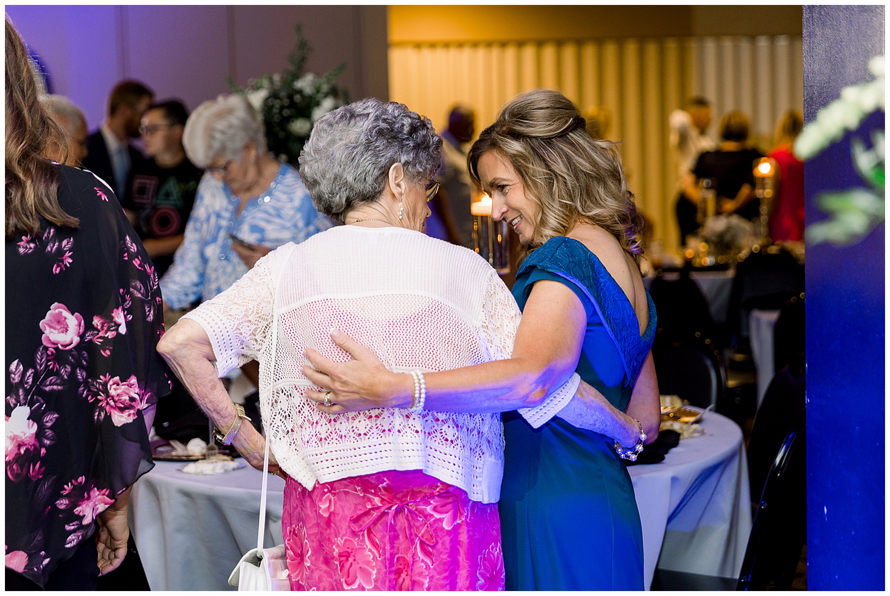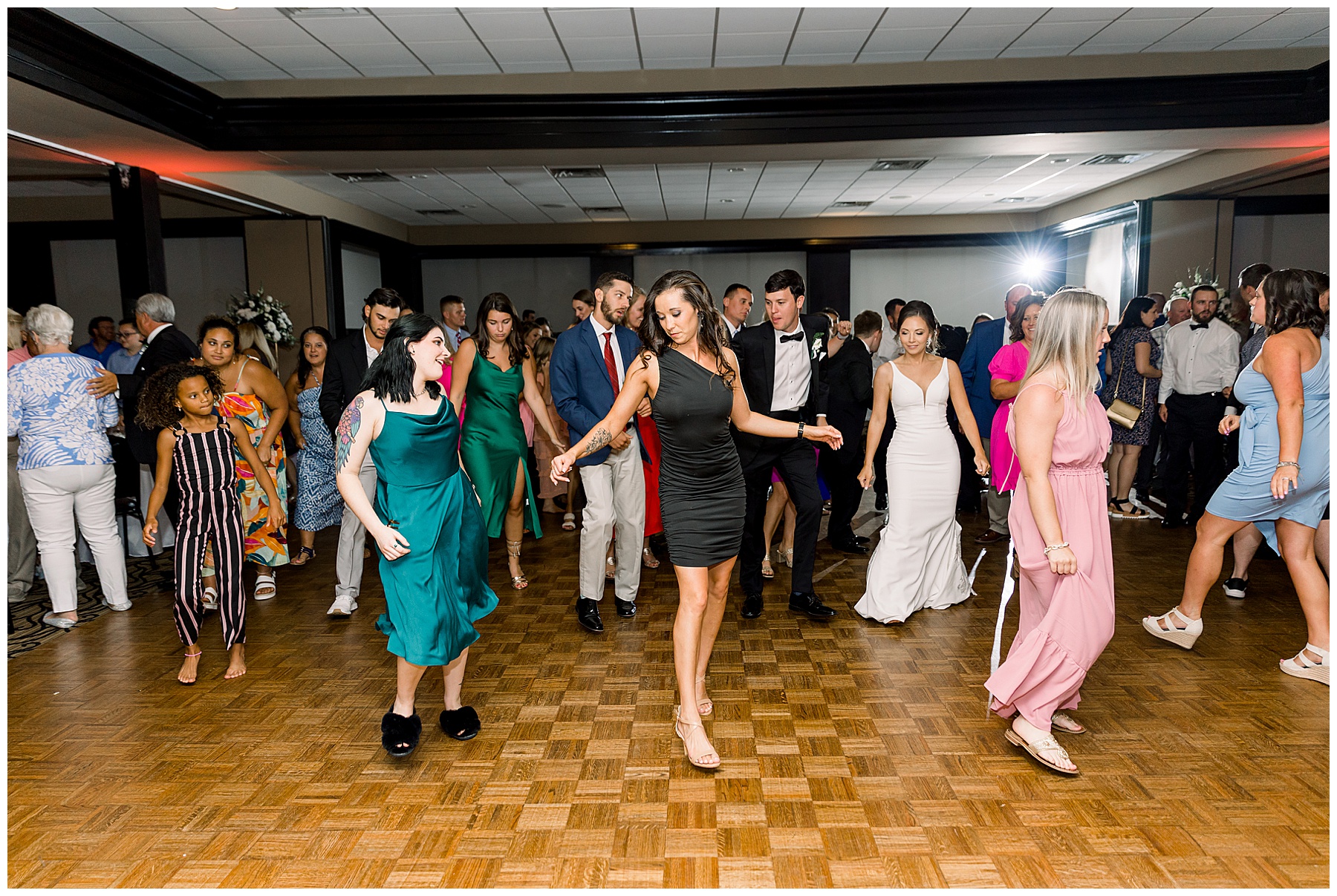 The reception kicked off with a bang – including Auston & her dad surprising everyone with a twist to their Father/Daughter dance including wearing sunglasses! It was too cute!! Lane Tree looked beautiful with all the florals by Wendy – and I especially loved the extra tables full of framed Engagement & Bridal Session photos. That’s a wonderful way to show off more of your photos and it gives your guests something to view as they walk around during cocktail hour! The big wow factor was not only the gorgeous head table, a massive tired cake with textured layers (and a little replica of Goose on the cake), and ALSO a Photo Booth area complete with a vintage couch, a boxwood wall, and a neon sign featuring “The Crooms”! So fun!!!