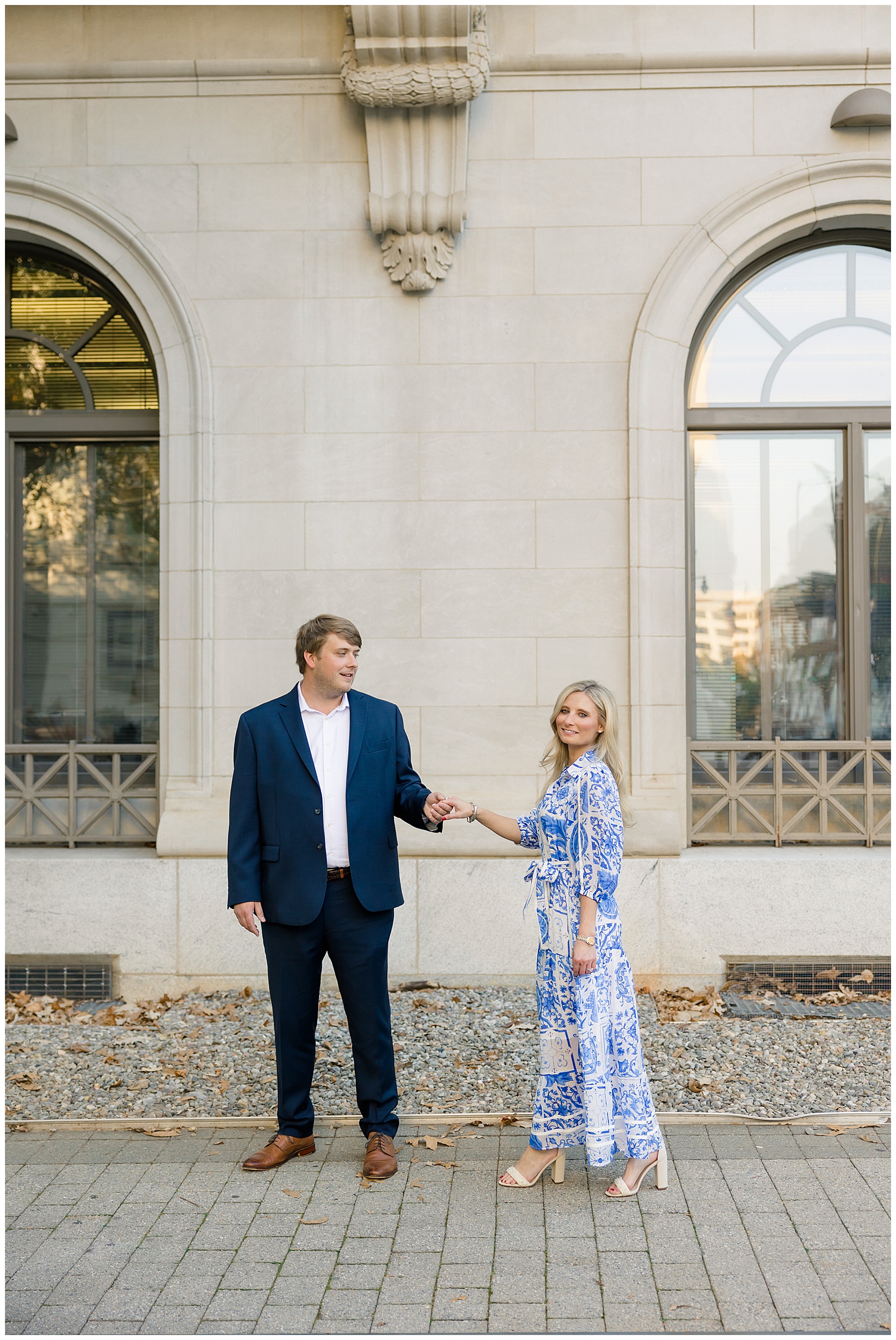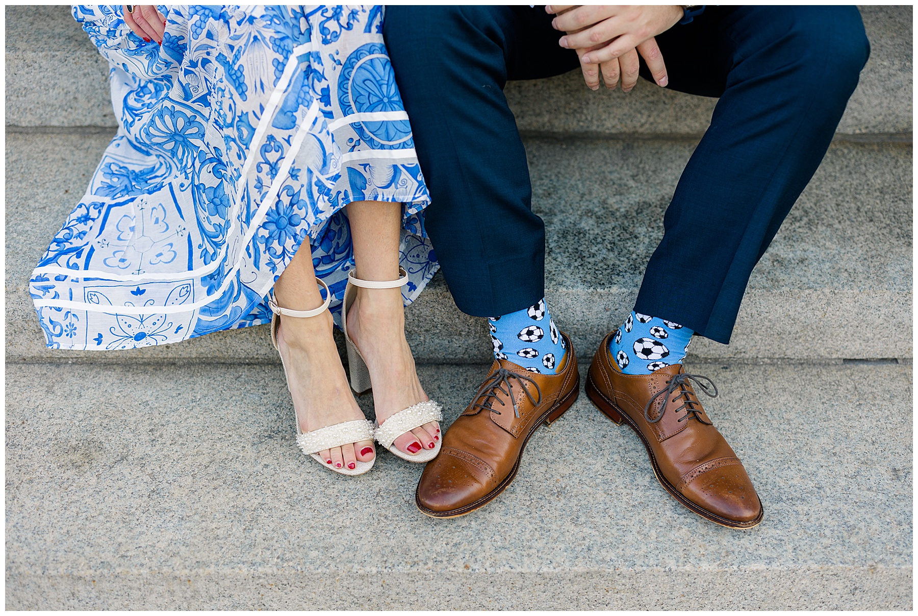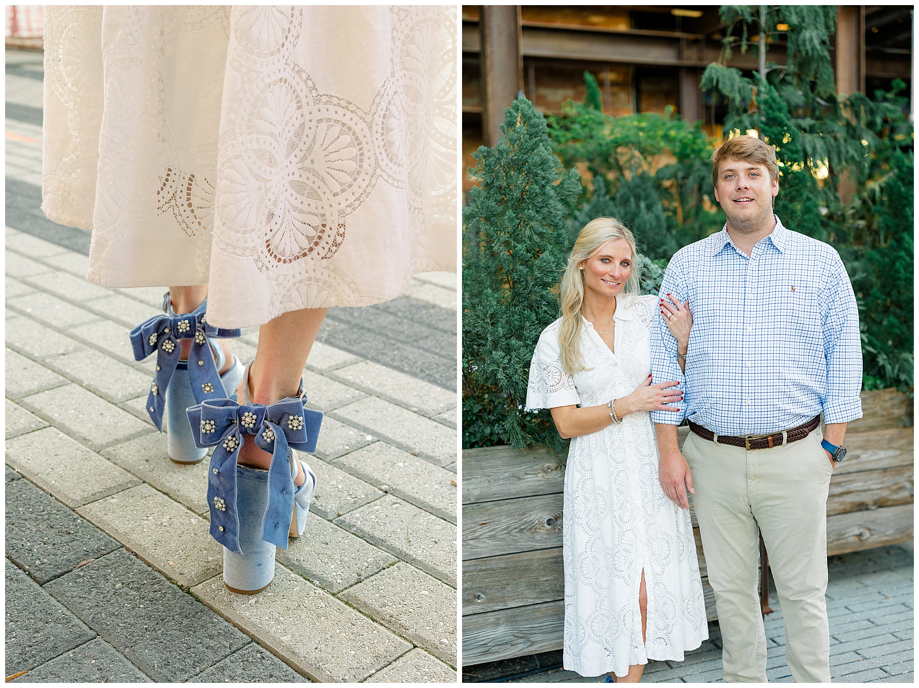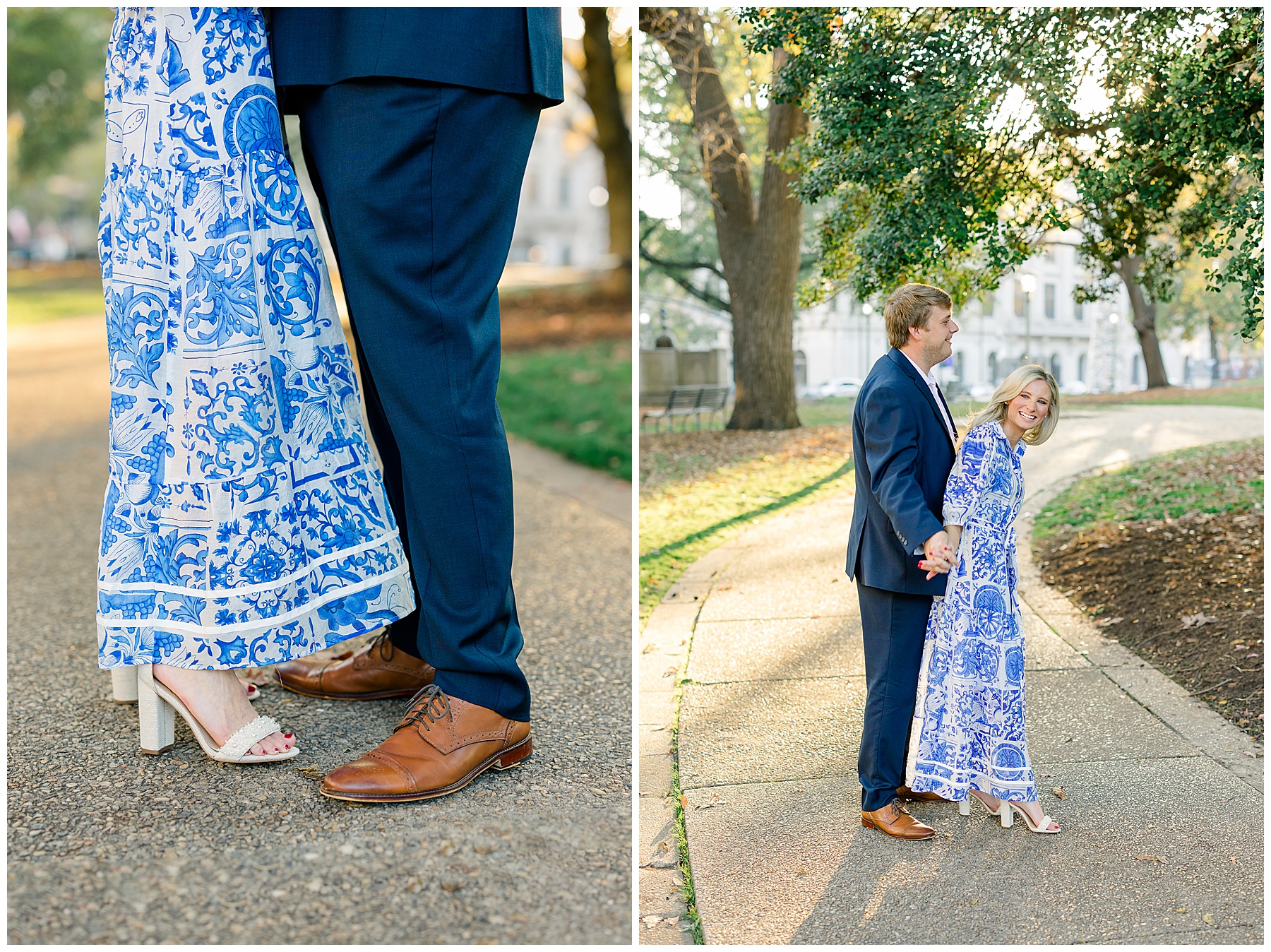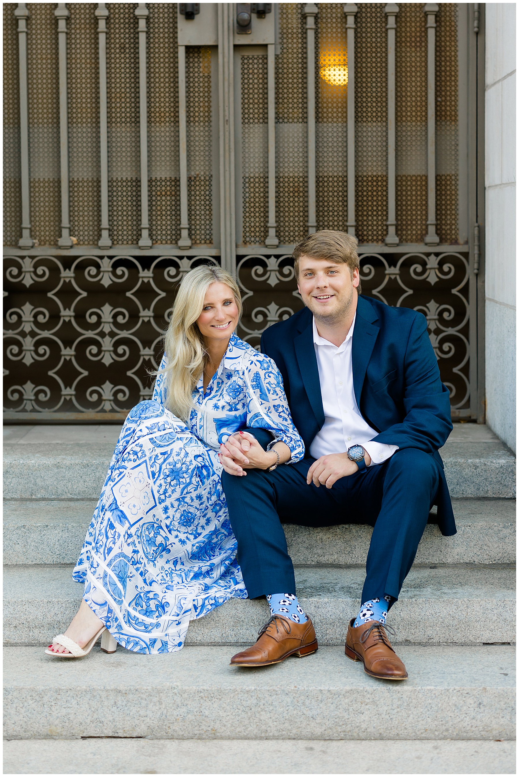 Baker & Robert showed up looking so stylish and I was pumped from the start! Baker’s blue & white dress was so unique, southern, and I loved the bow at the waist. Speaking of bows – check out her blue heels (that ROBERT bought her! Brownie points!!!) in her second outfit that she wore! They had the cutest bows on the back with little rhinestones! So pretty that these blue heels just might be my favorite engagement session shoes EVER!!!!! I also loved that Robert wore blue socks with soccer balls on them – a nod to his college soccer career! I love when couples choose such personal and intentional details to include for their sessions. :)