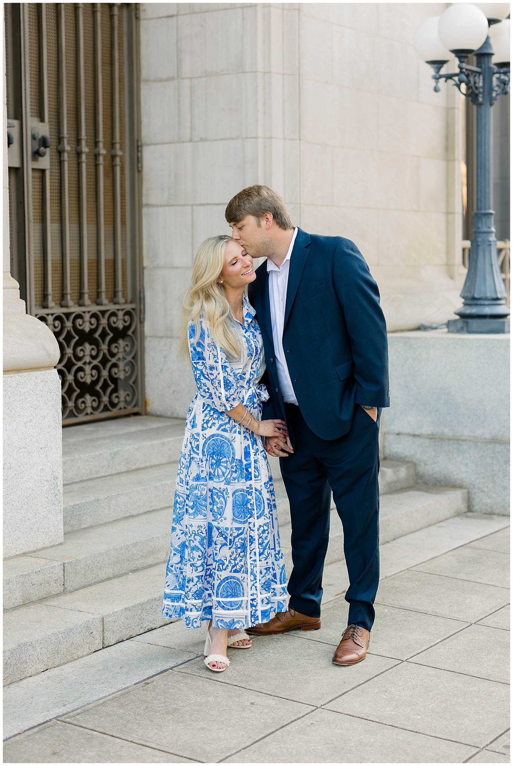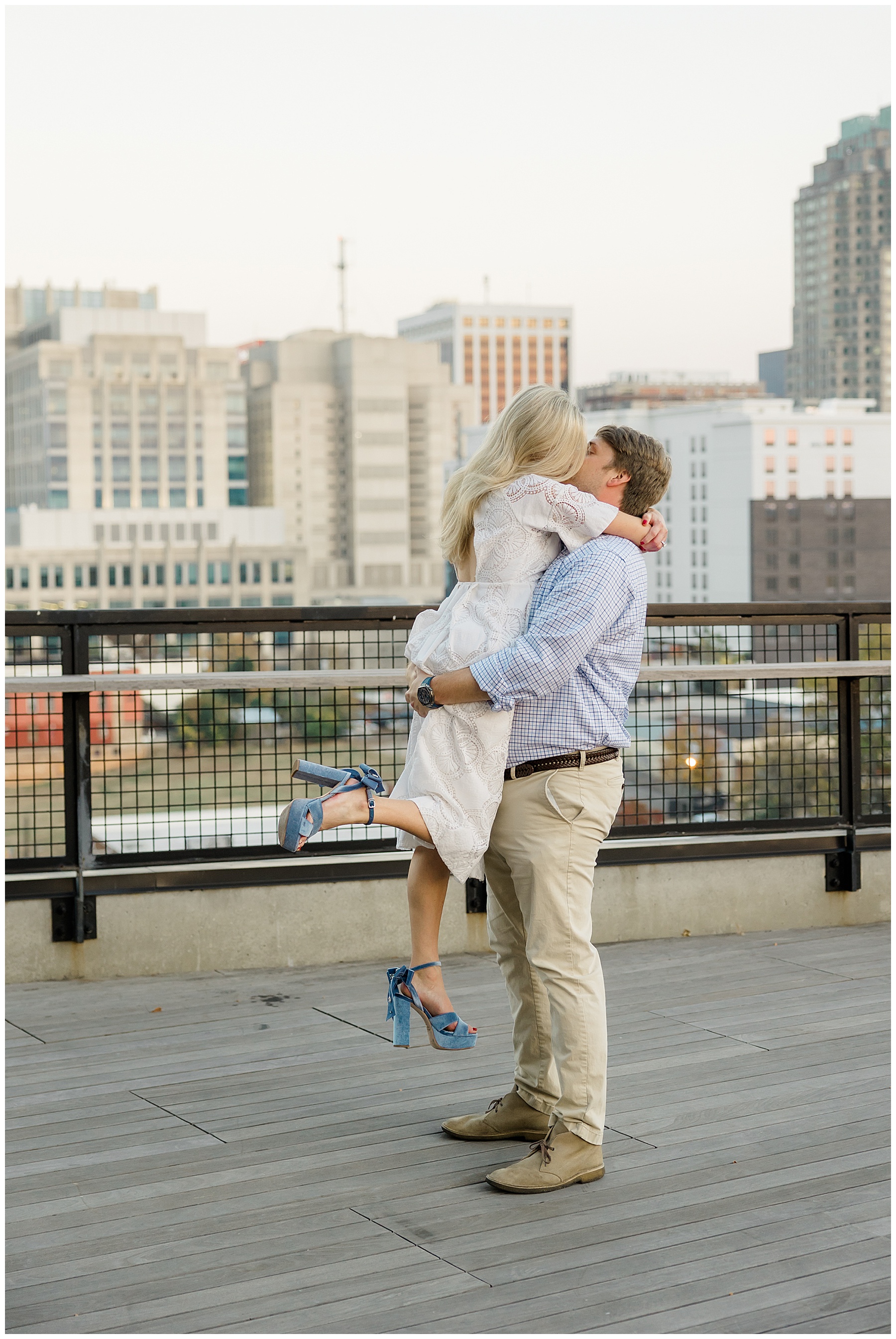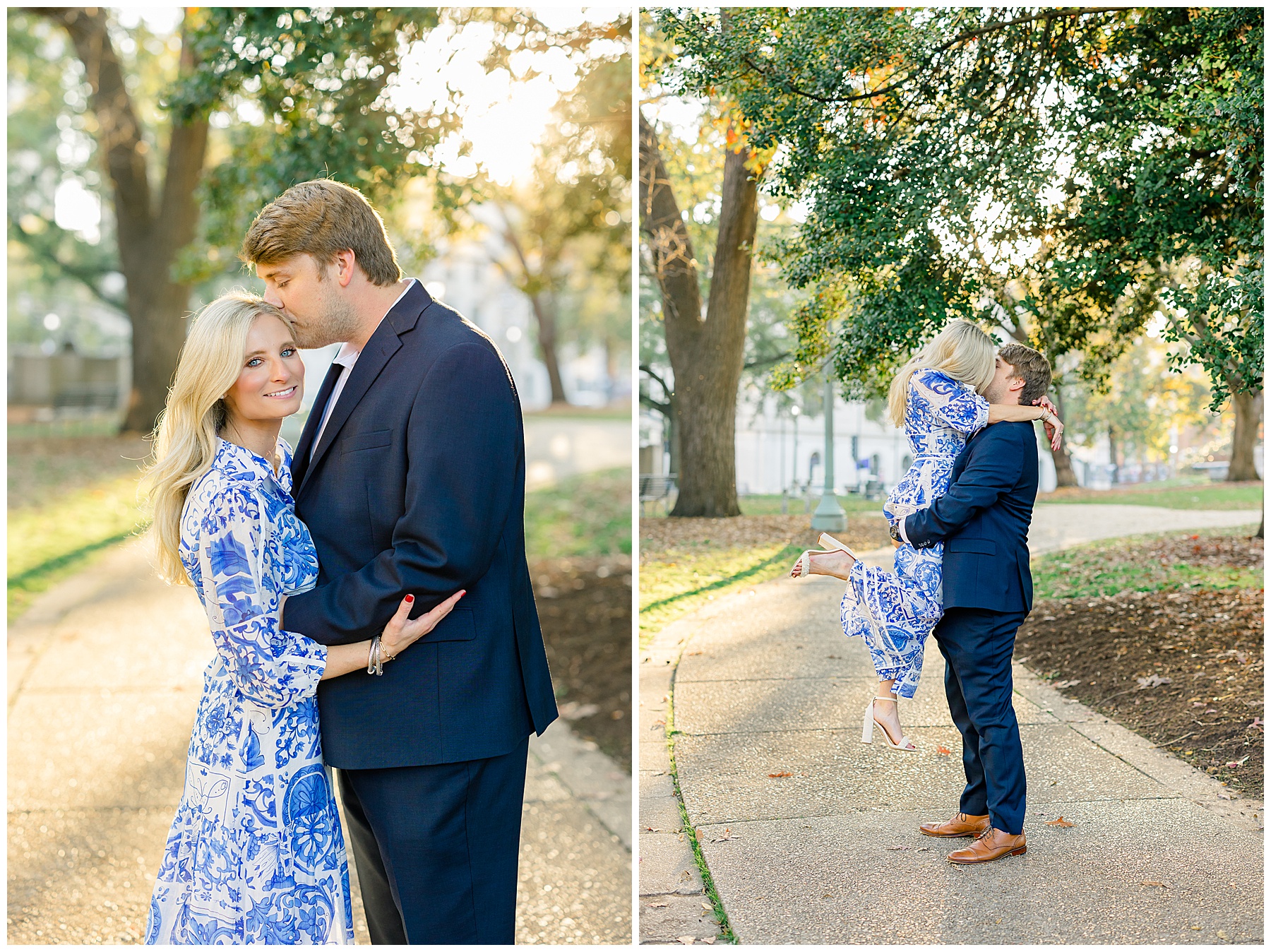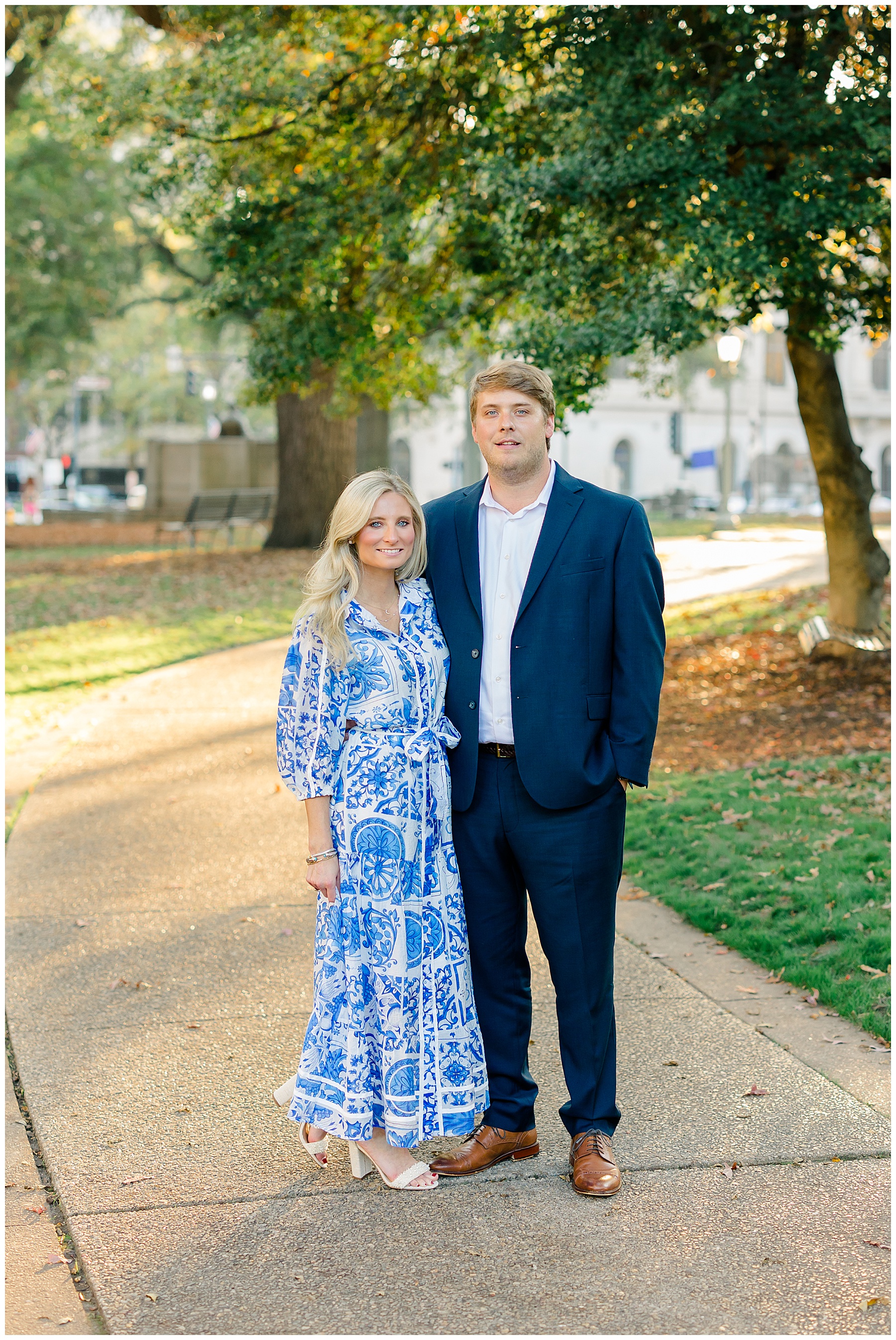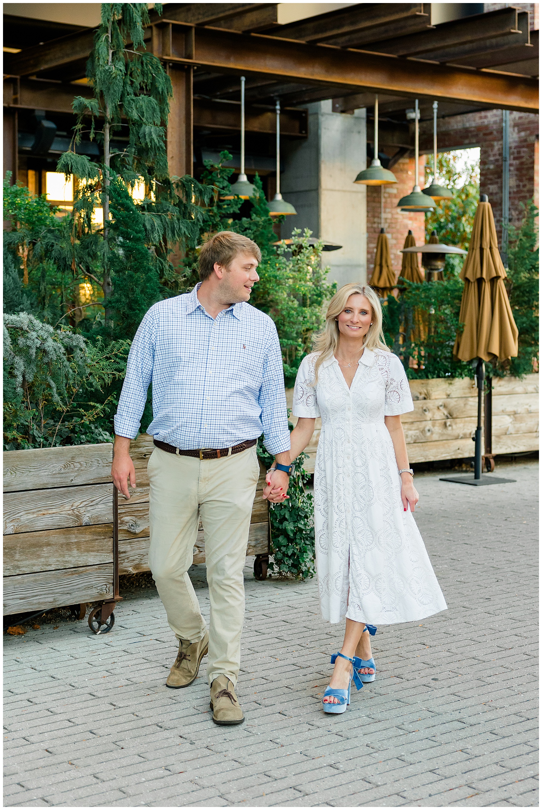 Baker & Robert showed up looking so stylish and I was pumped from the start! Baker’s blue & white dress was so unique, southern, and I loved the bow at the waist. Speaking of bows – check out her blue heels (that ROBERT bought her! Brownie points!!!) in her second outfit that she wore! They had the cutest bows on the back with little rhinestones! So pretty that these blue heels just might be my favorite engagement session shoes EVER!!!!! I also loved that Robert wore blue socks with soccer balls on them – a nod to his college soccer career! I love when couples choose such personal and intentional details to include for their sessions. :)