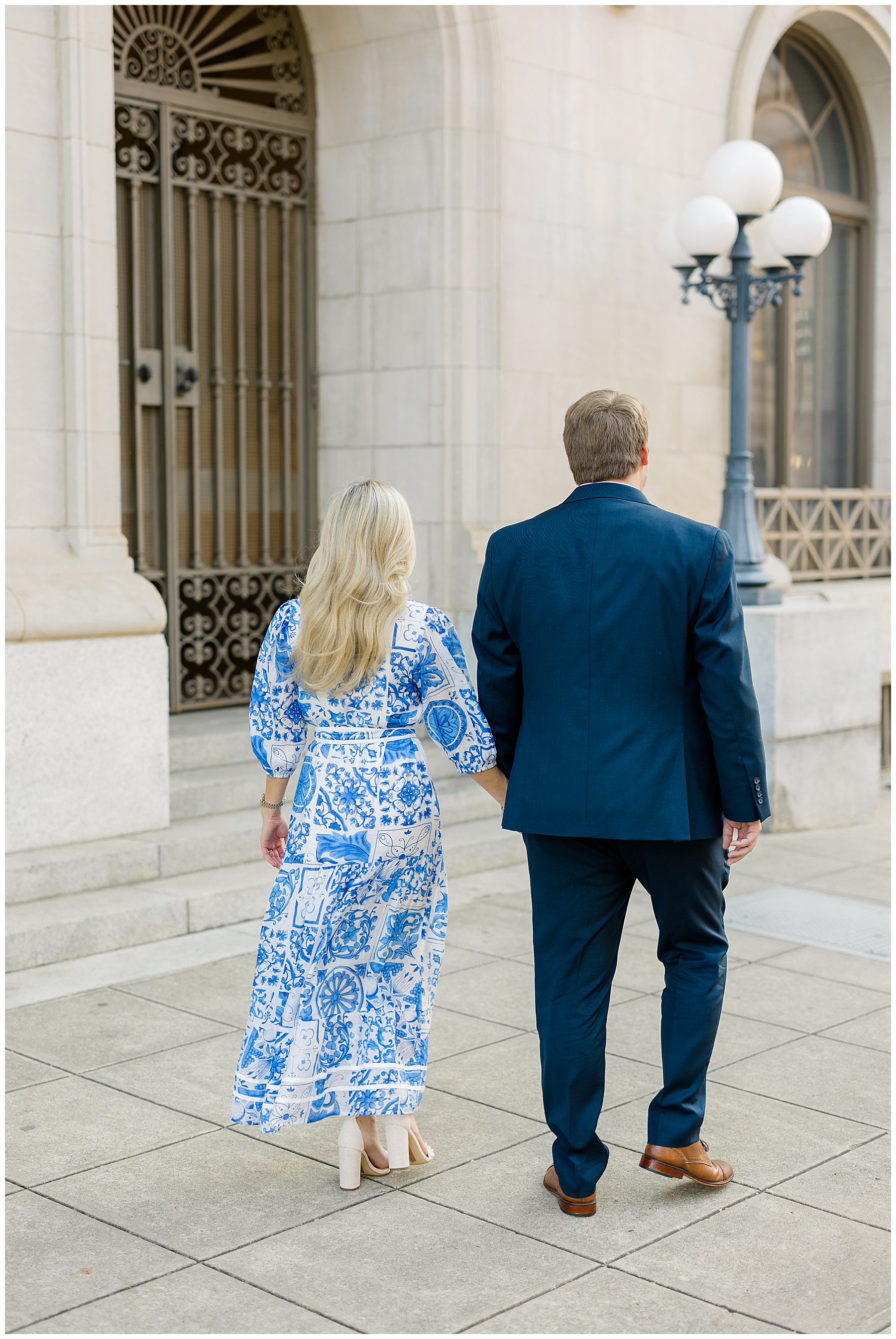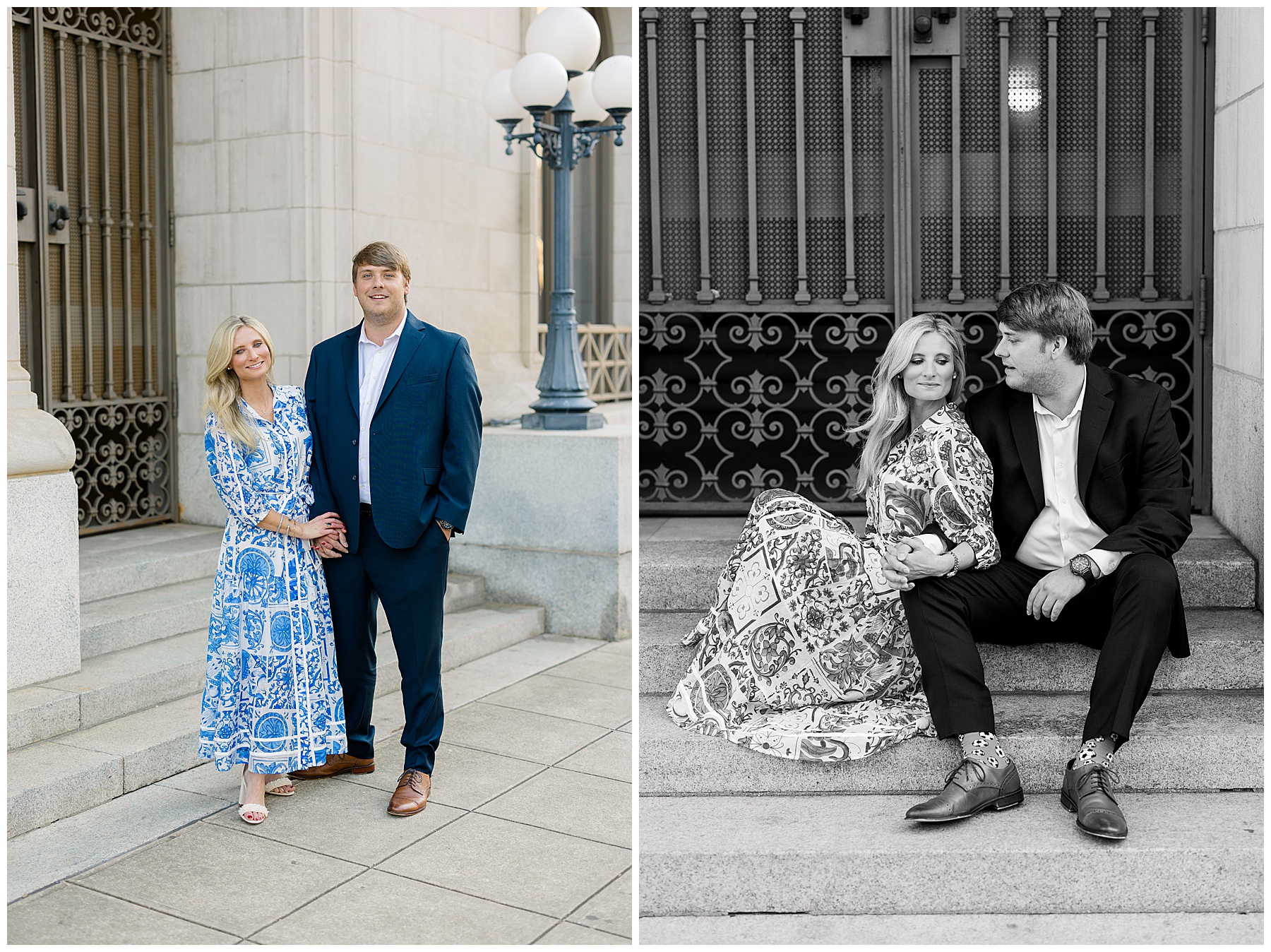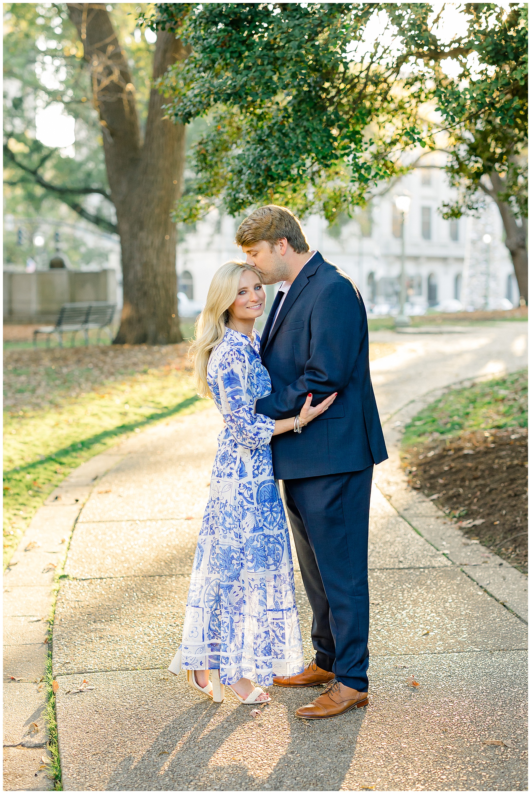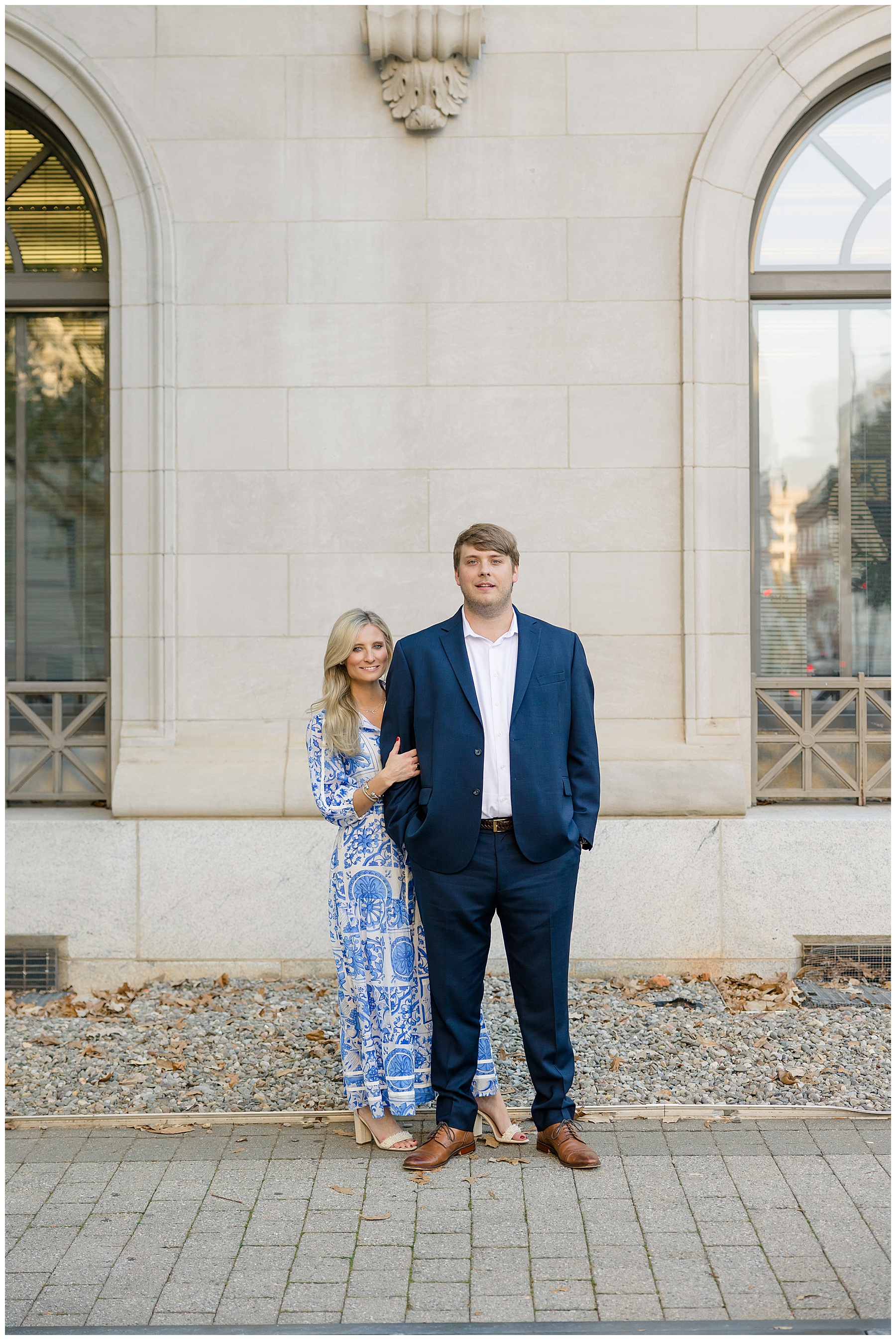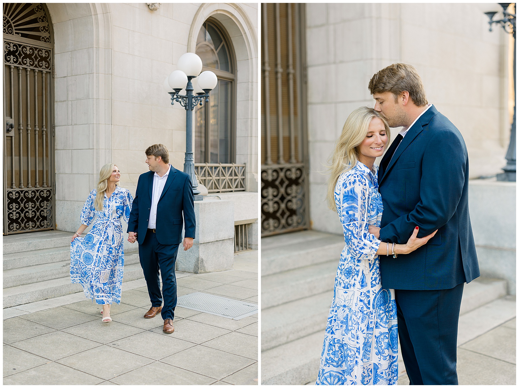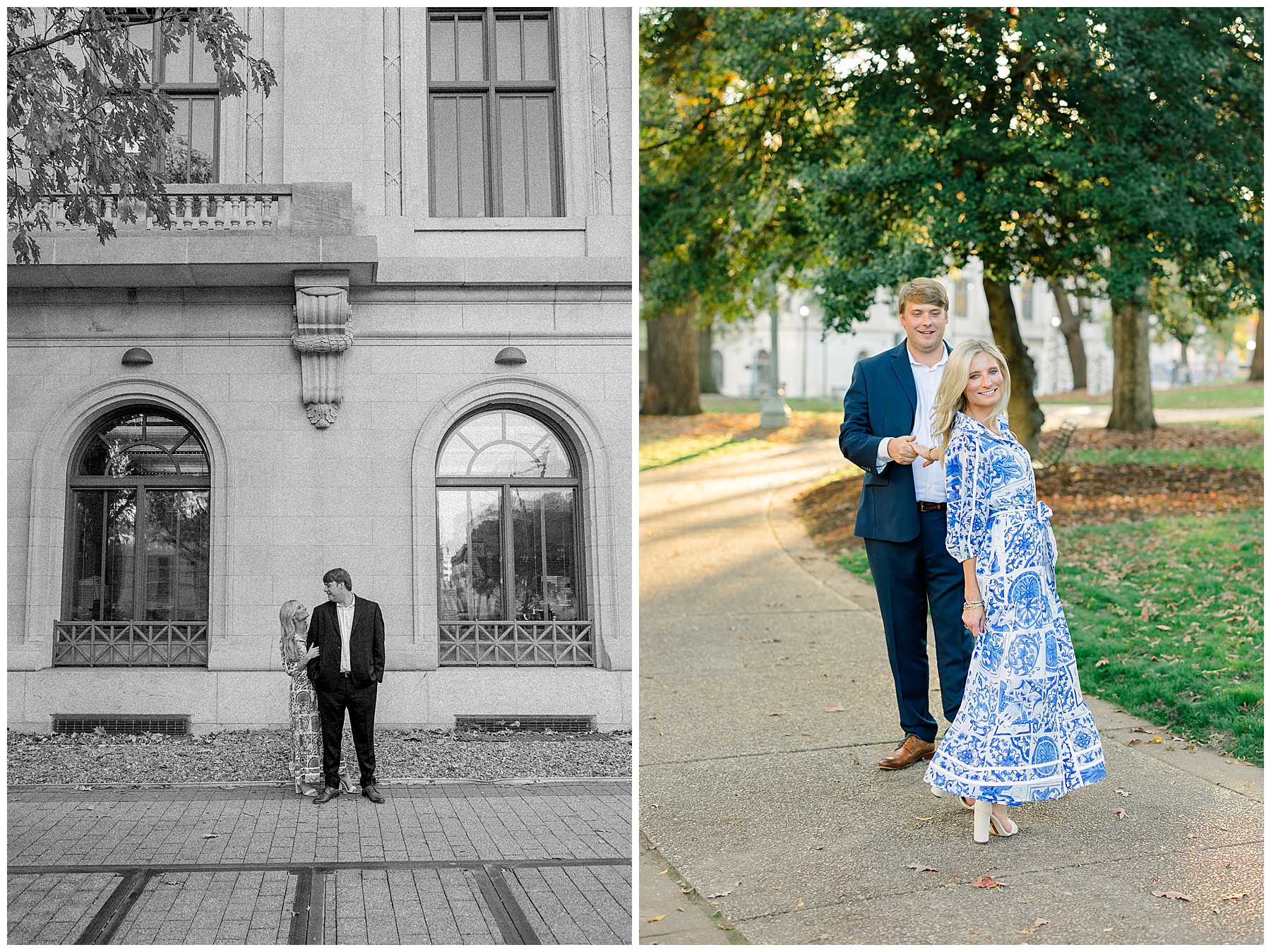 Baker & Robert showed up looking so stylish and I was pumped from the start! Baker’s blue & white dress was so unique, southern, and I loved the bow at the waist. Speaking of bows – check out her blue heels (that ROBERT bought her! Brownie points!!!) in her second outfit that she wore! They had the cutest bows on the back with little rhinestones! So pretty that these blue heels just might be my favorite engagement session shoes EVER!!!!! I also loved that Robert wore blue socks with soccer balls on them – a nod to his college soccer career! I love when couples choose such personal and intentional details to include for their sessions. :)
