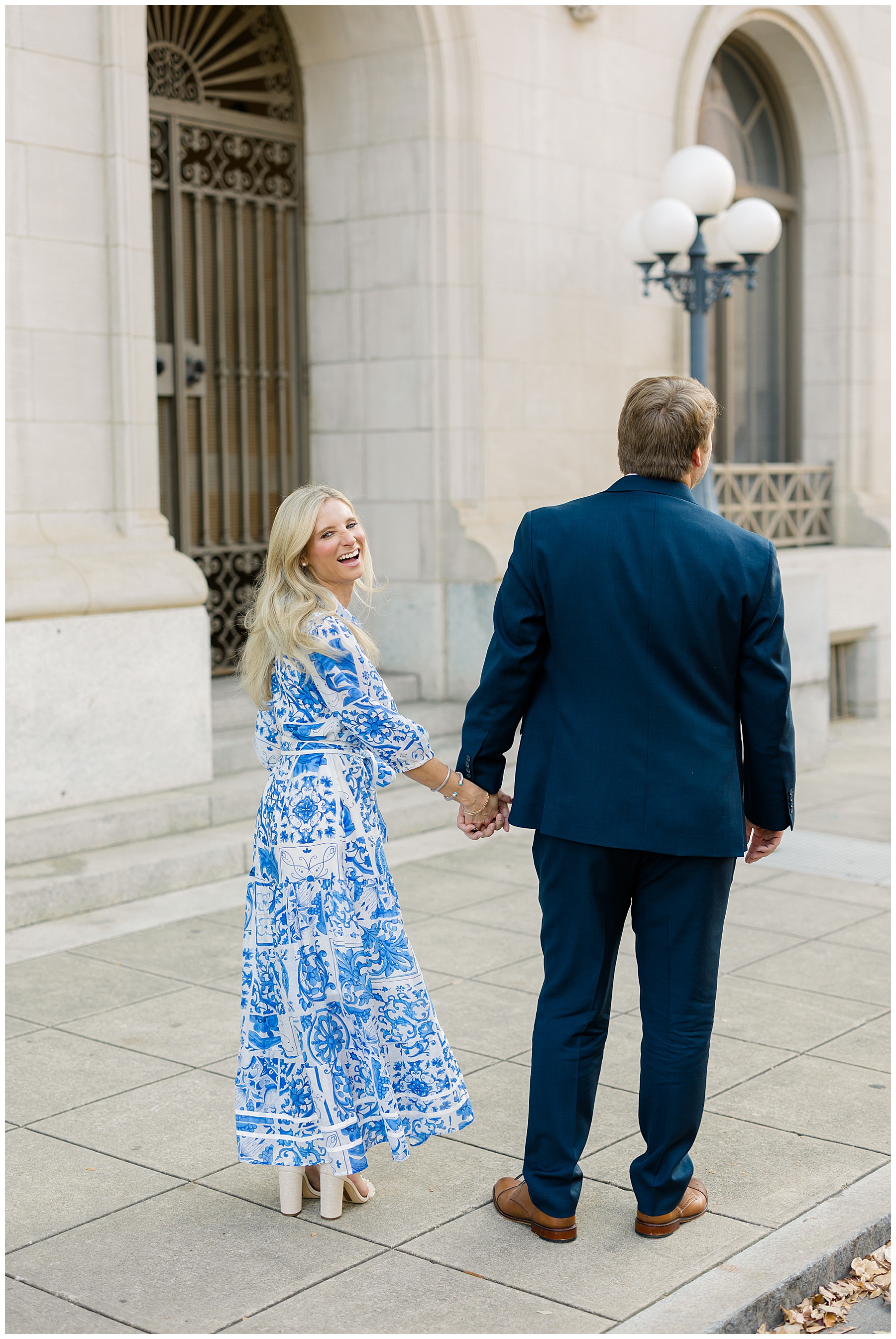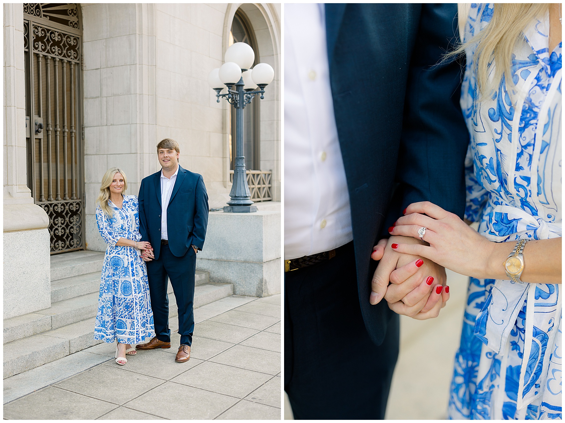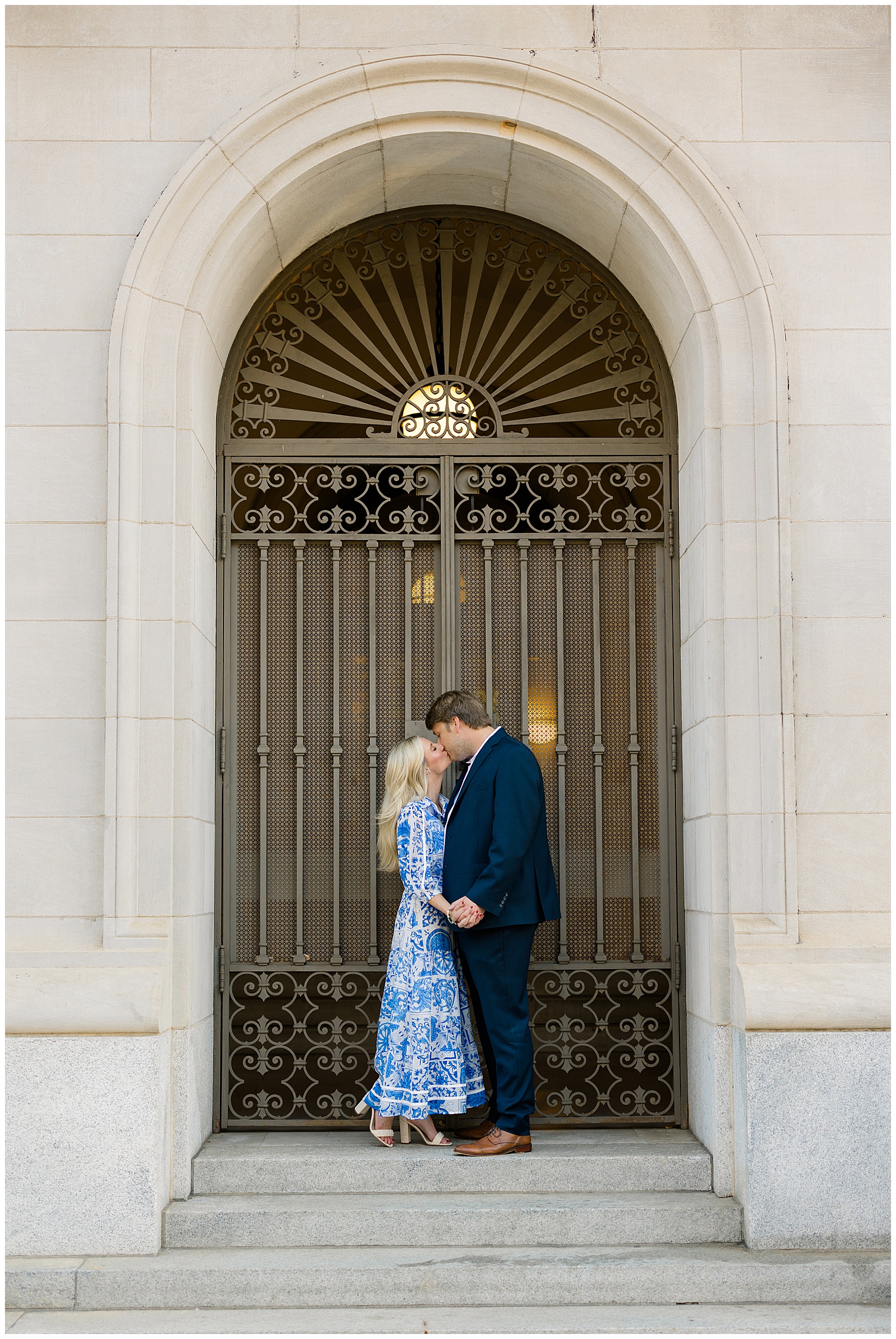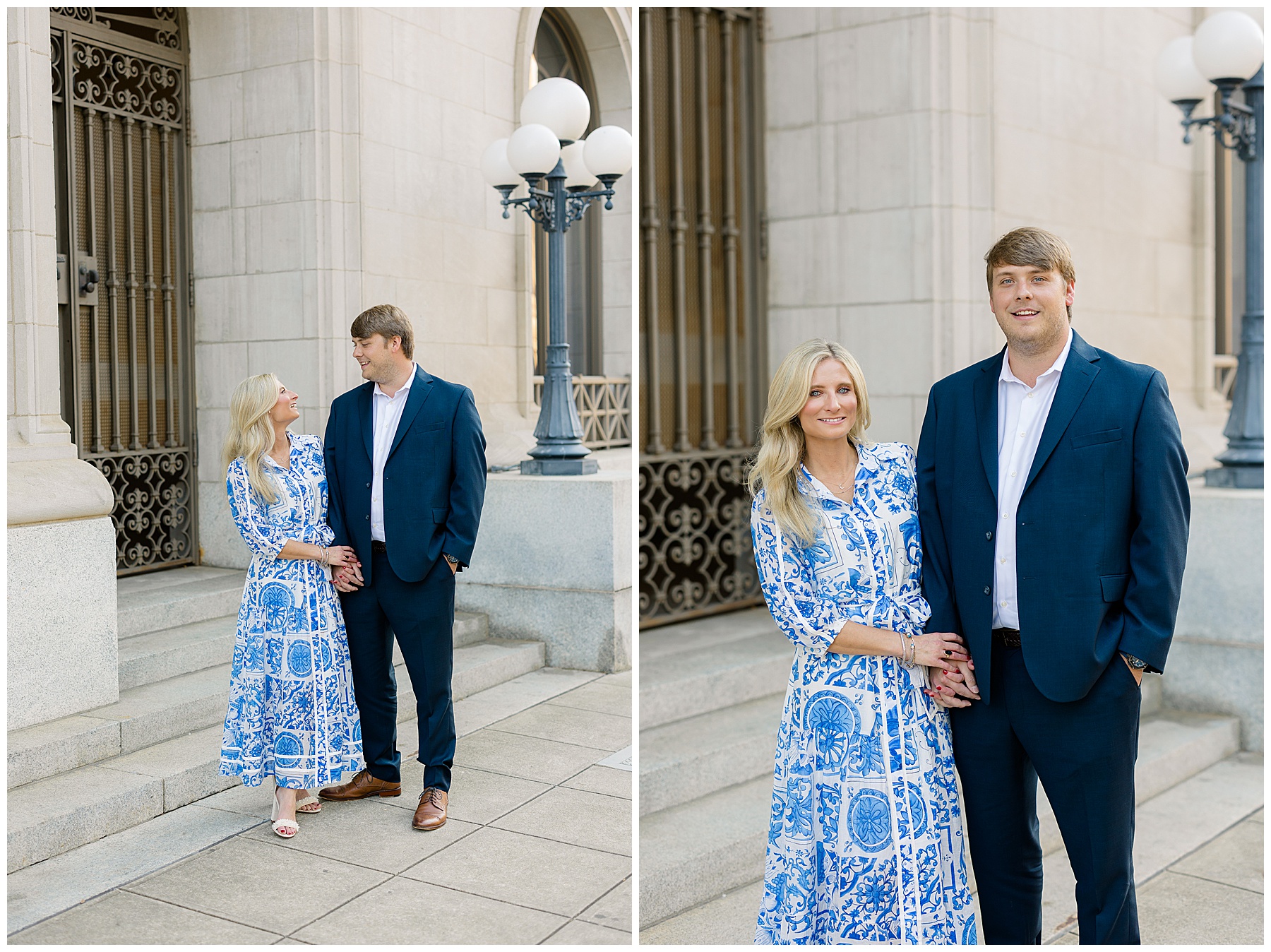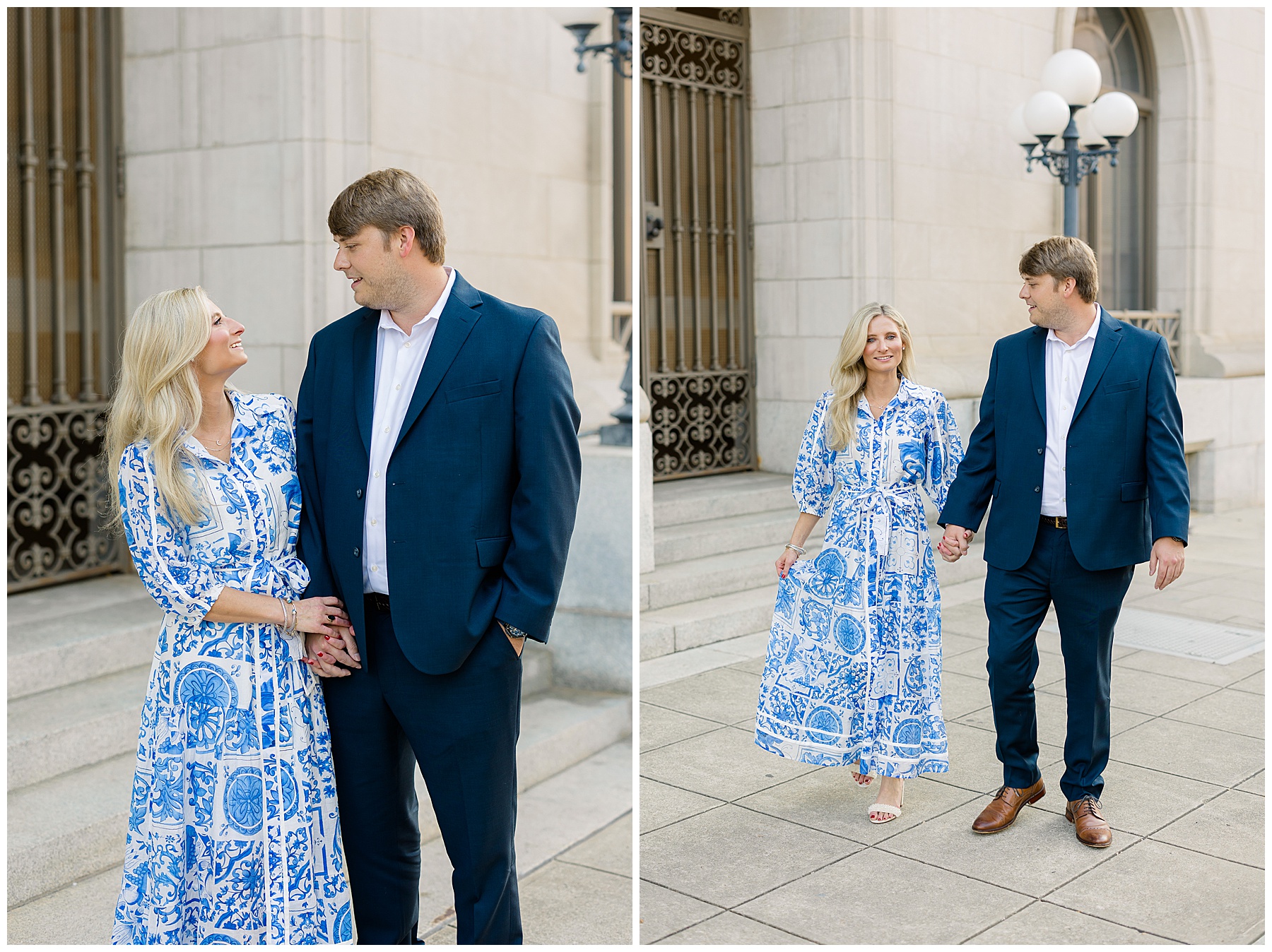 Baker & Robert showed up looking so stylish and I was pumped from the start! Baker’s blue & white dress was so unique, southern, and I loved the bow at the waist. Speaking of bows – check out her blue heels (that ROBERT bought her! Brownie points!!!) in her second outfit that she wore! They had the cutest bows on the back with little rhinestones! So pretty that these blue heels just might be my favorite engagement session shoes EVER!!!!! I also loved that Robert wore blue socks with soccer balls on them – a nod to his college soccer career! I love when couples choose such personal and intentional details to include for their sessions. :)