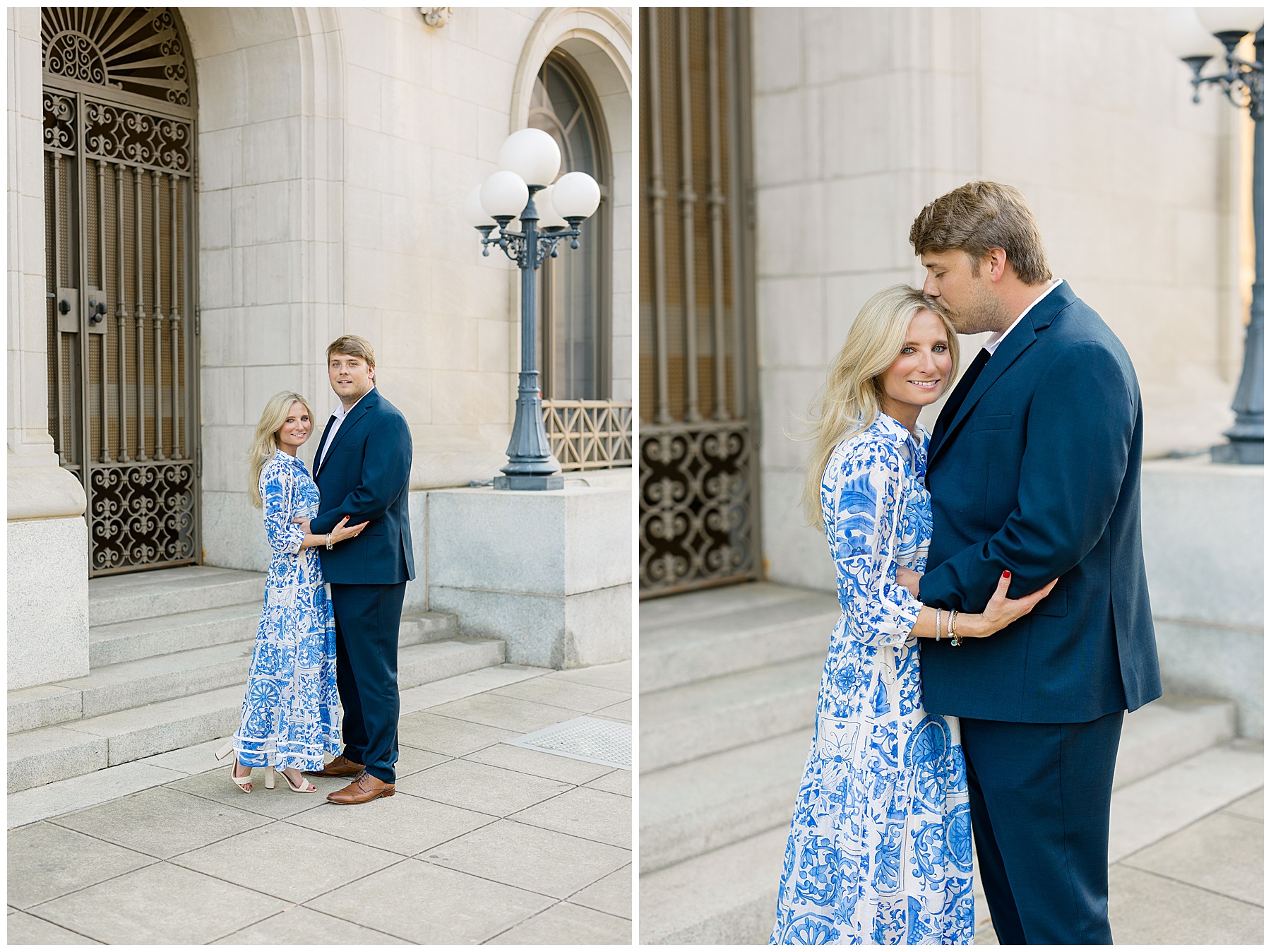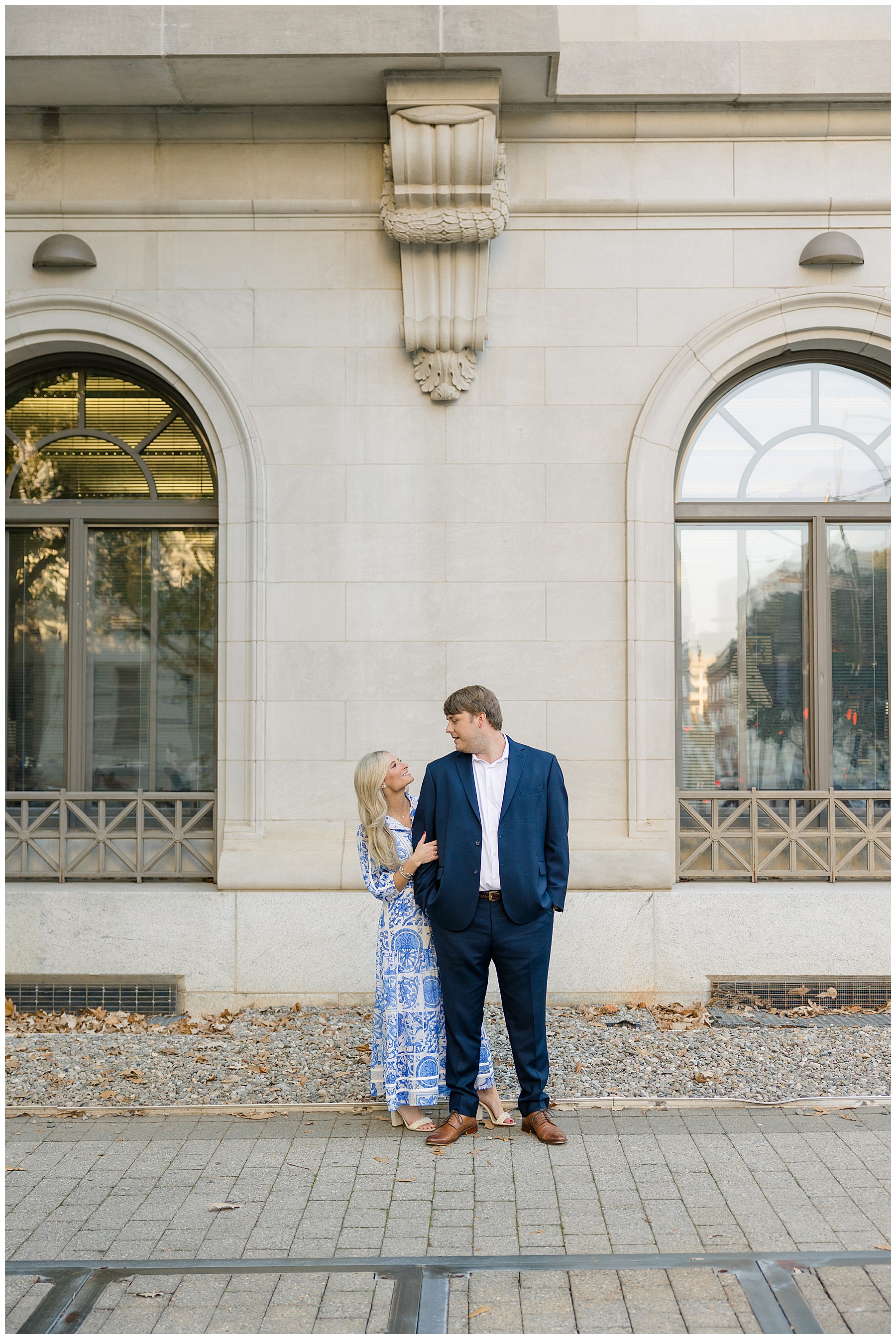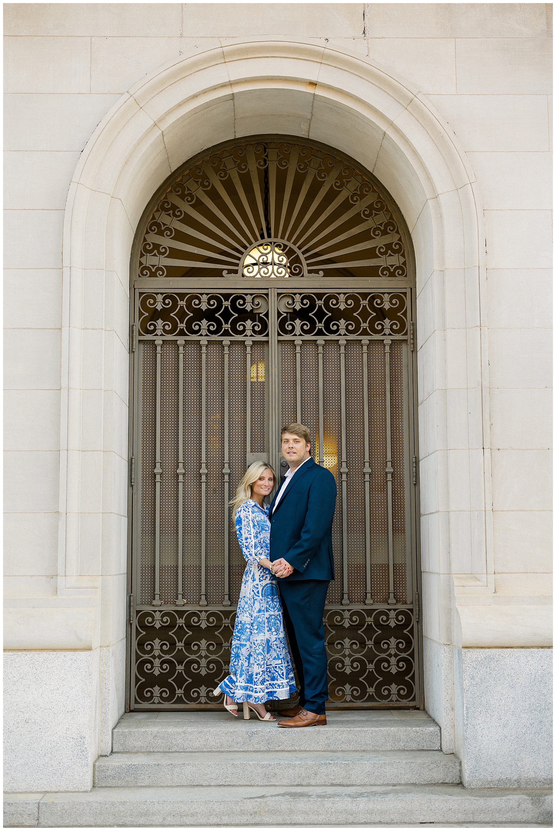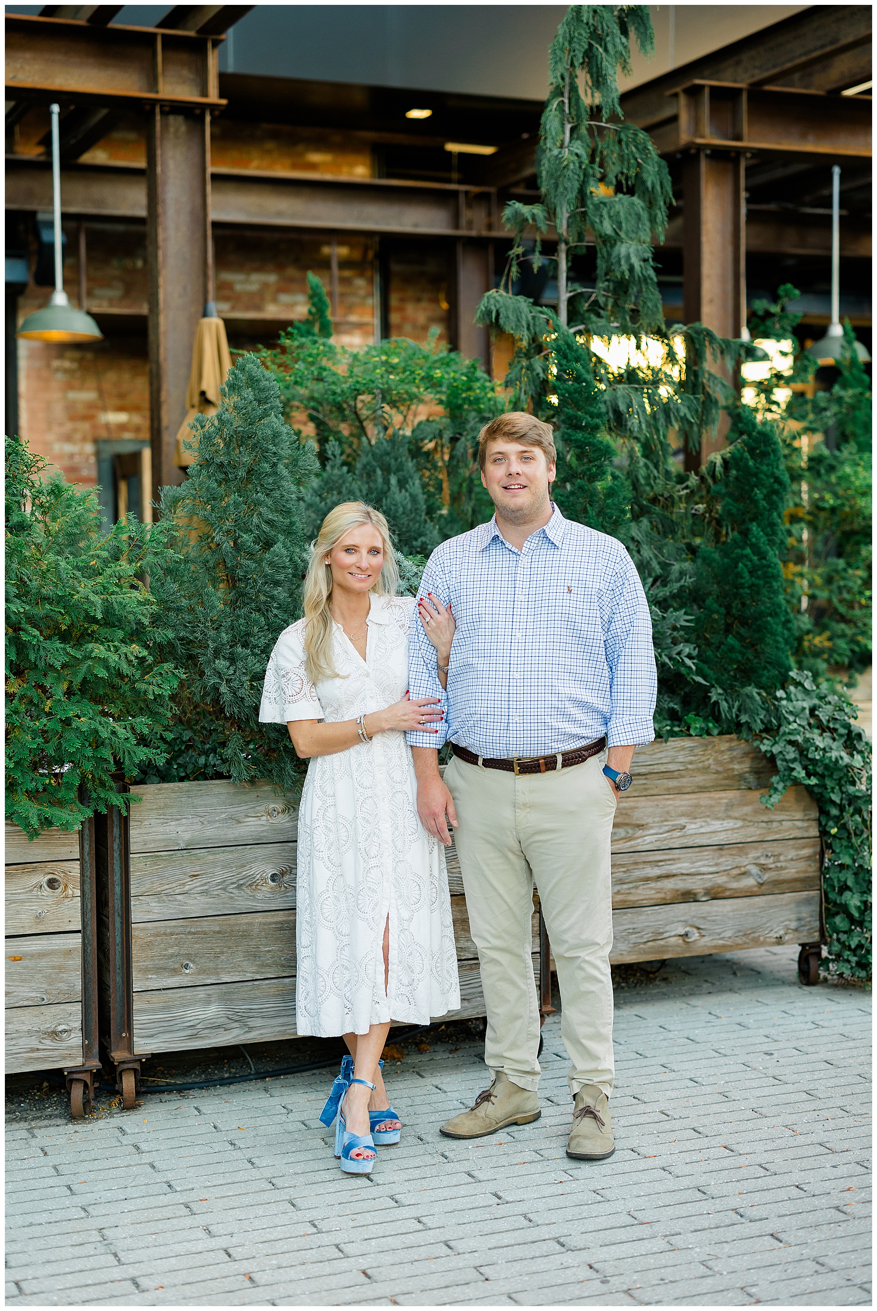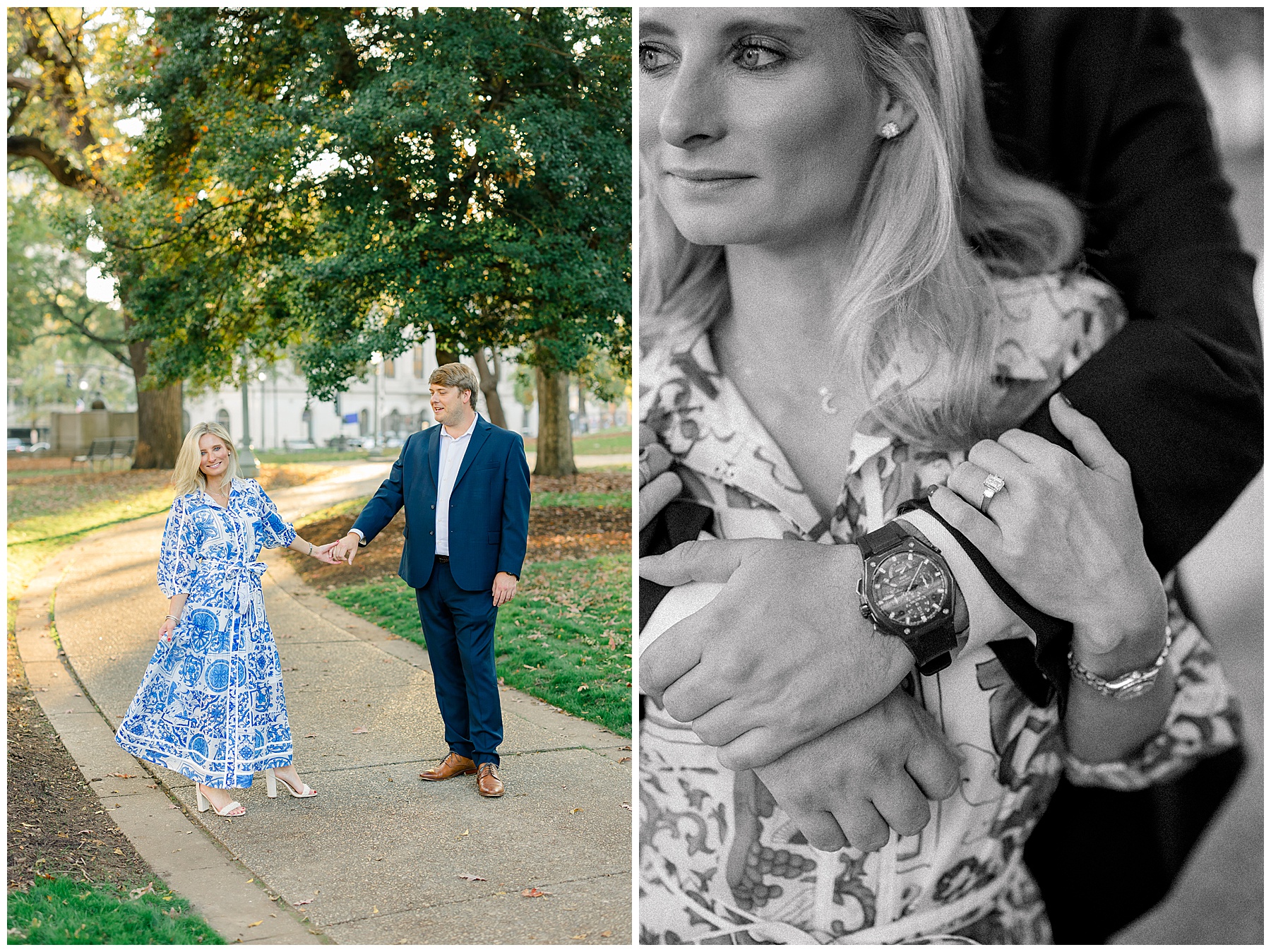 Baker & Robert showed up looking so stylish and I was pumped from the start! Baker’s blue & white dress was so unique, southern, and I loved the bow at the waist. Speaking of bows – check out her blue heels (that ROBERT bought her! Brownie points!!!) in her second outfit that she wore! They had the cutest bows on the back with little rhinestones! So pretty that these blue heels just might be my favorite engagement session shoes EVER!!!!! I also loved that Robert wore blue socks with soccer balls on them – a nod to his college soccer career! I love when couples choose such personal and intentional details to include for their sessions. :)