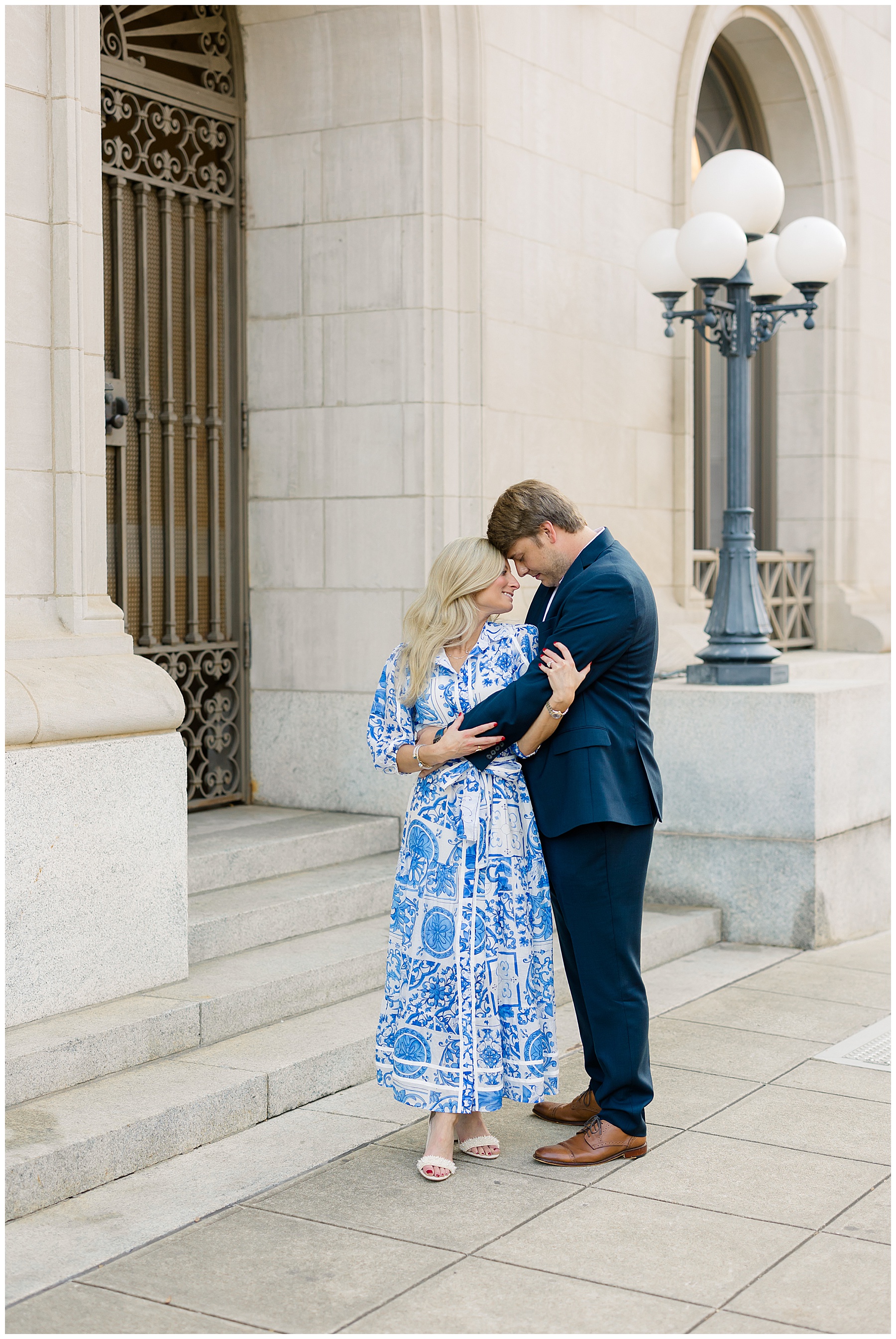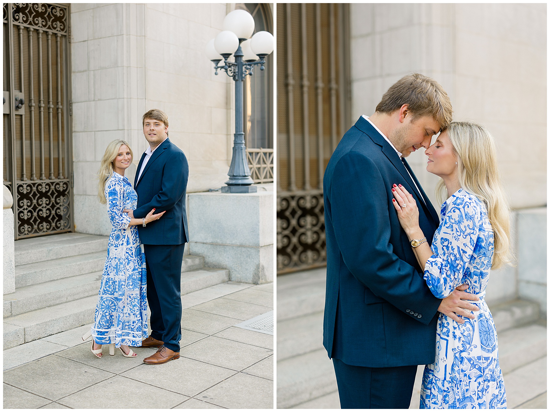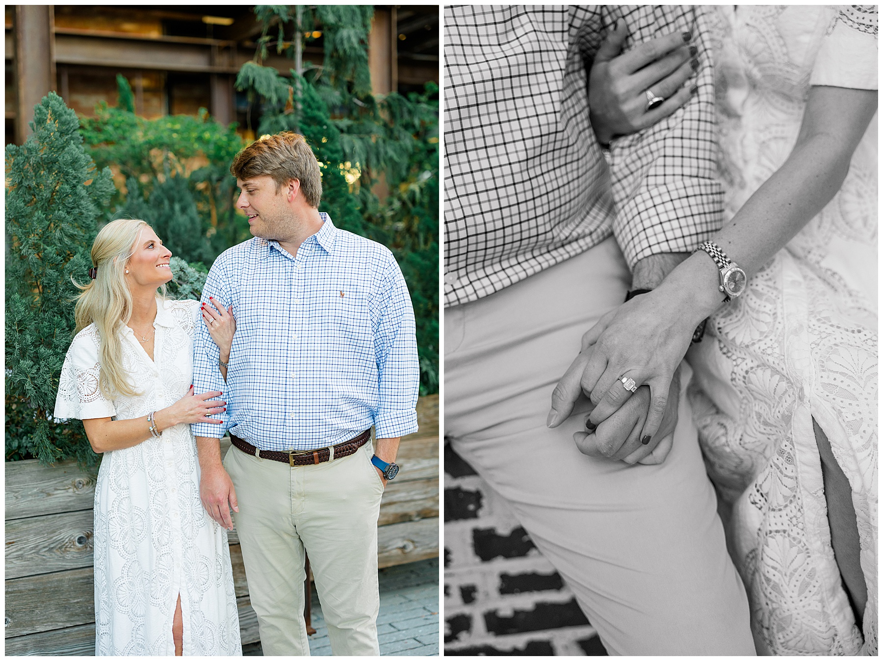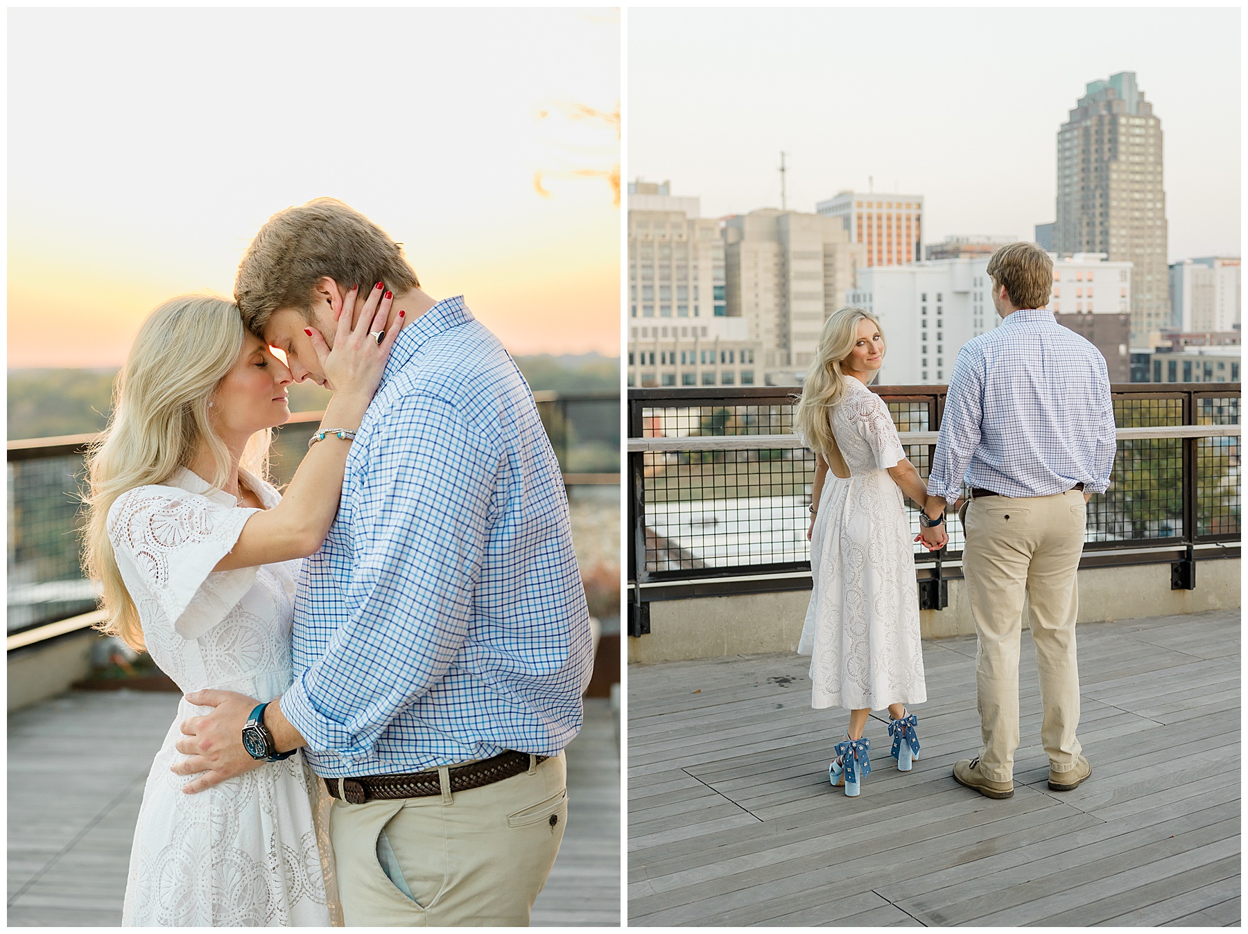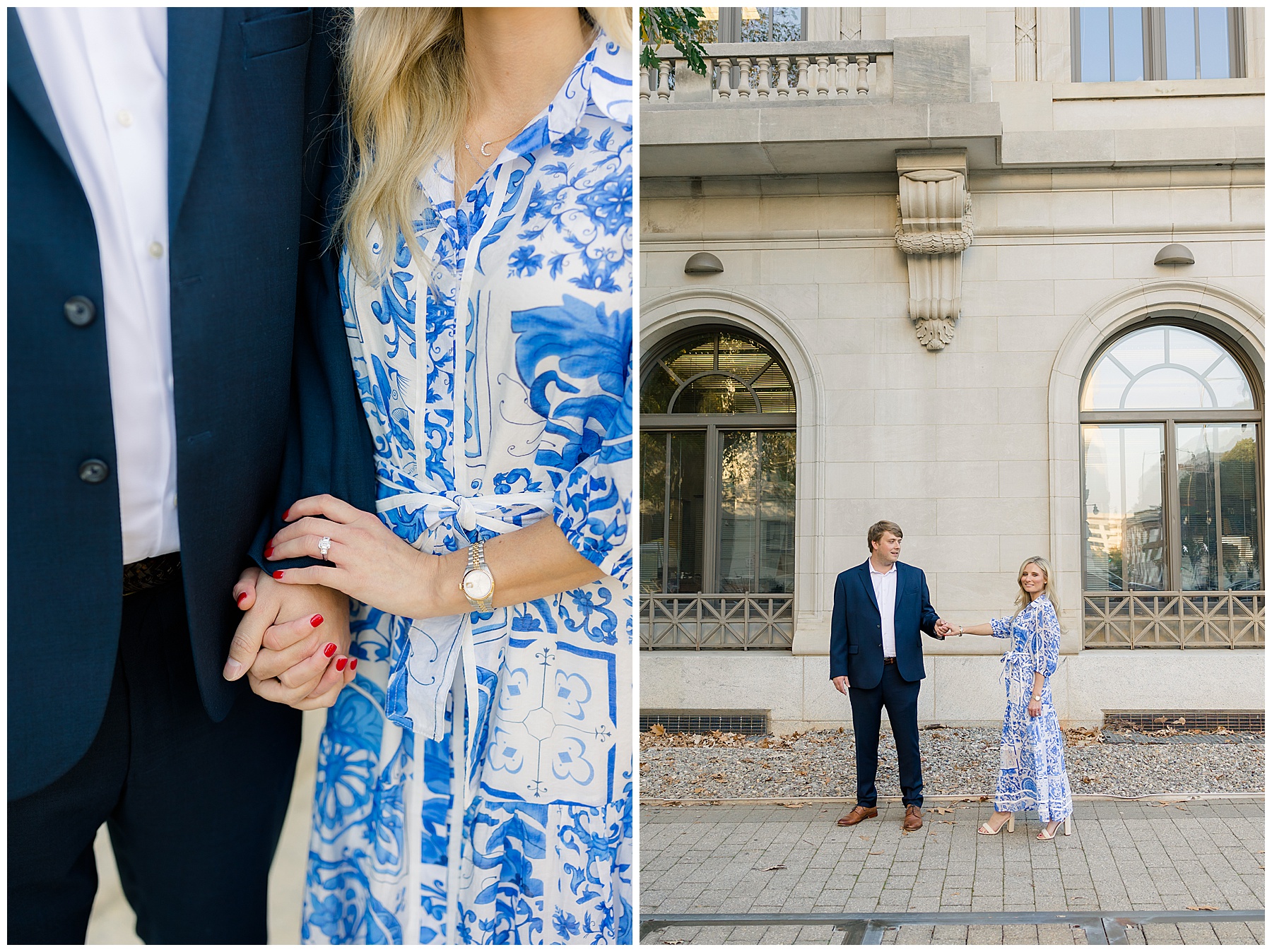 Baker & Robert showed up looking so stylish and I was pumped from the start! Baker’s blue & white dress was so unique, southern, and I loved the bow at the waist. Speaking of bows – check out her blue heels (that ROBERT bought her! Brownie points!!!) in her second outfit that she wore! They had the cutest bows on the back with little rhinestones! So pretty that these blue heels just might be my favorite engagement session shoes EVER!!!!! I also loved that Robert wore blue socks with soccer balls on them – a nod to his college soccer career! I love when couples choose such personal and intentional details to include for their sessions. :)
