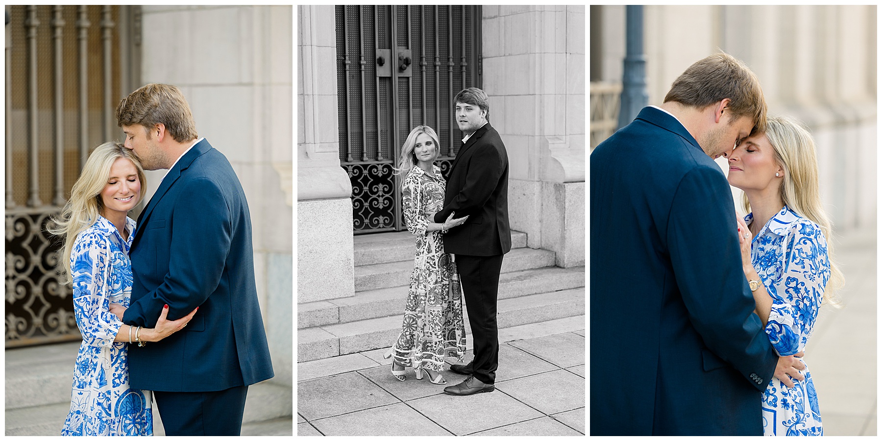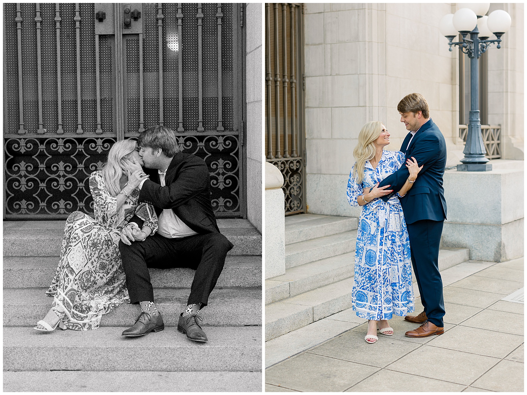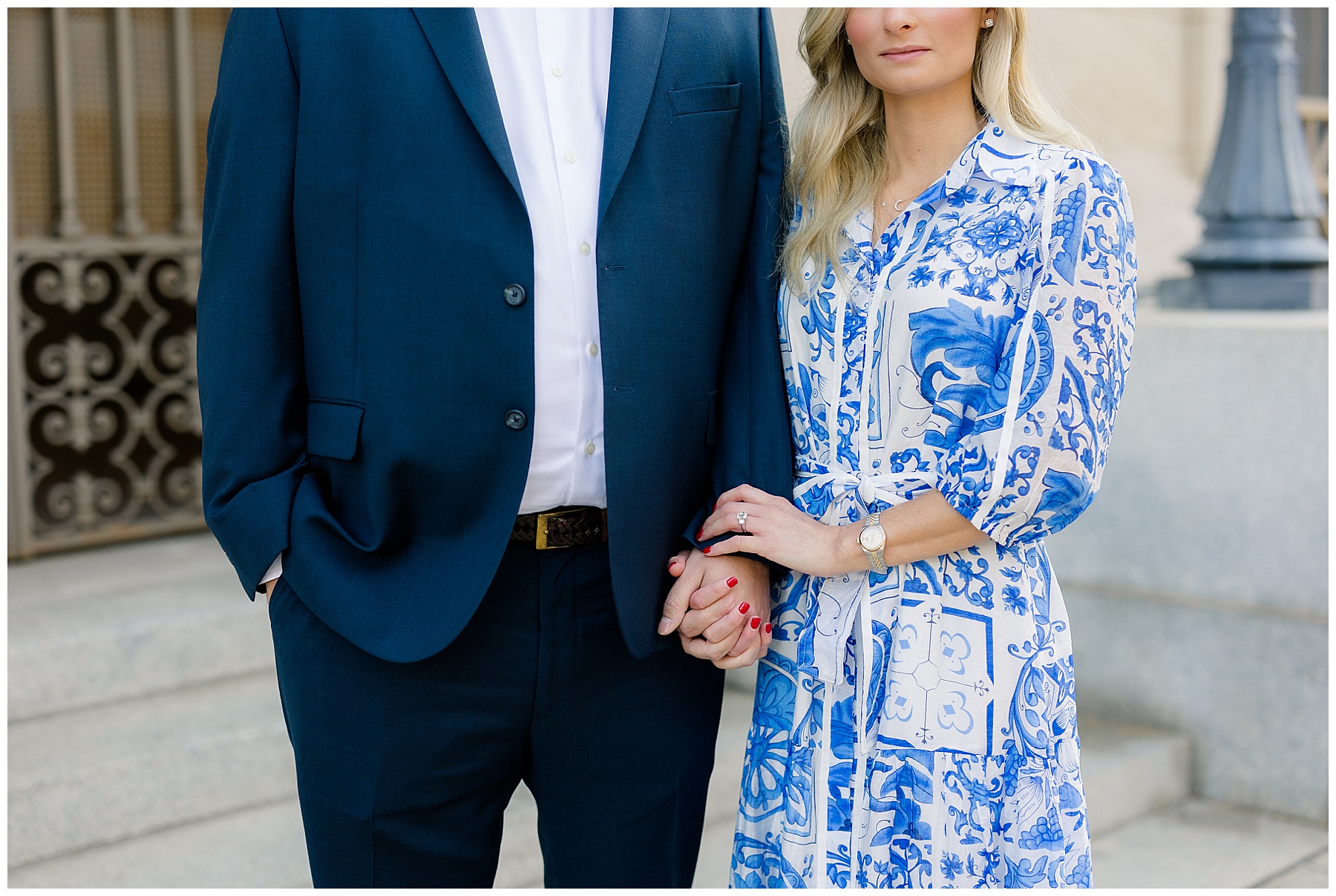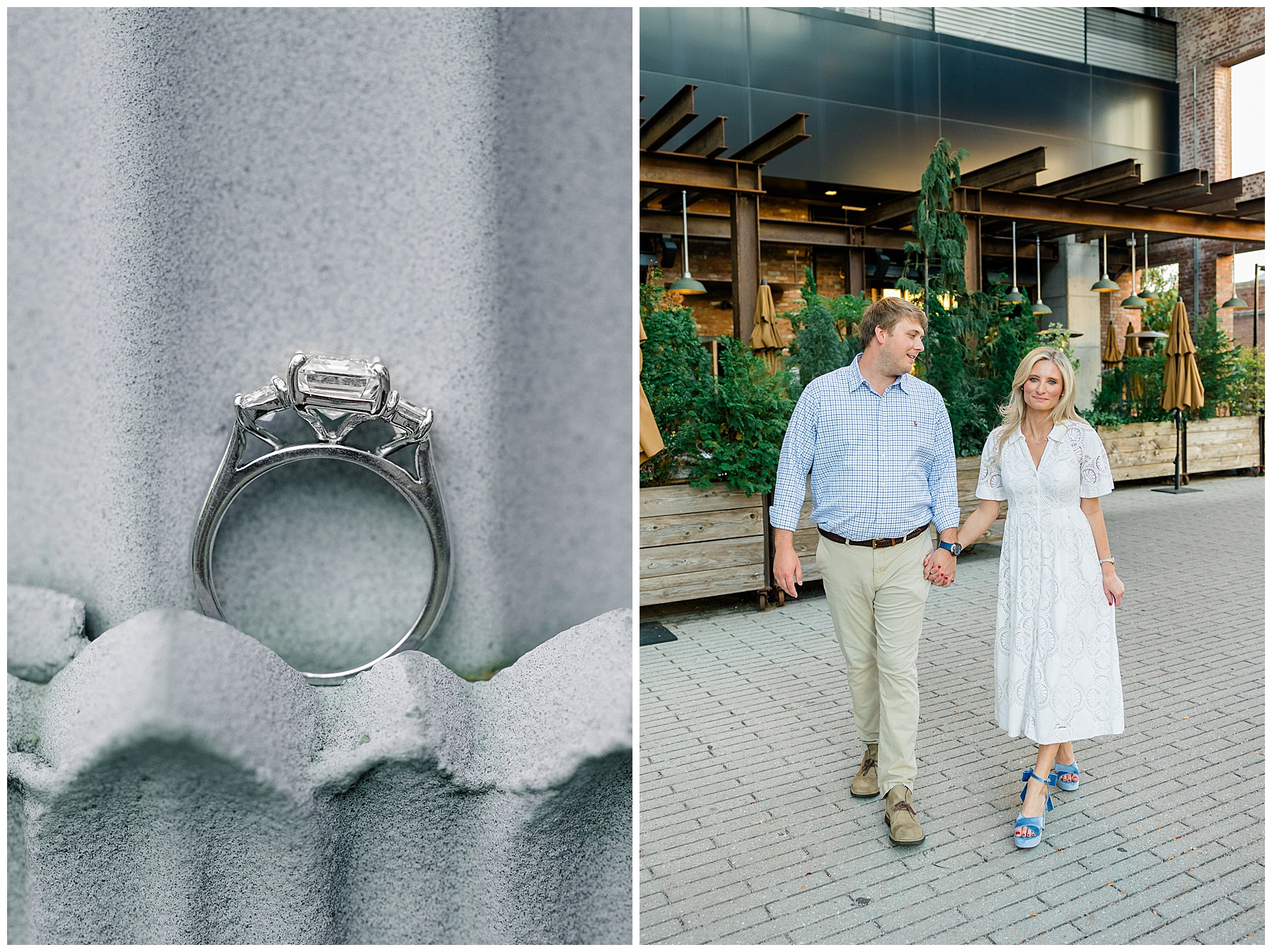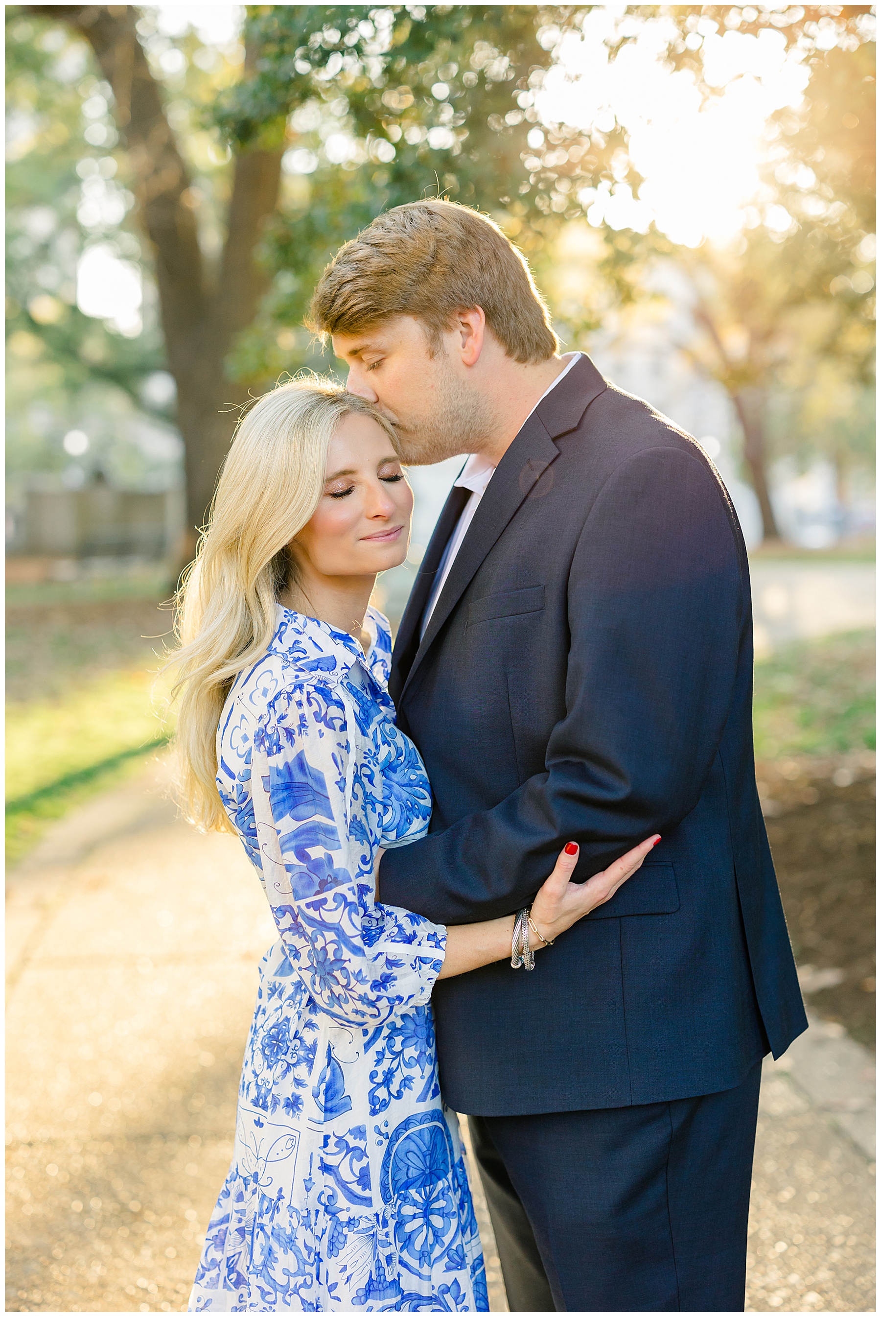 Baker & Robert showed up looking so stylish and I was pumped from the start! Baker’s blue & white dress was so unique, southern, and I loved the bow at the waist. Speaking of bows – check out her blue heels (that ROBERT bought her! Brownie points!!!) in her second outfit that she wore! They had the cutest bows on the back with little rhinestones! So pretty that these blue heels just might be my favorite engagement session shoes EVER!!!!! I also loved that Robert wore blue socks with soccer balls on them – a nod to his college soccer career! I love when couples choose such personal and intentional details to include for their sessions. :)