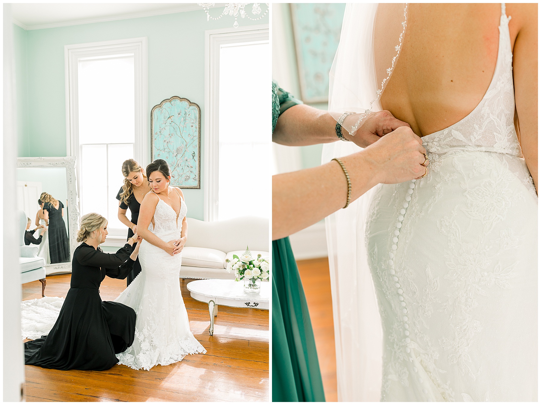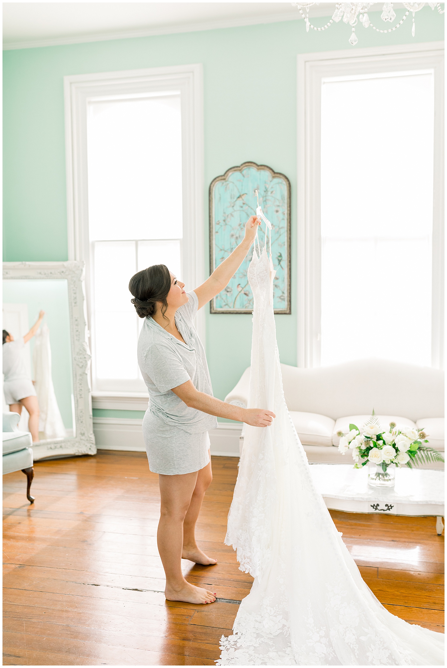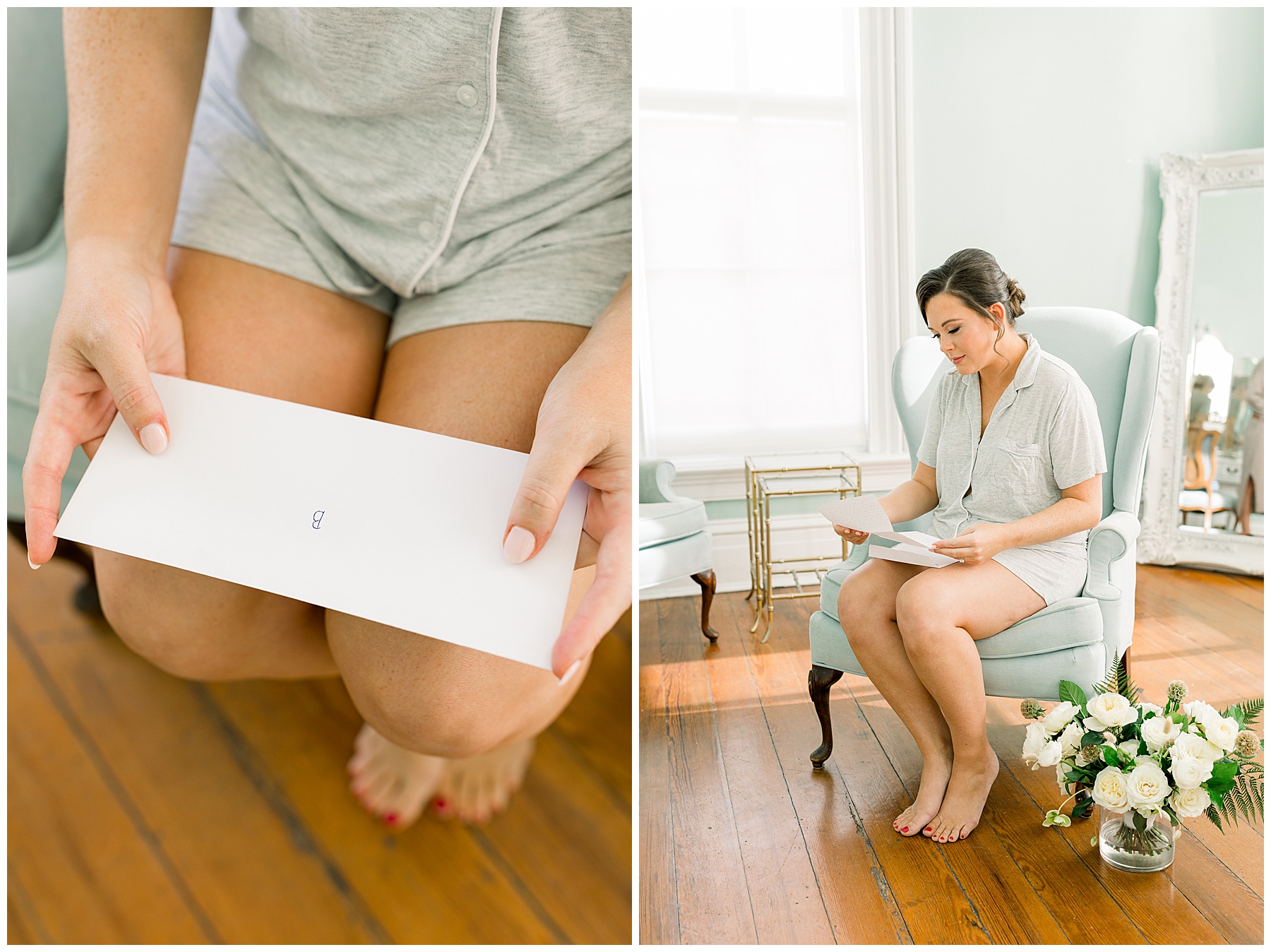 We arrived to Merrimon and all the girls were enjoying getting glam by WINK! Beverly is so thoughtful that she was sitting in her bridal PJs writing THANK YOU NOTES to people. What most people didn’t know was that her dad was sent to the hospital the night before – and wouldn’t be able to make it to Beverly’s wedding day. The worst news, yet here Beverly was – holding it together and thinking of OTHERS during that moment.