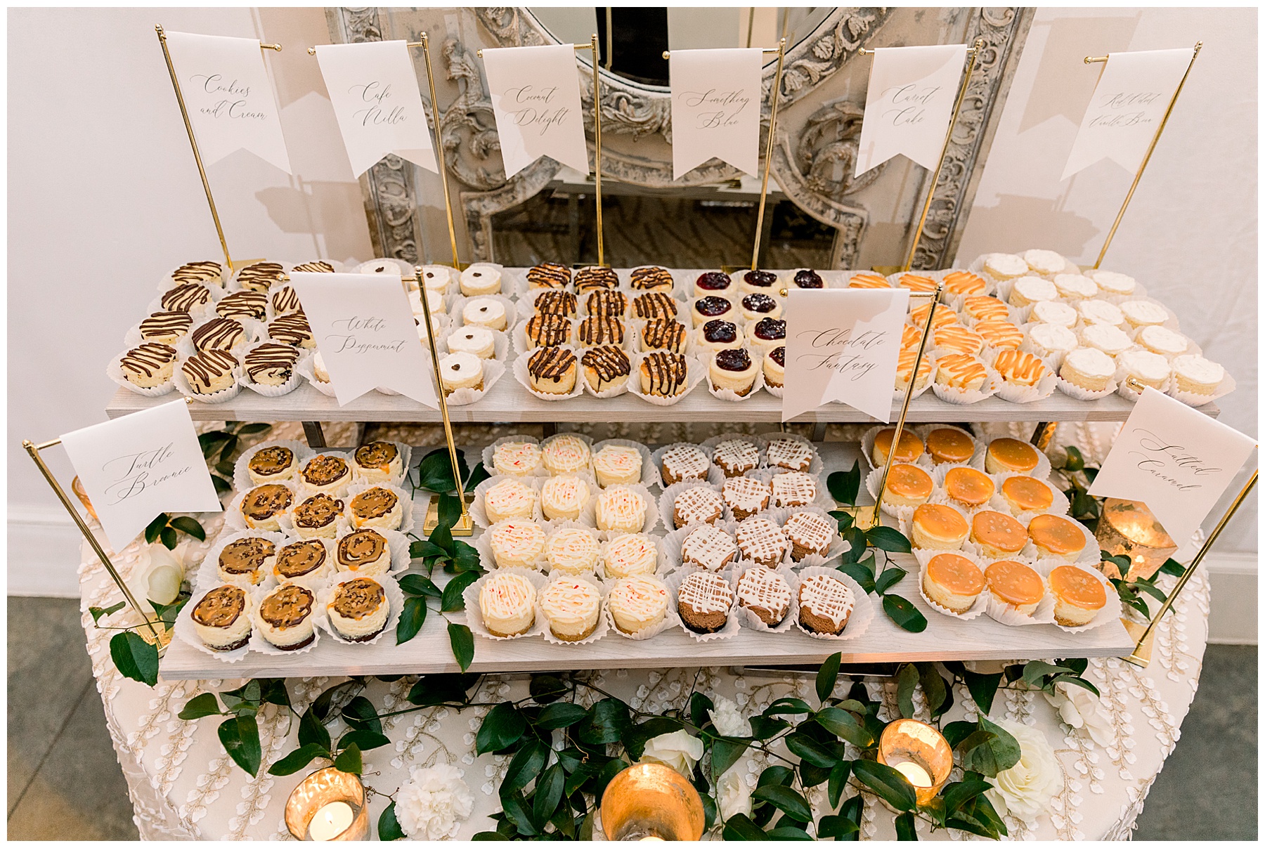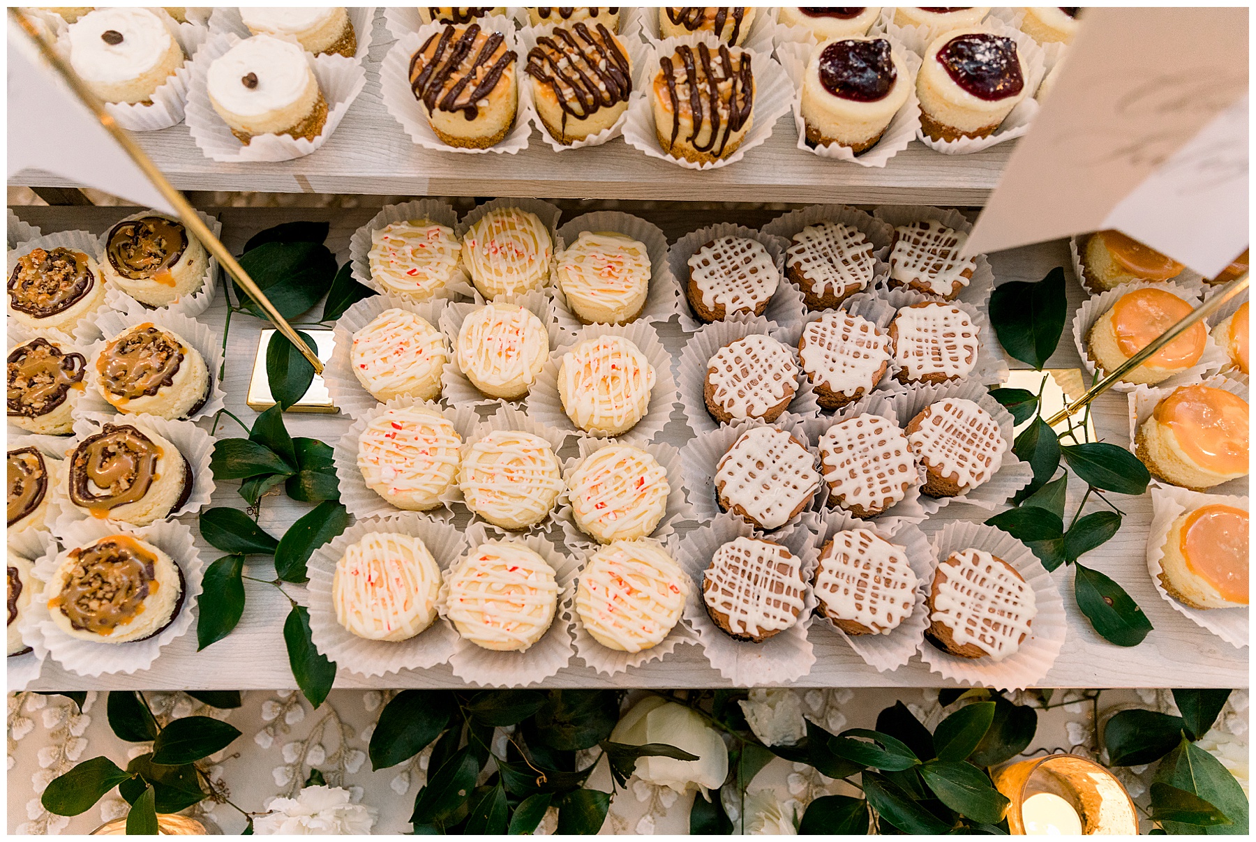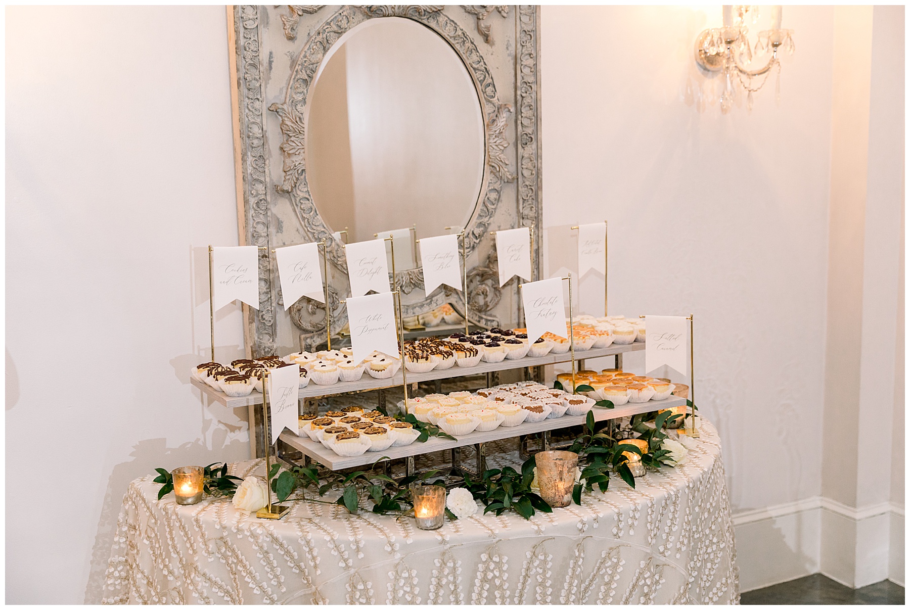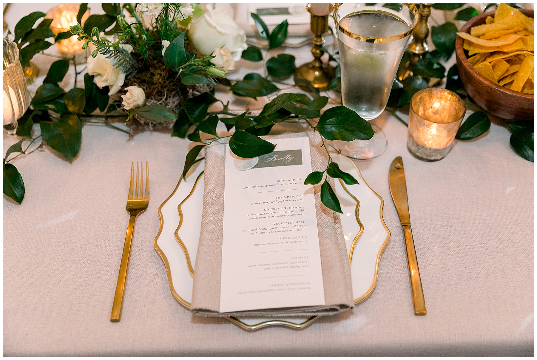 Beverly & Jarred were able to join cocktail hour, and greet all their guests as they entered into the reception. The reception kicked off with first dances – and since Beverly’s dad wasn’t there – she took turns dancing with her 4 brothers. Not a dry eye was in that reception I can promise you. They treated their guests to a Mexican dinner (chips, guac, and salsa ON the tables for guests! EPIC!!!!) and even asked to make sure we had eaten. (Soooo thoughtful!) Their custom drink was a “Tuckerita” (a marg named after their sweet pup Tucker!)  and they had tons of mini cheesecake flavors for guests to choose from as dessert!