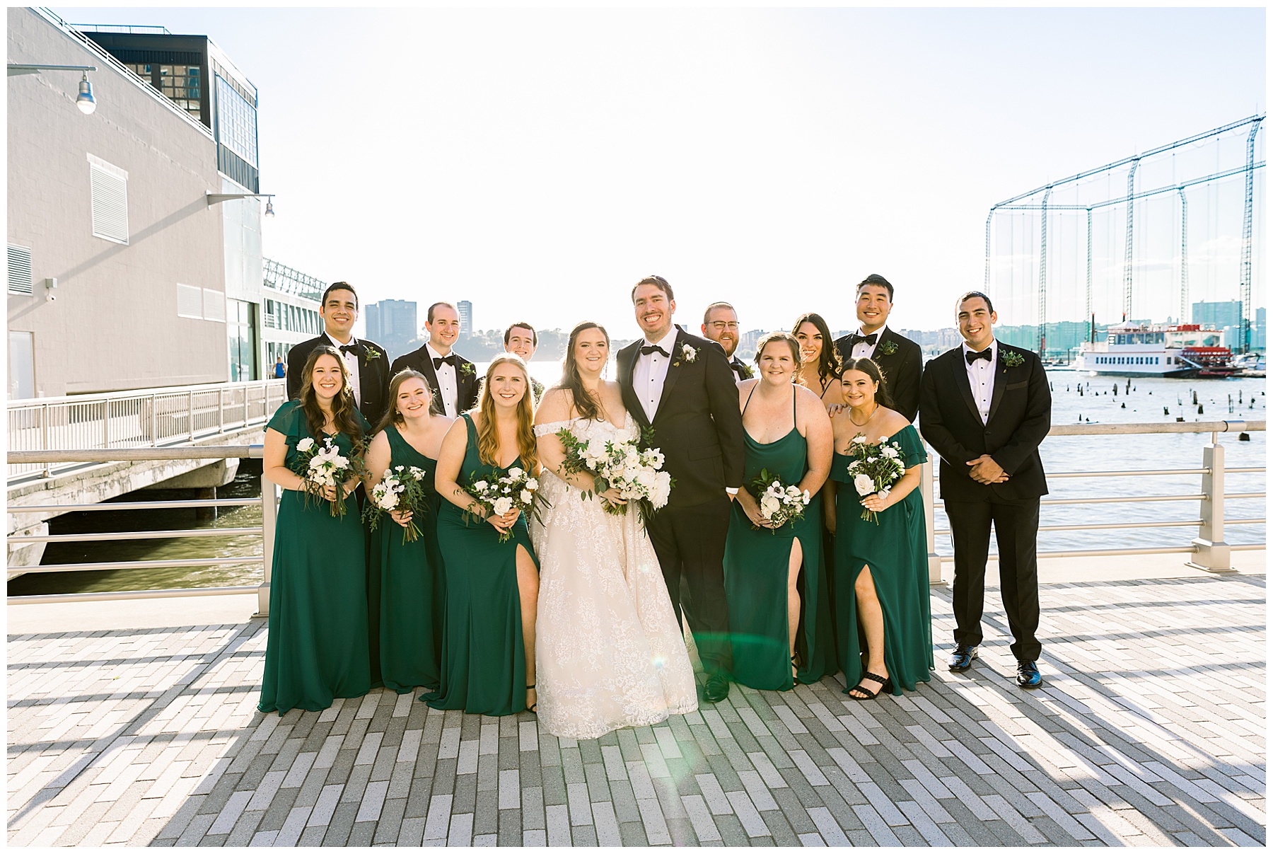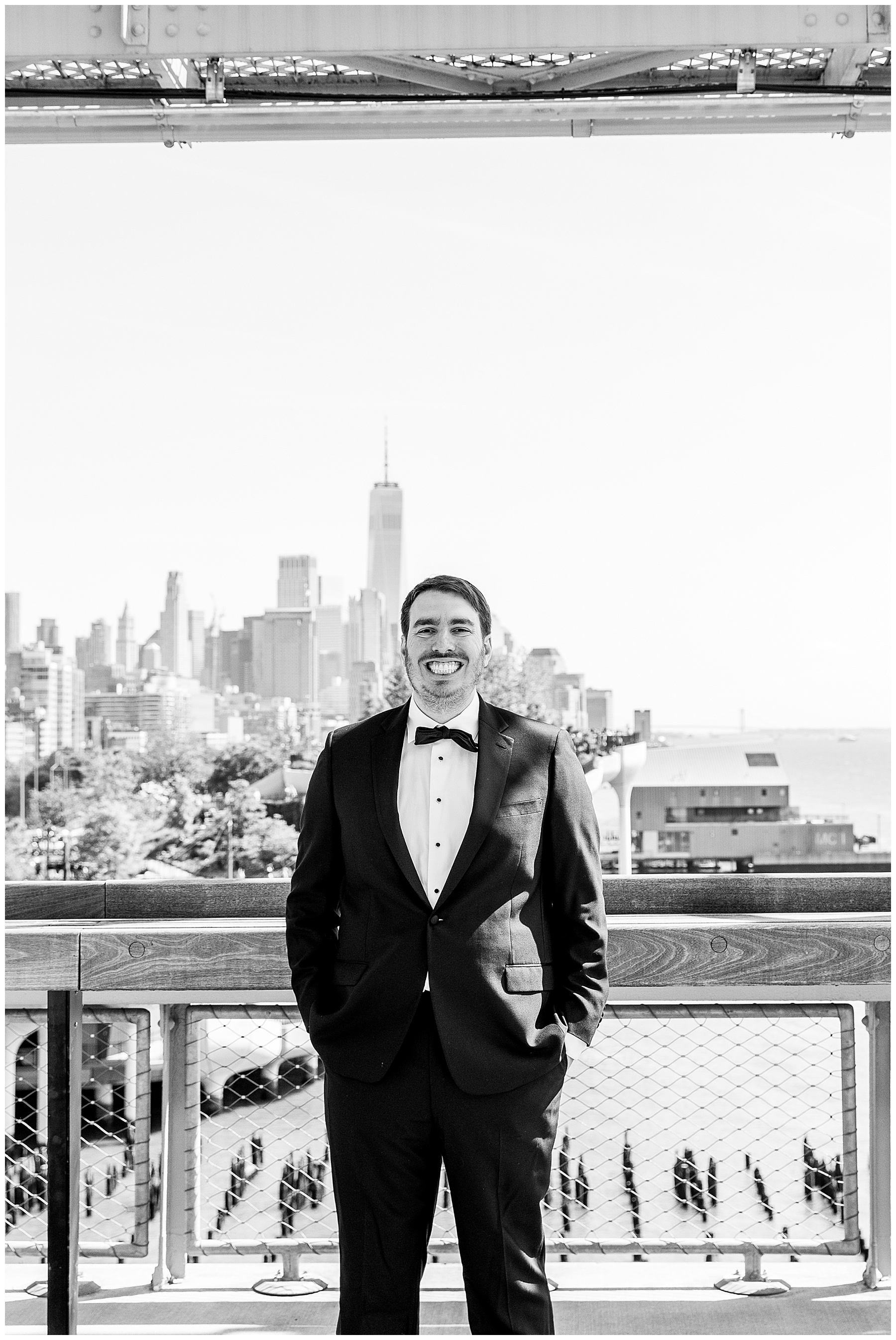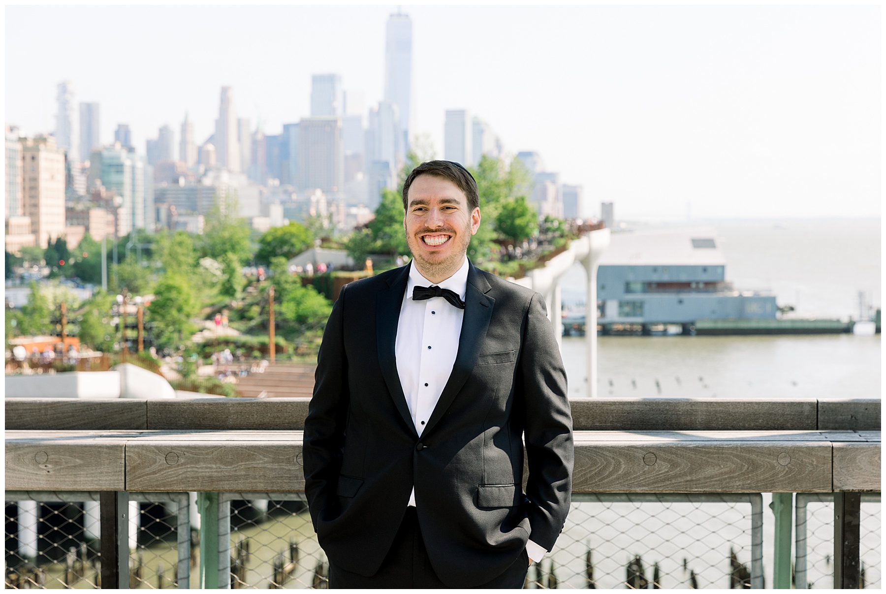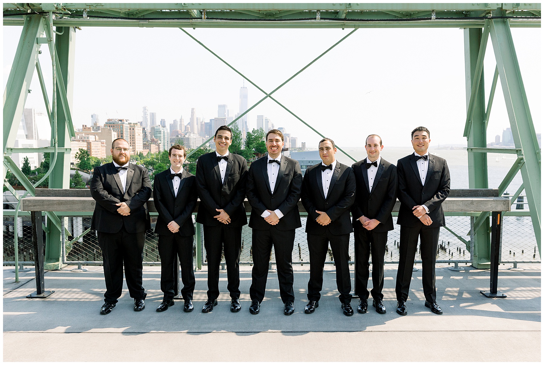 As they exited the ceremony to go upstairs for their ketubah signing, we got some of my FAVORITE portraits of the whole day as they went upstairs against the iconic wine bottle wall! I just LOVE how those turned out! After the ketubah signing, we went outside to photograph all their portraits with the beautiful Hudson River behind them. It was a really hot day in the sun, so Carleigh & Ian were great sports to sweat it out with us! (Especially because Carleigh’s dress literally weighs 30 pounds!) We were so fortunate to find a spot without tourists in the background, with such a cool view for their photos! LOVED it!!! (Plus they got congratulated like 198652 times by people walking by – so fun!)