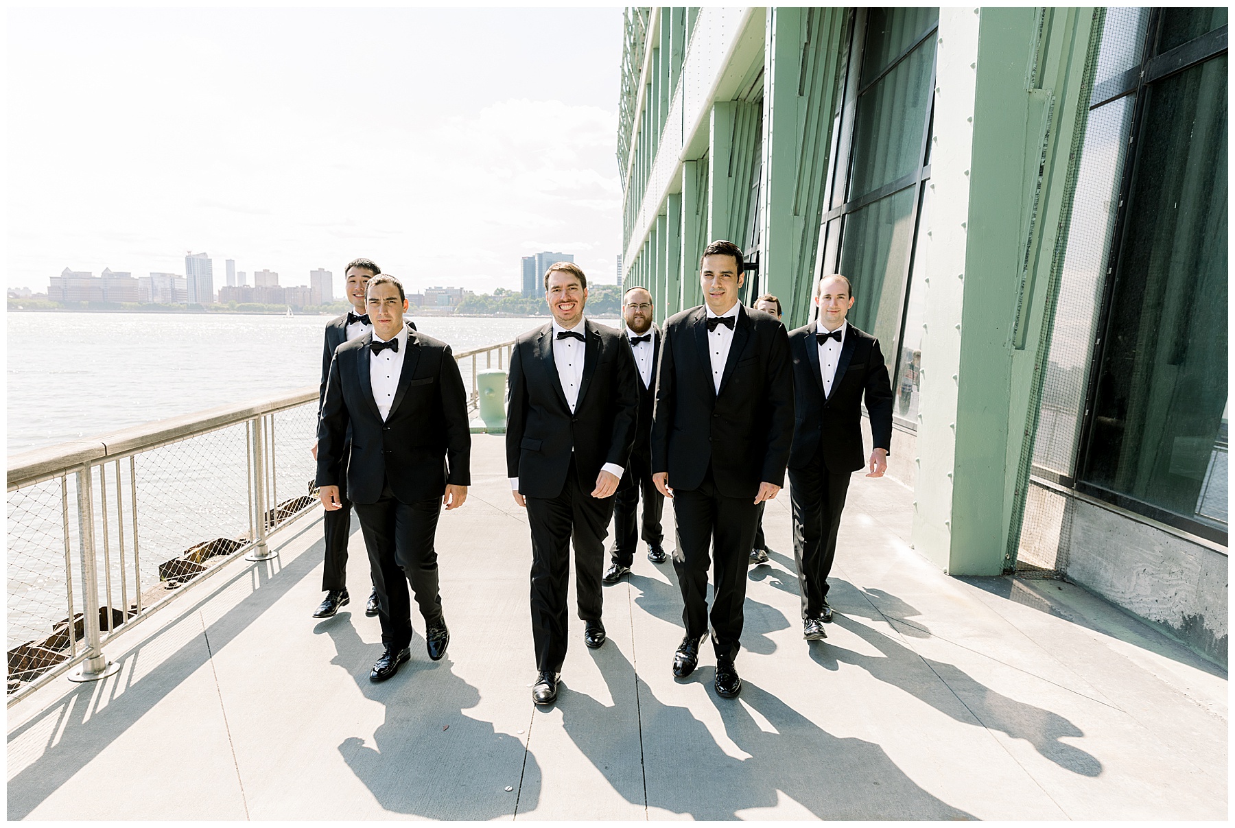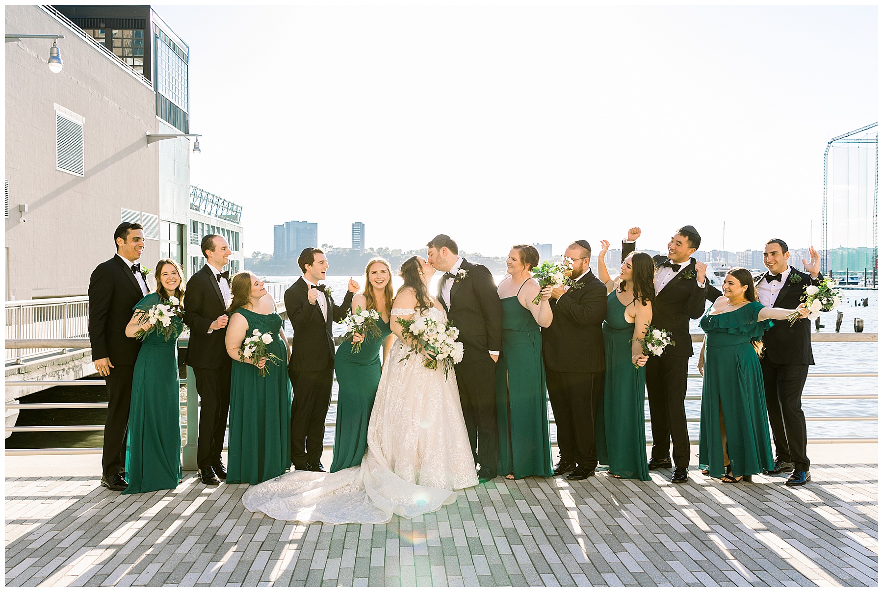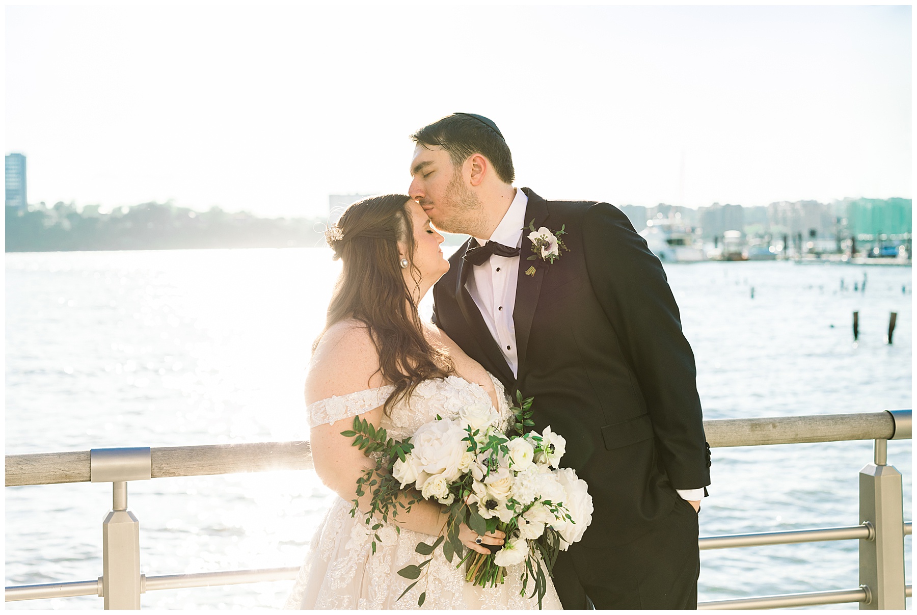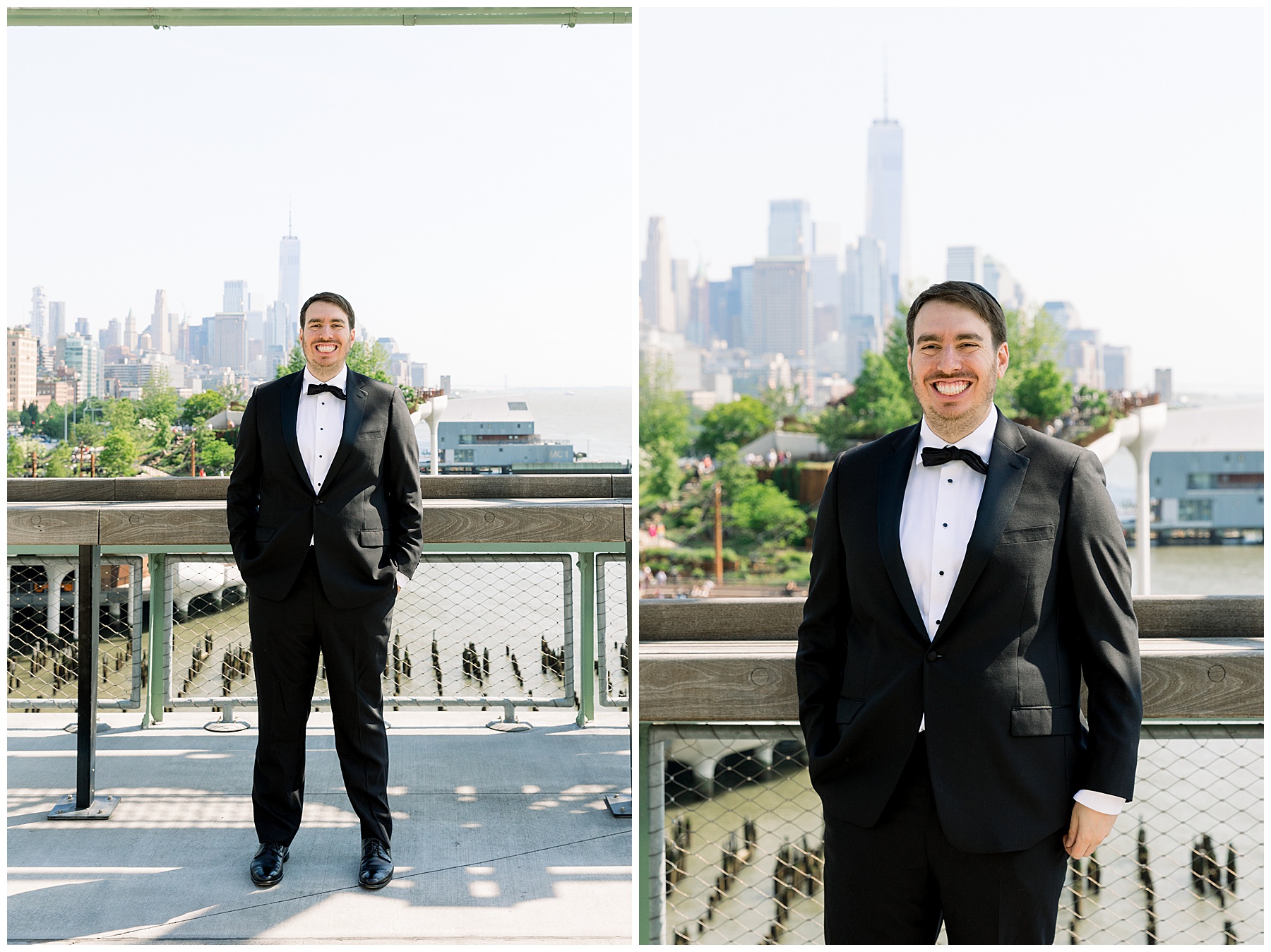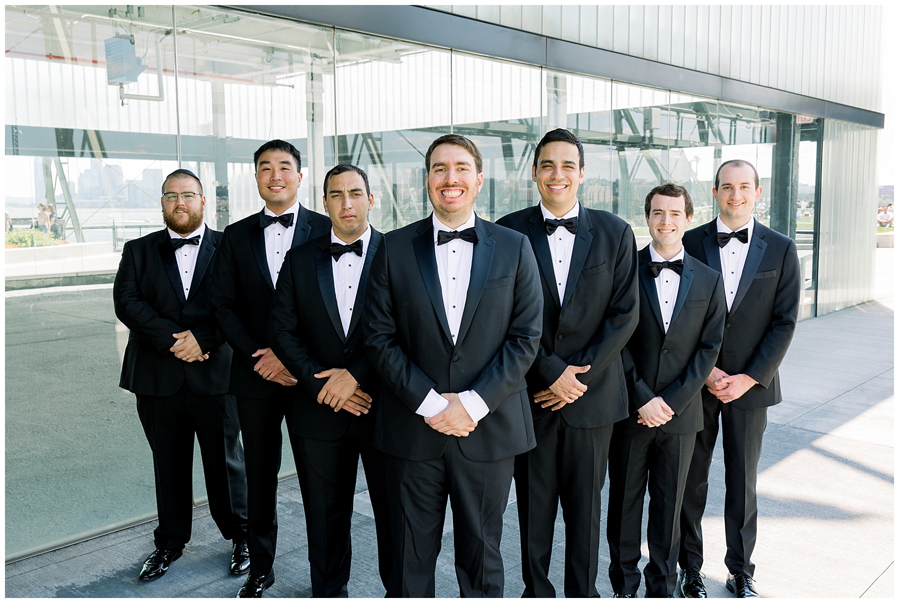As they exited the ceremony to go upstairs for their ketubah signing, we got some of my FAVORITE portraits of the whole day as they went upstairs against the iconic wine bottle wall! I just LOVE how those turned out! After the ketubah signing, we went outside to photograph all their portraits with the beautiful Hudson River behind them. It was a really hot day in the sun, so Carleigh & Ian were great sports to sweat it out with us! (Especially because Carleigh’s dress literally weighs 30 pounds!) We were so fortunate to find a spot without tourists in the background, with such a cool view for their photos! LOVED it!!! (Plus they got congratulated like 198652 times by people walking by – so fun!)