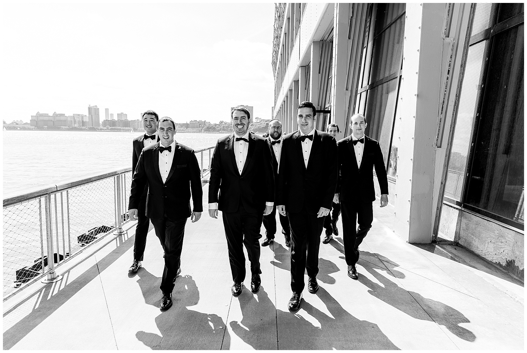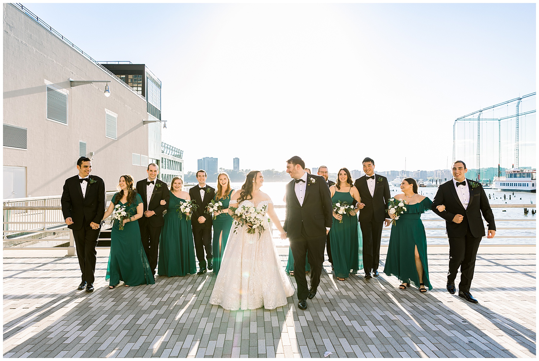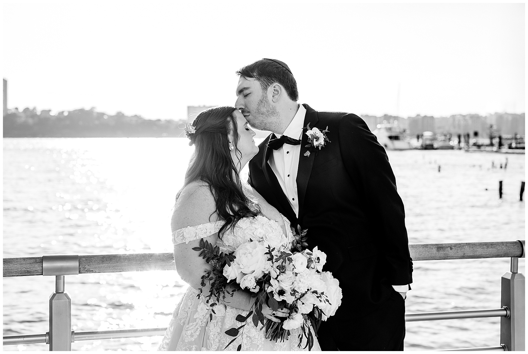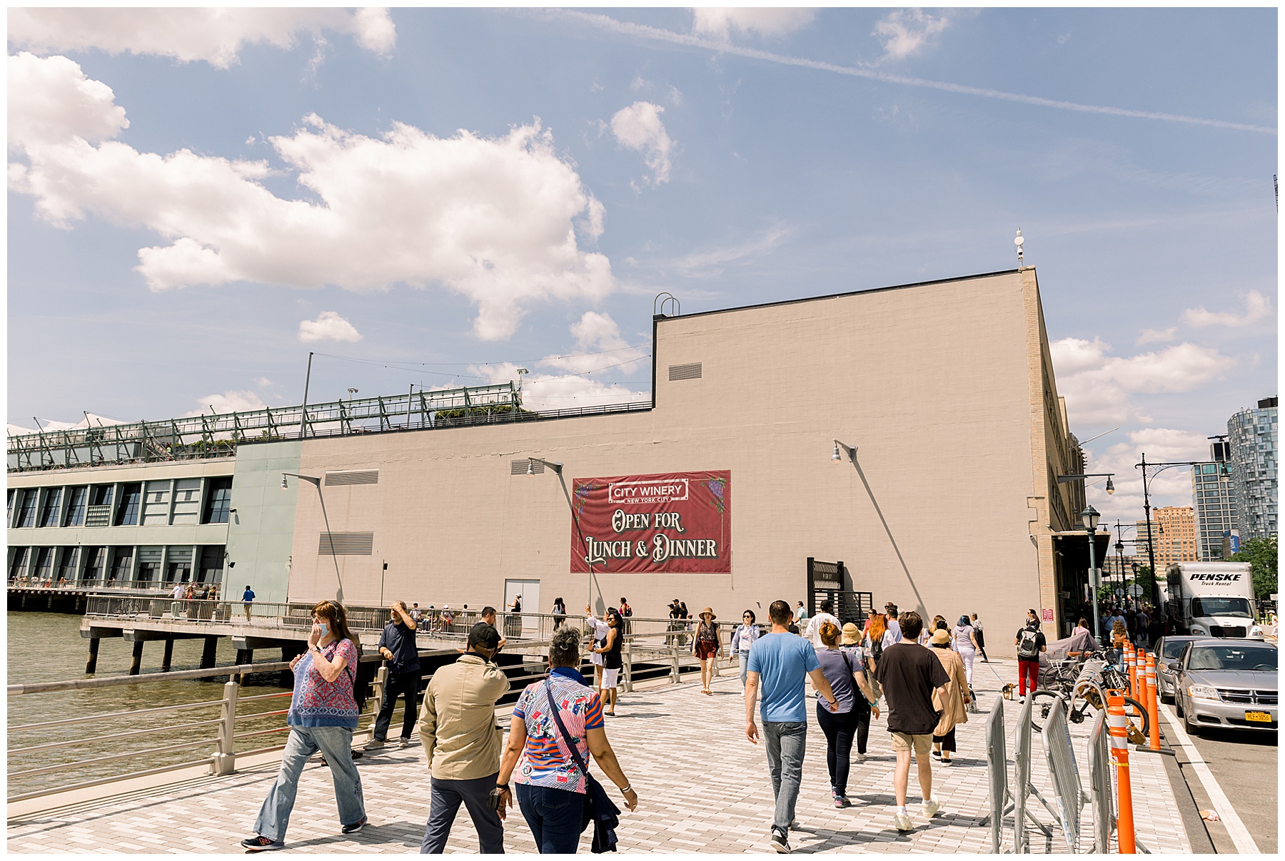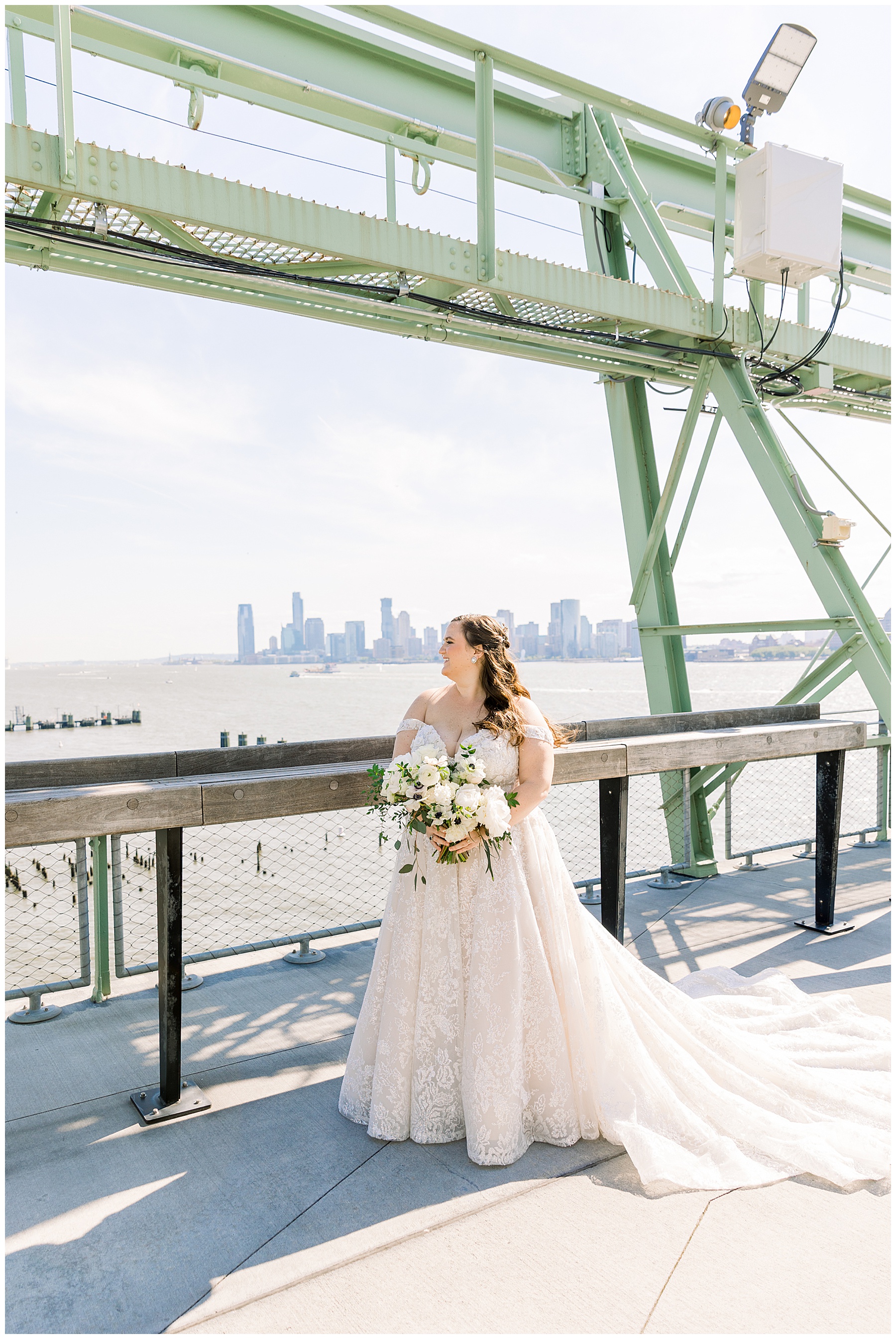 As they exited the ceremony to go upstairs for their ketubah signing, we got some of my FAVORITE portraits of the whole day as they went upstairs against the iconic wine bottle wall! I just LOVE how those turned out! After the ketubah signing, we went outside to photograph all their portraits with the beautiful Hudson River behind them. It was a really hot day in the sun, so Carleigh & Ian were great sports to sweat it out with us! (Especially because Carleigh’s dress literally weighs 30 pounds!) We were so fortunate to find a spot without tourists in the background, with such a cool view for their photos! LOVED it!!! (Plus they got congratulated like 198652 times by people walking by – so fun!)