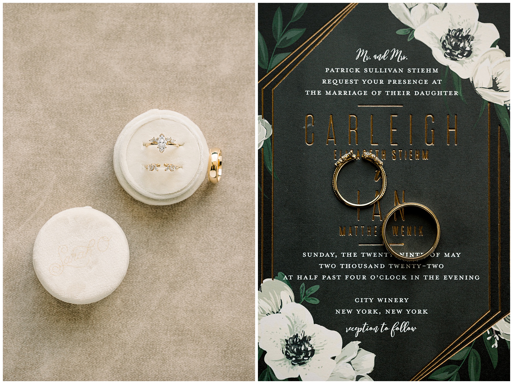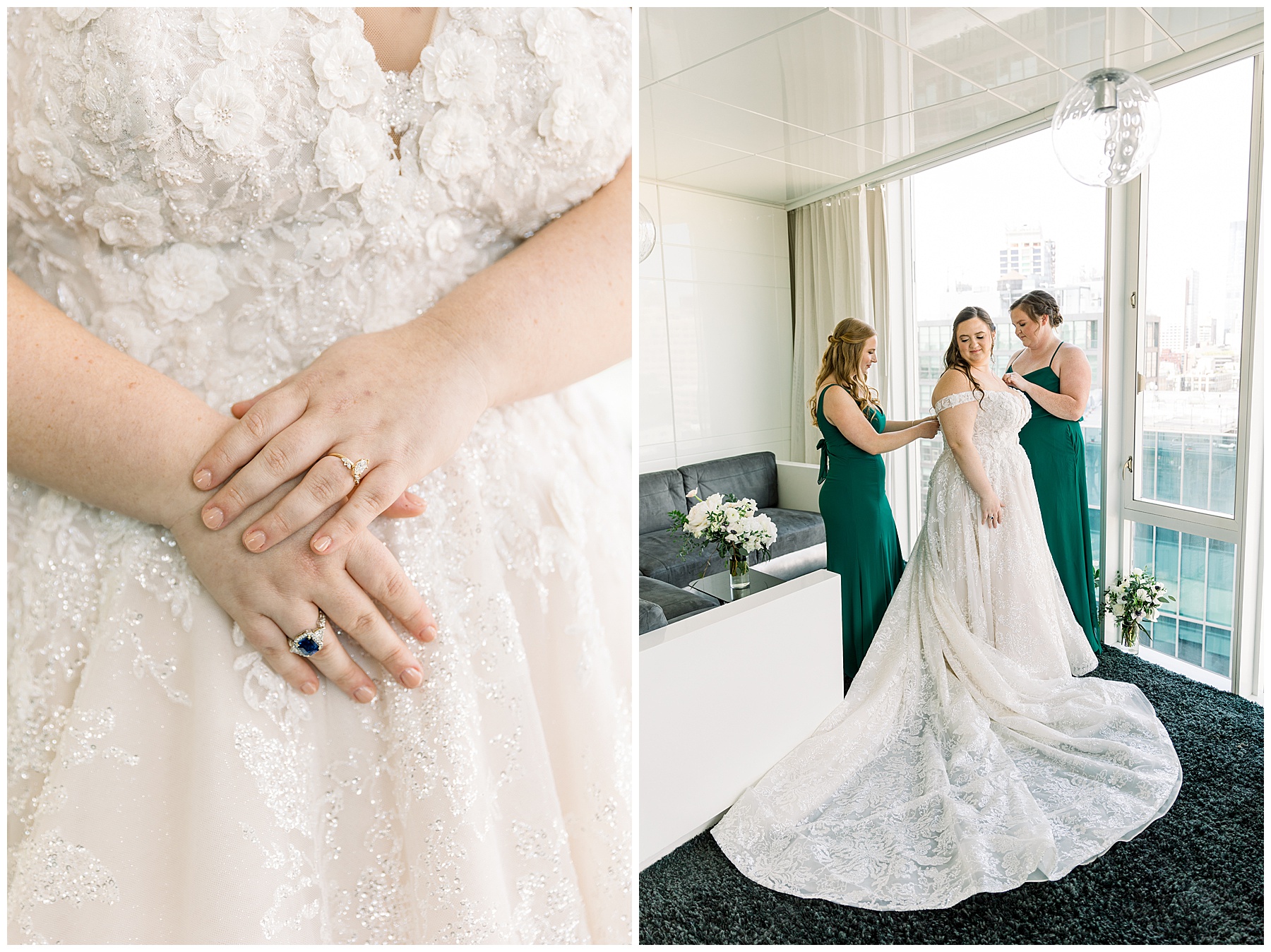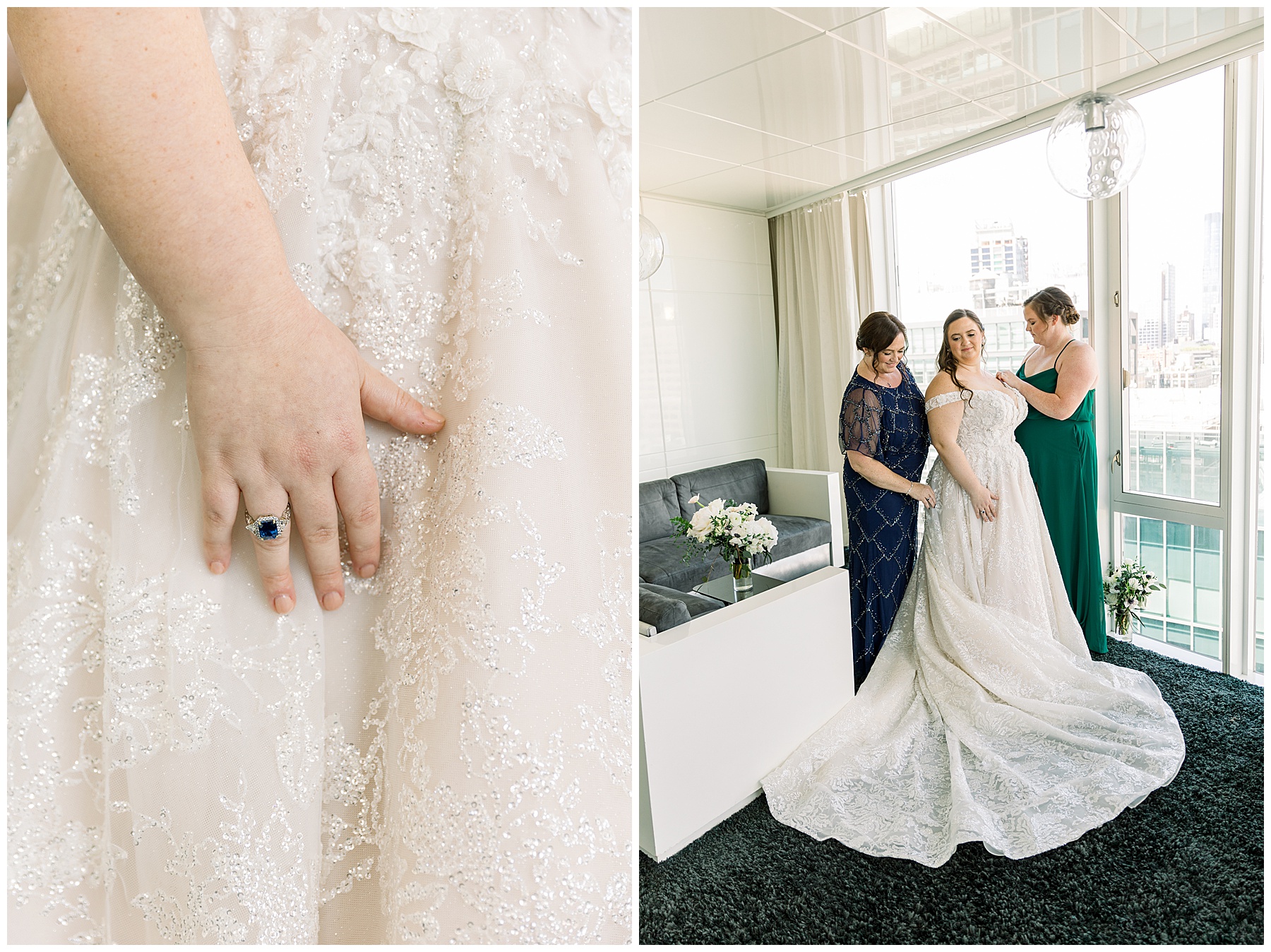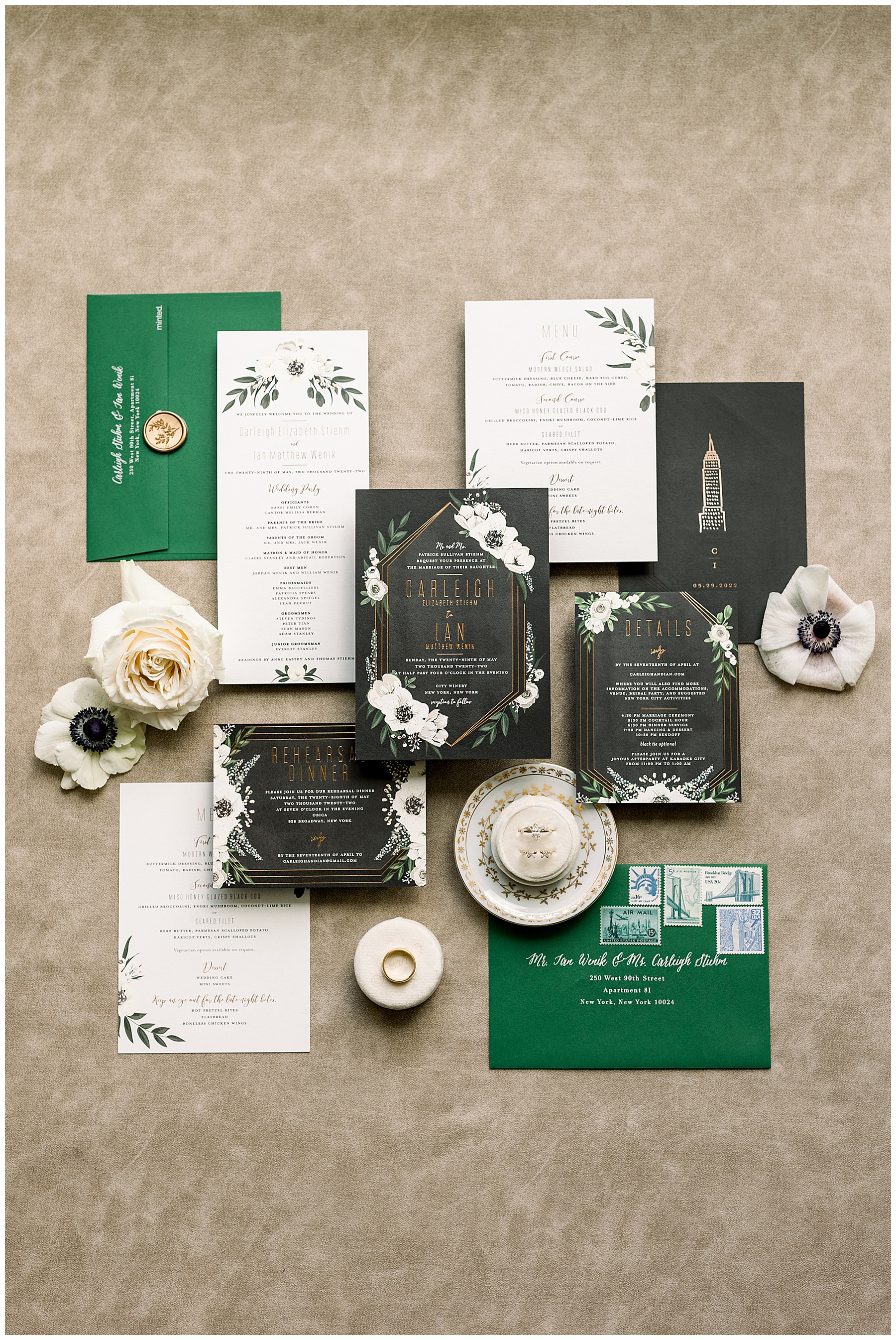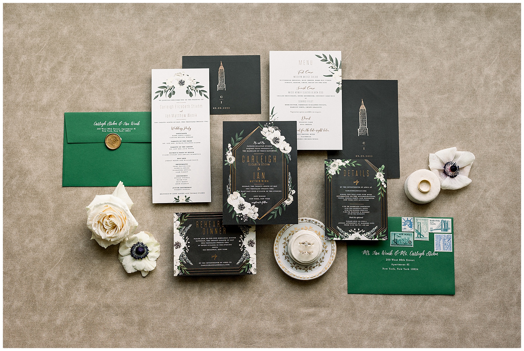 The day of the wedding, we started off with NYC bagels and then arrived at The Standard to find all the bridesmaids in cute green rompers and getting all glam by the Beautini crew! Carleigh had spoiled all the girls by booking the Empire Suite that had the most INCREDIBLE 16th floor views of NYC for them to enjoy all morning. We photographed all of Carleigh’s very organized and beautiful detail items while the girls finished getting ready! First of all, one of my all-time fave TLC shows is Say Yes to the Dress – so when I heard that Carleigh’s dress is a Martina Liana from KLEINFELDS OF NYC… I was totally fangirling and felt so honored to photograph it! Carleigh & Ian had so many fun details for me to photograph. My favorites were of course their stunning Sarah O rings (a female & minority-owned business), Ian’s grandmother’s INCREDIBLE sapphire ring that she passed down to Carleigh, and the black/white/gold invitation suite (all my fave colors) with the vintage stamp set of all NYC landmarks.