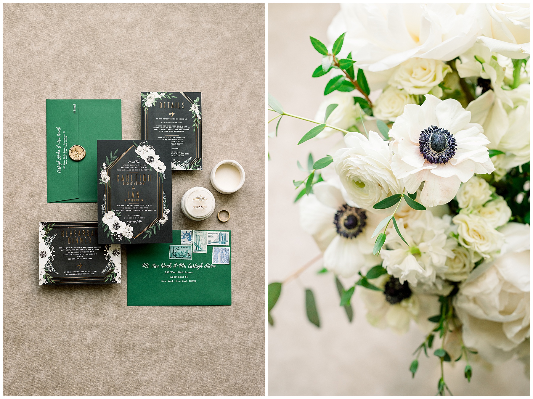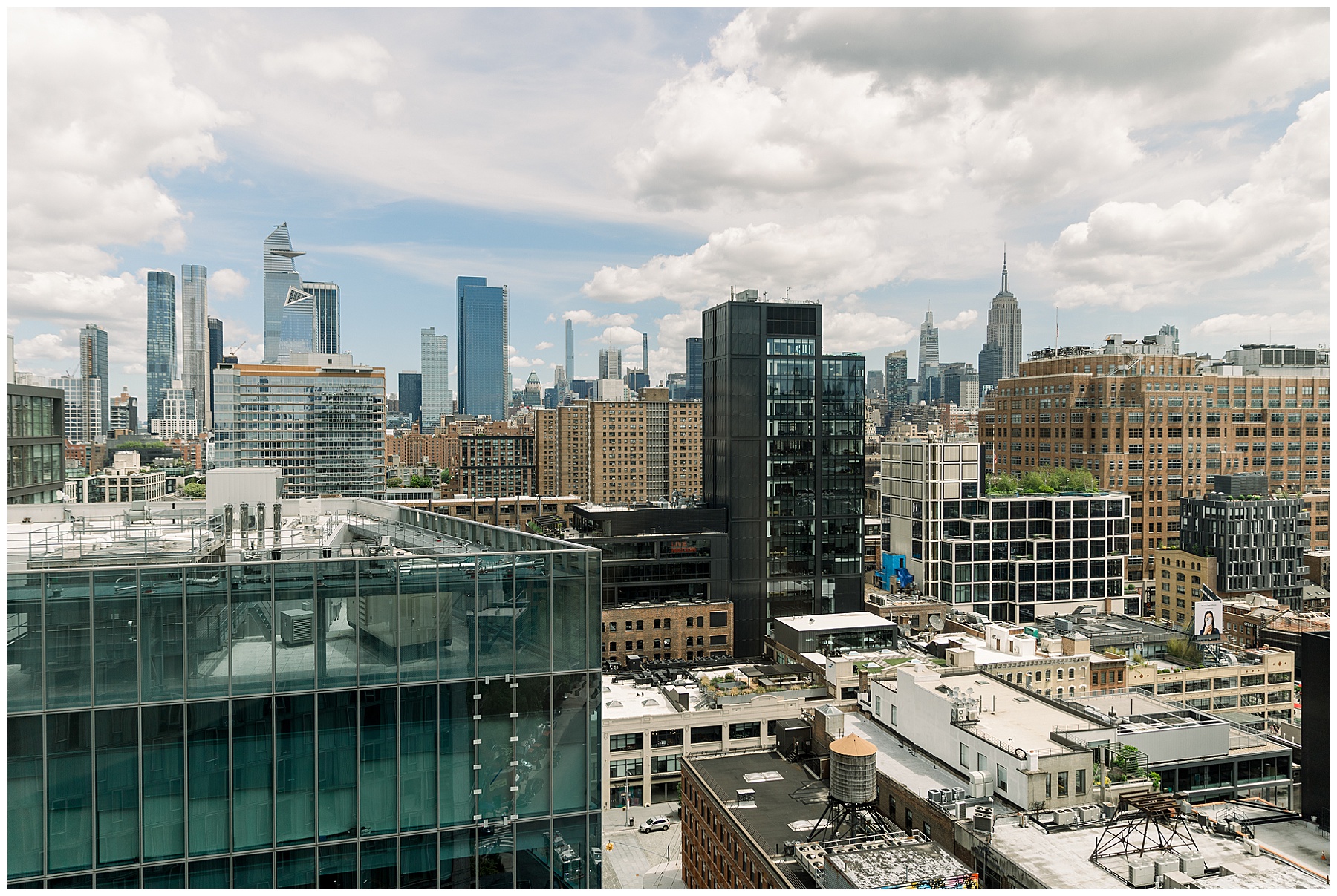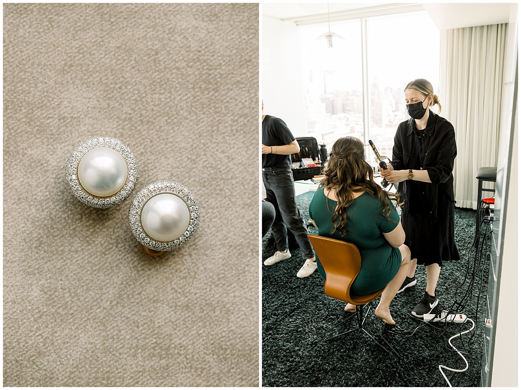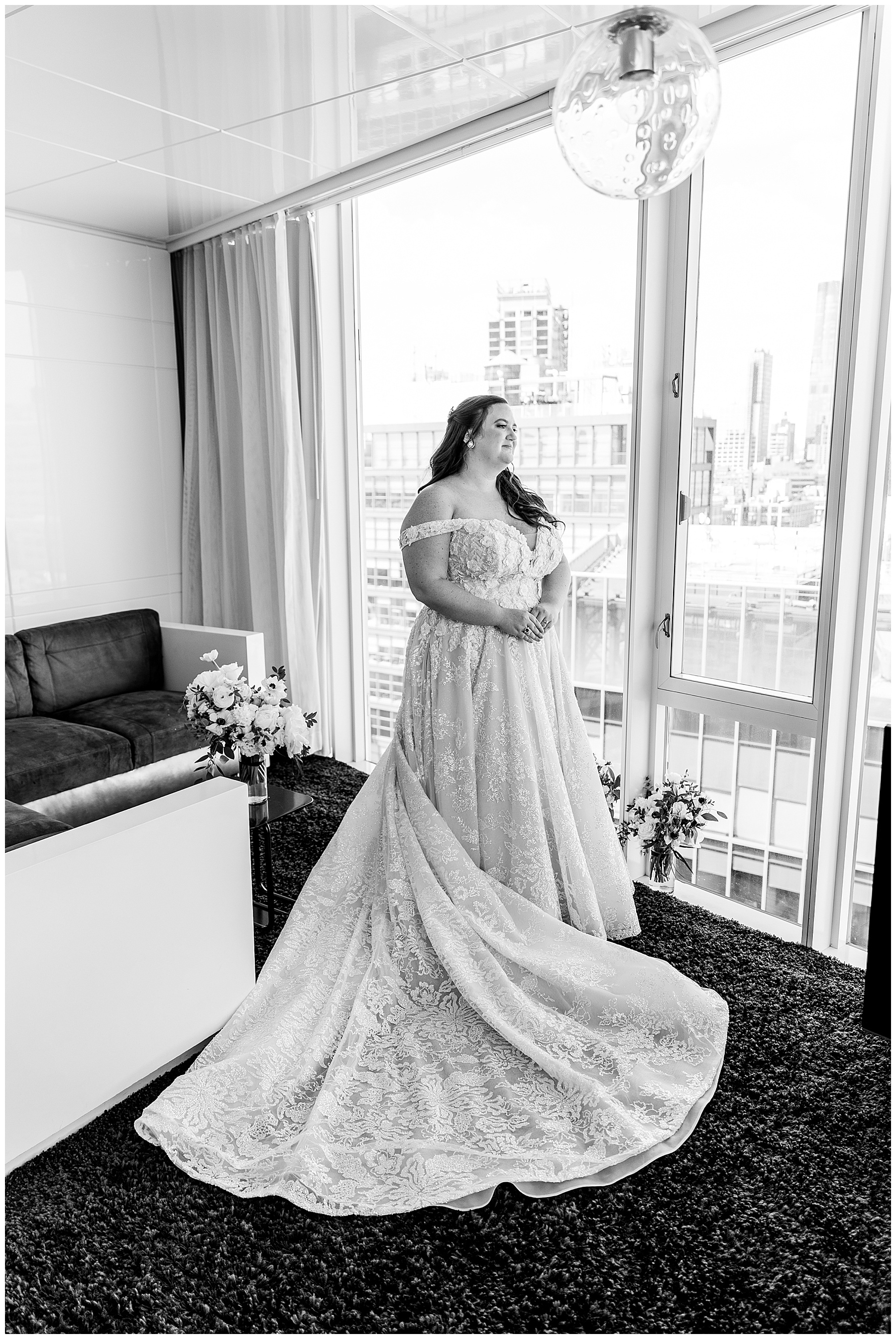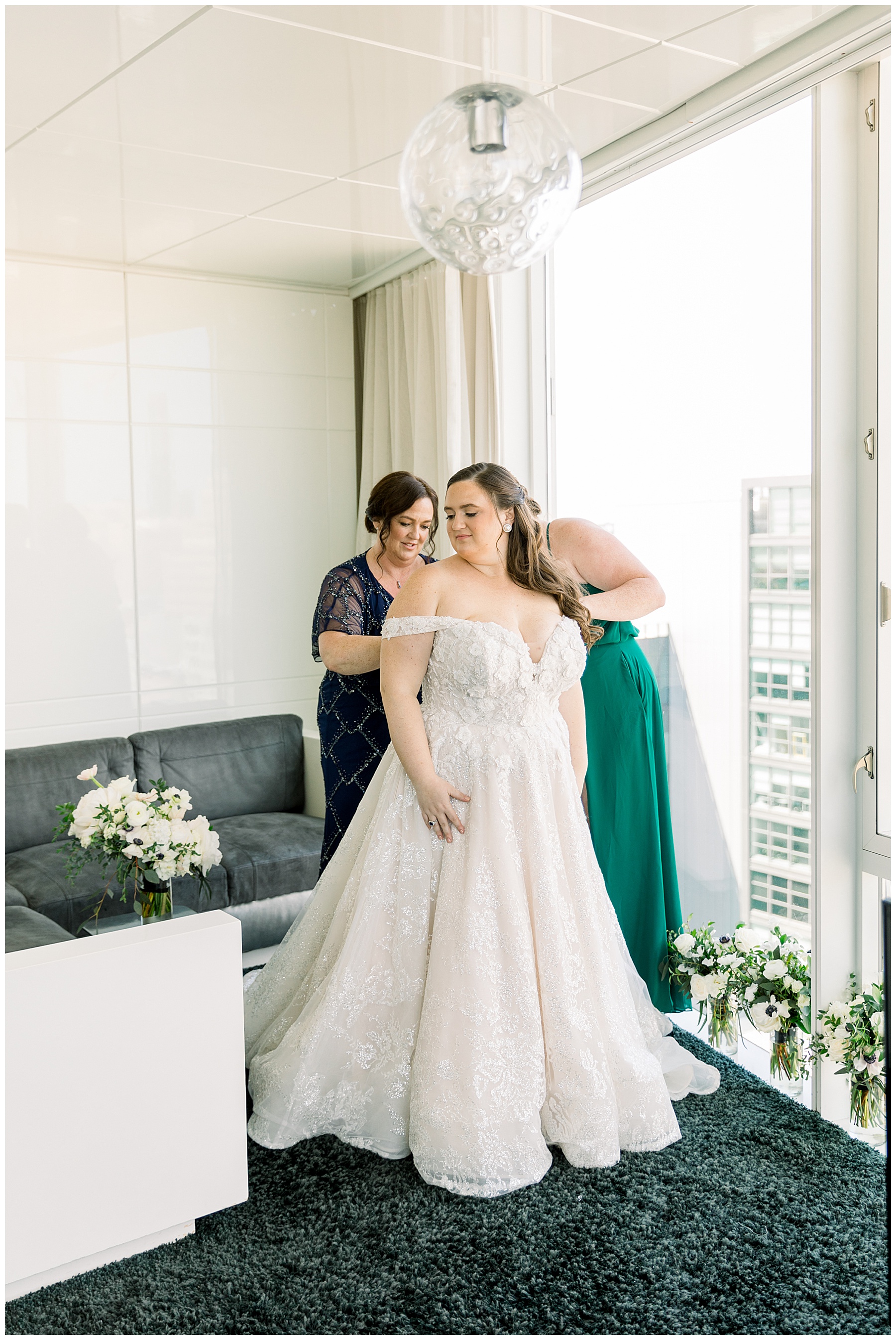 The day of the wedding, we started off with NYC bagels and then arrived at The Standard to find all the bridesmaids in cute green rompers and getting all glam by the Beautini crew! Carleigh had spoiled all the girls by booking the Empire Suite that had the most INCREDIBLE 16th floor views of NYC for them to enjoy all morning. We photographed all of Carleigh’s very organized and beautiful detail items while the girls finished getting ready! First of all, one of my all-time fave TLC shows is Say Yes to the Dress – so when I heard that Carleigh’s dress is a Martina Liana from KLEINFELDS OF NYC… I was totally fangirling and felt so honored to photograph it! Carleigh & Ian had so many fun details for me to photograph. My favorites were of course their stunning Sarah O rings (a female & minority-owned business), Ian’s grandmother’s INCREDIBLE sapphire ring that she passed down to Carleigh, and the black/white/gold invitation suite (all my fave colors) with the vintage stamp set of all NYC landmarks.