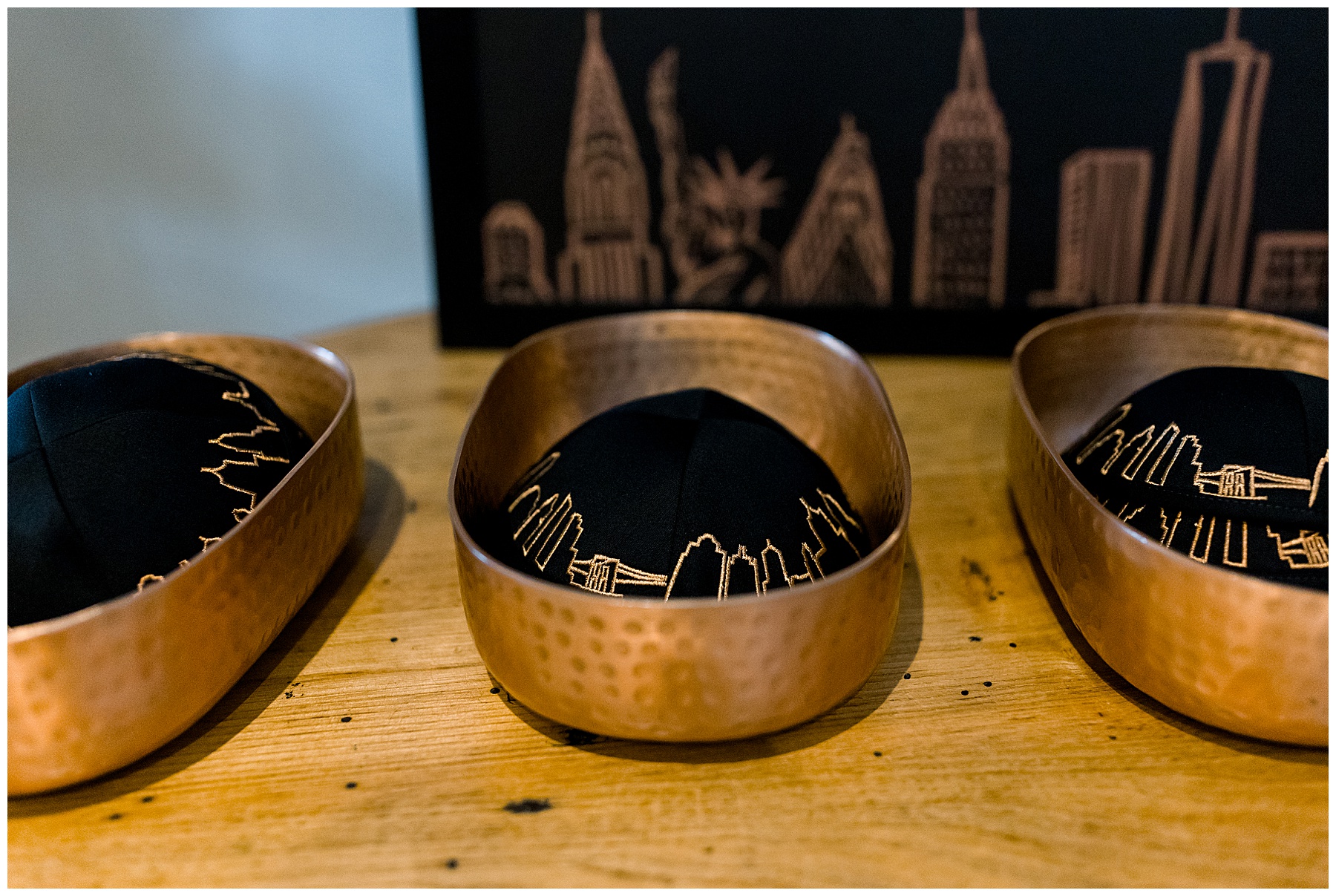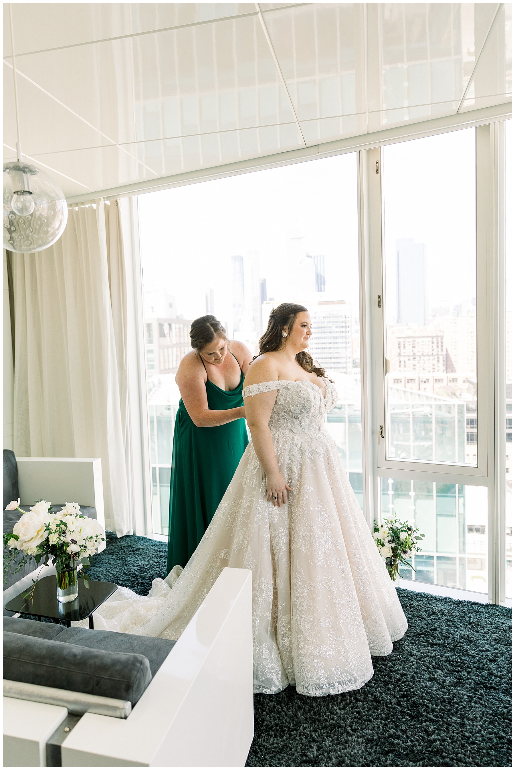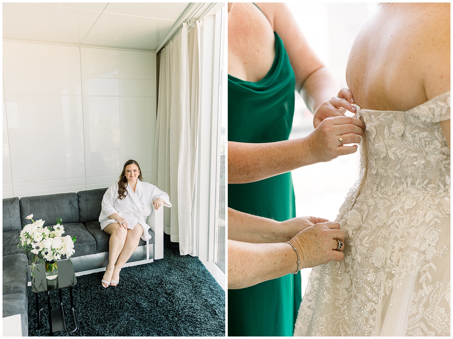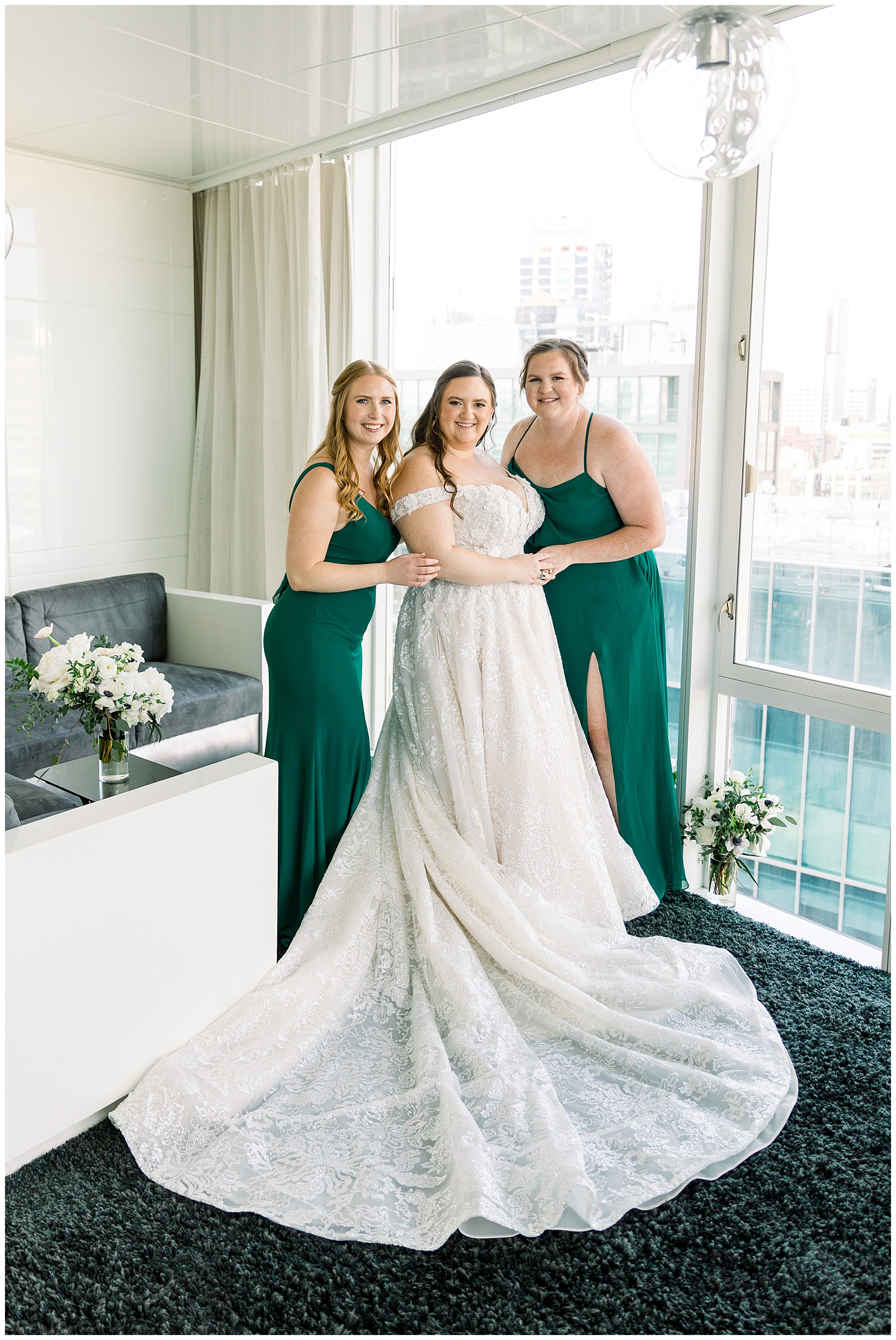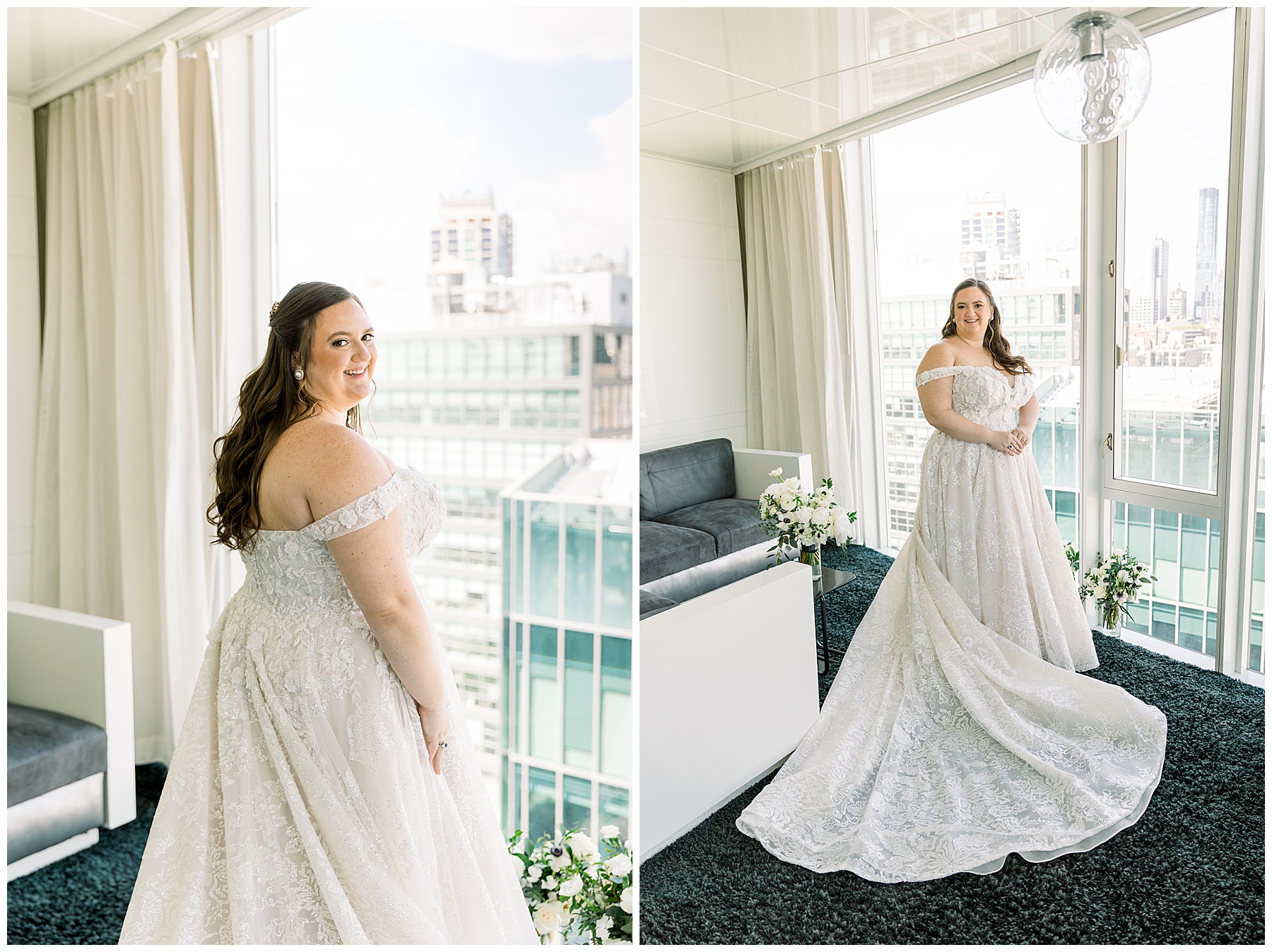 The day of the wedding, we started off with NYC bagels and then arrived at The Standard to find all the bridesmaids in cute green rompers and getting all glam by the Beautini crew! Carleigh had spoiled all the girls by booking the Empire Suite that had the most INCREDIBLE 16th floor views of NYC for them to enjoy all morning. We photographed all of Carleigh’s very organized and beautiful detail items while the girls finished getting ready! First of all, one of my all-time fave TLC shows is Say Yes to the Dress – so when I heard that Carleigh’s dress is a Martina Liana from KLEINFELDS OF NYC… I was totally fangirling and felt so honored to photograph it! Carleigh & Ian had so many fun details for me to photograph. My favorites were of course their stunning Sarah O rings (a female & minority-owned business), Ian’s grandmother’s INCREDIBLE sapphire ring that she passed down to Carleigh, and the black/white/gold invitation suite (all my fave colors) with the vintage stamp set of all NYC landmarks.