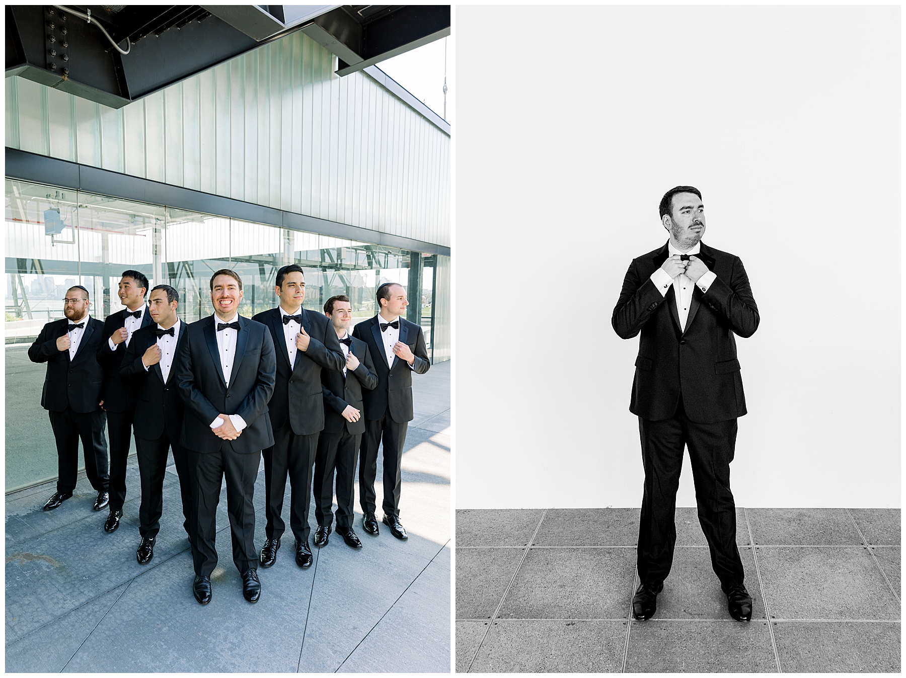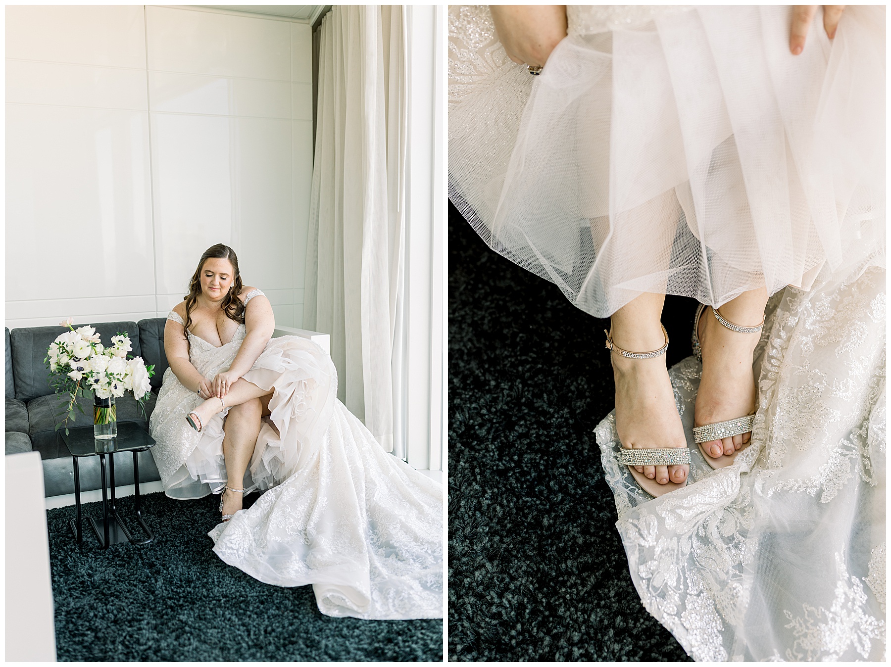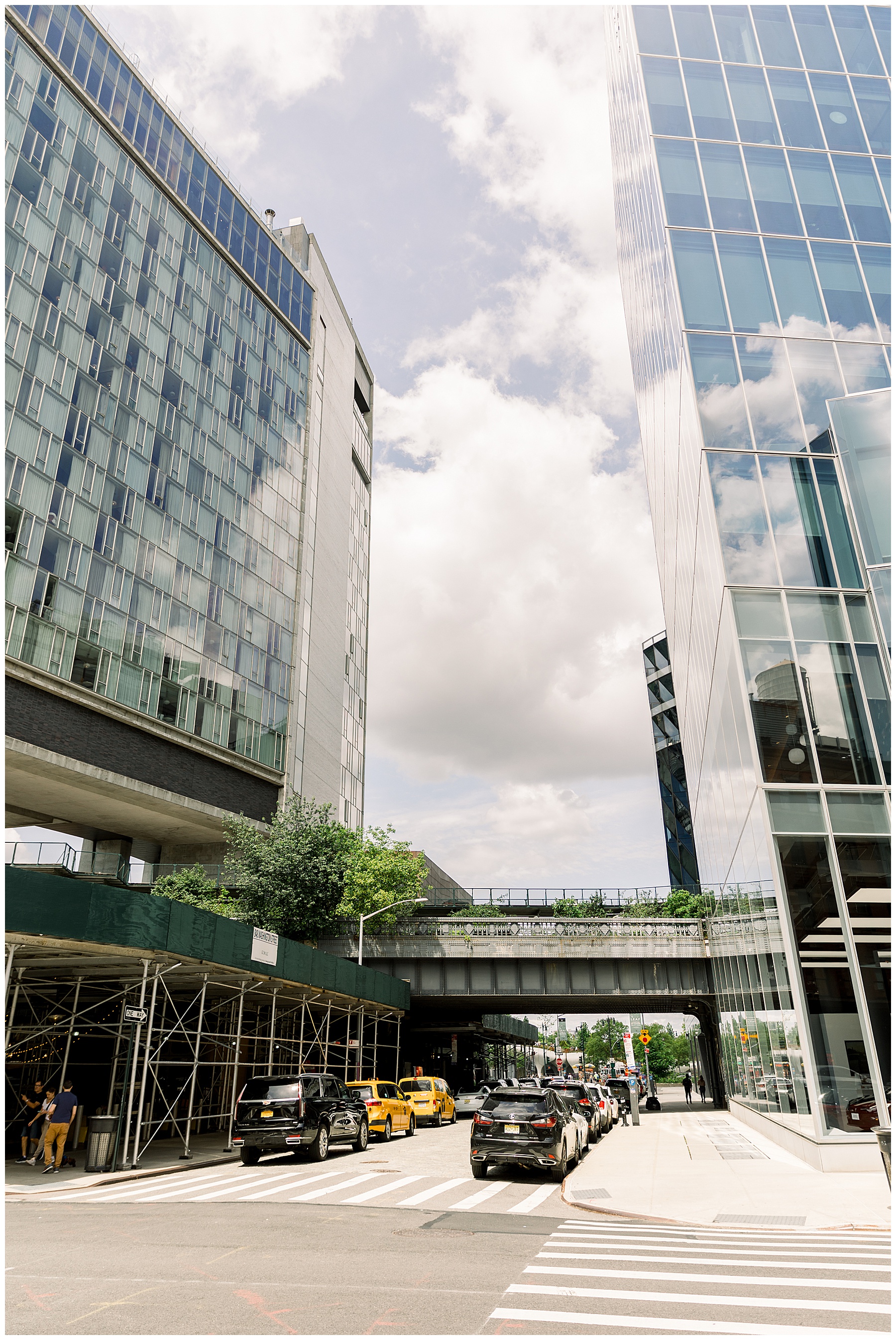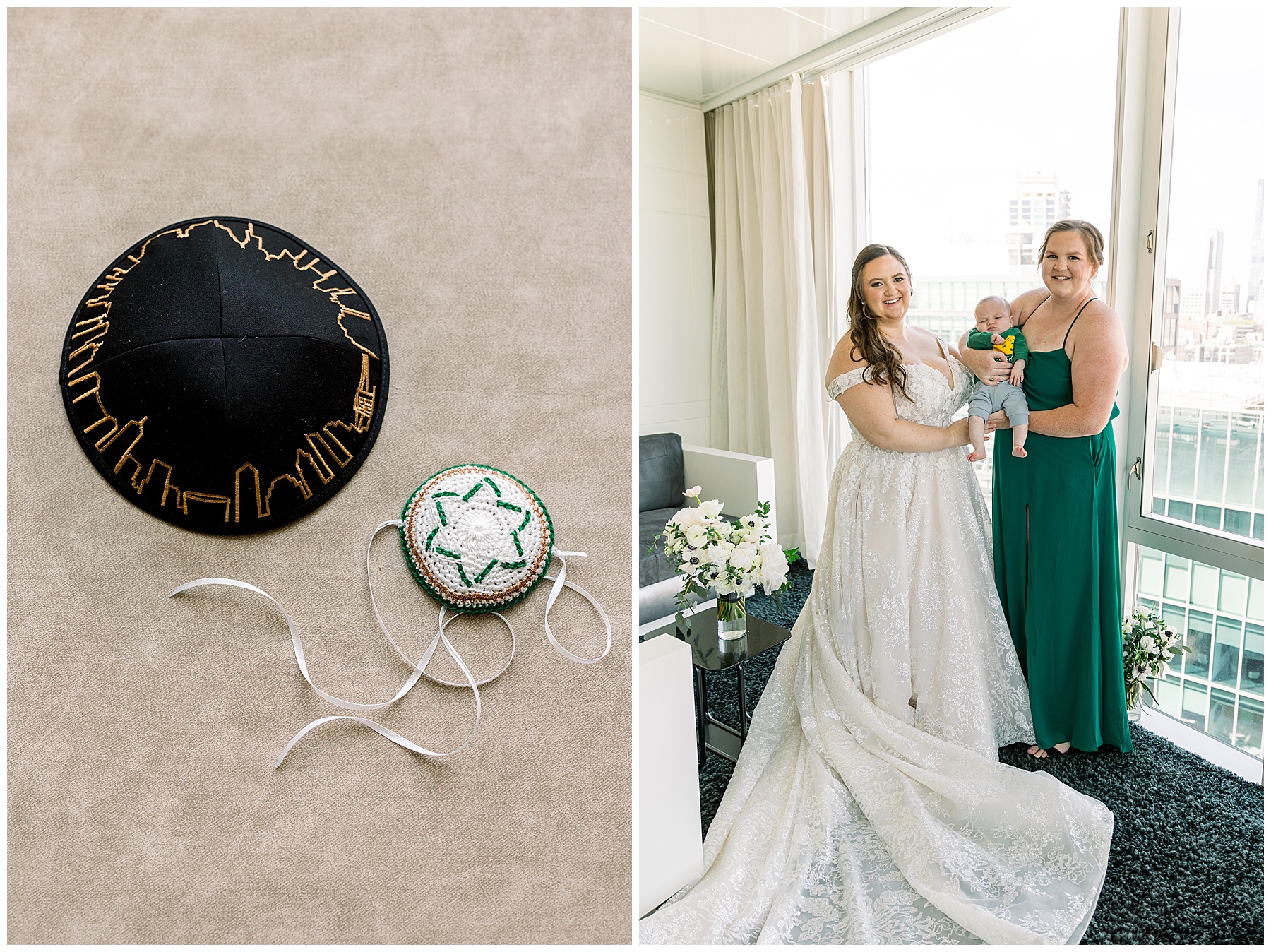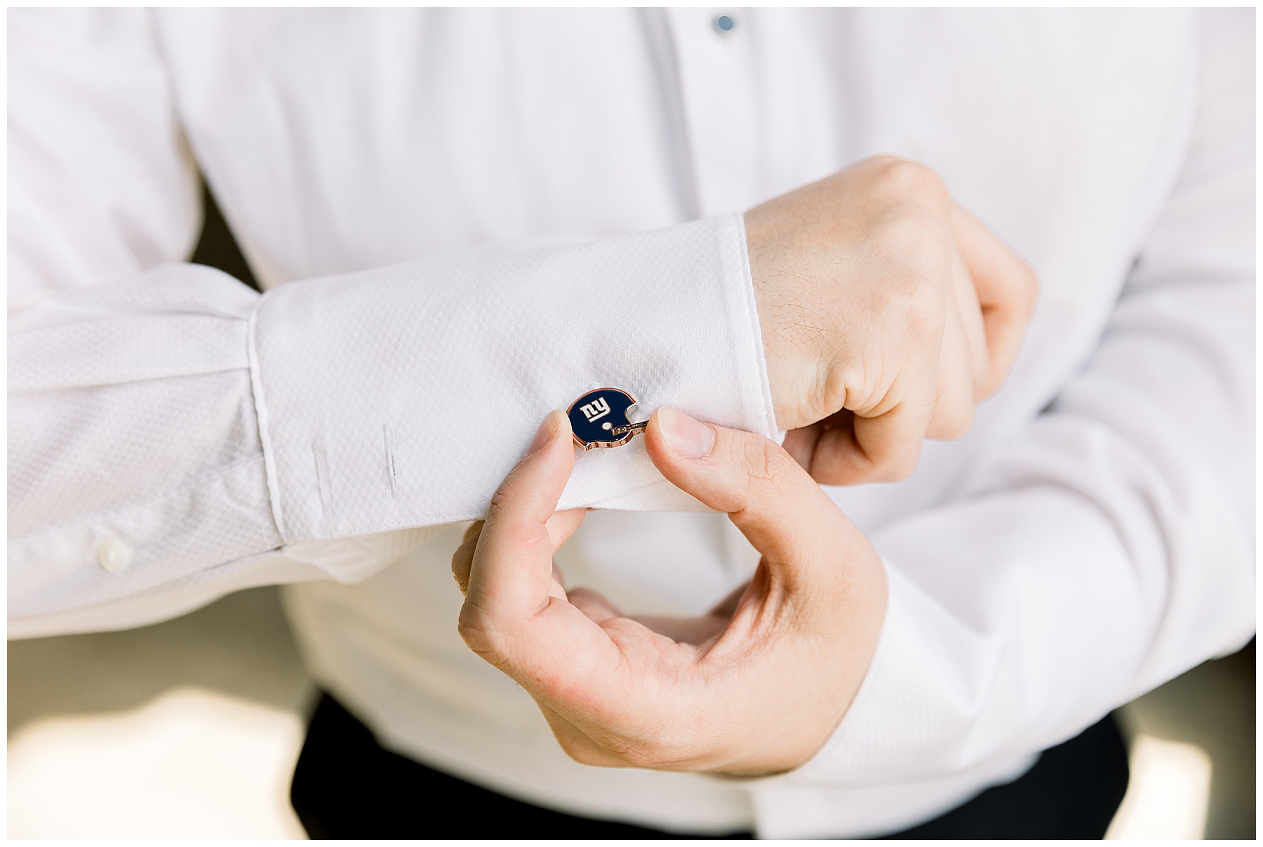 The day of the wedding, we started off with NYC bagels and then arrived at The Standard to find all the bridesmaids in cute green rompers and getting all glam by the Beautini crew! Carleigh had spoiled all the girls by booking the Empire Suite that had the most INCREDIBLE 16th floor views of NYC for them to enjoy all morning. We photographed all of Carleigh’s very organized and beautiful detail items while the girls finished getting ready! First of all, one of my all-time fave TLC shows is Say Yes to the Dress – so when I heard that Carleigh’s dress is a Martina Liana from KLEINFELDS OF NYC… I was totally fangirling and felt so honored to photograph it! Carleigh & Ian had so many fun details for me to photograph. My favorites were of course their stunning Sarah O rings (a female & minority-owned business), Ian’s grandmother’s INCREDIBLE sapphire ring that she passed down to Carleigh, and the black/white/gold invitation suite (all my fave colors) with the vintage stamp set of all NYC landmarks.