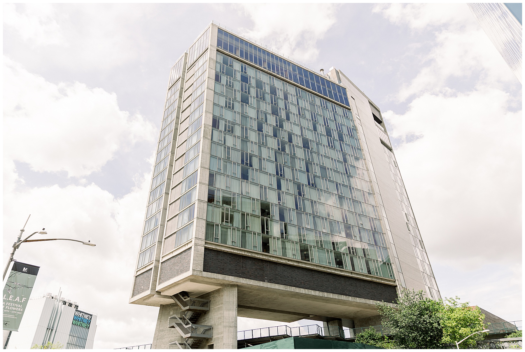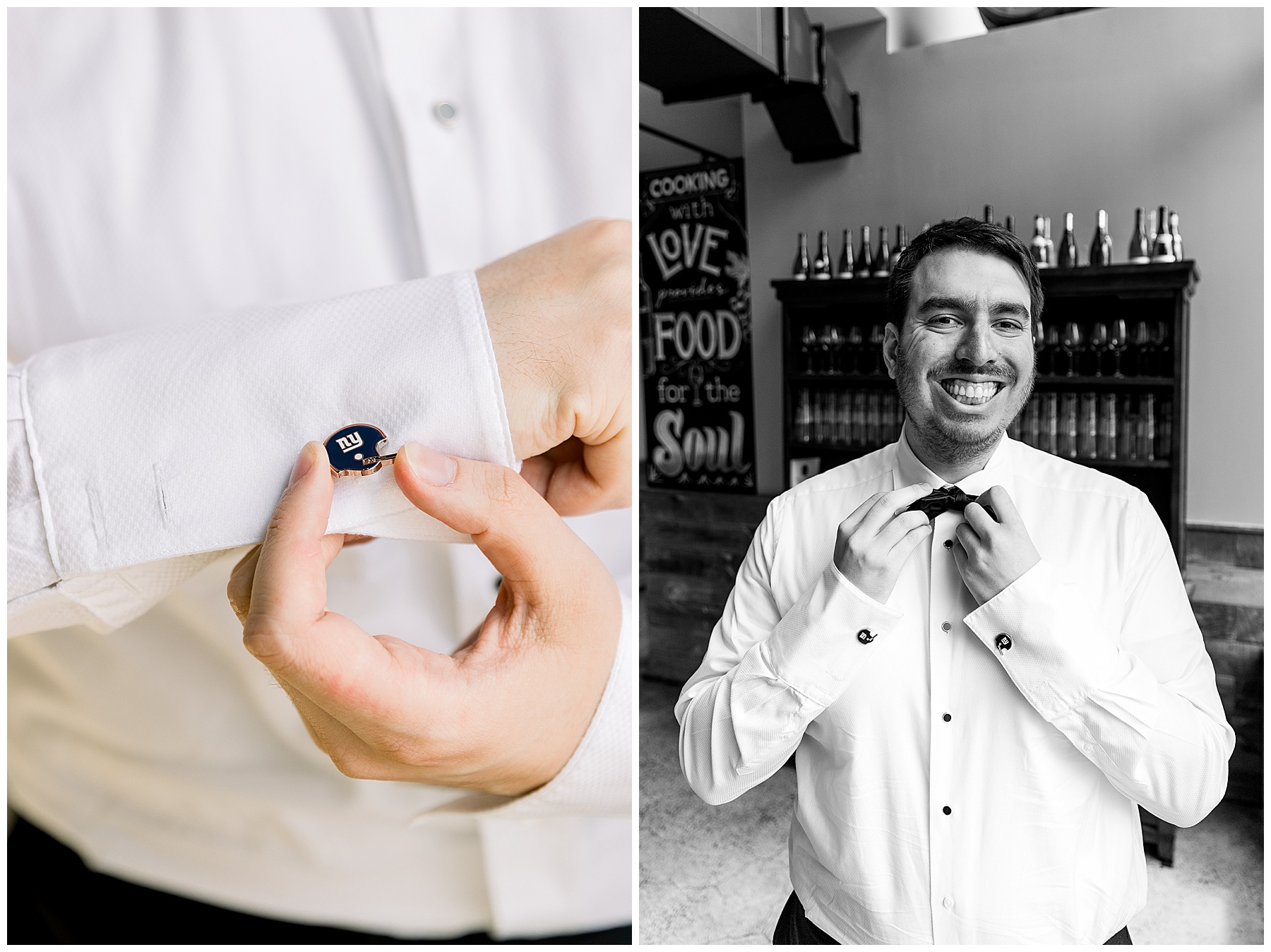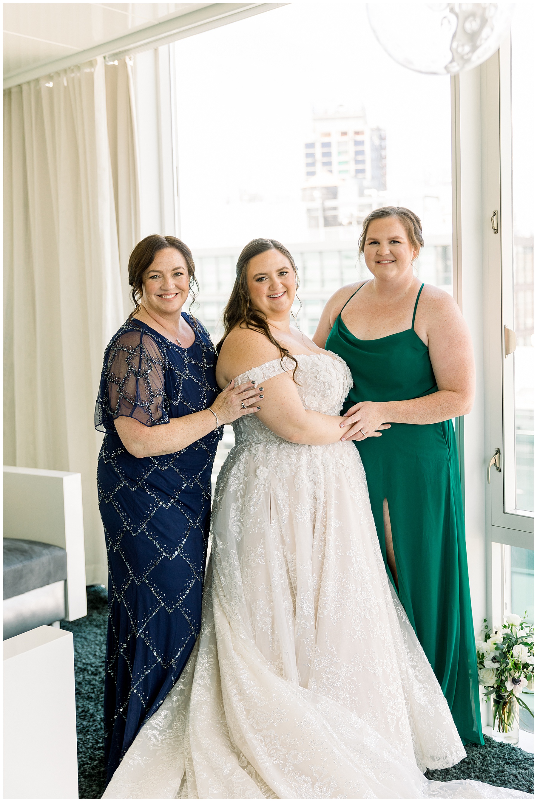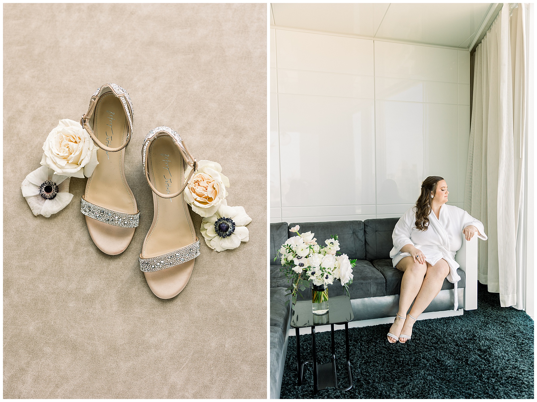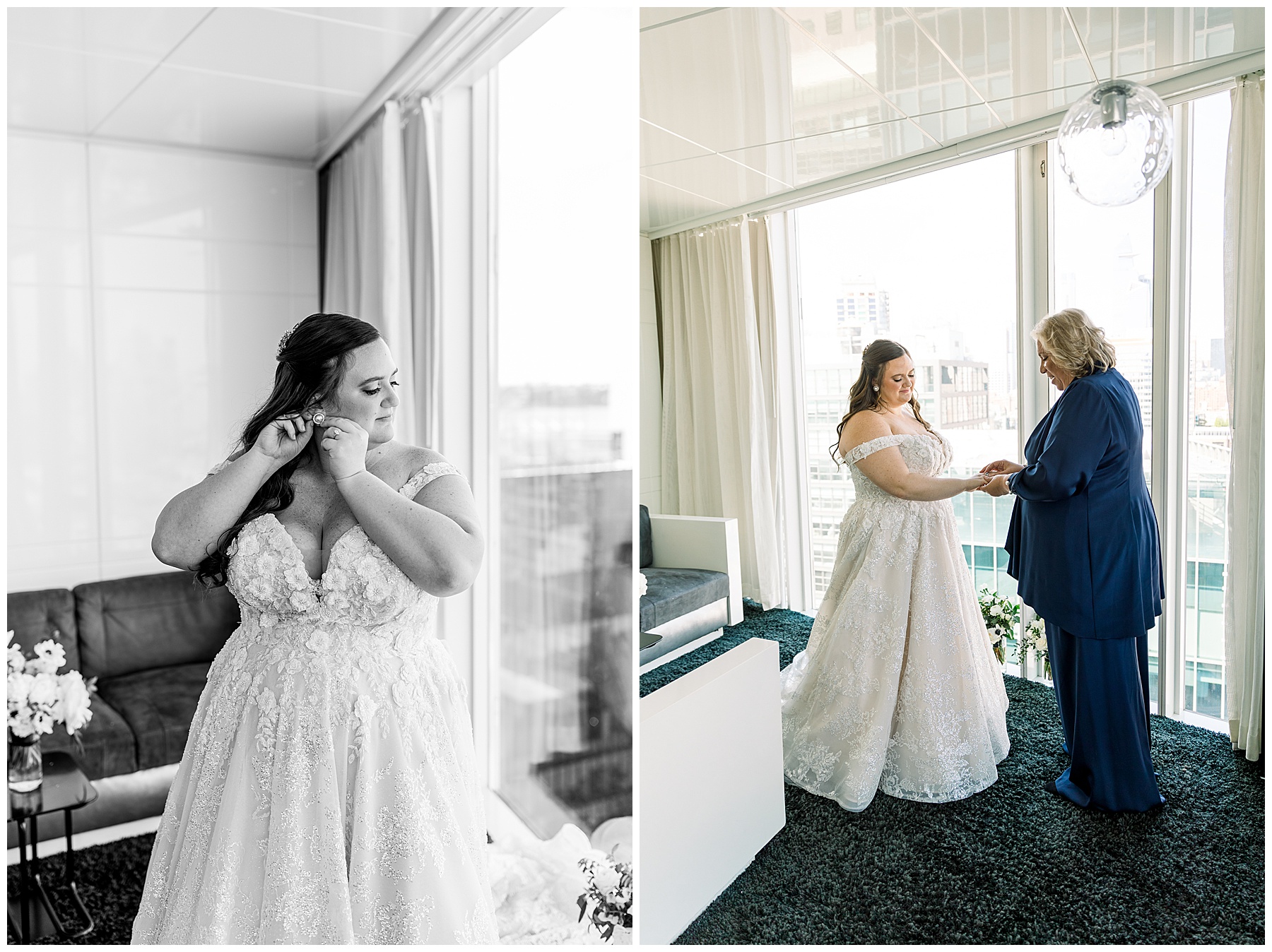 The day of the wedding, we started off with NYC bagels and then arrived at The Standard to find all the bridesmaids in cute green rompers and getting all glam by the Beautini crew! Carleigh had spoiled all the girls by booking the Empire Suite that had the most INCREDIBLE 16th floor views of NYC for them to enjoy all morning. We photographed all of Carleigh’s very organized and beautiful detail items while the girls finished getting ready! First of all, one of my all-time fave TLC shows is Say Yes to the Dress – so when I heard that Carleigh’s dress is a Martina Liana from KLEINFELDS OF NYC… I was totally fangirling and felt so honored to photograph it! Carleigh & Ian had so many fun details for me to photograph. My favorites were of course their stunning Sarah O rings (a female & minority-owned business), Ian’s grandmother’s INCREDIBLE sapphire ring that she passed down to Carleigh, and the black/white/gold invitation suite (all my fave colors) with the vintage stamp set of all NYC landmarks.