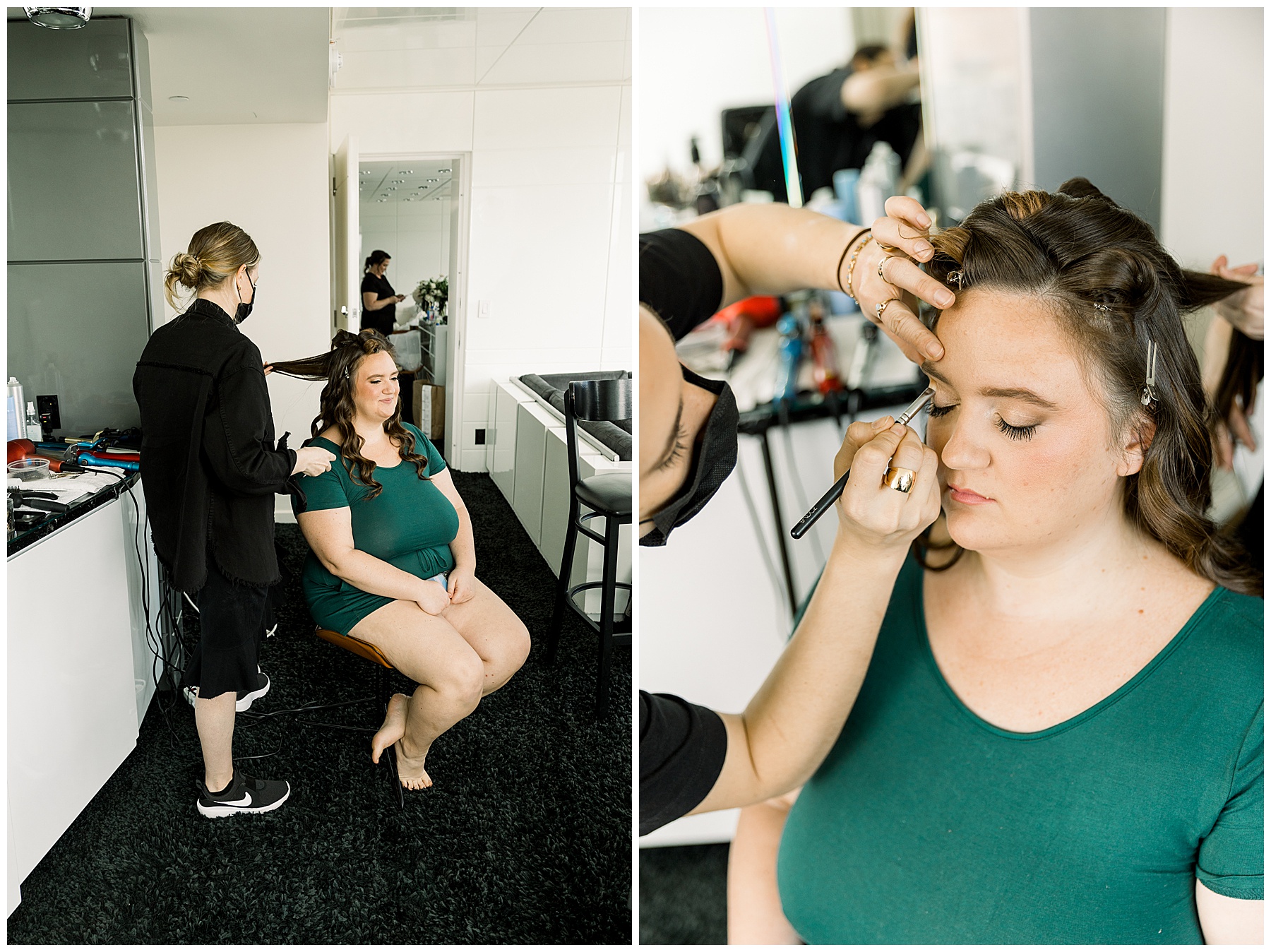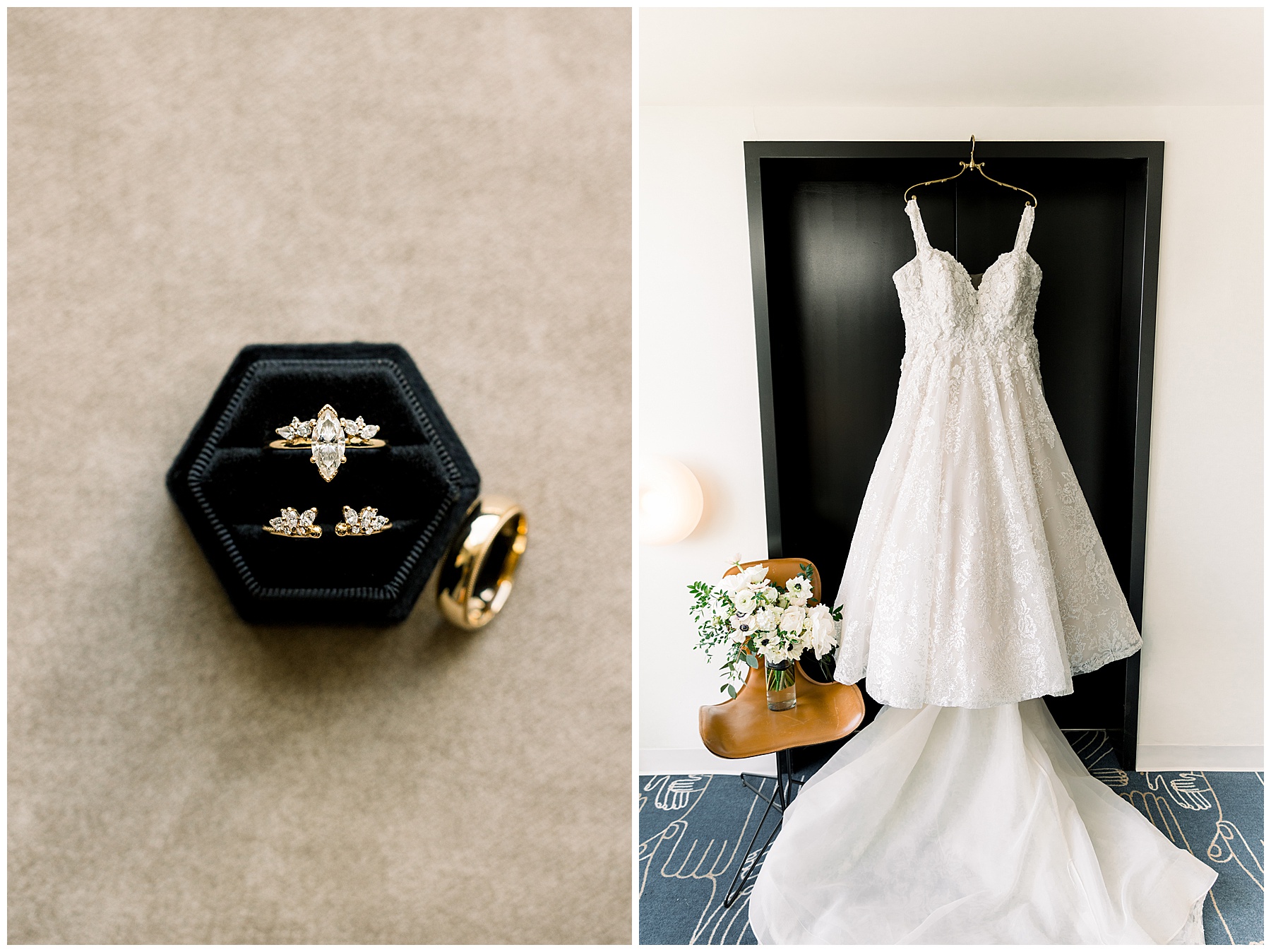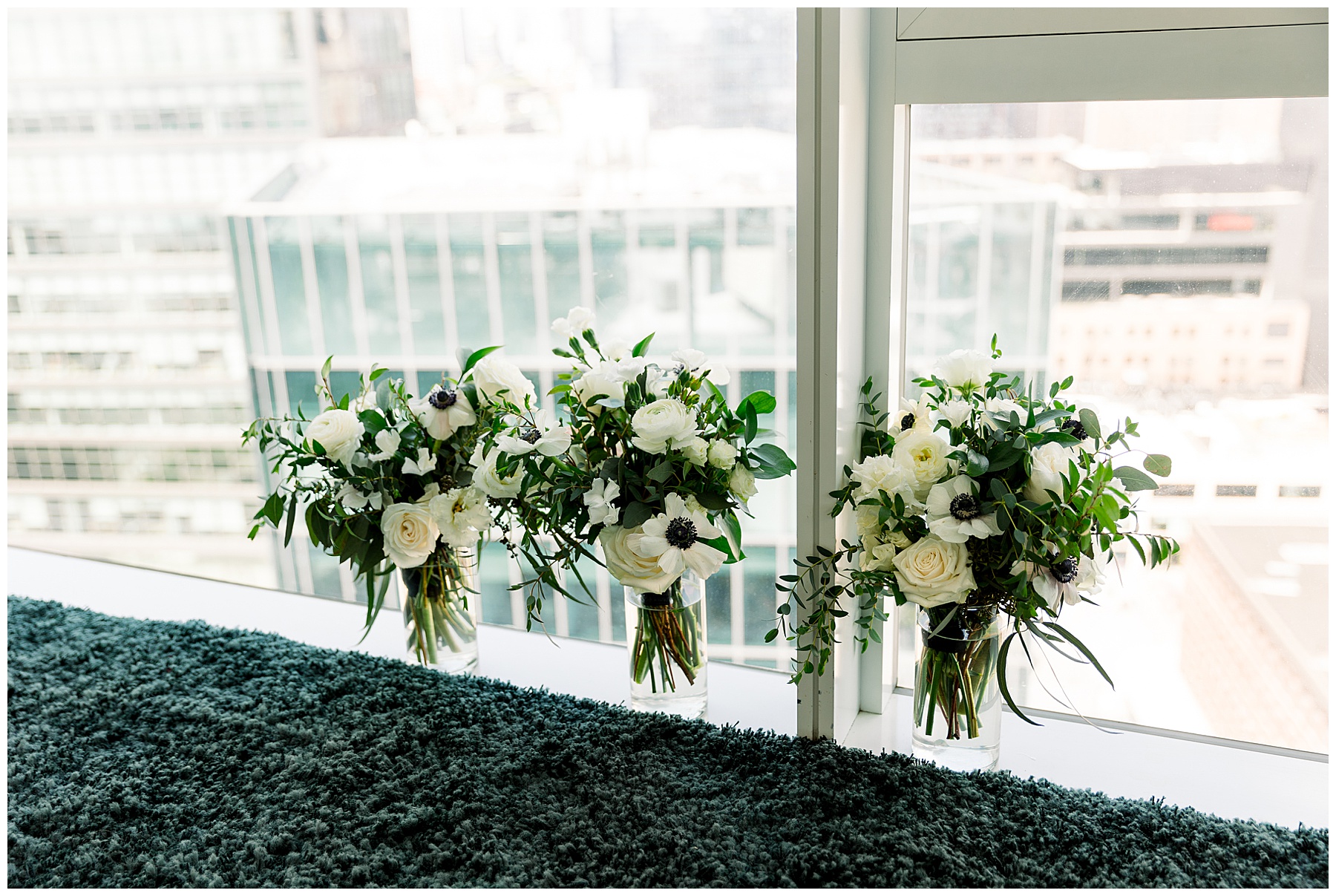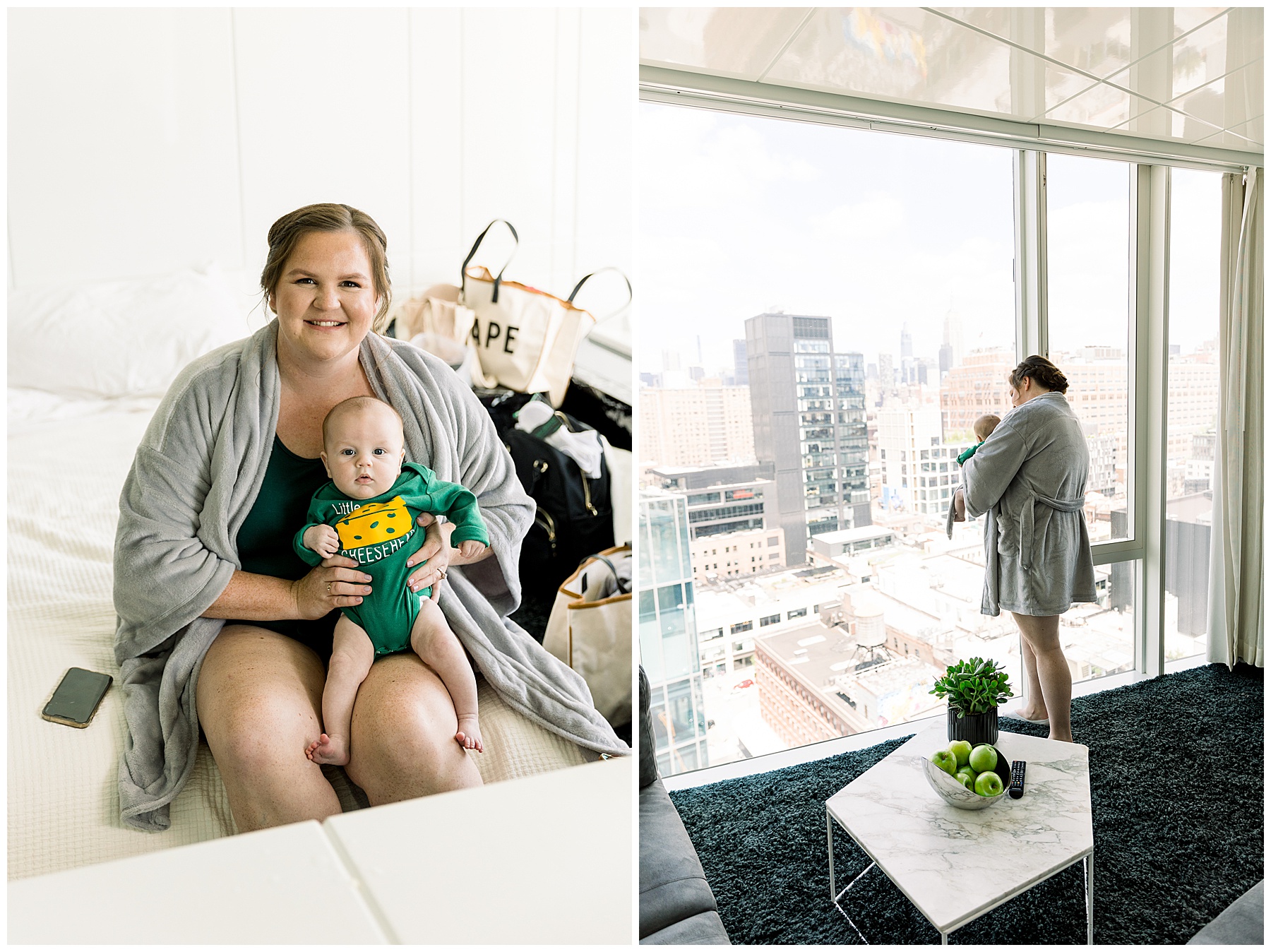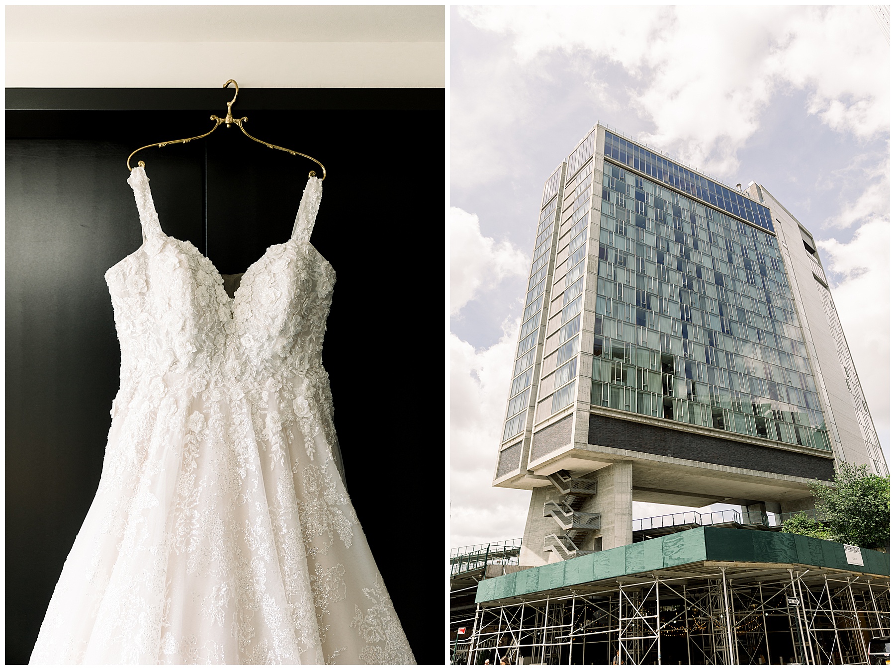 The day of the wedding, we started off with NYC bagels and then arrived at The Standard to find all the bridesmaids in cute green rompers and getting all glam by the Beautini crew! Carleigh had spoiled all the girls by booking the Empire Suite that had the most INCREDIBLE 16th floor views of NYC for them to enjoy all morning. We photographed all of Carleigh’s very organized and beautiful detail items while the girls finished getting ready! First of all, one of my all-time fave TLC shows is Say Yes to the Dress – so when I heard that Carleigh’s dress is a Martina Liana from KLEINFELDS OF NYC… I was totally fangirling and felt so honored to photograph it! Carleigh & Ian had so many fun details for me to photograph. My favorites were of course their stunning Sarah O rings (a female & minority-owned business), Ian’s grandmother’s INCREDIBLE sapphire ring that she passed down to Carleigh, and the black/white/gold invitation suite (all my fave colors) with the vintage stamp set of all NYC landmarks.