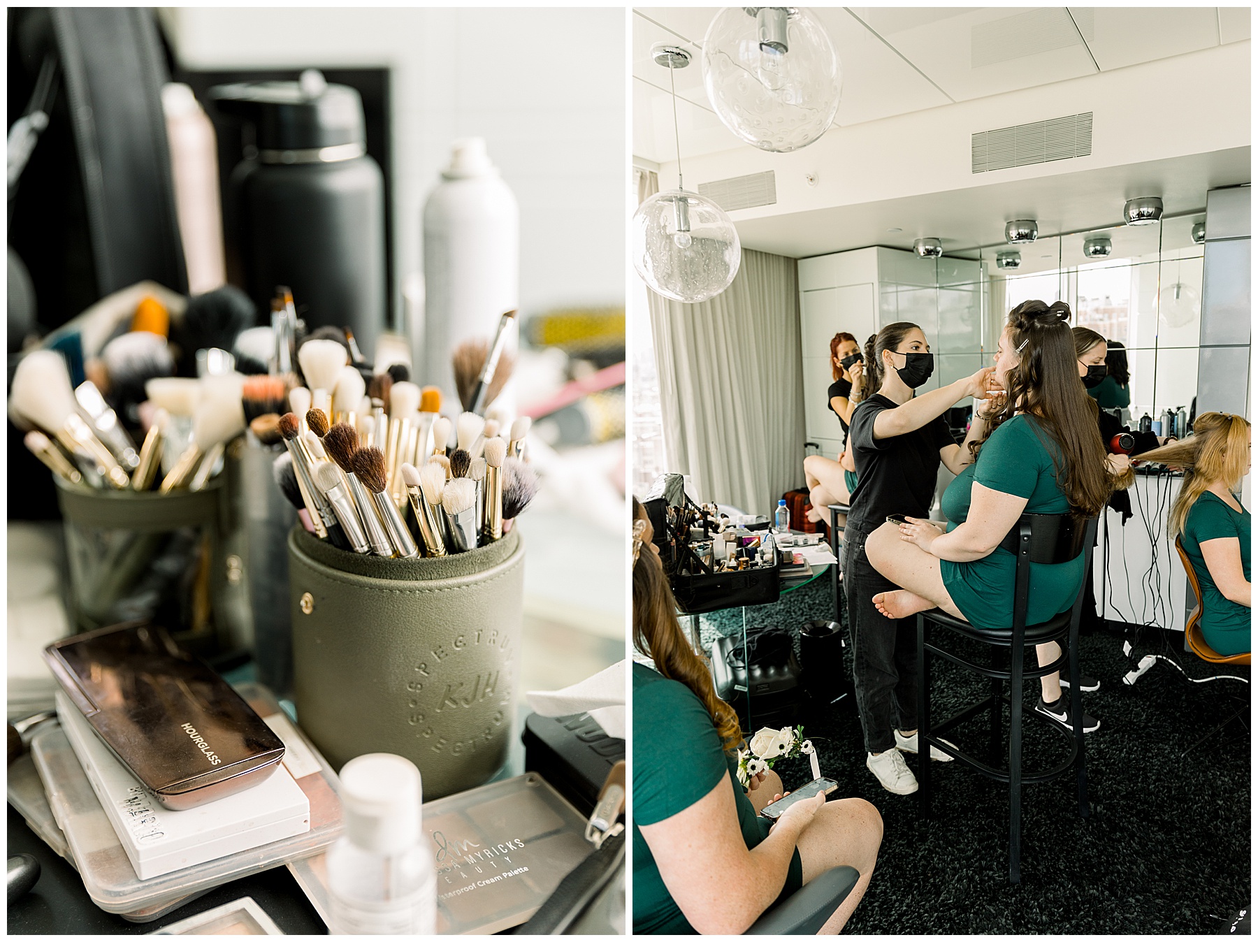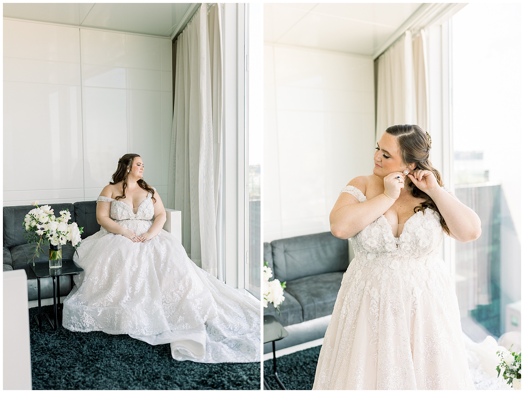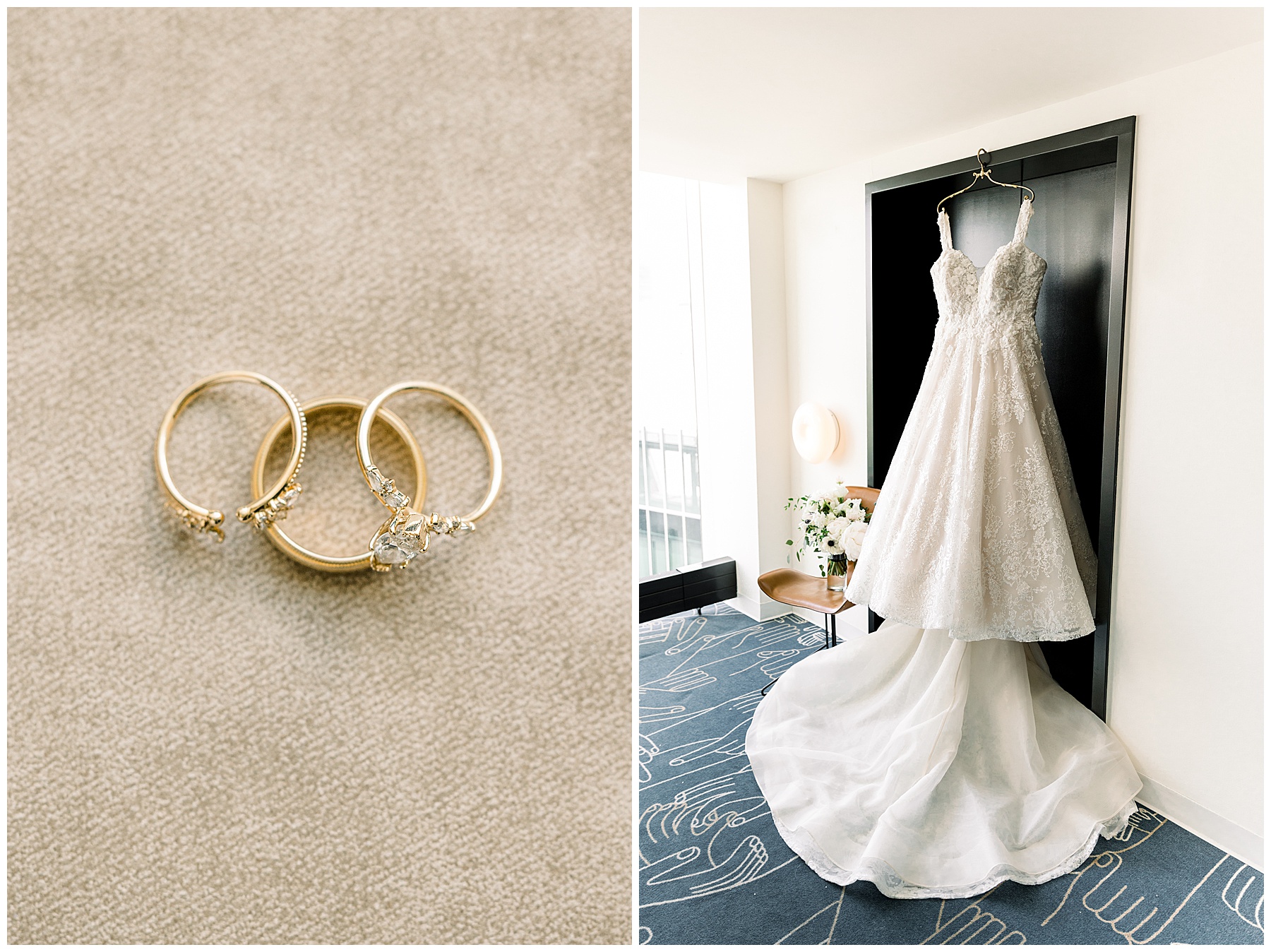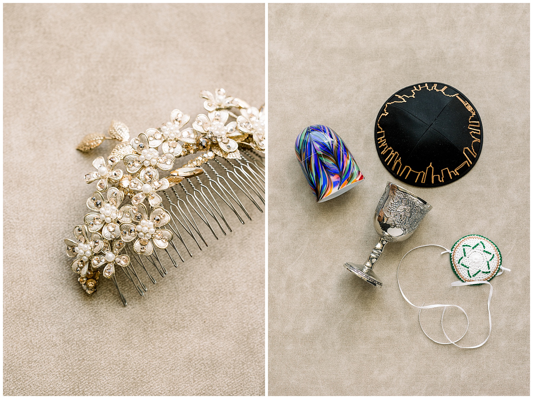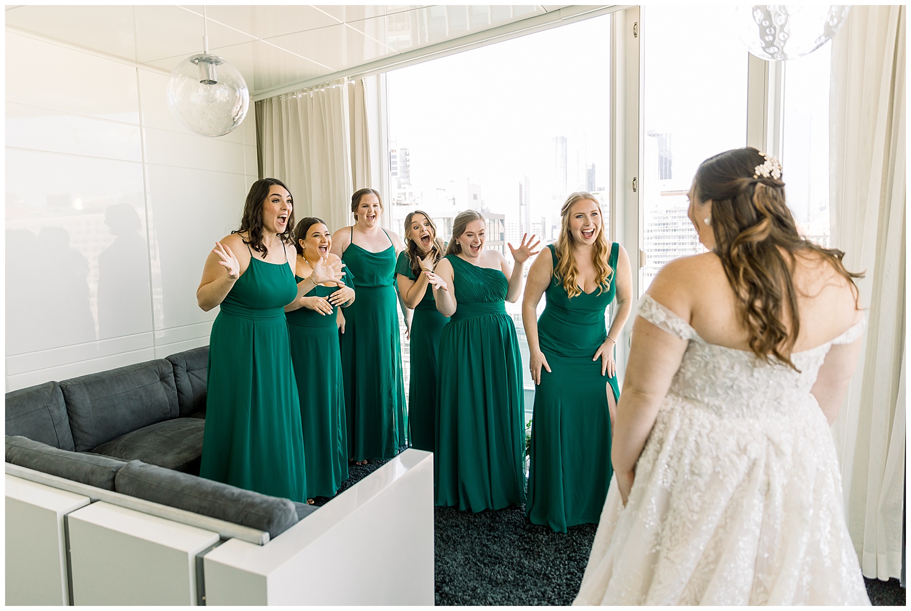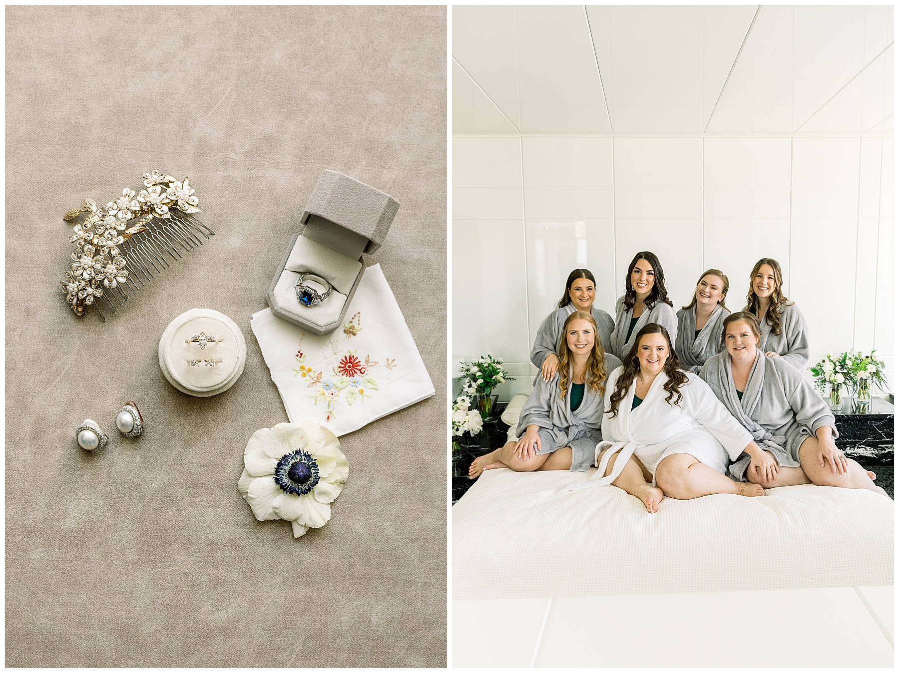 The day of the wedding, we started off with NYC bagels and then arrived at The Standard to find all the bridesmaids in cute green rompers and getting all glam by the Beautini crew! Carleigh had spoiled all the girls by booking the Empire Suite that had the most INCREDIBLE 16th floor views of NYC for them to enjoy all morning. We photographed all of Carleigh’s very organized and beautiful detail items while the girls finished getting ready! First of all, one of my all-time fave TLC shows is Say Yes to the Dress – so when I heard that Carleigh’s dress is a Martina Liana from KLEINFELDS OF NYC… I was totally fangirling and felt so honored to photograph it! Carleigh & Ian had so many fun details for me to photograph. My favorites were of course their stunning Sarah O rings (a female & minority-owned business), Ian’s grandmother’s INCREDIBLE sapphire ring that she passed down to Carleigh, and the black/white/gold invitation suite (all my fave colors) with the vintage stamp set of all NYC landmarks.