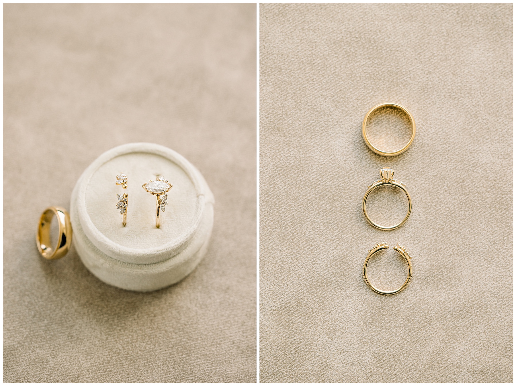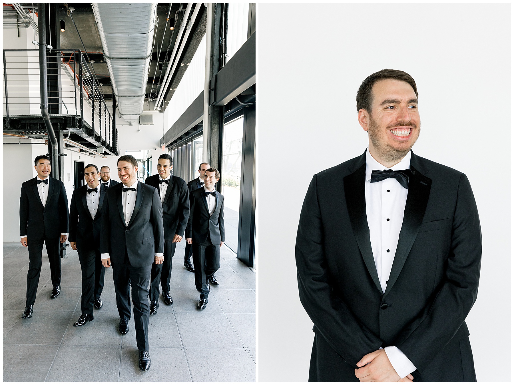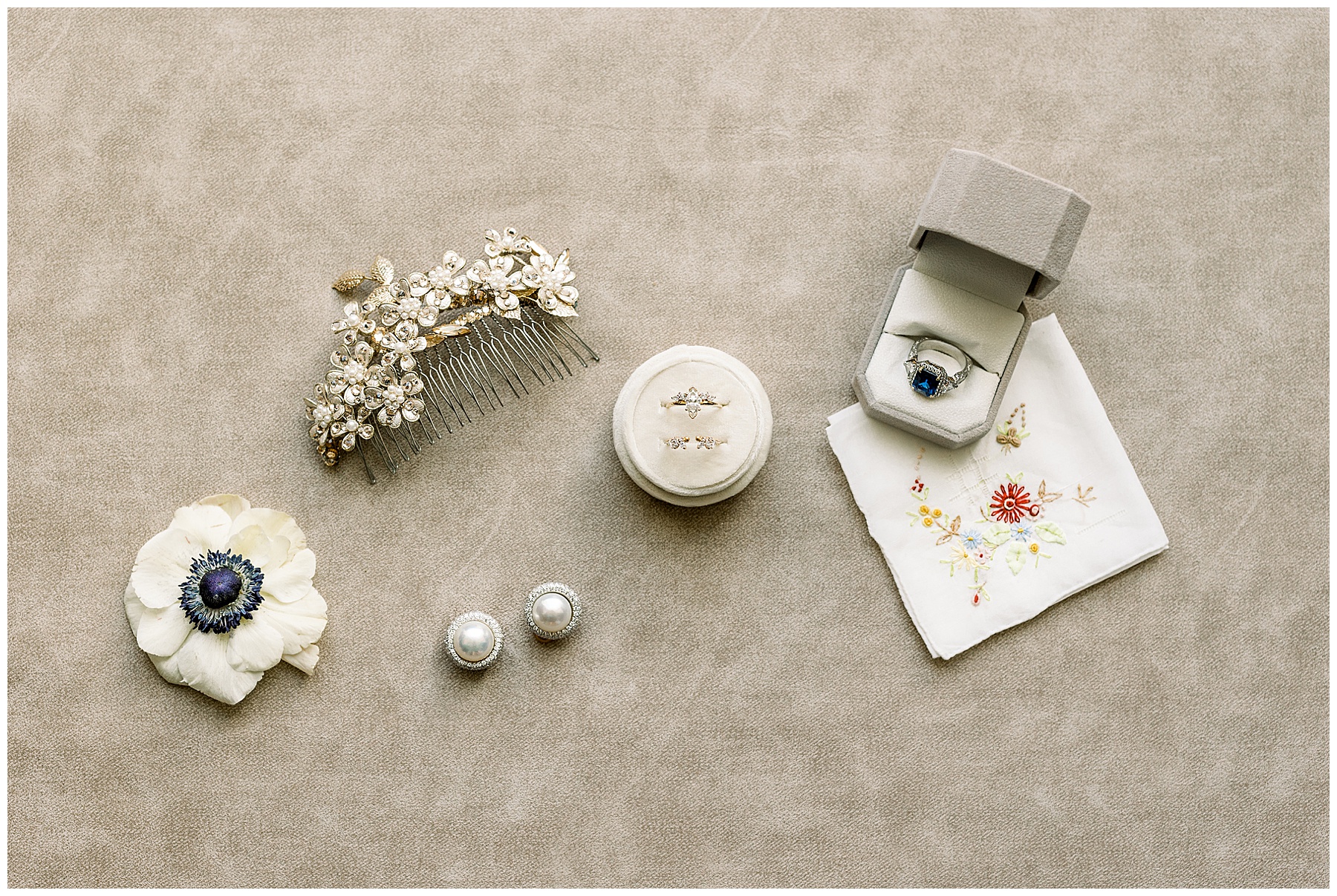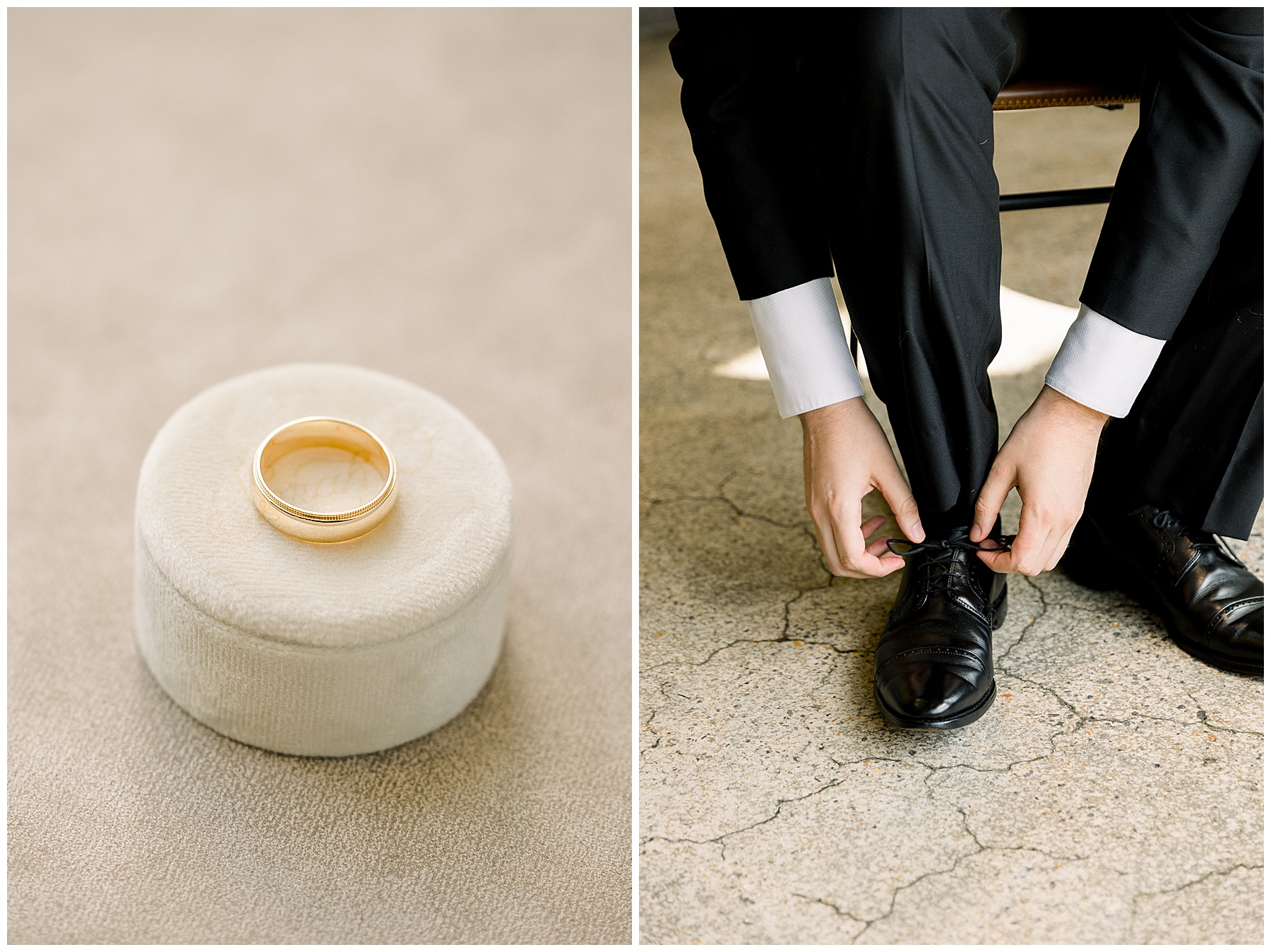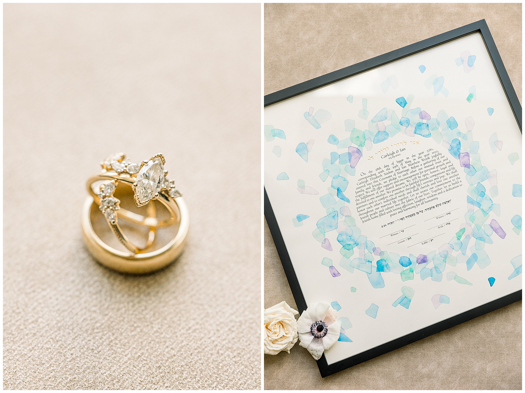 The day of the wedding, we started off with NYC bagels and then arrived at The Standard to find all the bridesmaids in cute green rompers and getting all glam by the Beautini crew! Carleigh had spoiled all the girls by booking the Empire Suite that had the most INCREDIBLE 16th floor views of NYC for them to enjoy all morning. We photographed all of Carleigh’s very organized and beautiful detail items while the girls finished getting ready! First of all, one of my all-time fave TLC shows is Say Yes to the Dress – so when I heard that Carleigh’s dress is a Martina Liana from KLEINFELDS OF NYC… I was totally fangirling and felt so honored to photograph it! Carleigh & Ian had so many fun details for me to photograph. My favorites were of course their stunning Sarah O rings (a female & minority-owned business), Ian’s grandmother’s INCREDIBLE sapphire ring that she passed down to Carleigh, and the black/white/gold invitation suite (all my fave colors) with the vintage stamp set of all NYC landmarks.