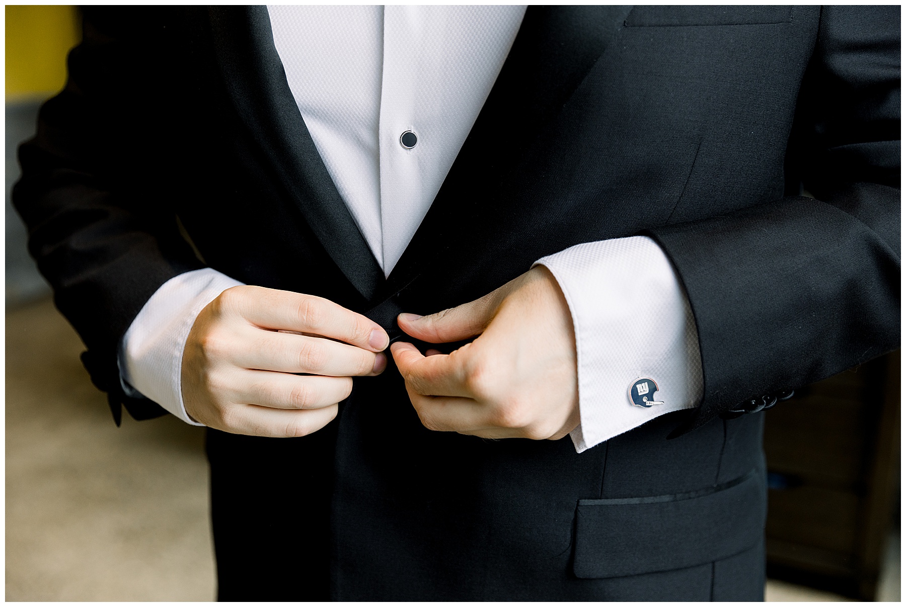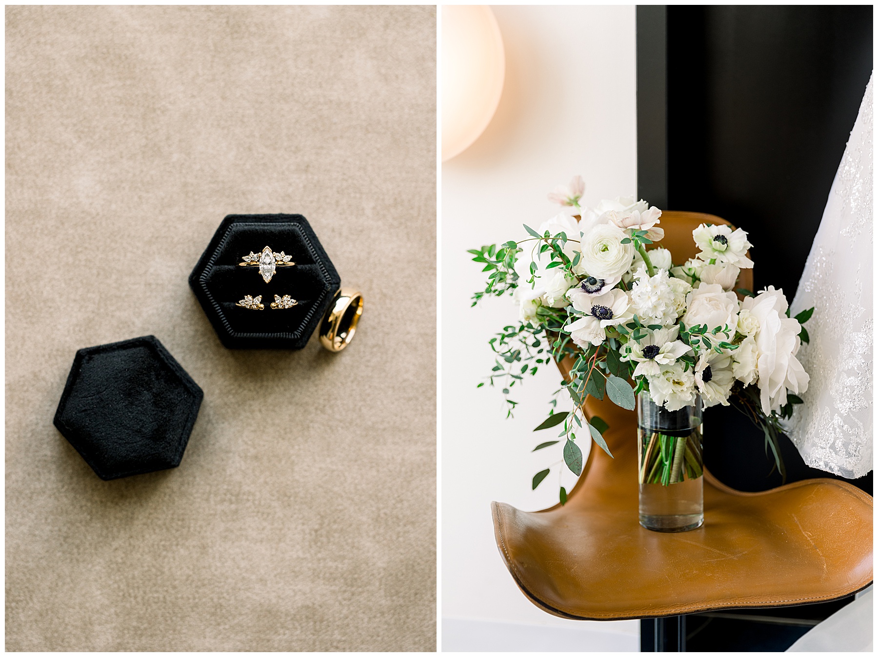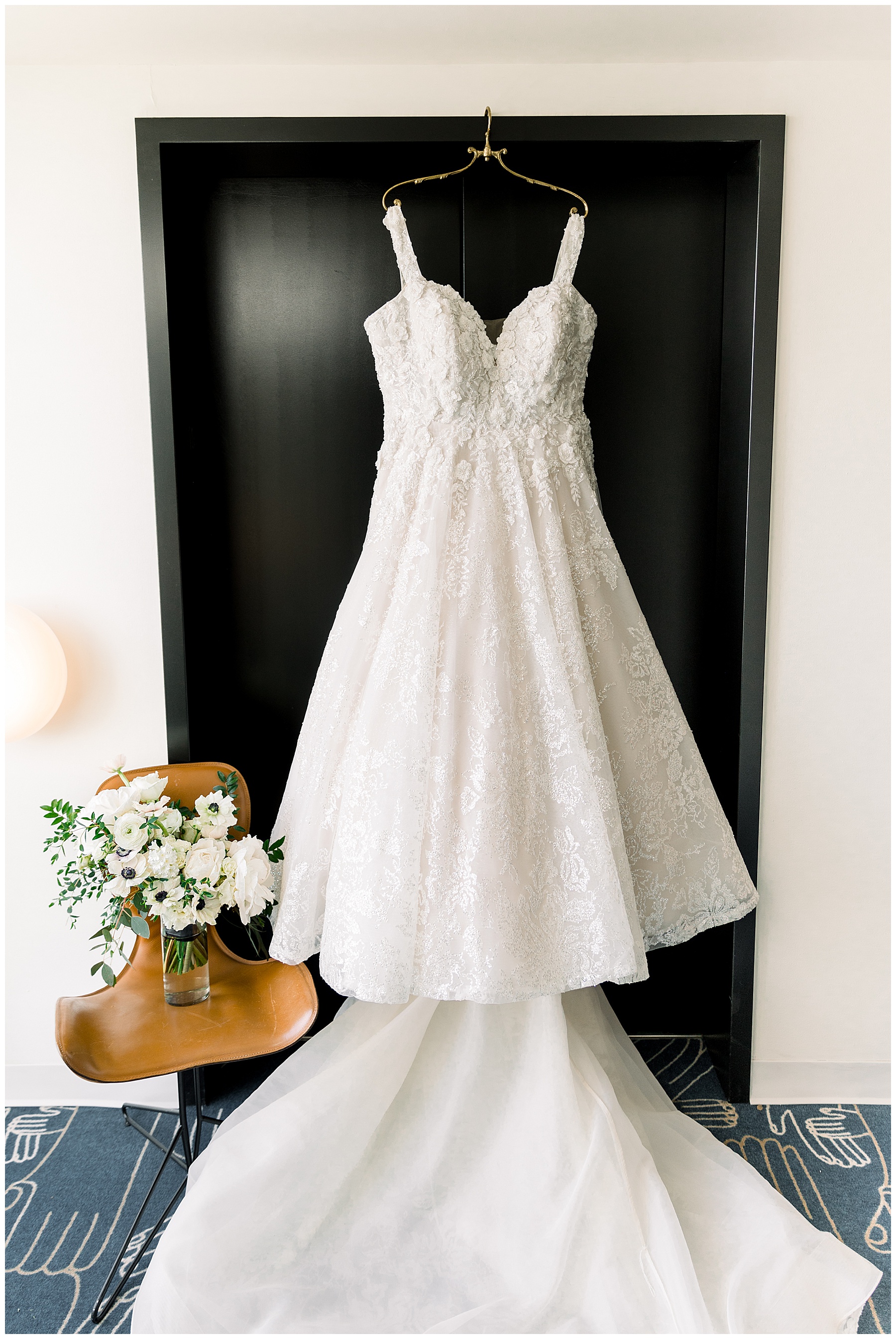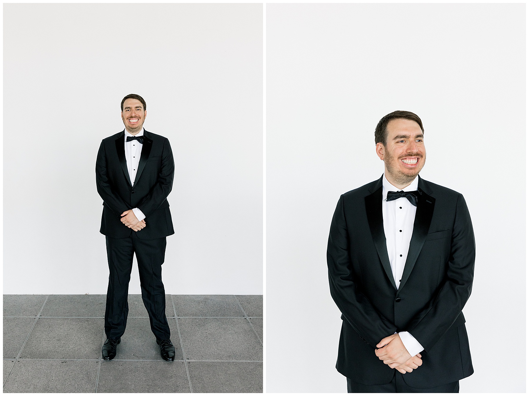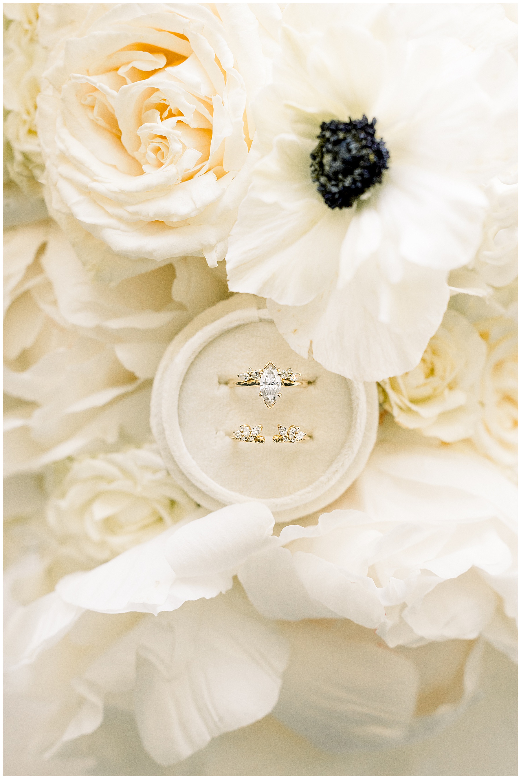 The day of the wedding, we started off with NYC bagels and then arrived at The Standard to find all the bridesmaids in cute green rompers and getting all glam by the Beautini crew! Carleigh had spoiled all the girls by booking the Empire Suite that had the most INCREDIBLE 16th floor views of NYC for them to enjoy all morning. We photographed all of Carleigh’s very organized and beautiful detail items while the girls finished getting ready! First of all, one of my all-time fave TLC shows is Say Yes to the Dress – so when I heard that Carleigh’s dress is a Martina Liana from KLEINFELDS OF NYC… I was totally fangirling and felt so honored to photograph it! Carleigh & Ian had so many fun details for me to photograph. My favorites were of course their stunning Sarah O rings (a female & minority-owned business), Ian’s grandmother’s INCREDIBLE sapphire ring that she passed down to Carleigh, and the black/white/gold invitation suite (all my fave colors) with the vintage stamp set of all NYC landmarks.