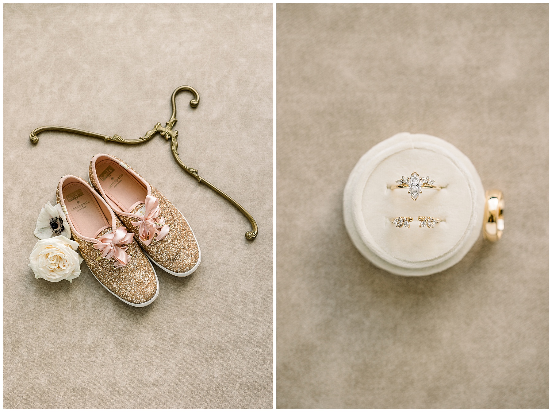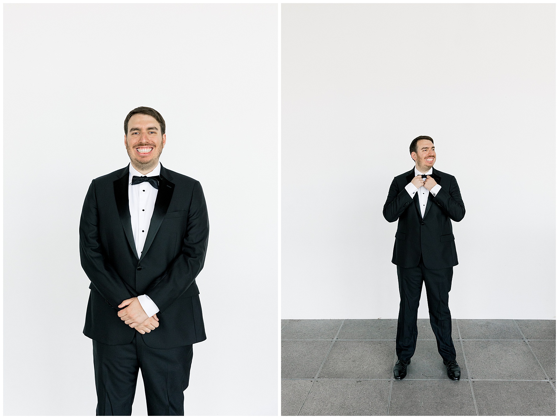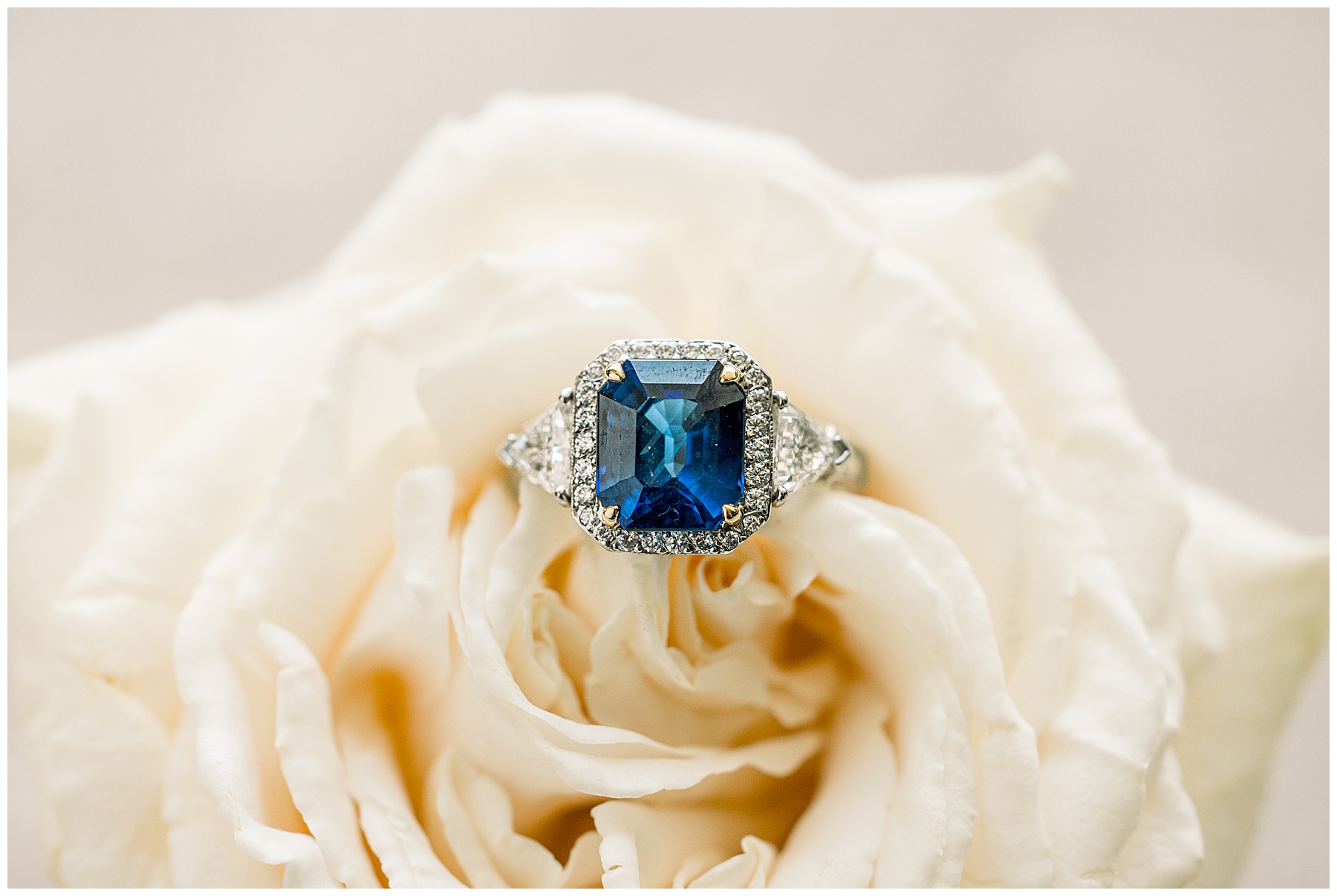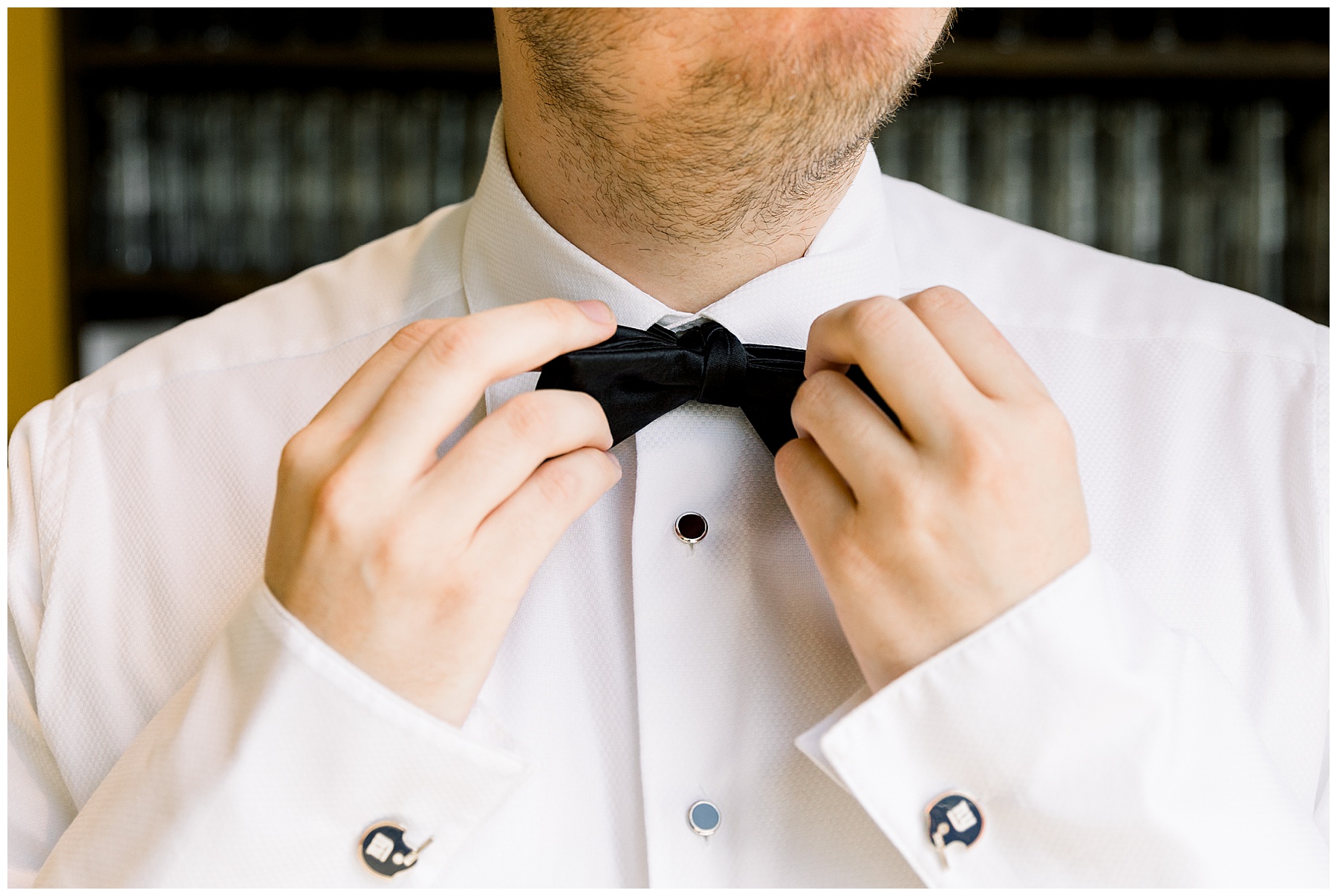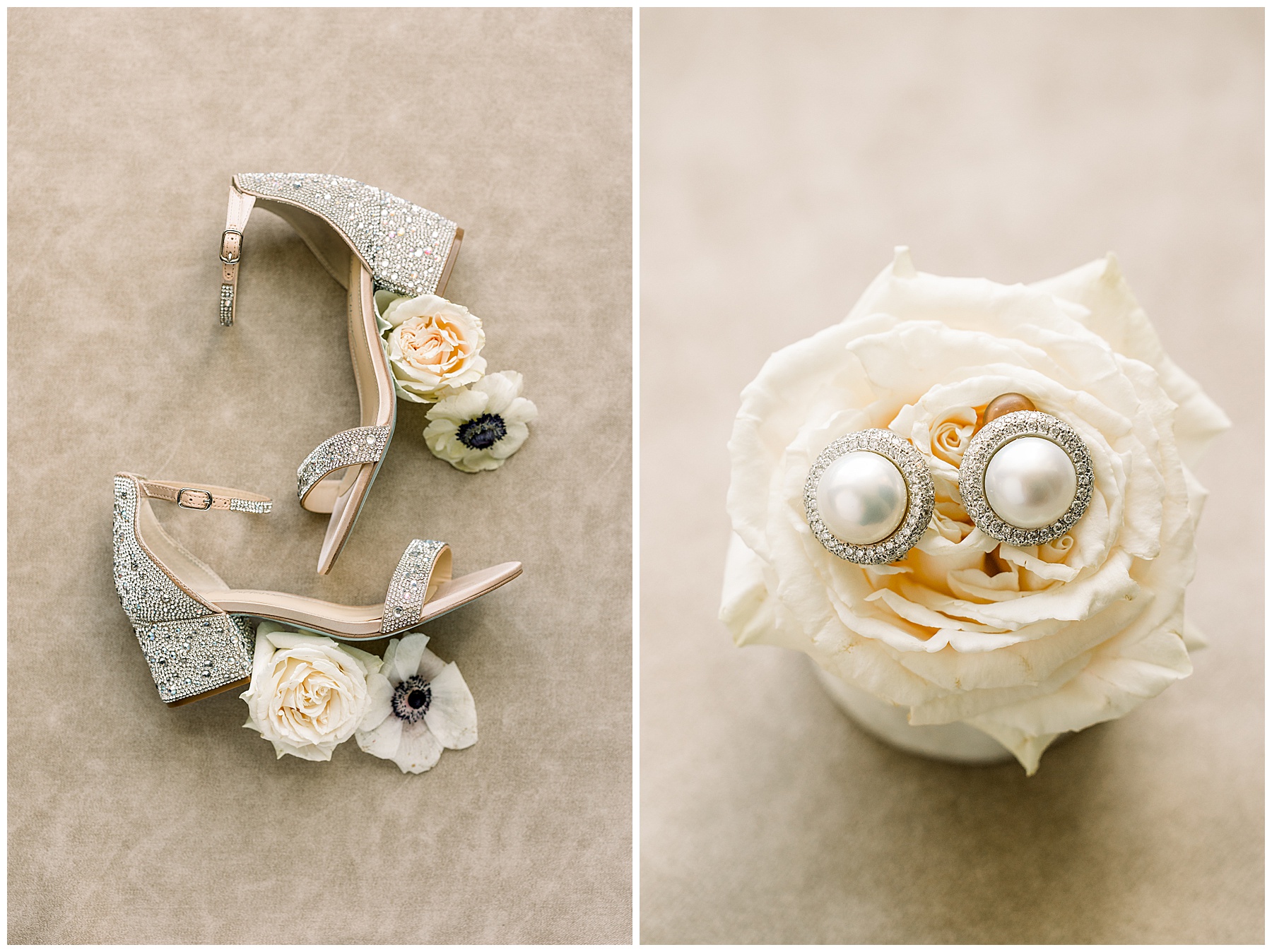The day of the wedding, we started off with NYC bagels and then arrived at The Standard to find all the bridesmaids in cute green rompers and getting all glam by the Beautini crew! Carleigh had spoiled all the girls by booking the Empire Suite that had the most INCREDIBLE 16th floor views of NYC for them to enjoy all morning. We photographed all of Carleigh’s very organized and beautiful detail items while the girls finished getting ready! First of all, one of my all-time fave TLC shows is Say Yes to the Dress – so when I heard that Carleigh’s dress is a Martina Liana from KLEINFELDS OF NYC… I was totally fangirling and felt so honored to photograph it! Carleigh & Ian had so many fun details for me to photograph. My favorites were of course their stunning Sarah O rings (a female & minority-owned business), Ian’s grandmother’s INCREDIBLE sapphire ring that she passed down to Carleigh, and the black/white/gold invitation suite (all my fave colors) with the vintage stamp set of all NYC landmarks.