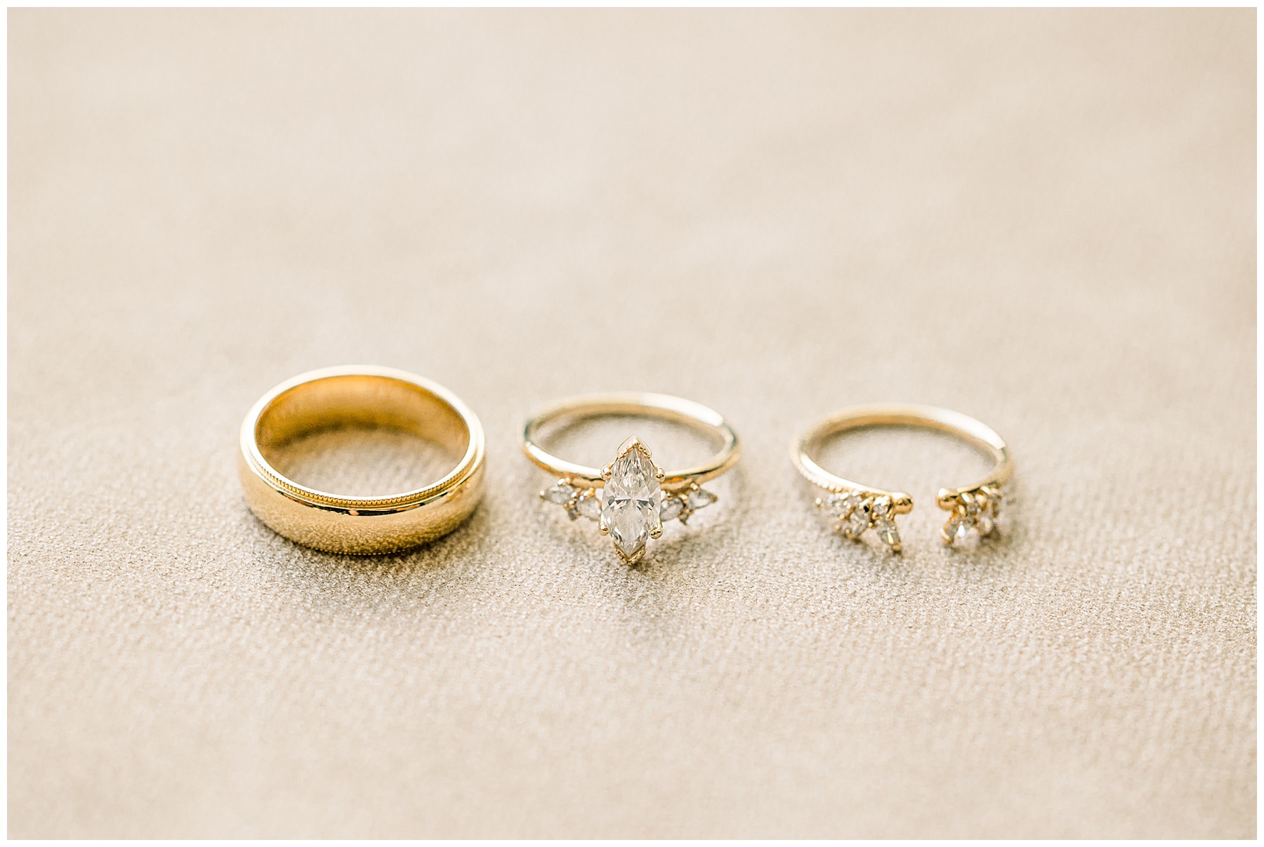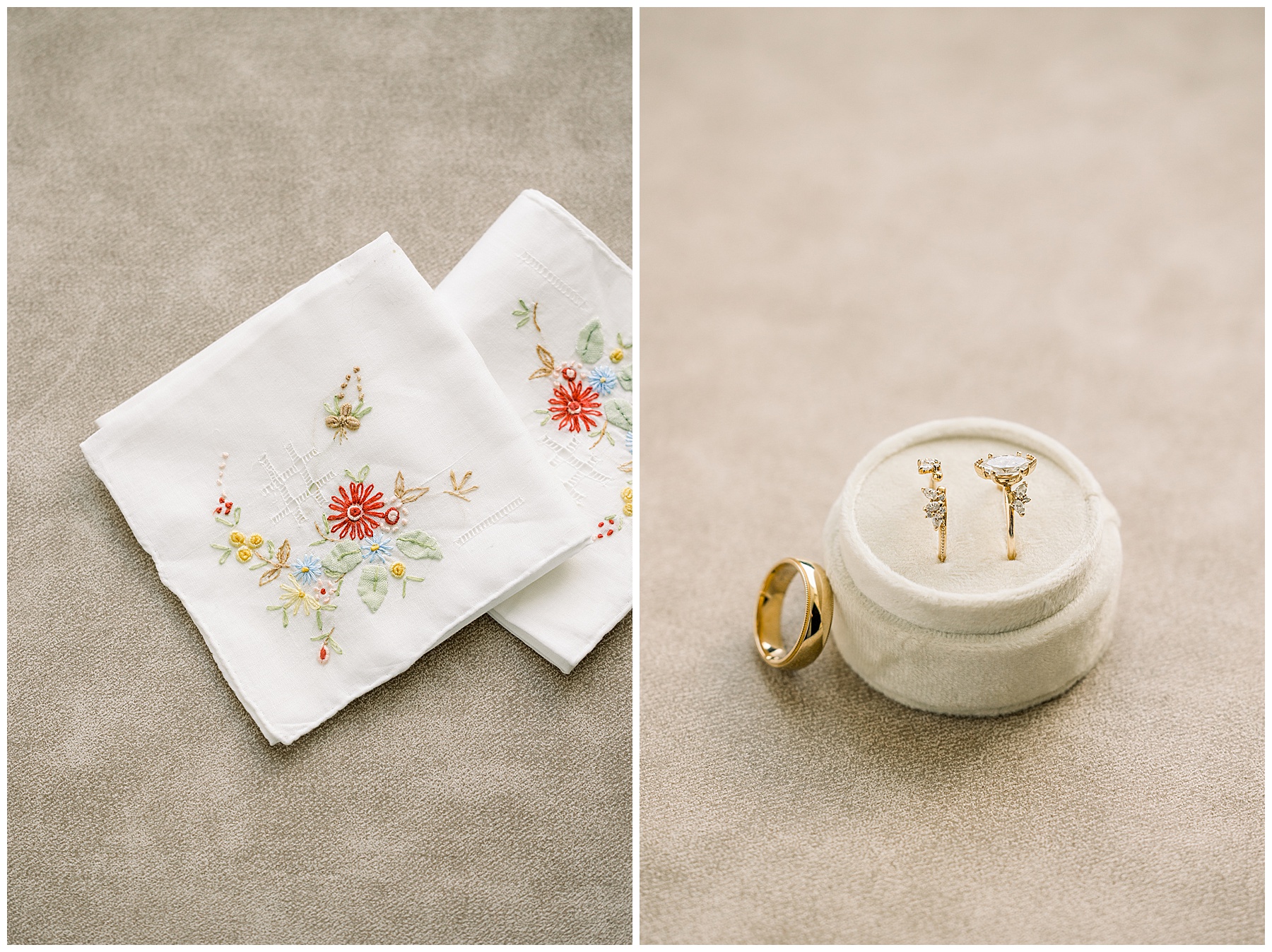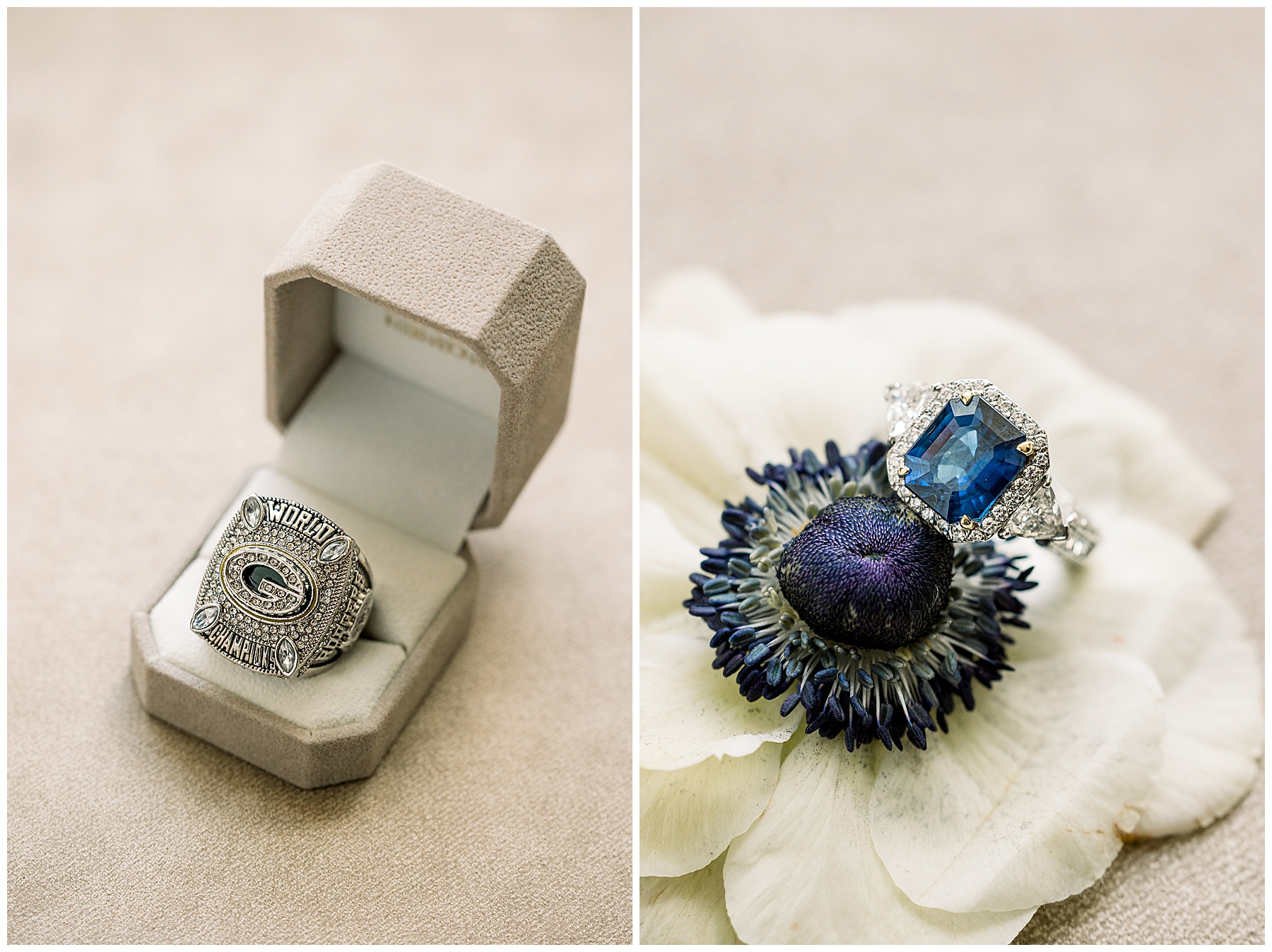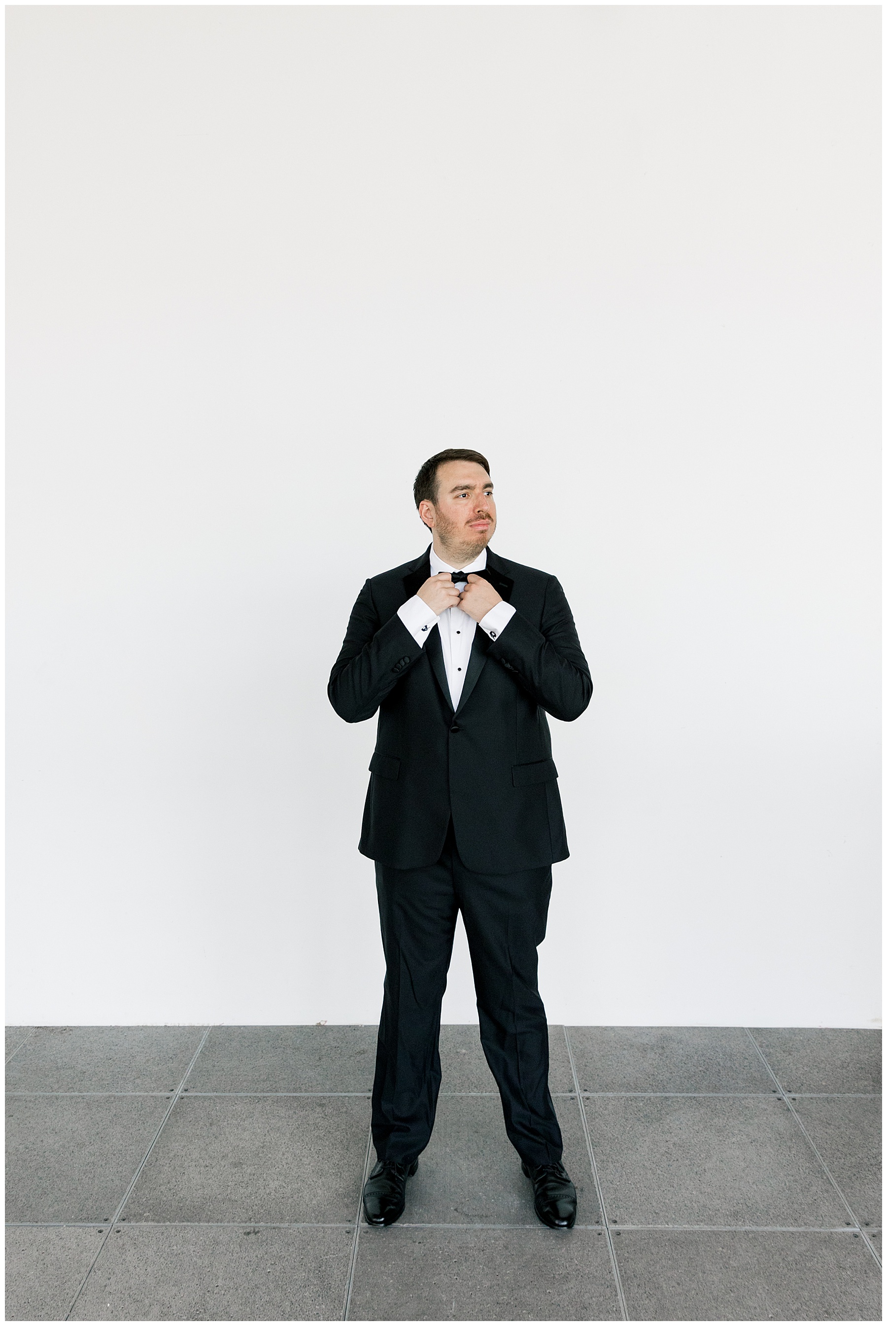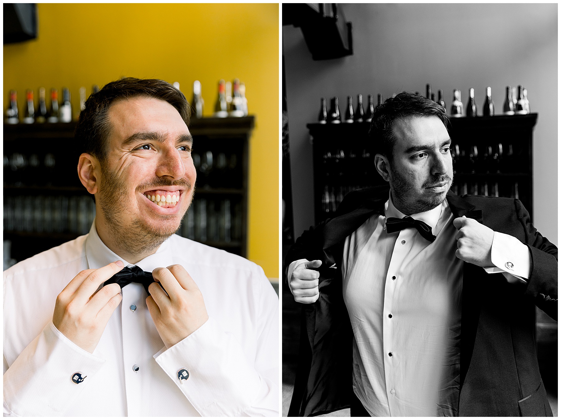 The day of the wedding, we started off with NYC bagels and then arrived at The Standard to find all the bridesmaids in cute green rompers and getting all glam by the Beautini crew! Carleigh had spoiled all the girls by booking the Empire Suite that had the most INCREDIBLE 16th floor views of NYC for them to enjoy all morning. We photographed all of Carleigh’s very organized and beautiful detail items while the girls finished getting ready! First of all, one of my all-time fave TLC shows is Say Yes to the Dress – so when I heard that Carleigh’s dress is a Martina Liana from KLEINFELDS OF NYC… I was totally fangirling and felt so honored to photograph it! Carleigh & Ian had so many fun details for me to photograph. My favorites were of course their stunning Sarah O rings (a female & minority-owned business), Ian’s grandmother’s INCREDIBLE sapphire ring that she passed down to Carleigh, and the black/white/gold invitation suite (all my fave colors) with the vintage stamp set of all NYC landmarks.