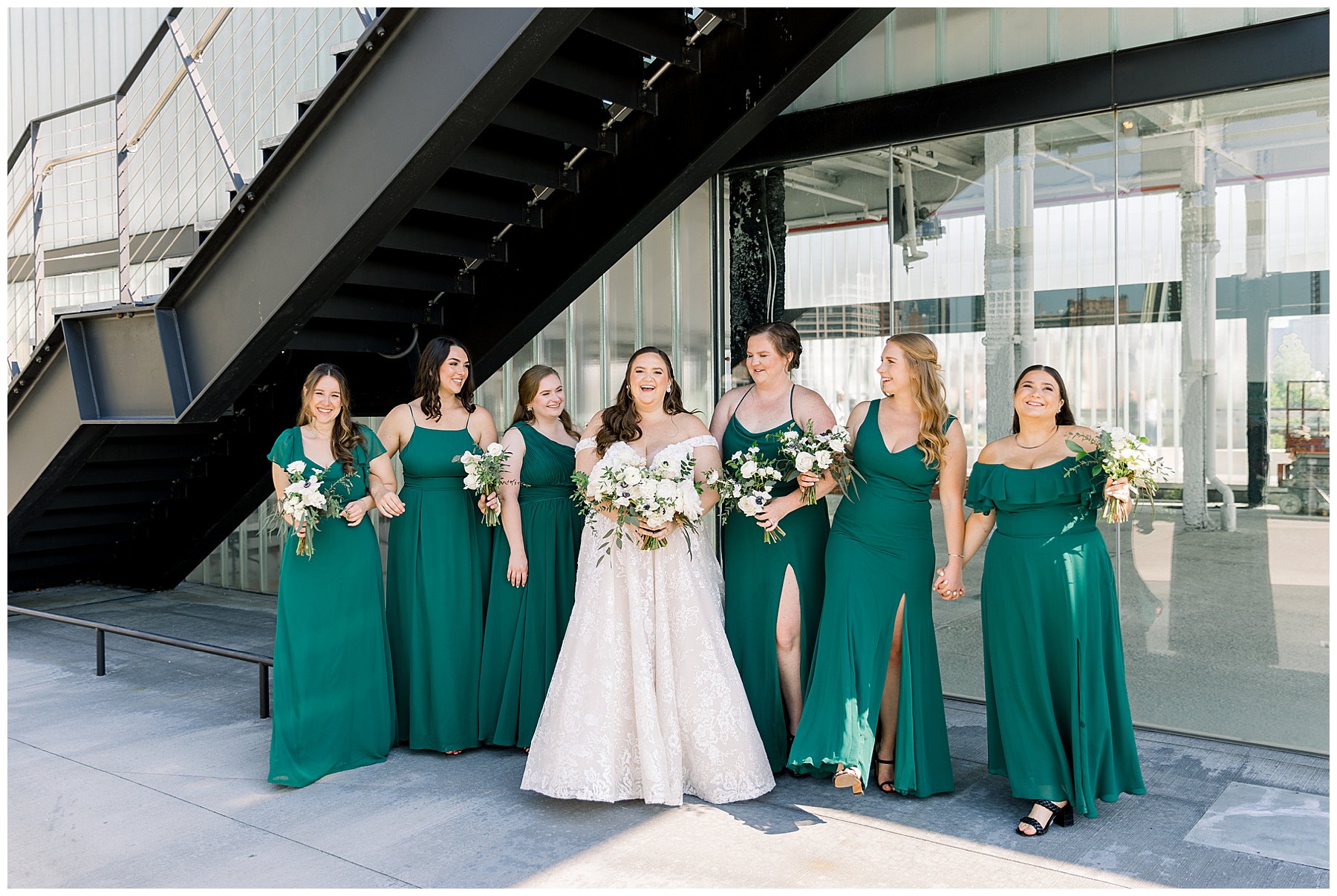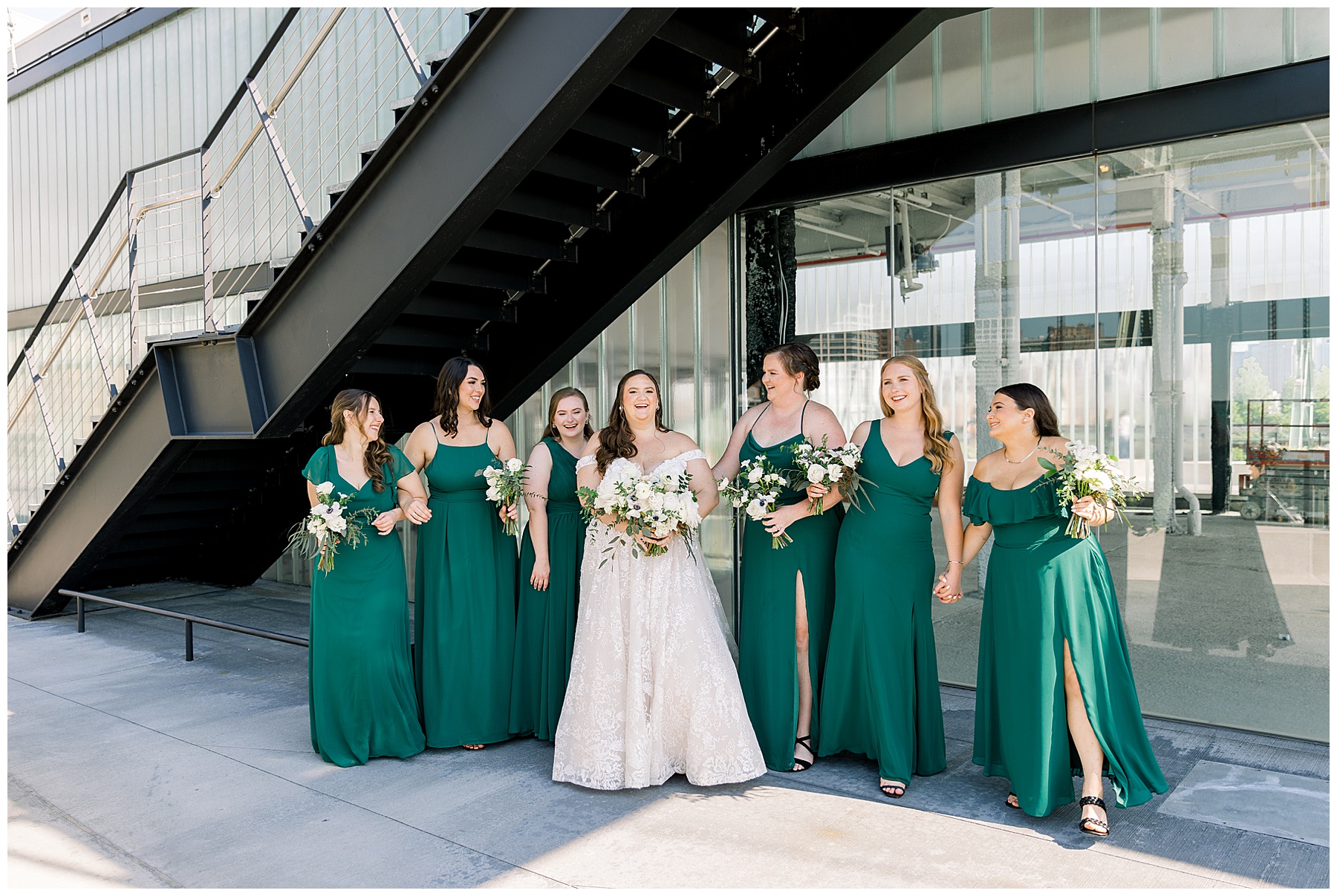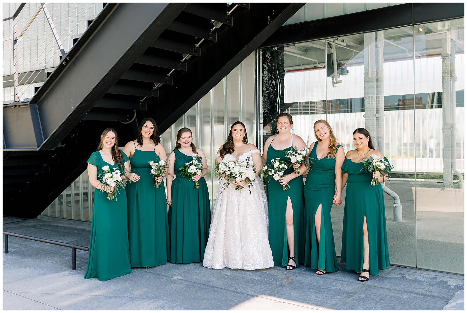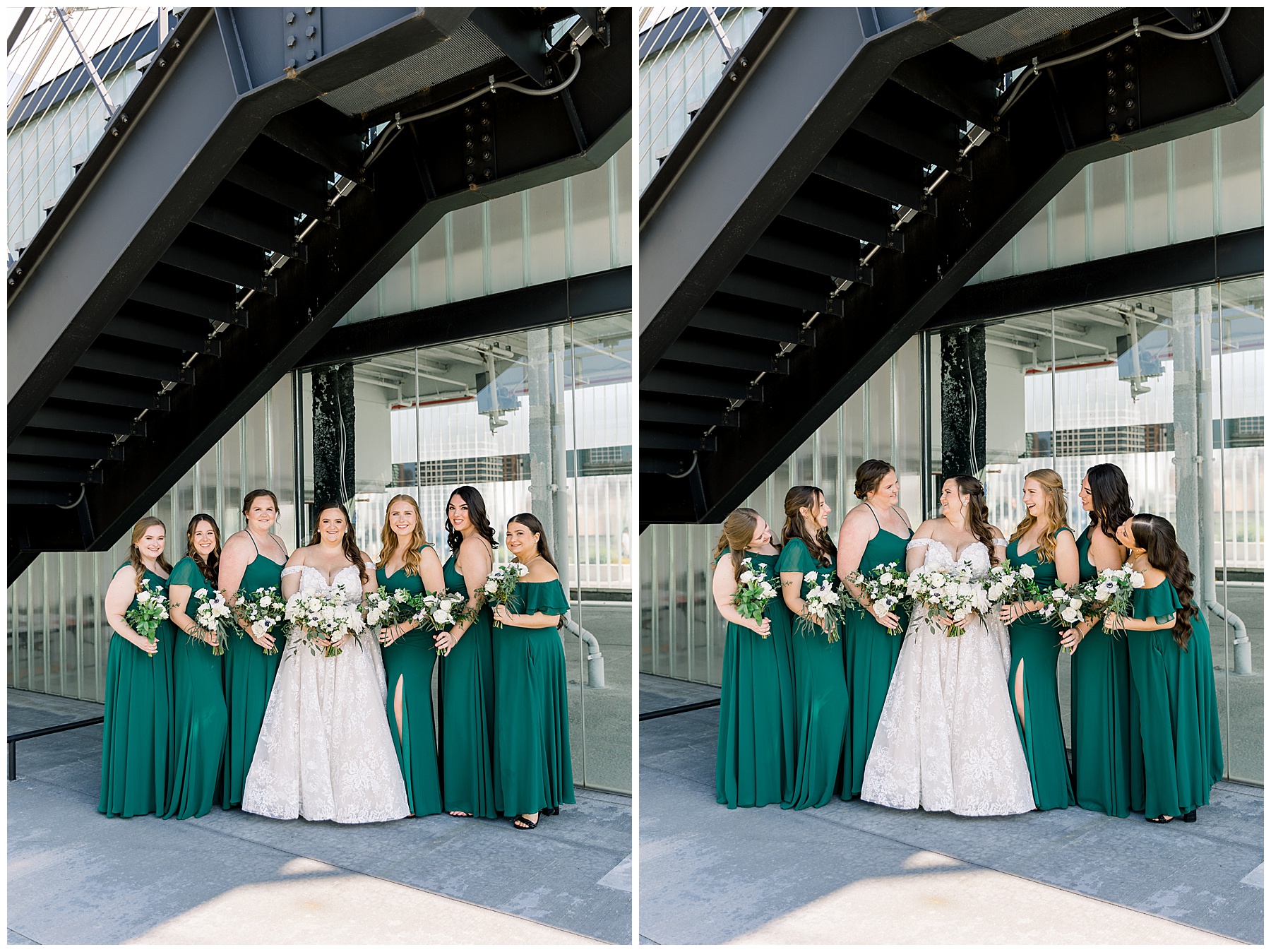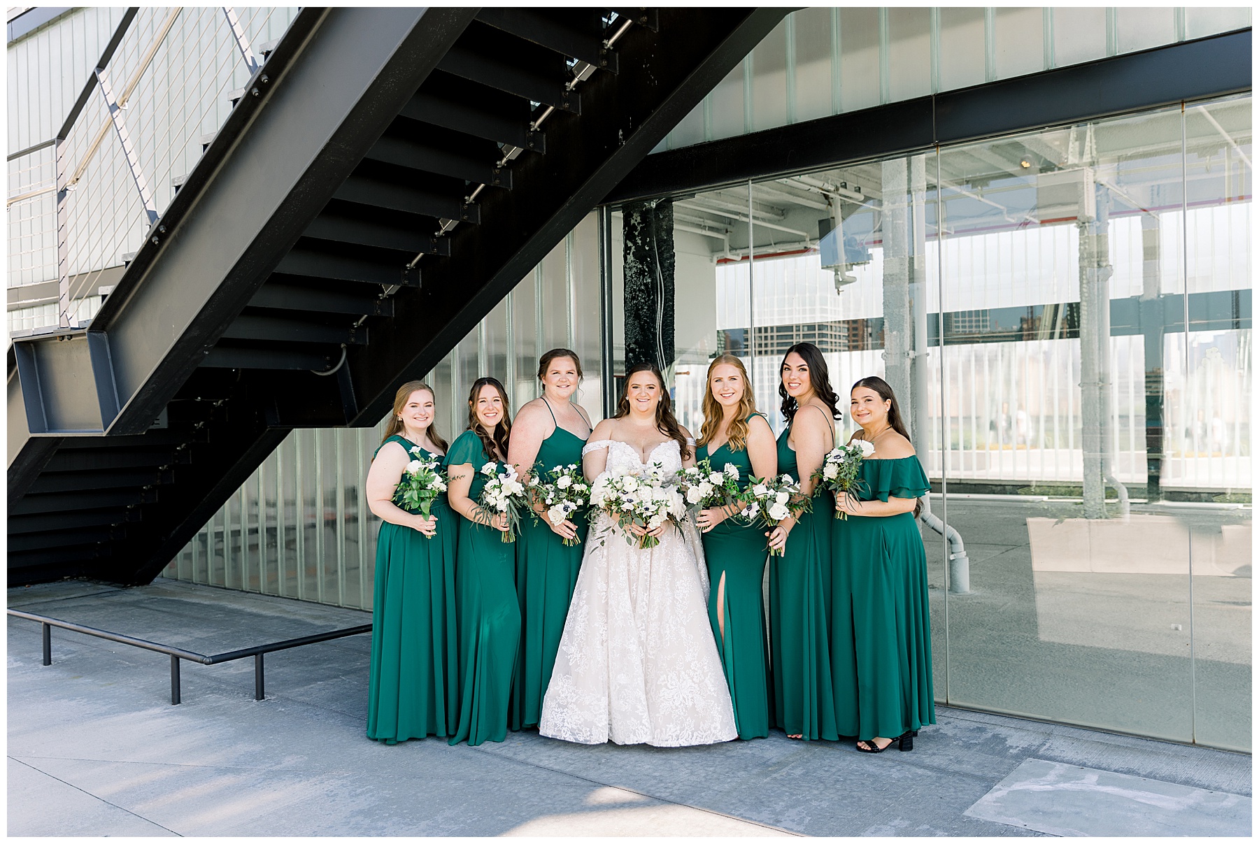 All of Carleigh’s bridesmaids were so sweet & fun, and I also loved including Carleigh’s brand-new nephew, Everette, in some of the photos! The Empire Suite’s black/white interior was a perfect compliment to their wedding color palette! Next, we headed over to the venue to photograph all the Bridesmaids photos, and found the coolest black staircase to incorporate more of the black color scheme & city/urban vibes into the photos. (Plus thank GOD for the shade!!!) I just love how unique those photos turned out! :)
