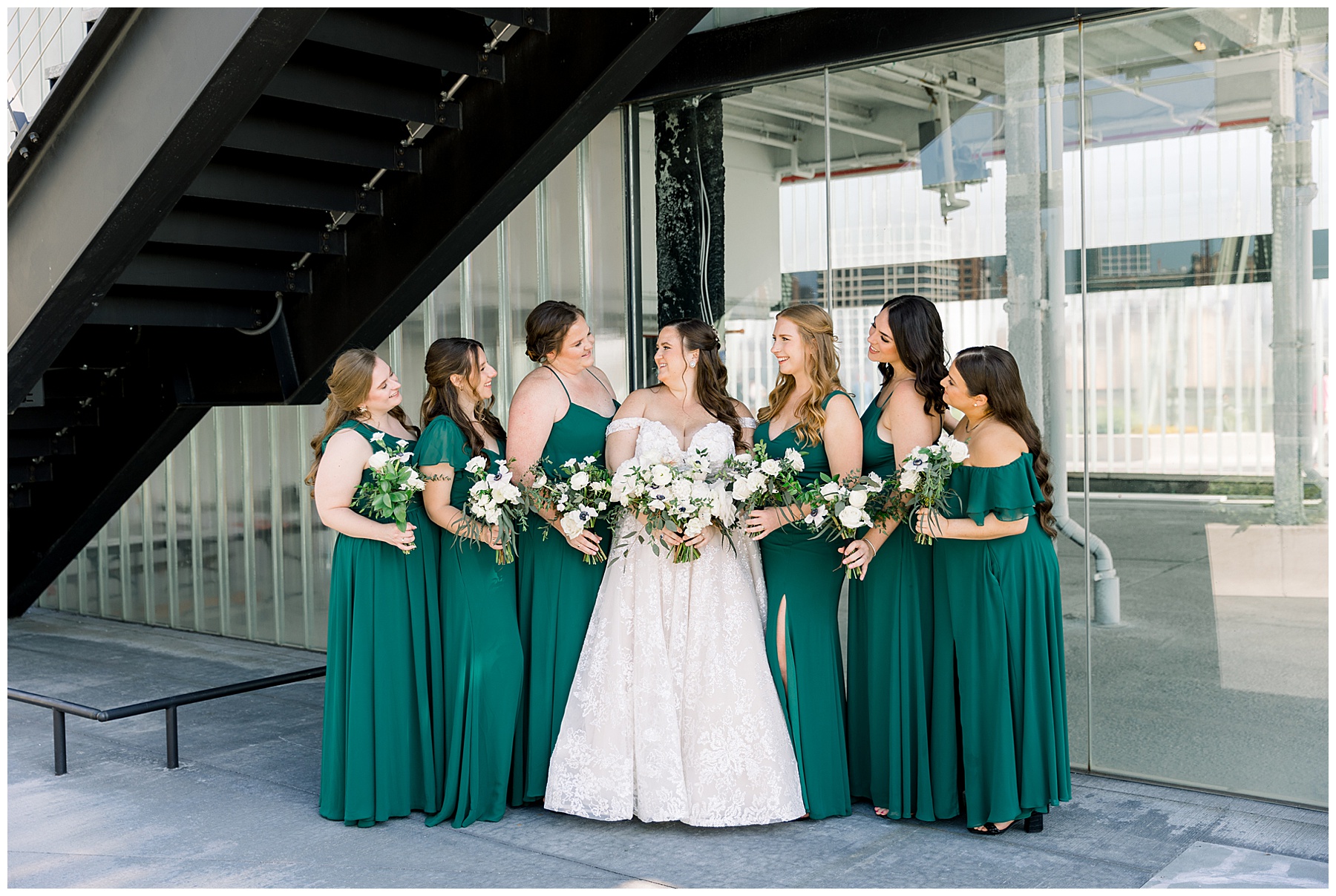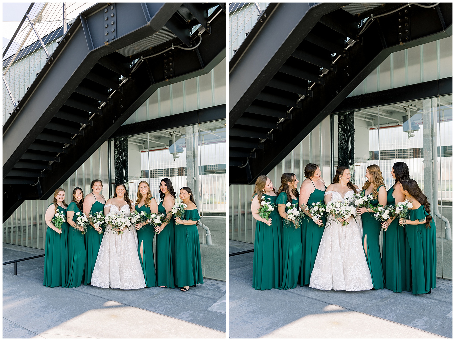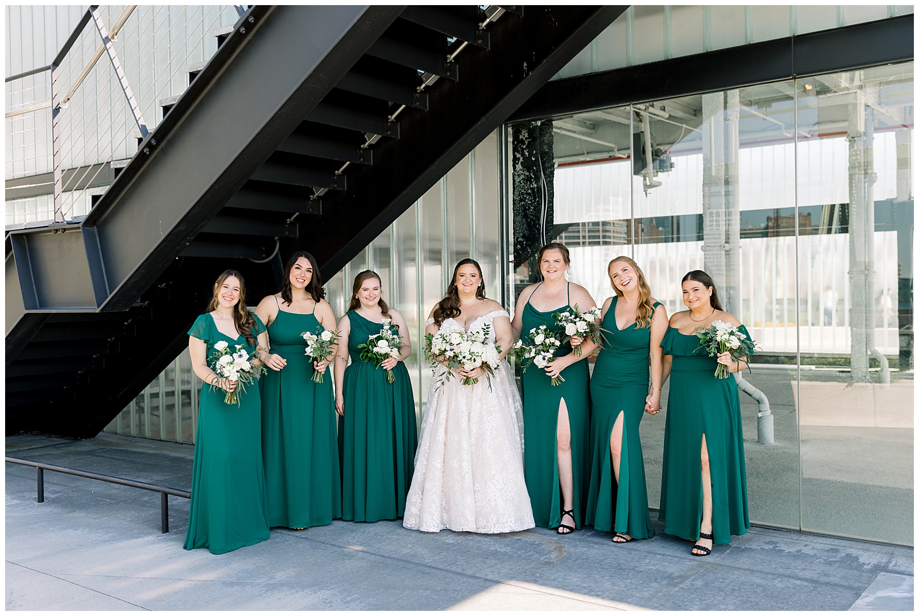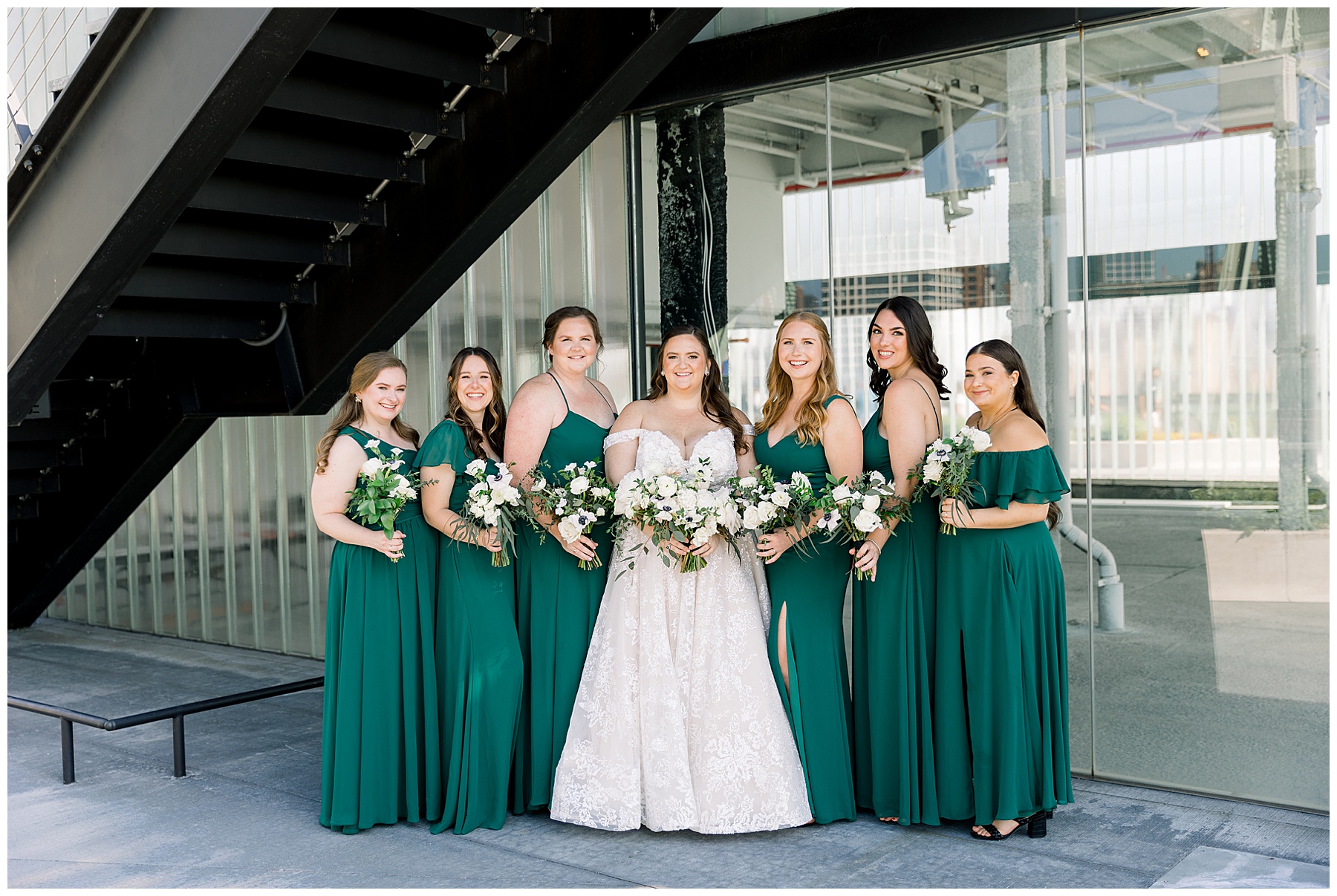 All of Carleigh’s bridesmaids were so sweet & fun, and I also loved including Carleigh’s brand-new nephew, Everette, in some of the photos! The Empire Suite’s black/white interior was a perfect compliment to their wedding color palette! Next, we headed over to the venue to photograph all the Bridesmaids photos, and found the coolest black staircase to incorporate more of the black color scheme & city/urban vibes into the photos. (Plus thank GOD for the shade!!!) I just love how unique those photos turned out! :)